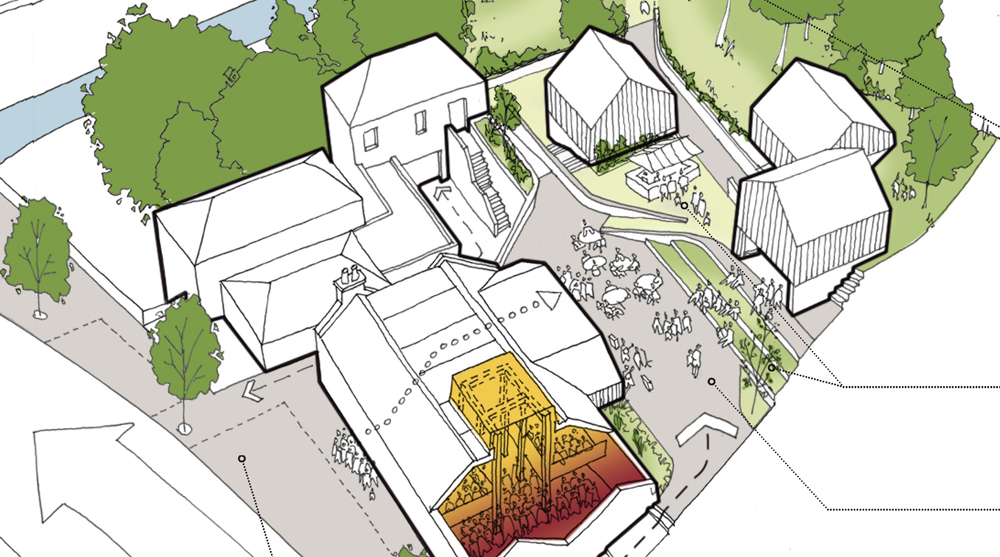 The winning project by Ian O'Brien, Enrique Garcia, and Oliver James from the UK, featured a raised glass skylight as its primary modification. Using materials of timber, local stone, and charred oak, the submission introduces four new buildings, well-situated on the hillside and housing band accommodations, a workshop, a studio, and an exhibition space.