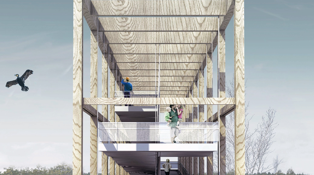 Second prize was awarded to Nathira Haja from Malaysia. The “Eye Tower” project features a spherical timber structure that encloses a lengthy spiraling ramp, elevating visitors well above the bog boardwalk, and was considered by the jury as the most formally striking submission presented in this competition.