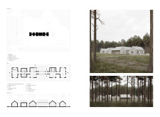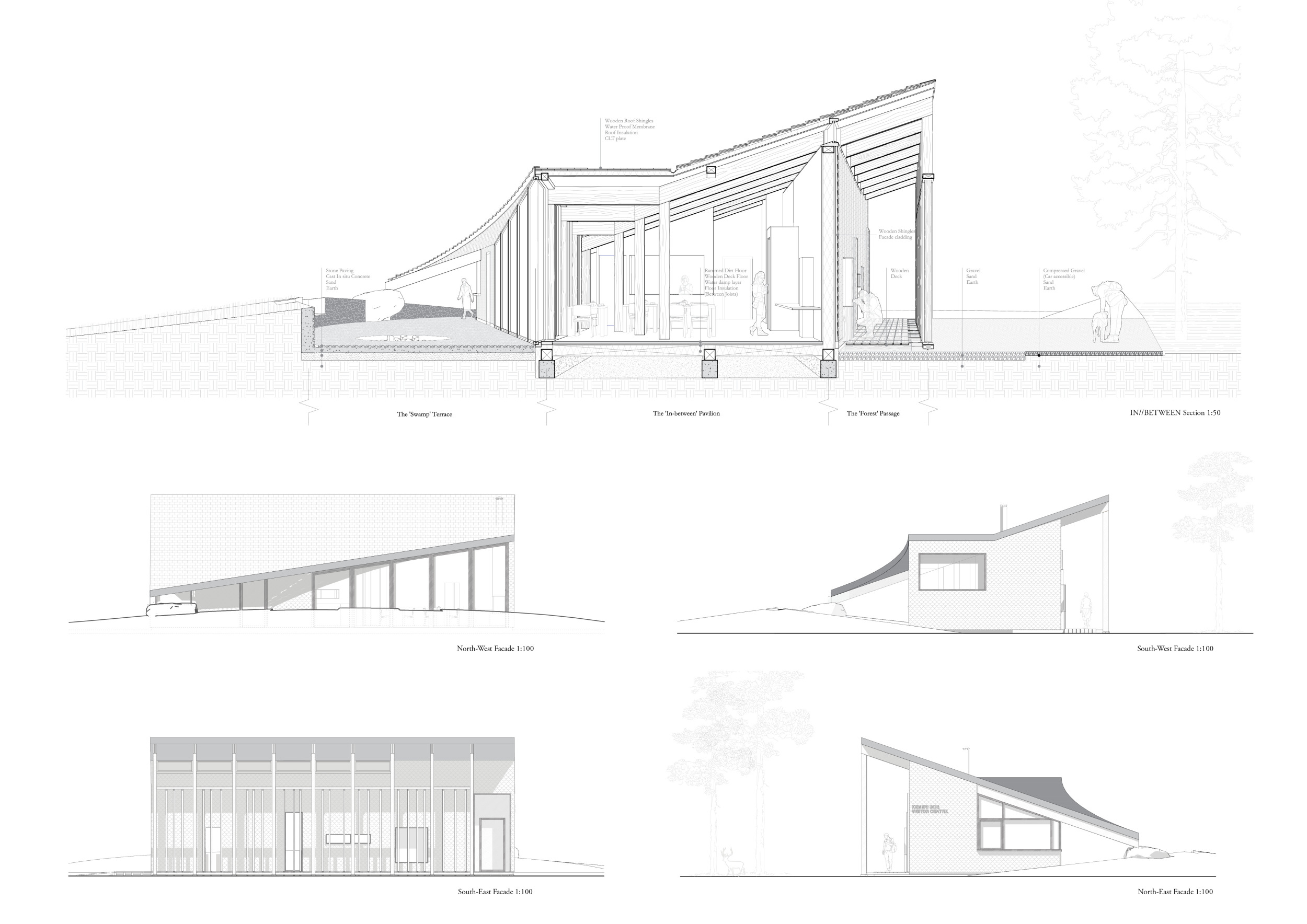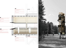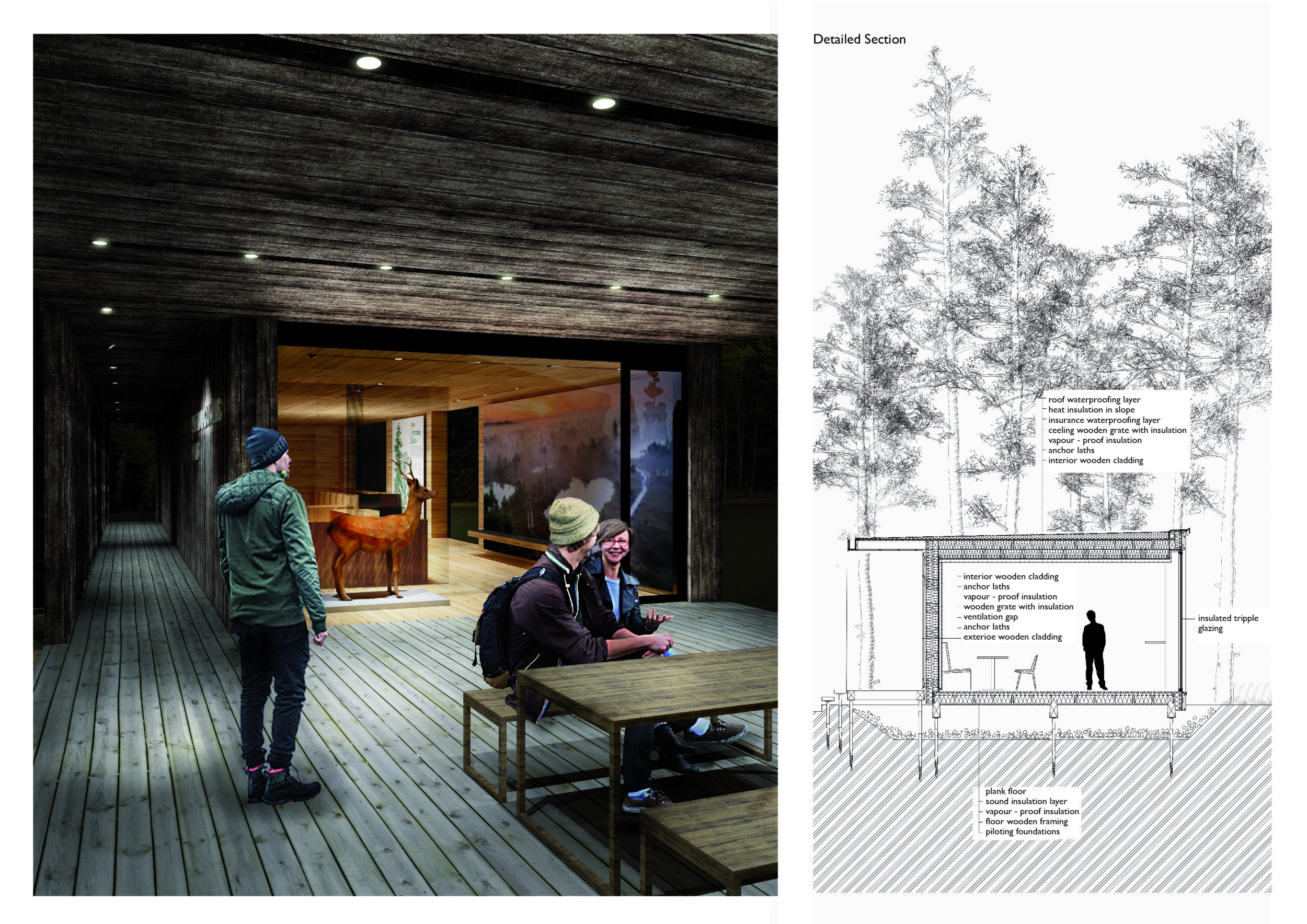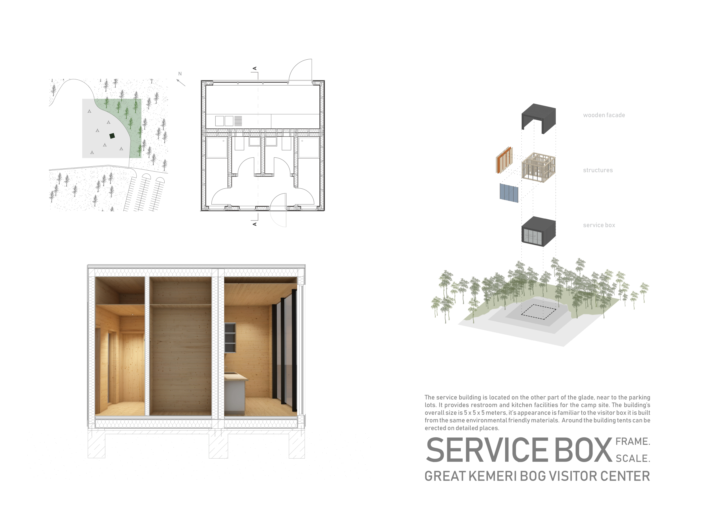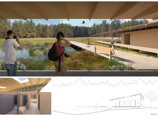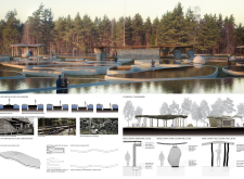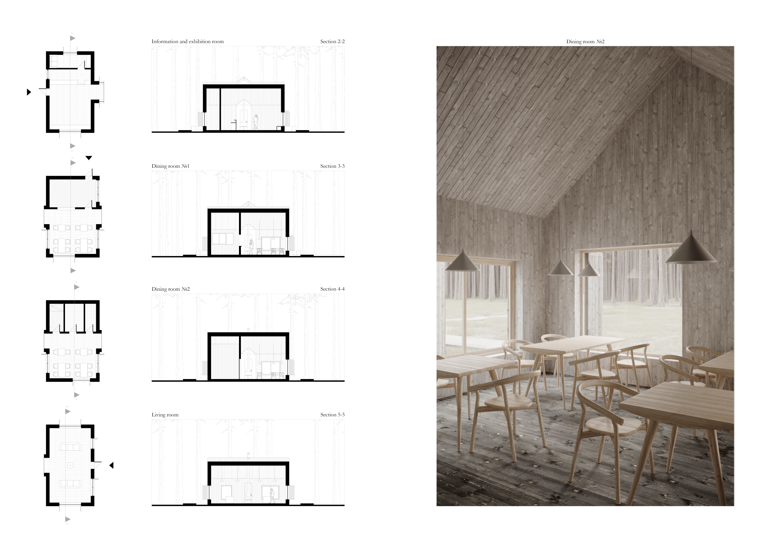 This project is perhaps the most effective at establishing a gateway to the Great Kemeri Bog. The rectangular-bar form set perpendicular to the entry drive firmly separates the vehicular entry from the camping grounds and pedestrian network of pathways, and filters visitors through a single access point that also becomes the starting point for the bog’s network of wooden boardwalks. Read more The sectional drawing expresses the project’s constructability, and the interior images reflect its simple use of natural materials. The varied layout of its vertical facade module gives the otherwise harsh block form a more natural aesthetic that is clearly related to the trees of the surrounding forest.