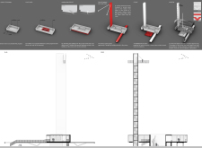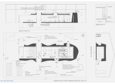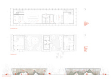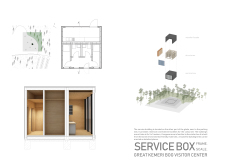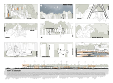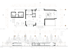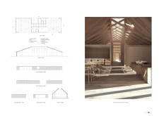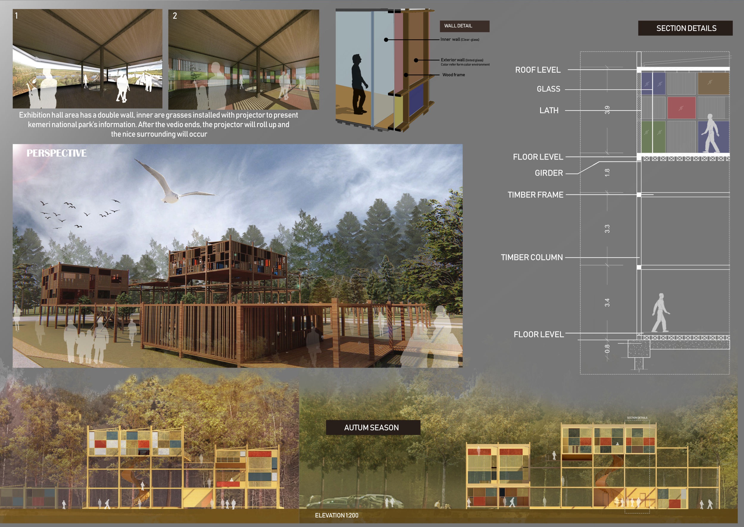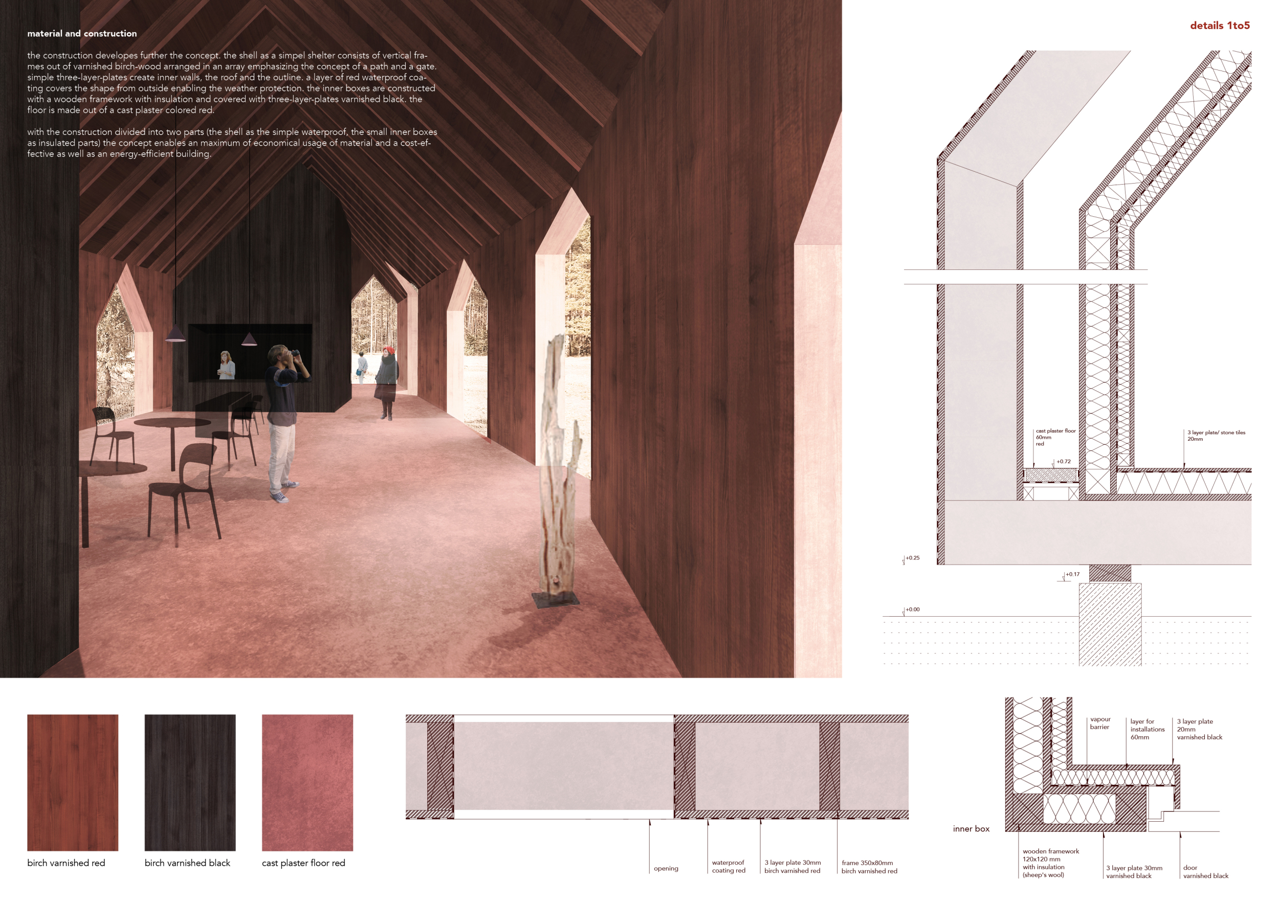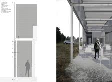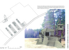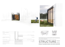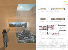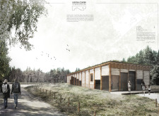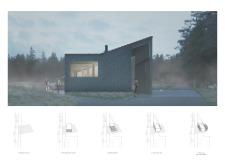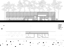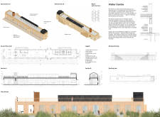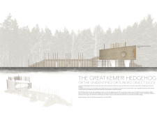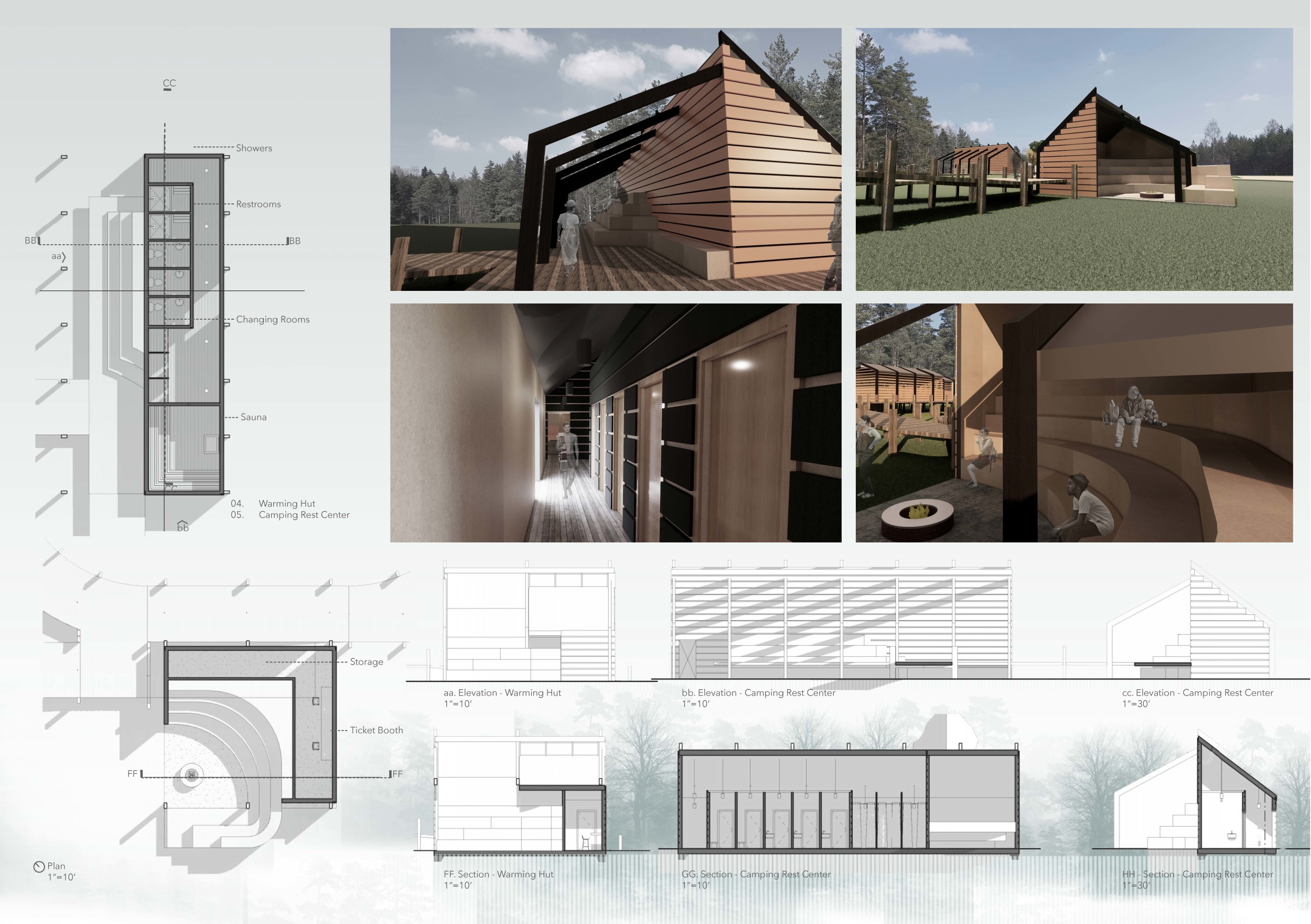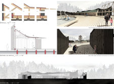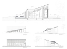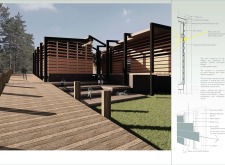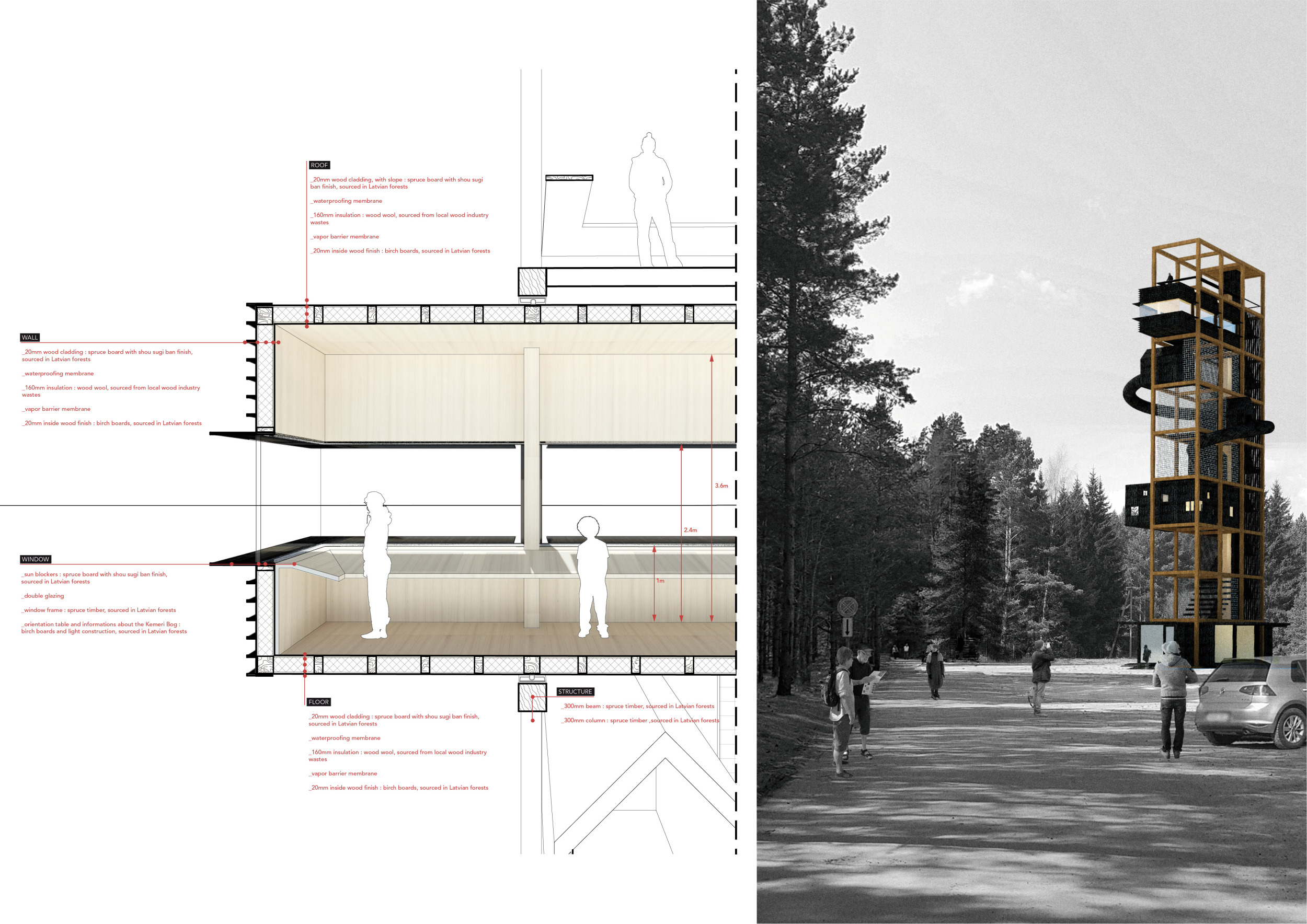 This project is perhaps the most effective at establishing a gateway to the Great Kemeri Bog. The rectangular-bar form set perpendicular to the entry drive firmly separates the vehicular entry from the camping grounds and pedestrian network of pathways, and filters visitors through a single access point that also becomes the starting point for the bog’s network of wooden boardwalks. Read more The sectional drawing expresses the project’s constructability, and the interior images reflect its simple use of natural materials. The varied layout of its vertical facade module gives the otherwise harsh block form a more natural aesthetic that is clearly related to the trees of the surrounding forest.