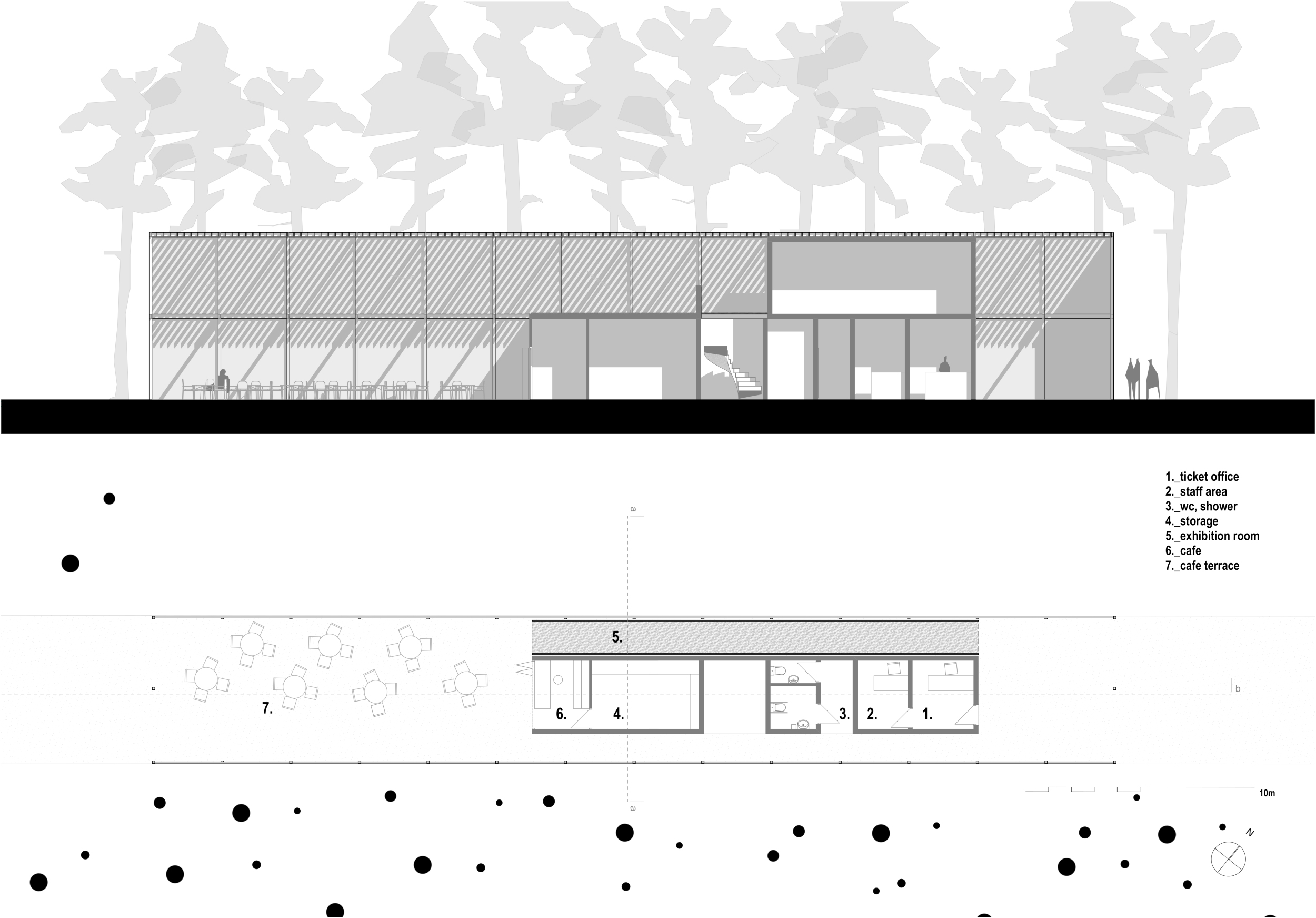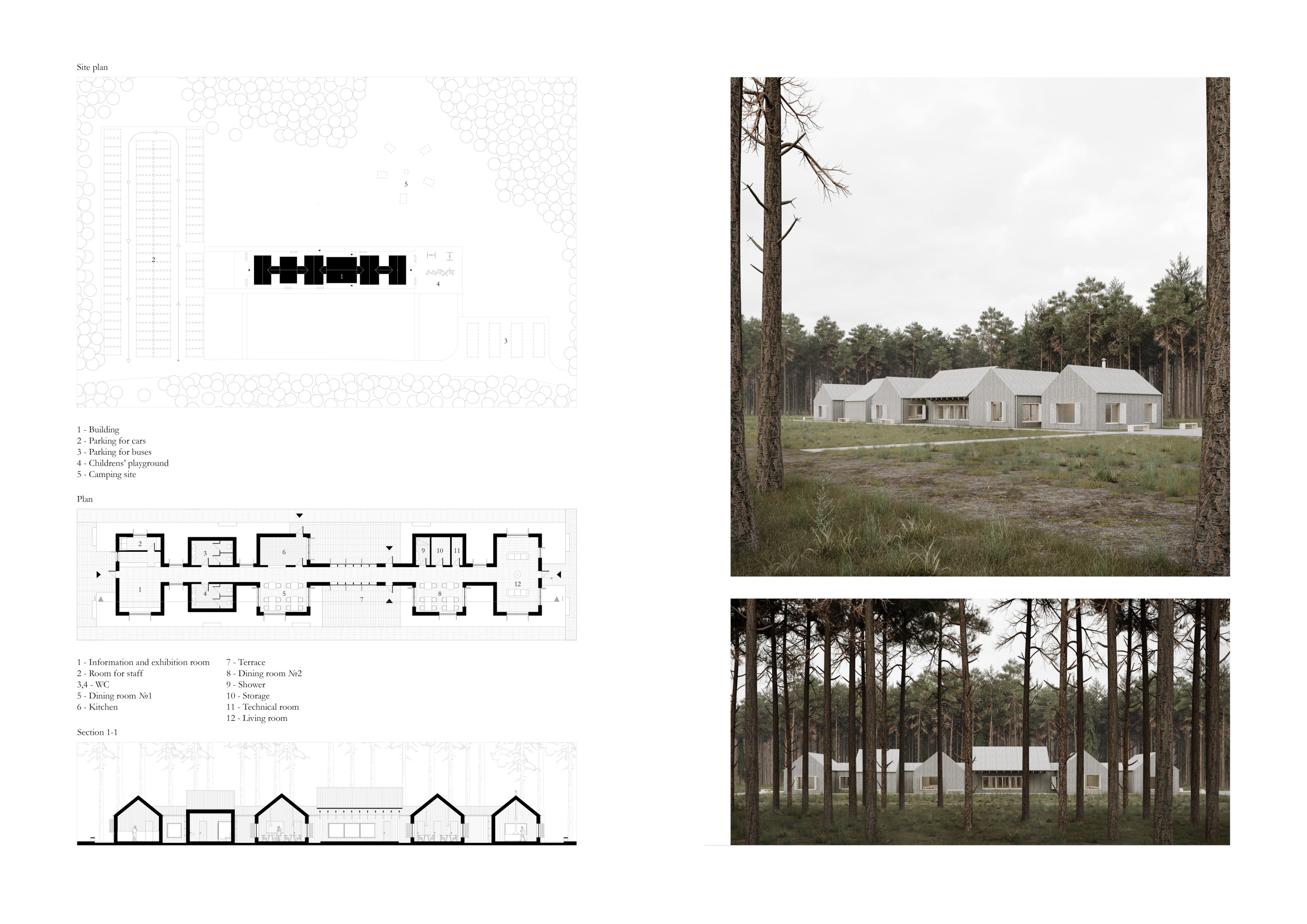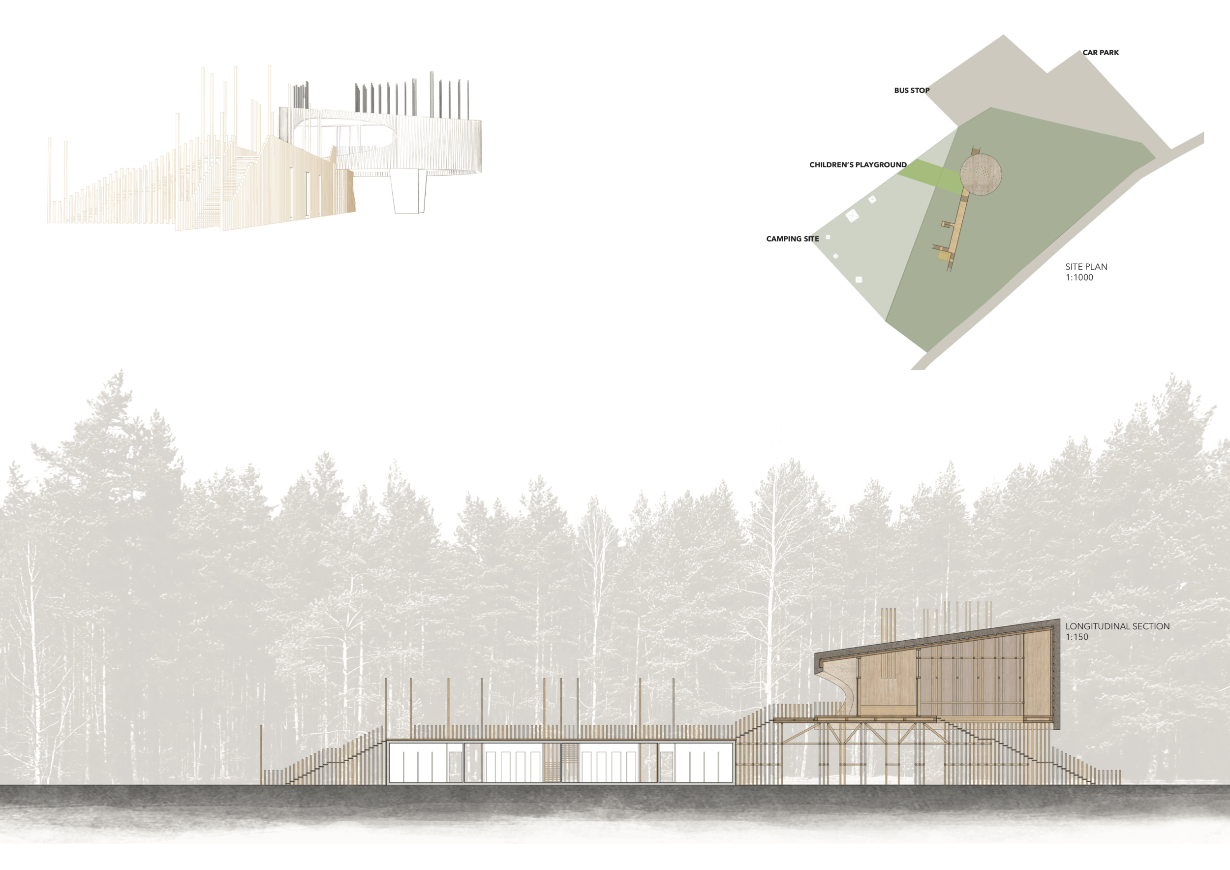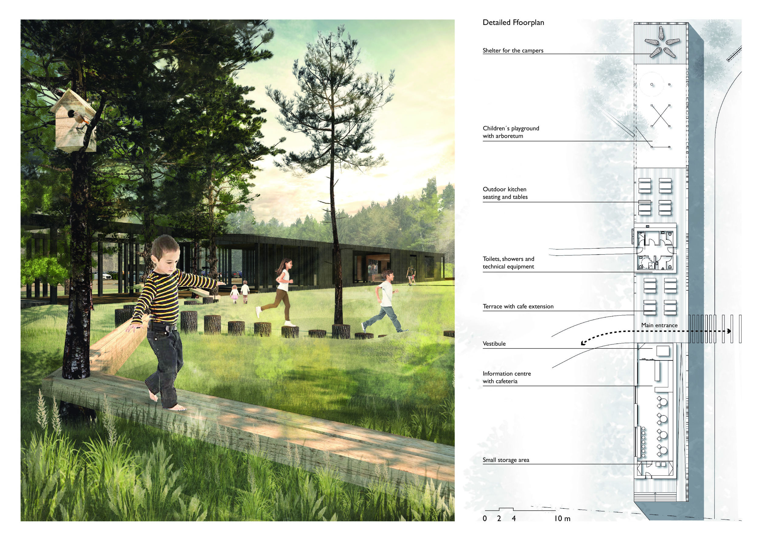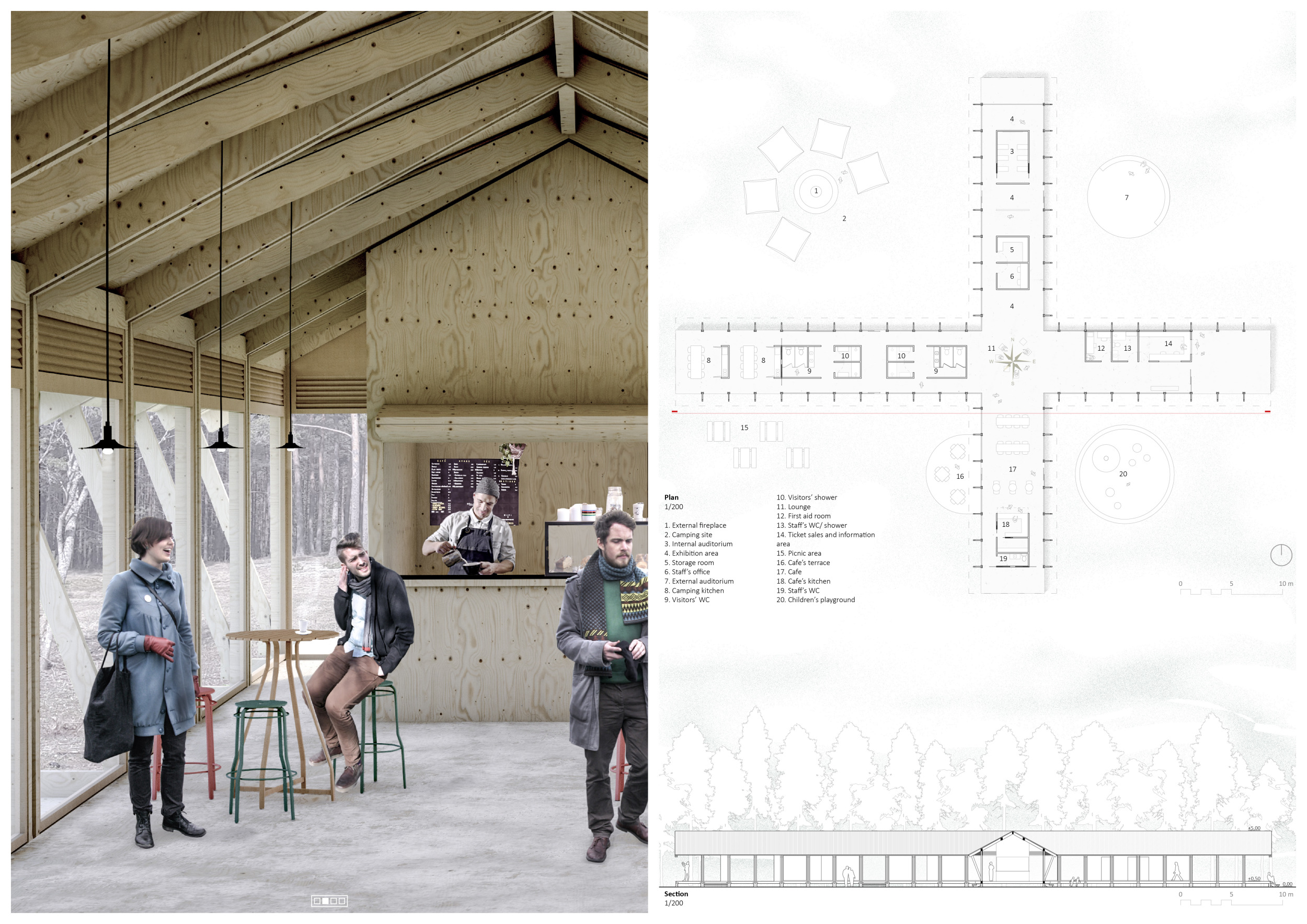 The proposed design program consists of: an information centre with a cafe, terrace, and external ticket window; a camping site with access to shower and toilet facilities; a children’s playground; and a car park with the capacity for 100 vehicles. It was requested that structural elements be made from durable materials. There were no dimensional requirements or budget.