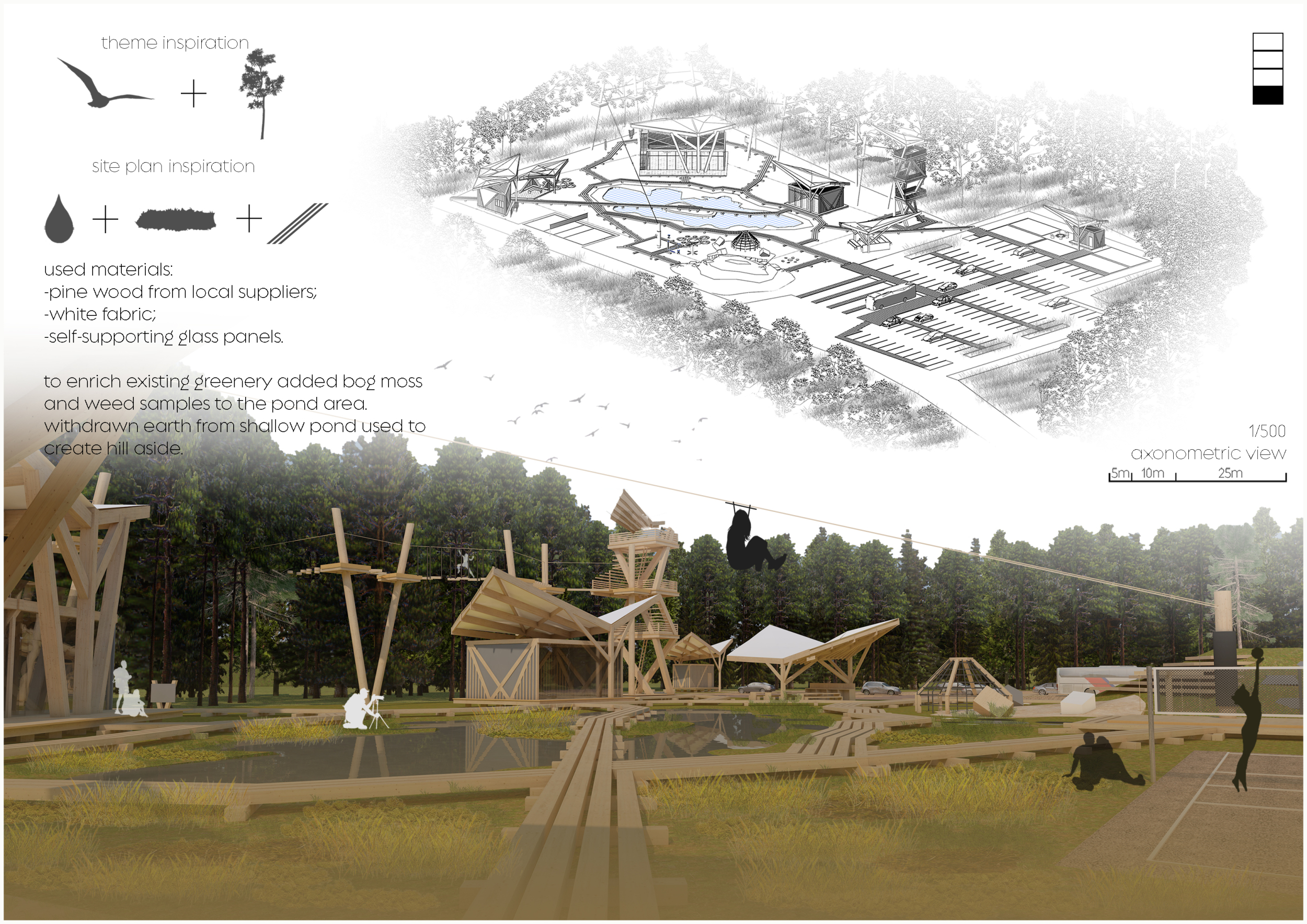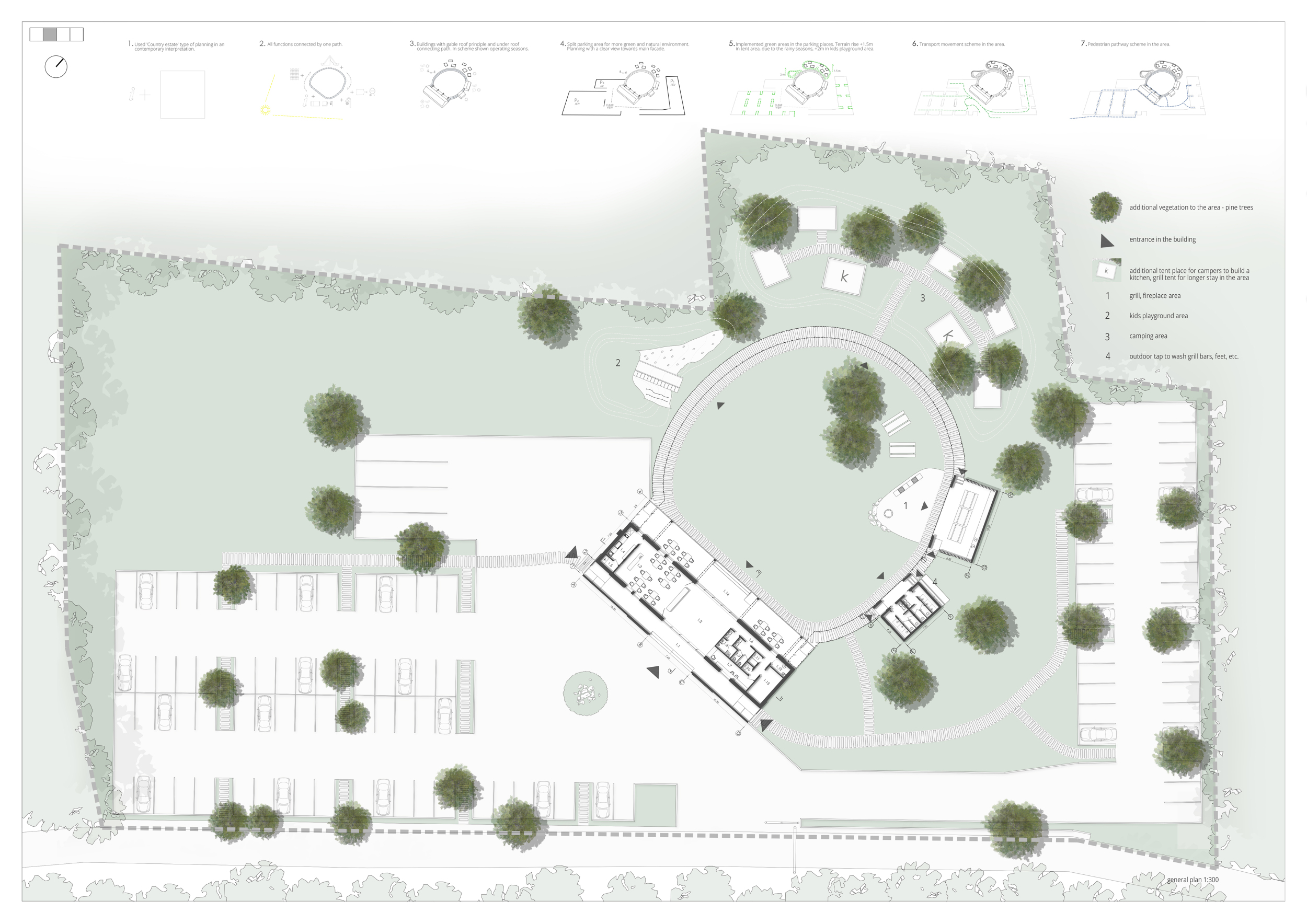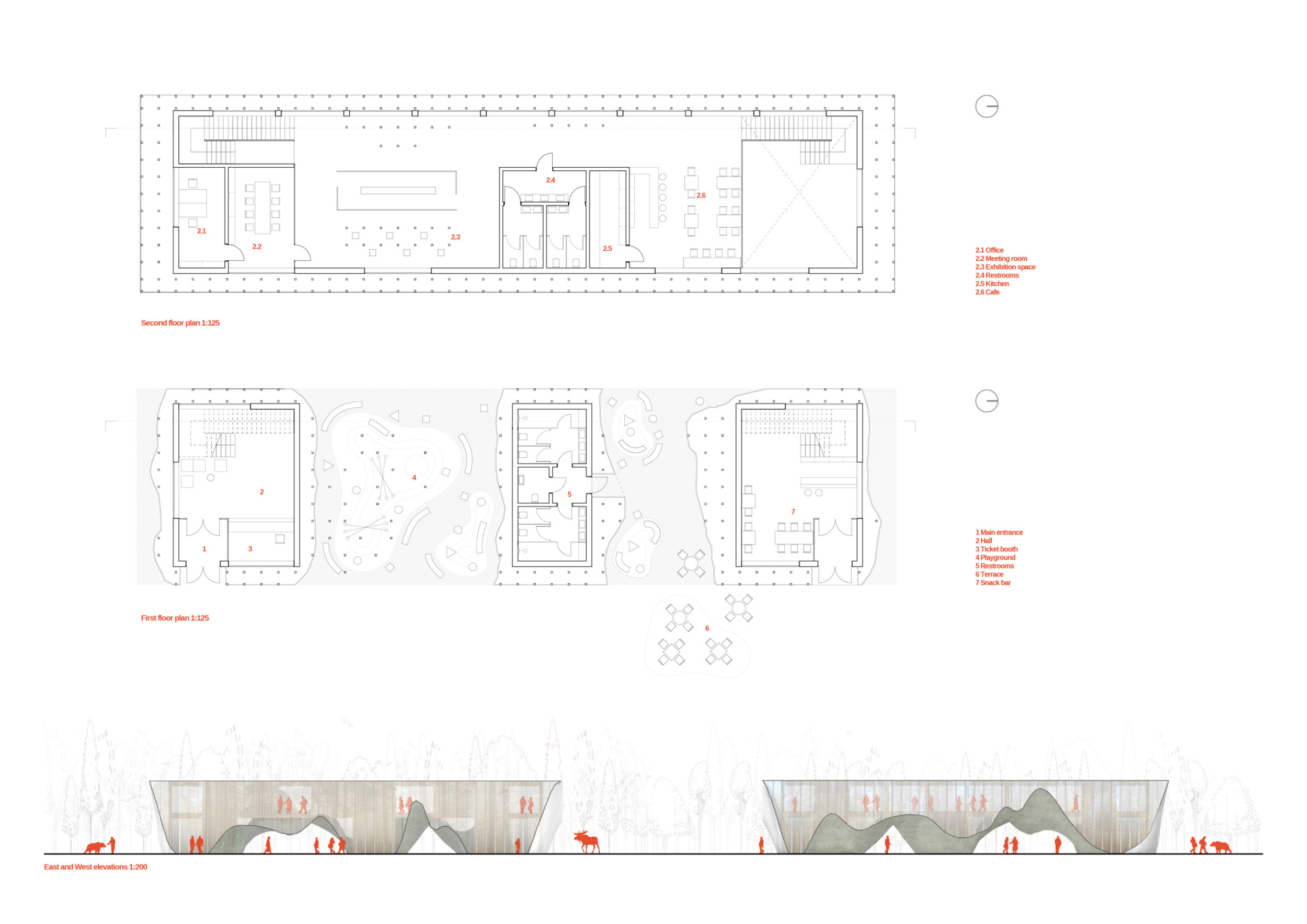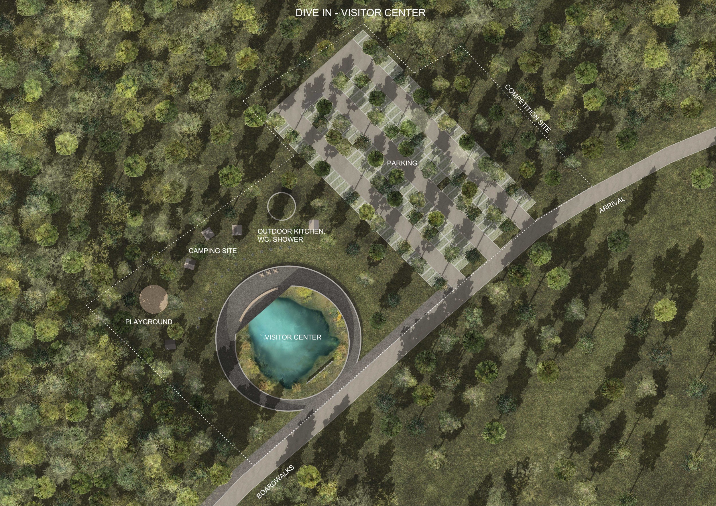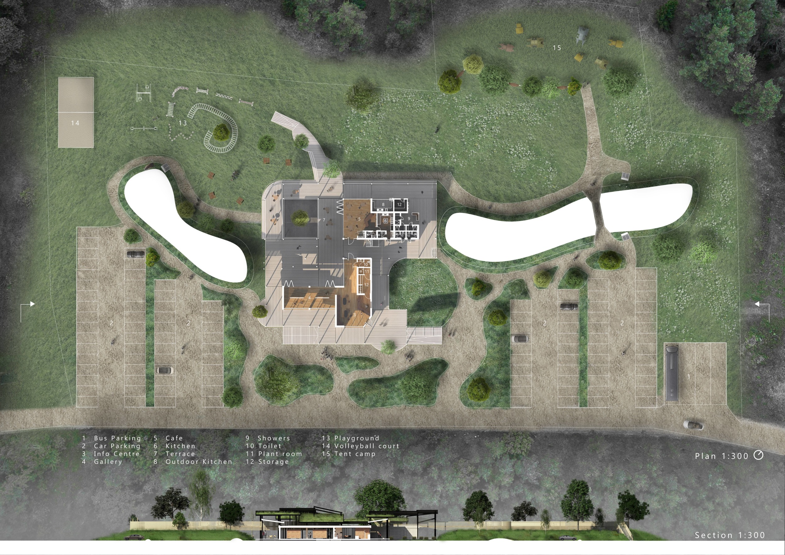 The proposed design program consists of: an information centre with a cafe, terrace, and external ticket window; a camping site with access to shower and toilet facilities; a children’s playground; and a car park with the capacity for 100 vehicles. It was requested that structural elements be made from durable materials. There were no dimensional requirements or budget.