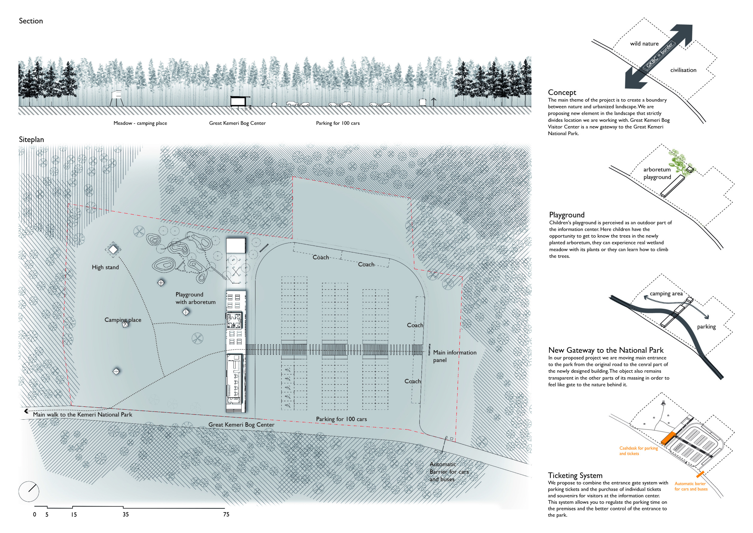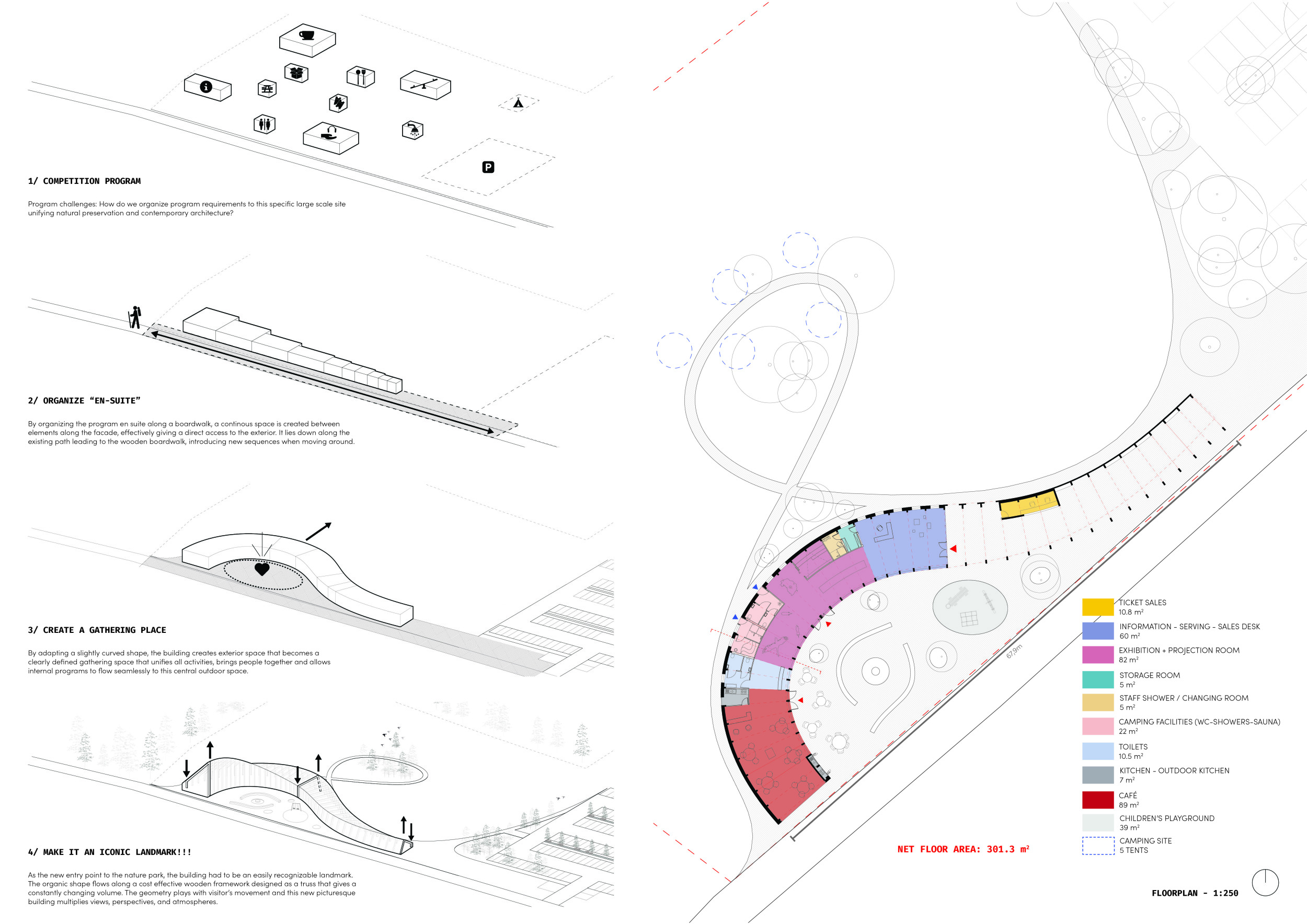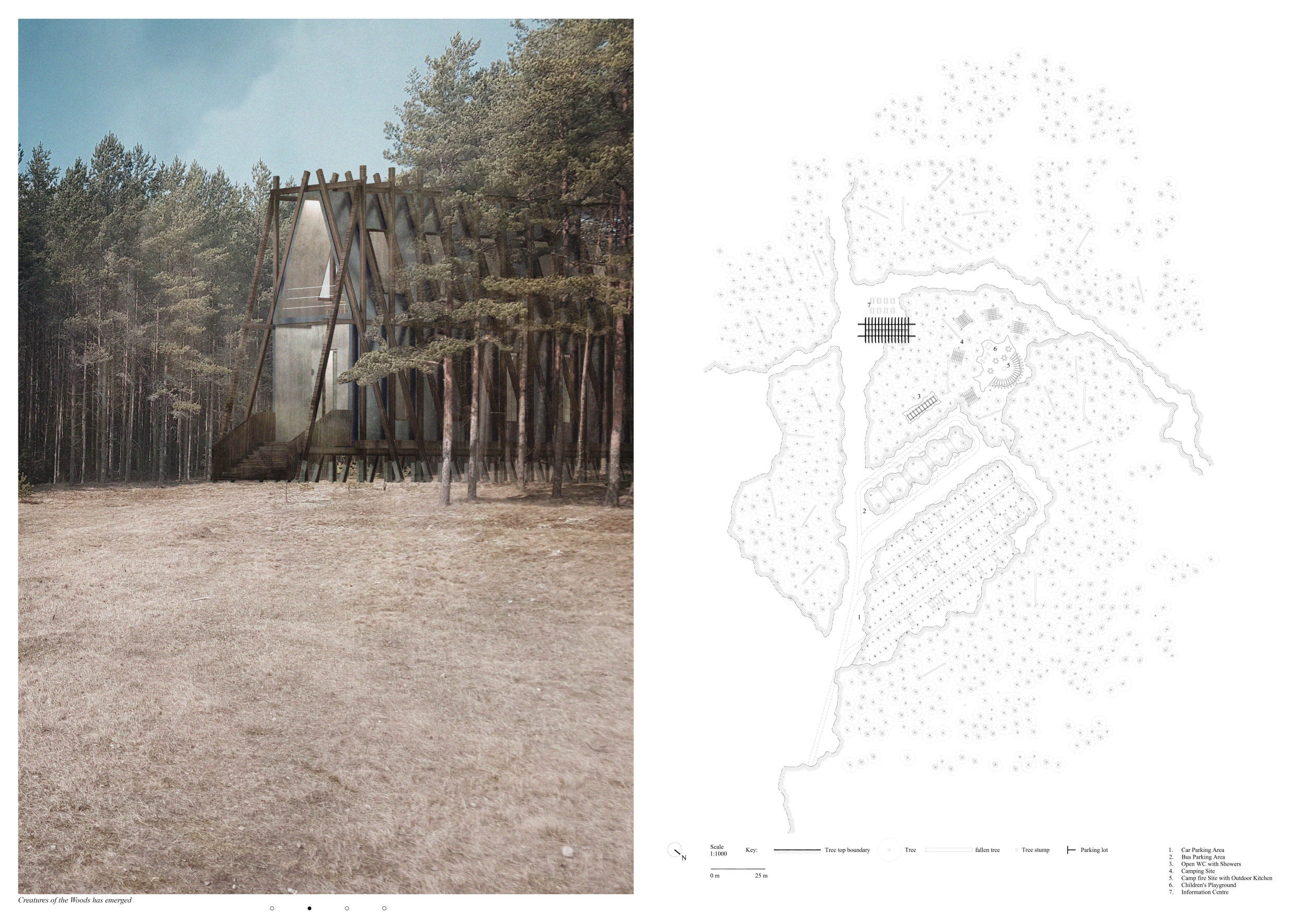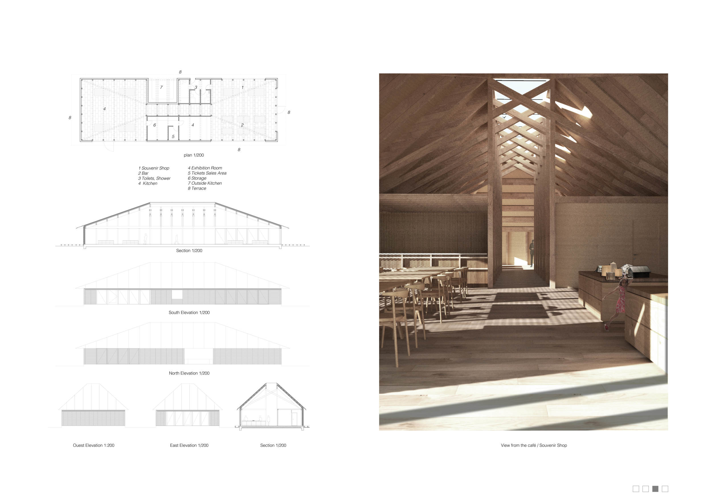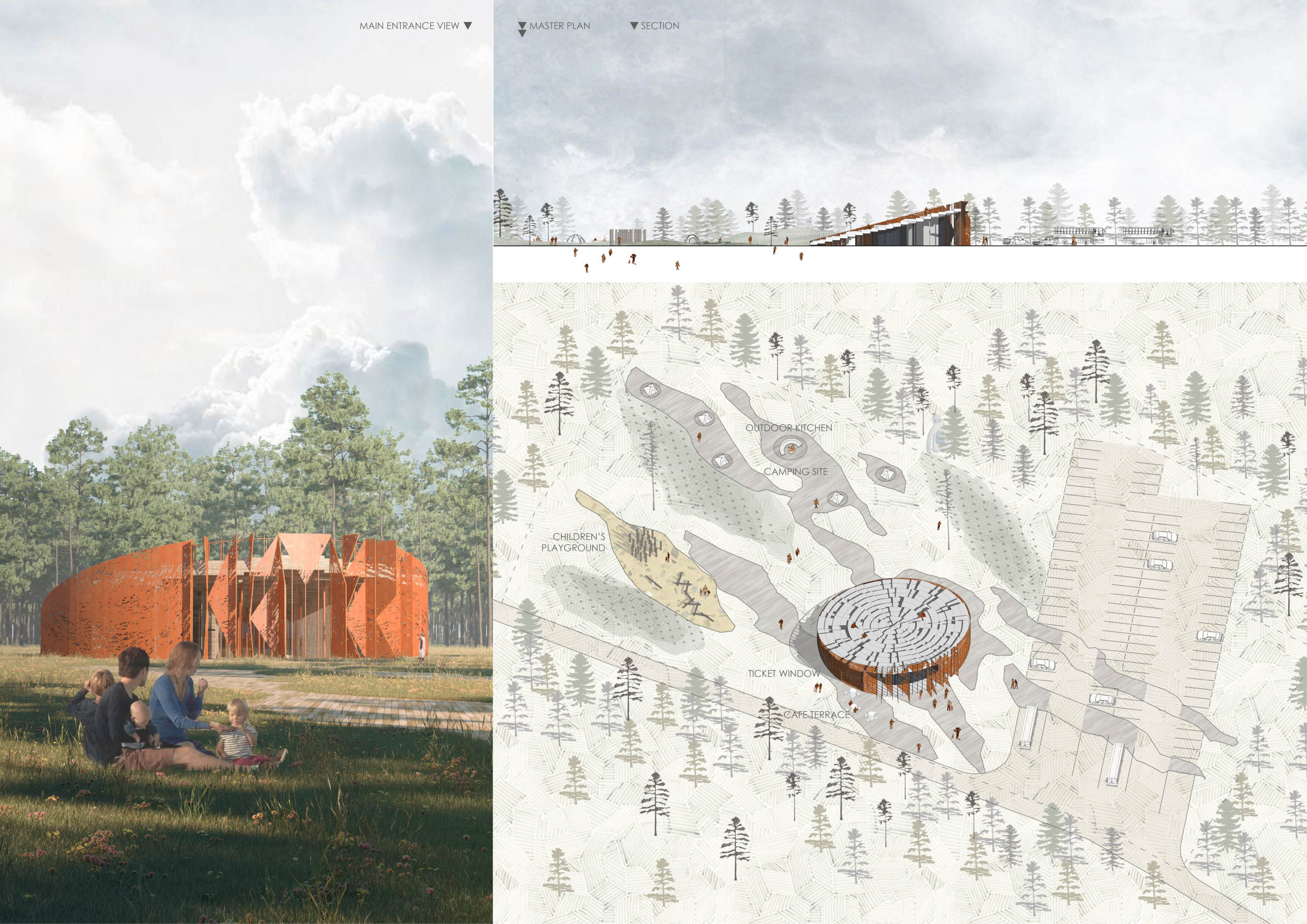 The proposed design program consists of: an information centre with a cafe, terrace, and external ticket window; a camping site with access to shower and toilet facilities; a children’s playground; and a car park with the capacity for 100 vehicles. It was requested that structural elements be made from durable materials. There were no dimensional requirements or budget.