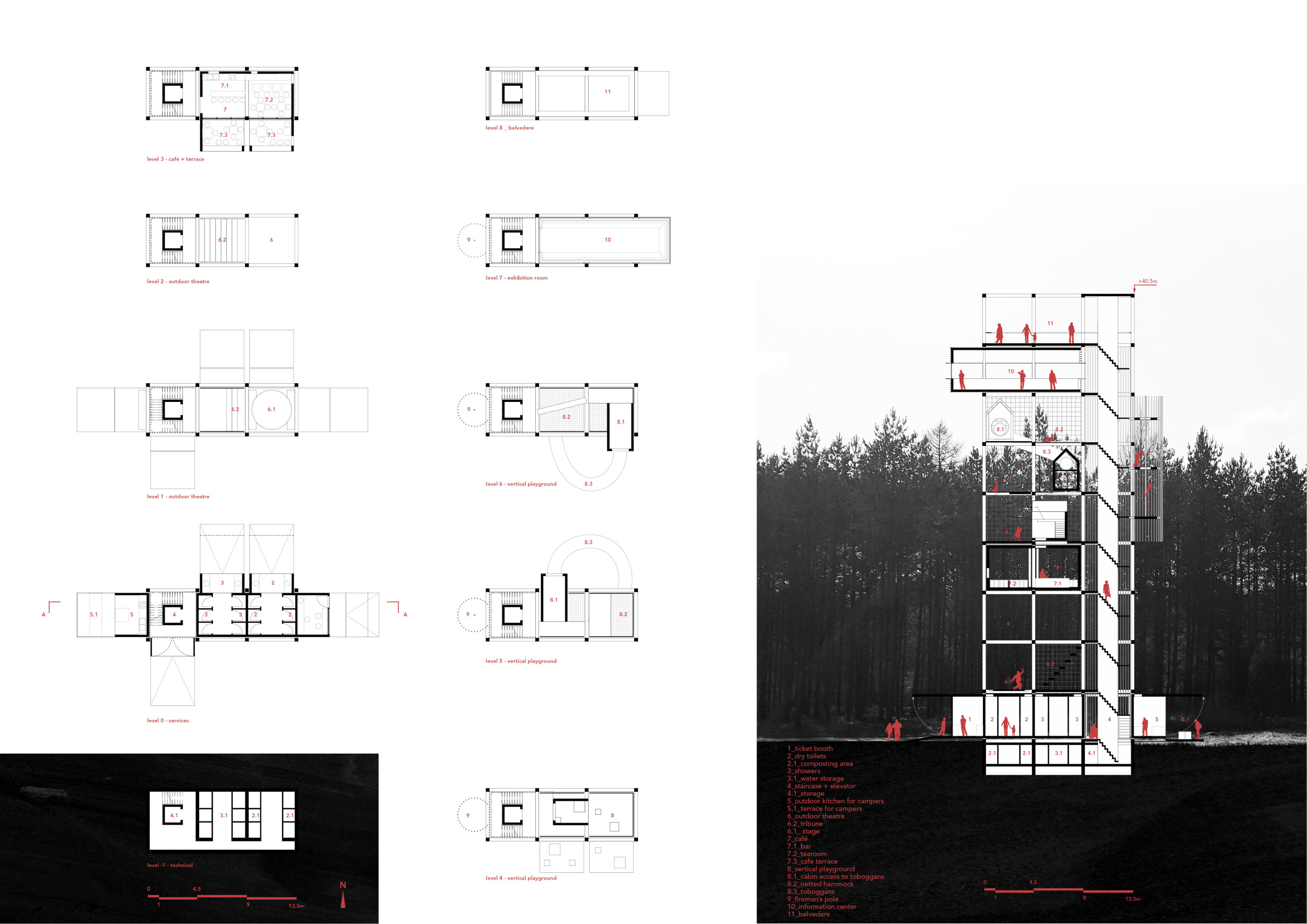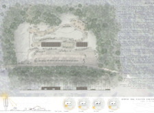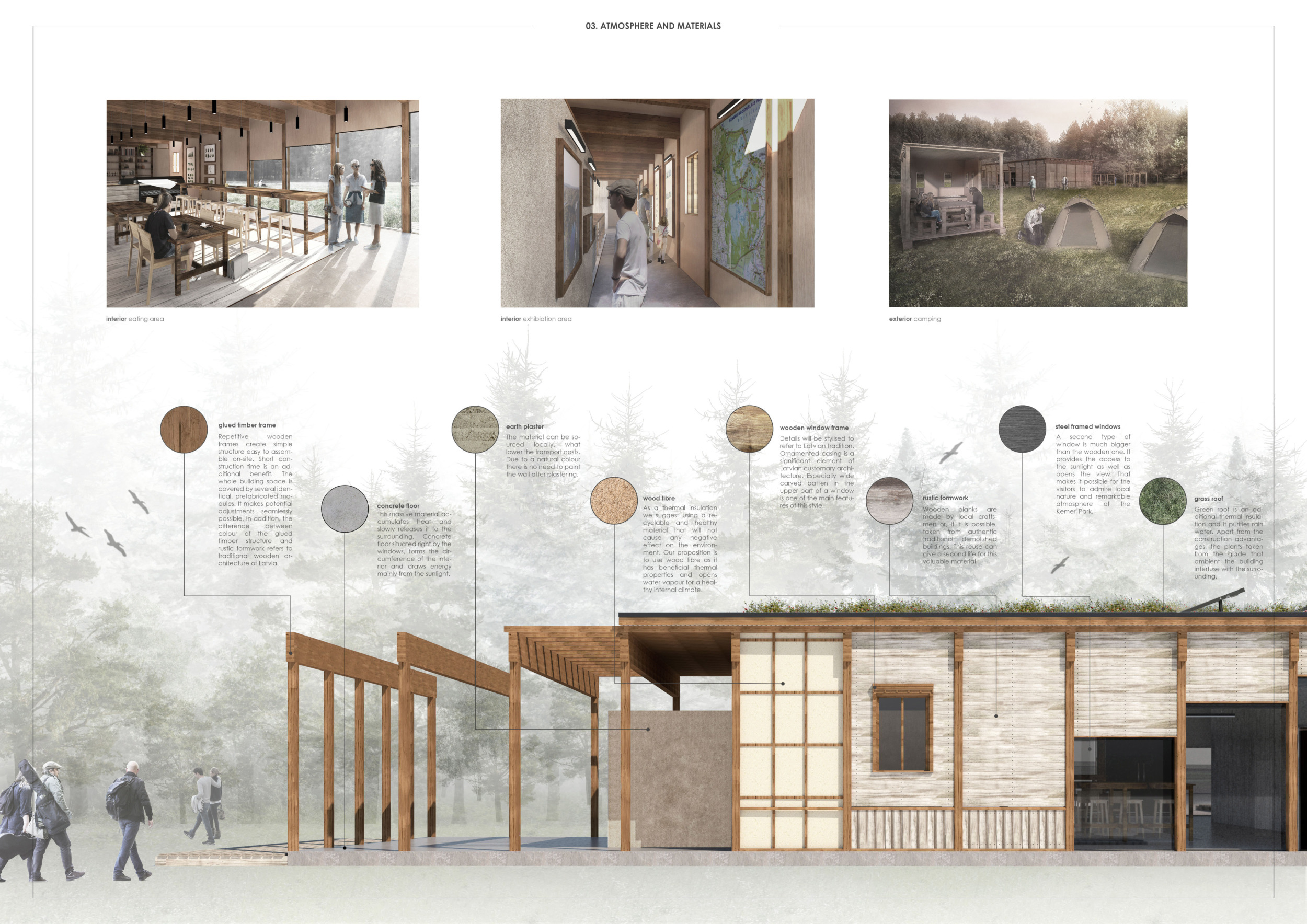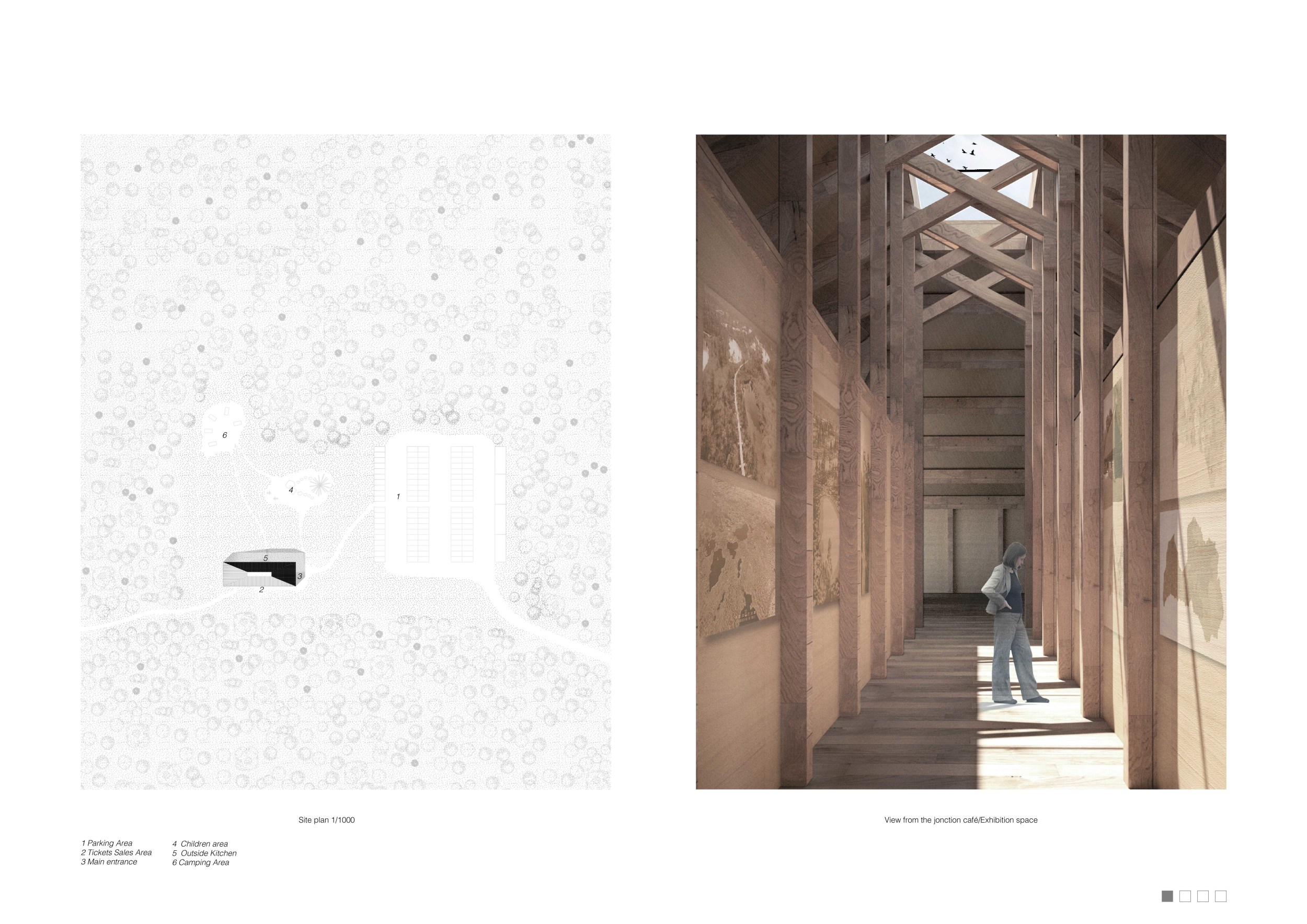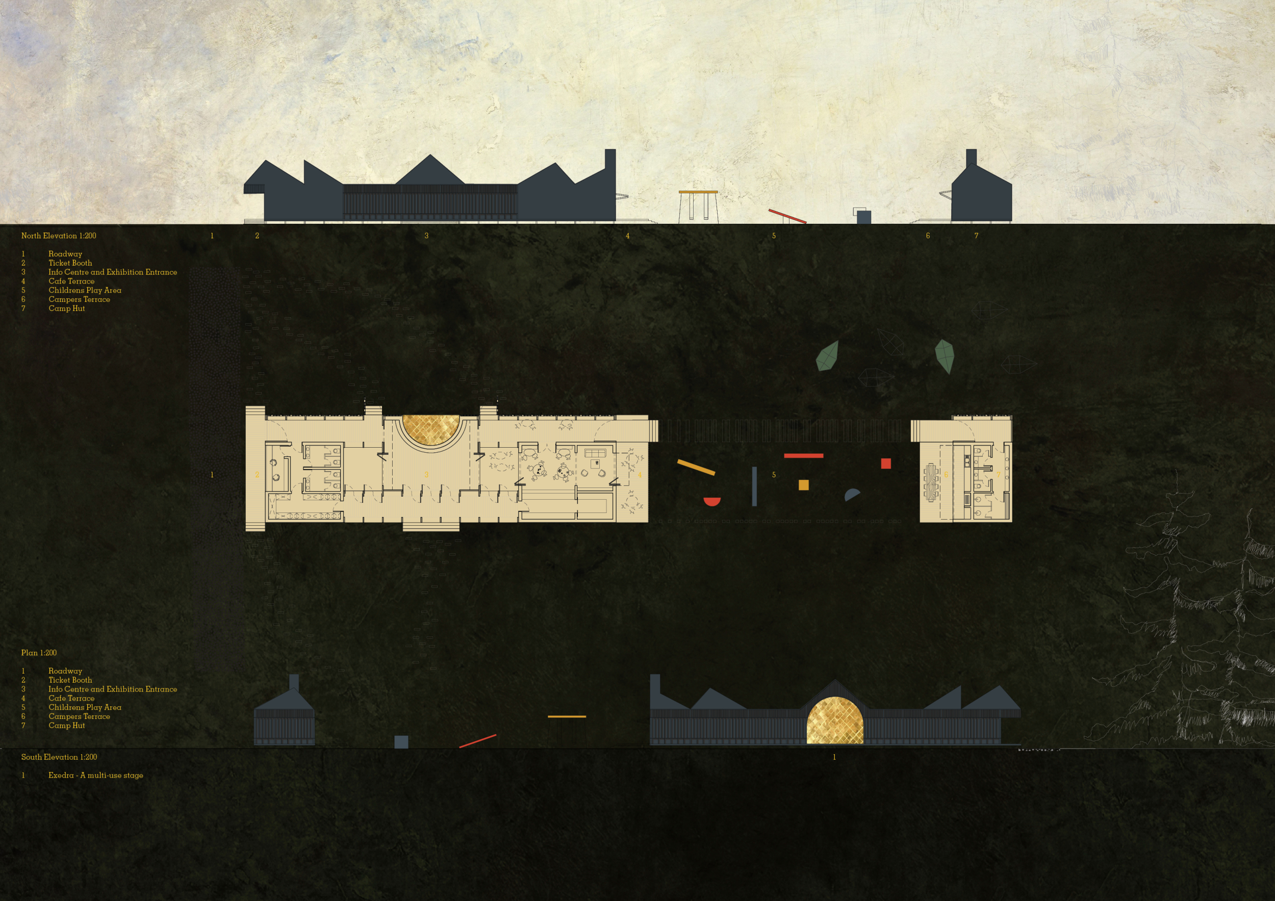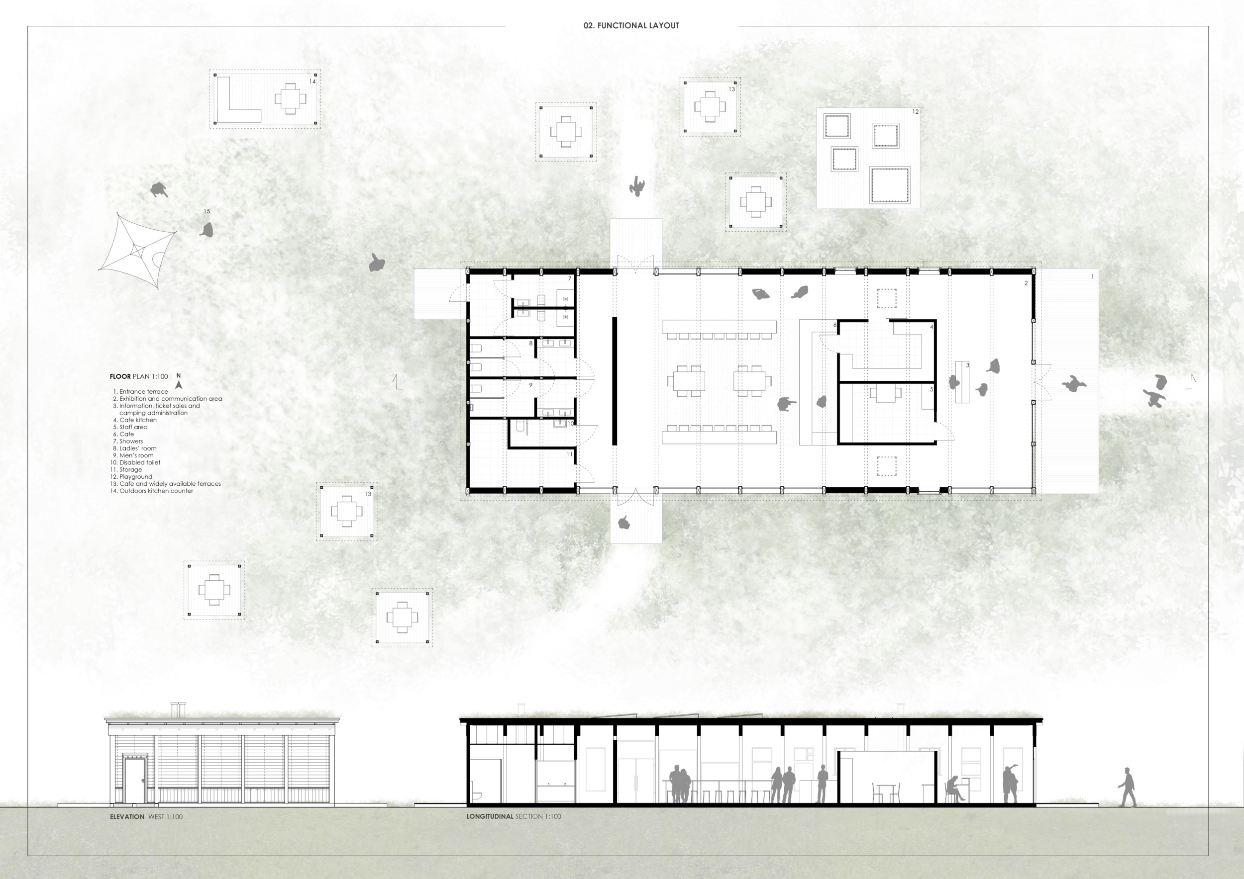 The proposed design program consists of: an information centre with a cafe, terrace, and external ticket window; a camping site with access to shower and toilet facilities; a children’s playground; and a car park with the capacity for 100 vehicles. It was requested that structural elements be made from durable materials. There were no dimensional requirements or budget.