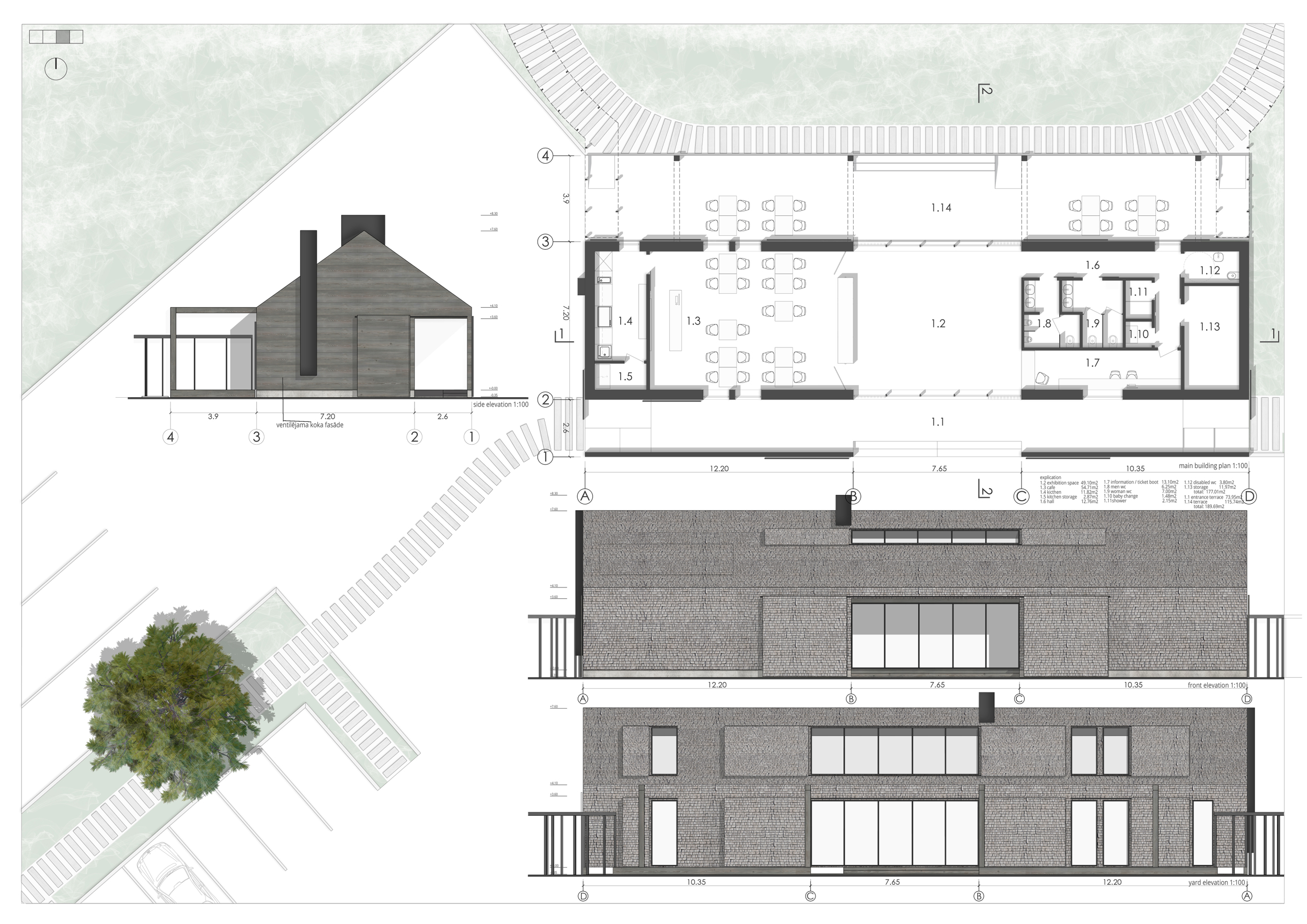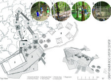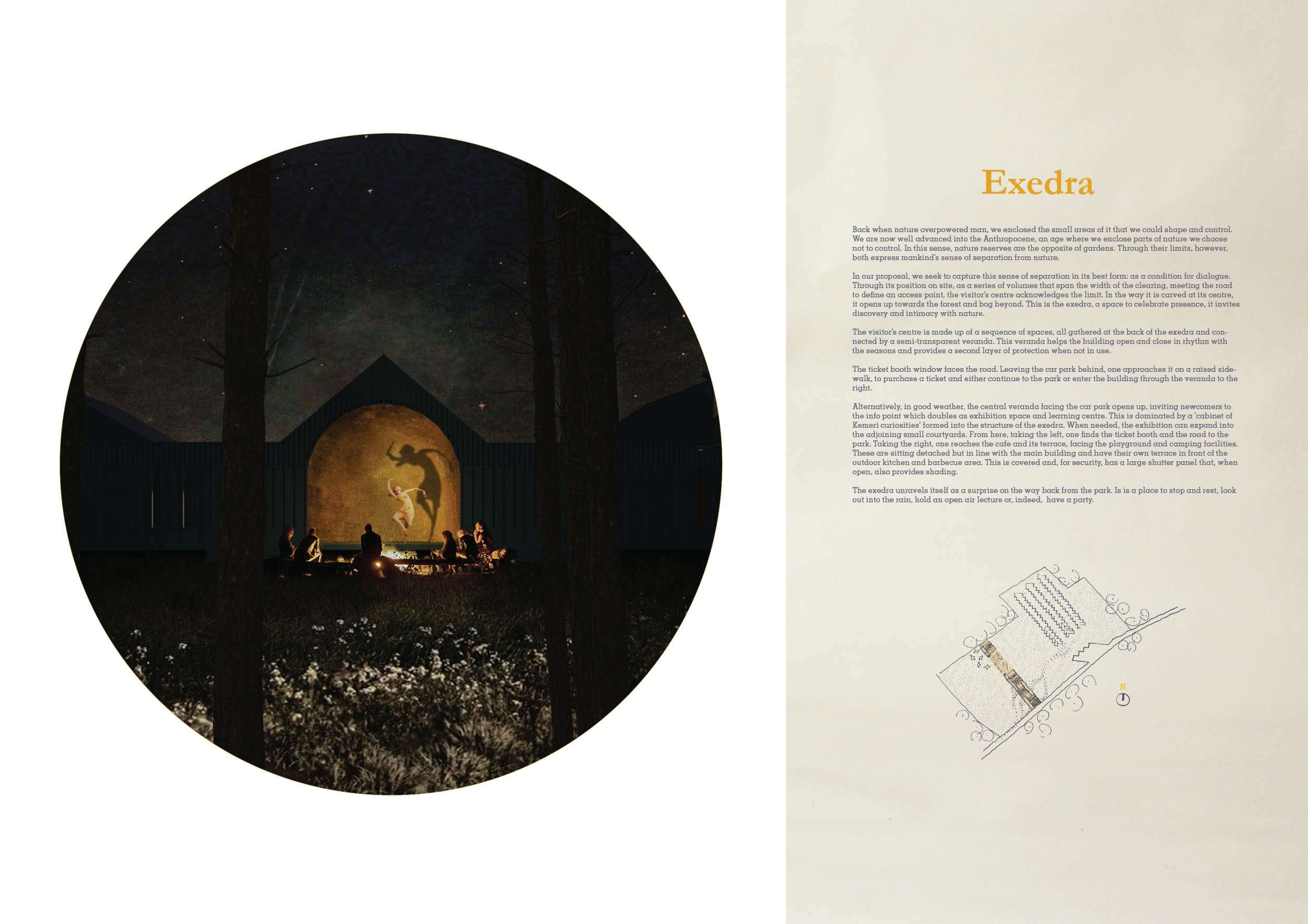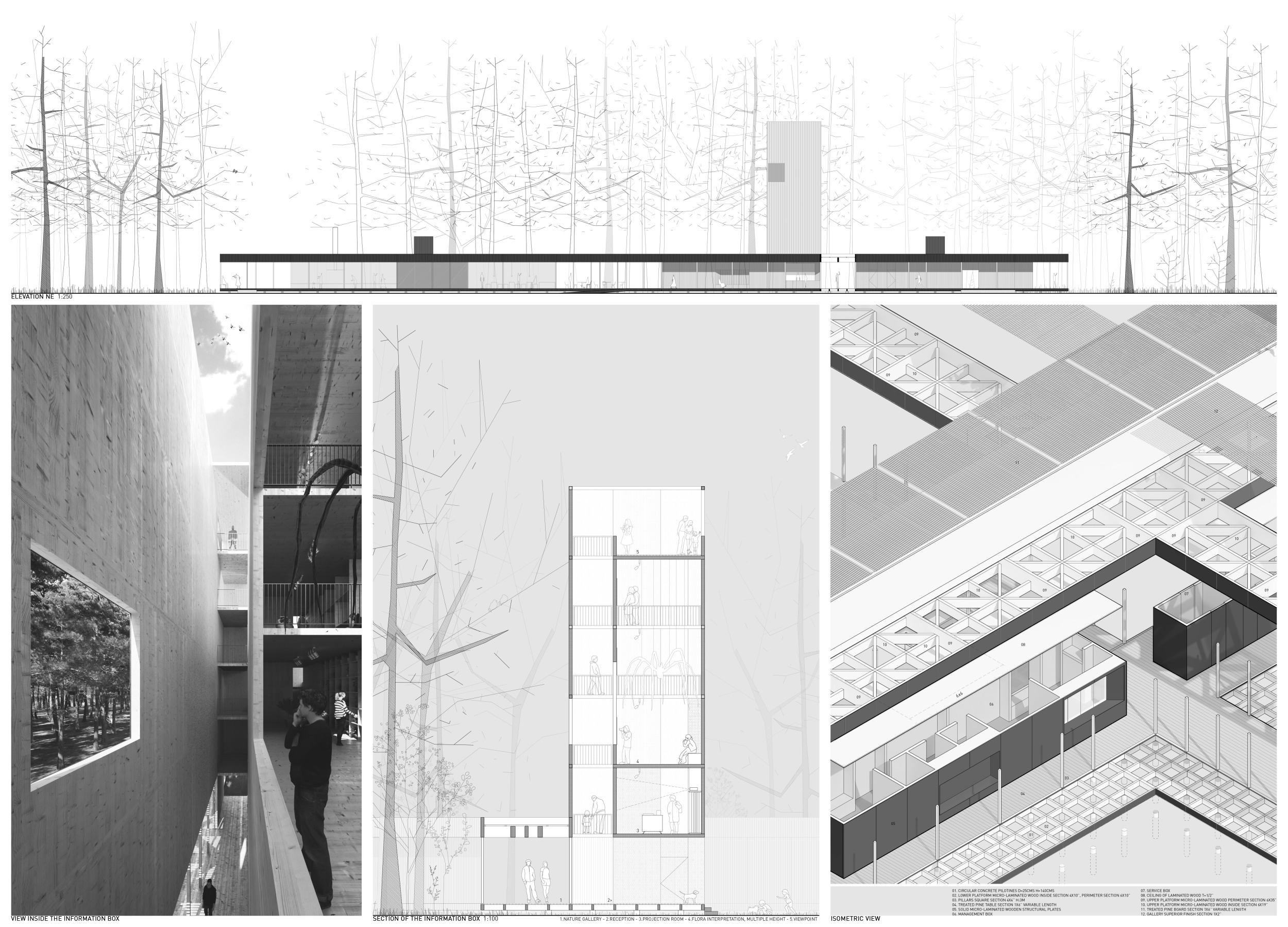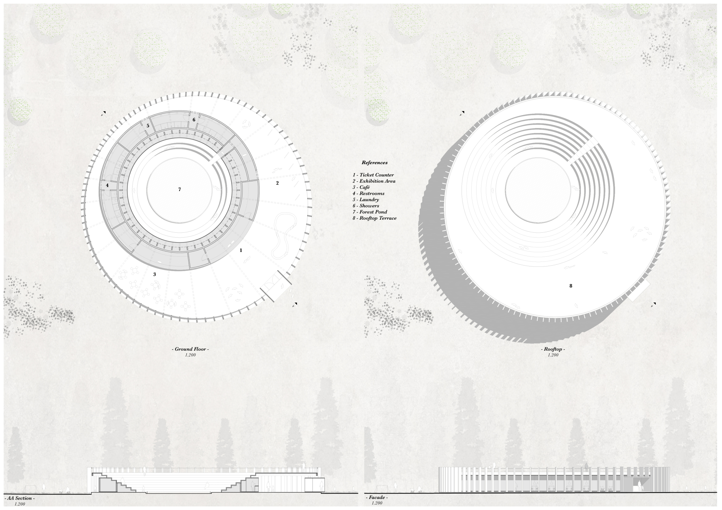 The proposed design program consists of: an information centre with a cafe, terrace, and external ticket window; a camping site with access to shower and toilet facilities; a children’s playground; and a car park with the capacity for 100 vehicles. It was requested that structural elements be made from durable materials. There were no dimensional requirements or budget.