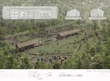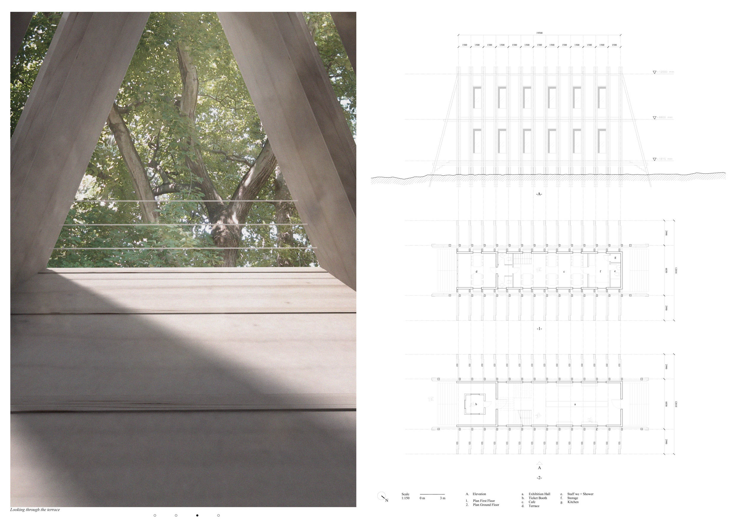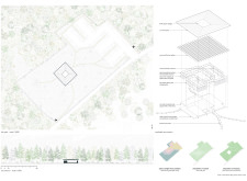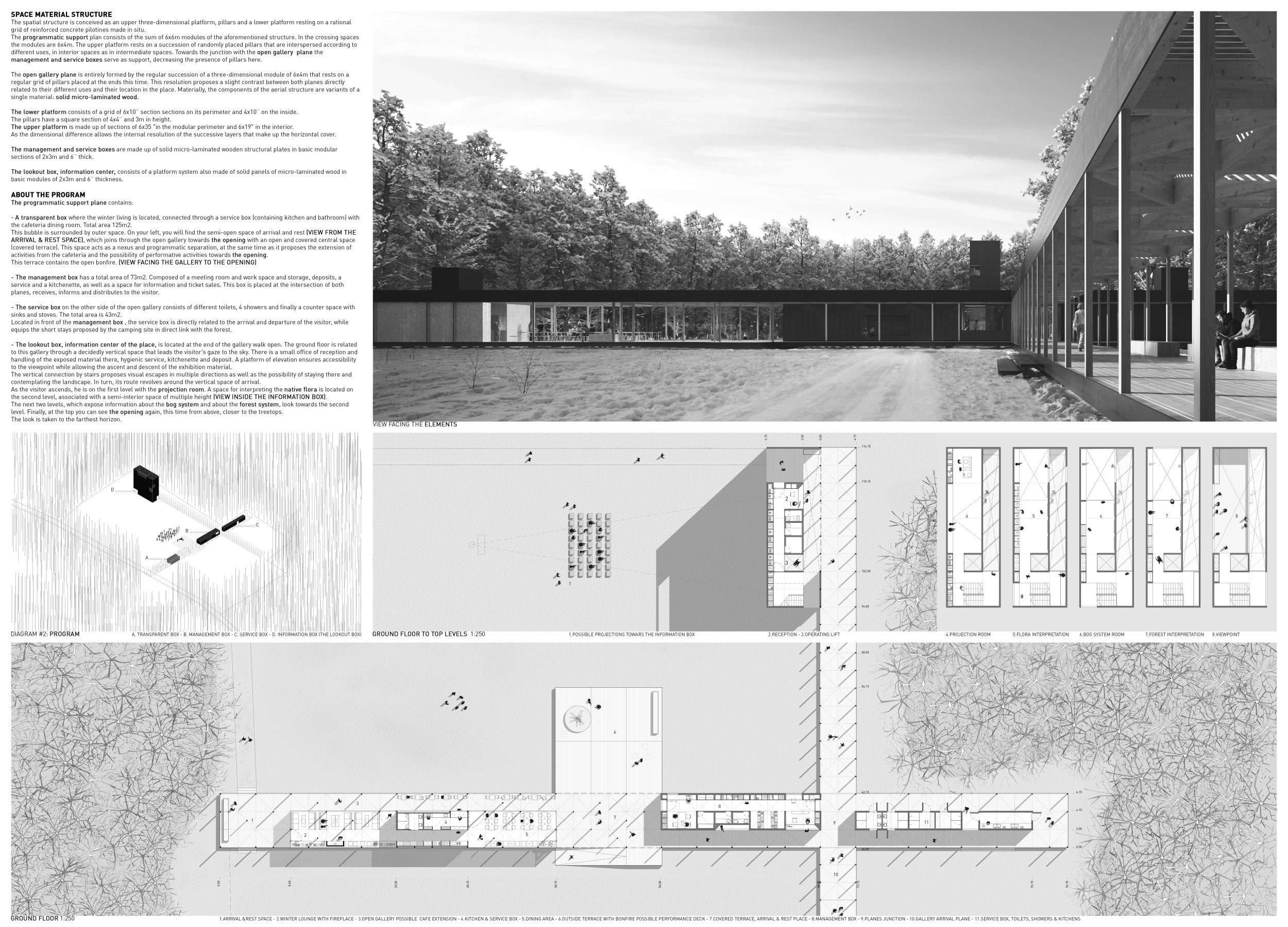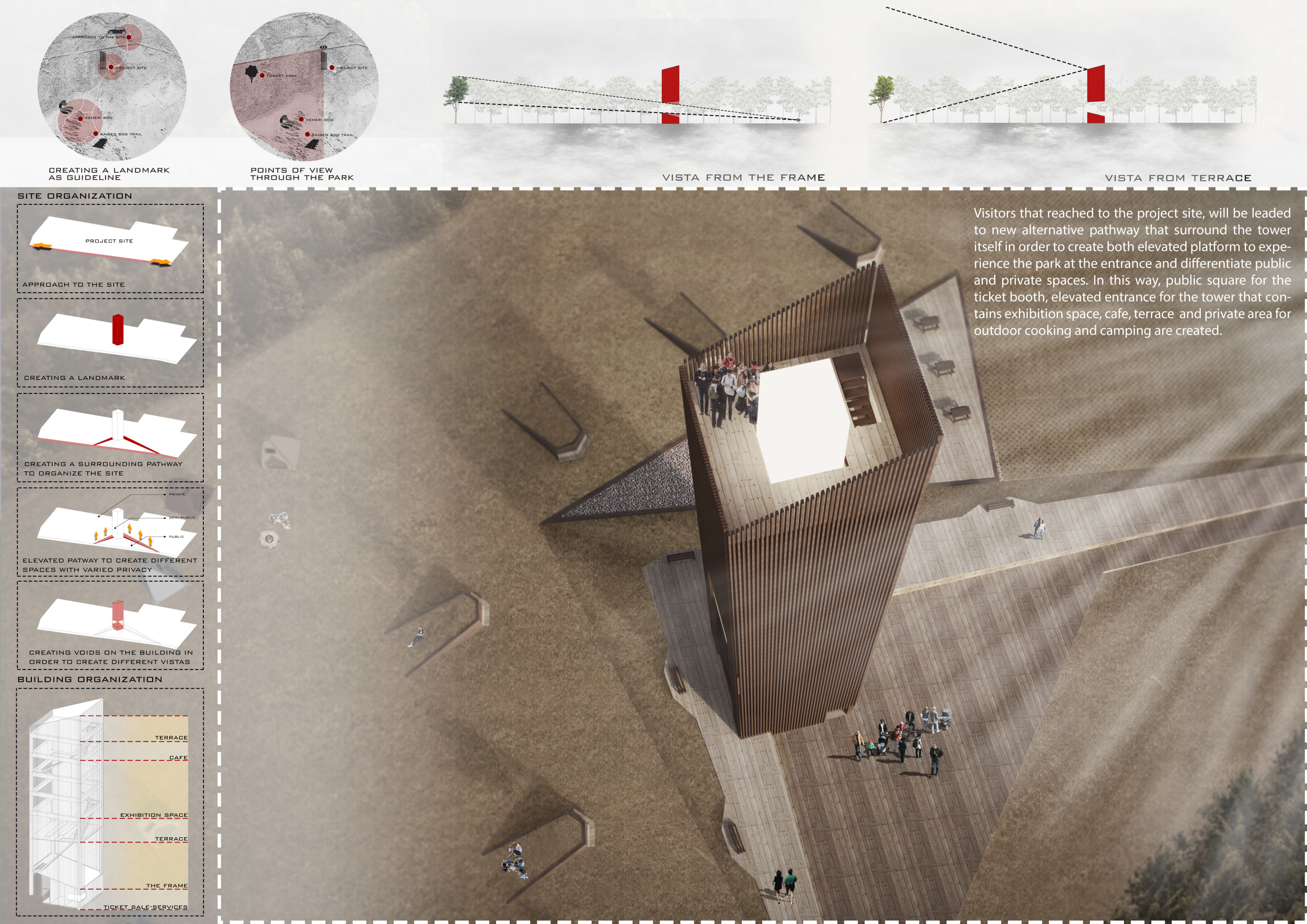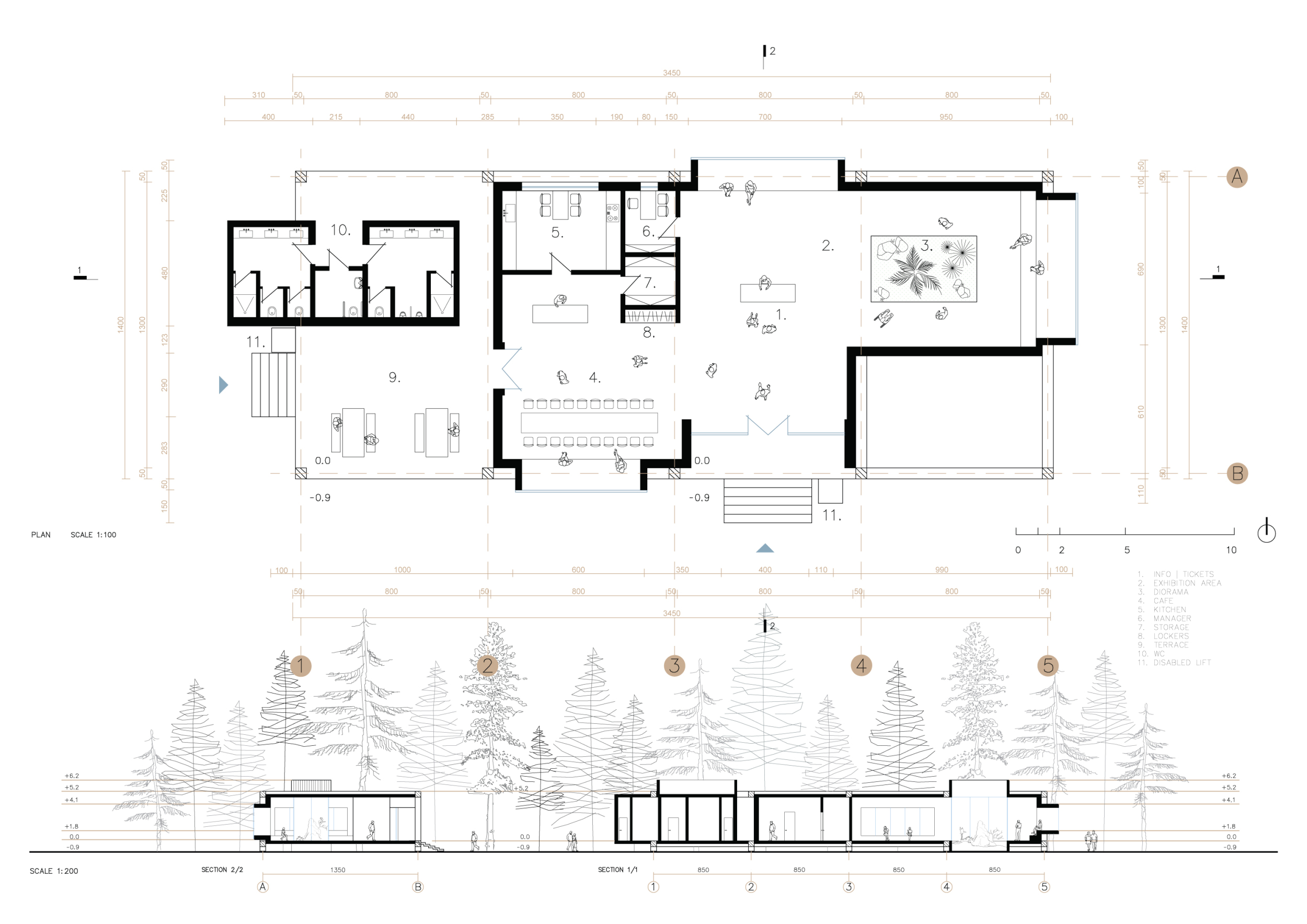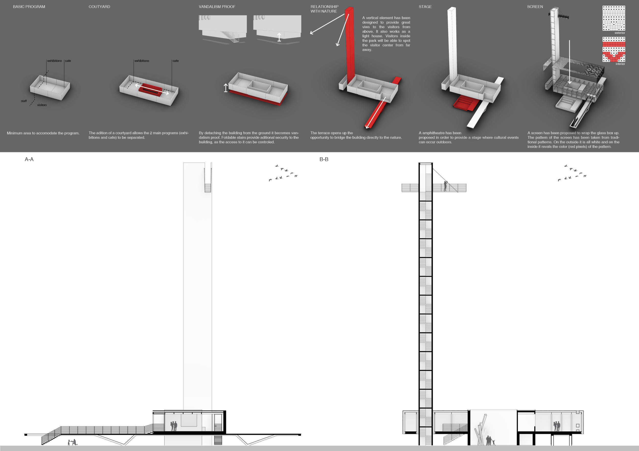The proposed design program consists of: an information centre with a cafe, terrace, and external ticket window; a camping site with access to shower and toilet facilities; a children’s playground; and a car park with the capacity for 100 vehicles. It was requested that structural elements be made from durable materials. There were no dimensional requirements or budget.