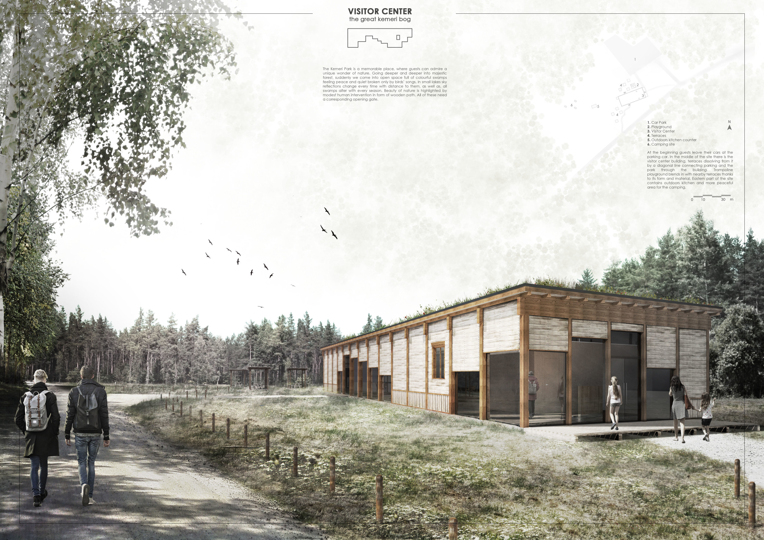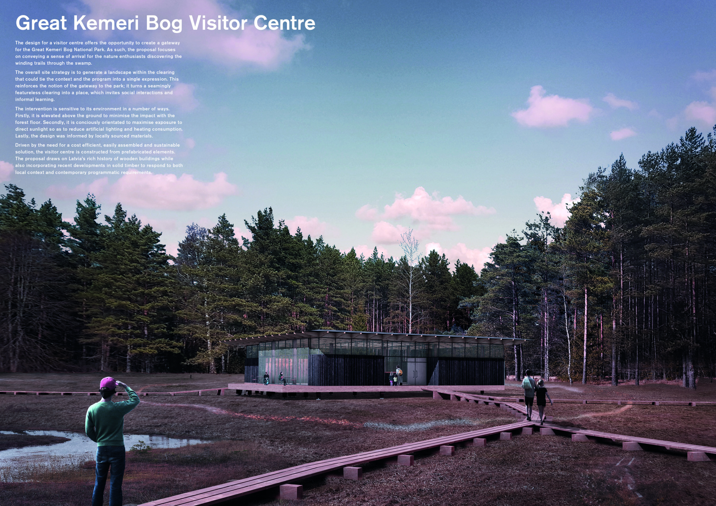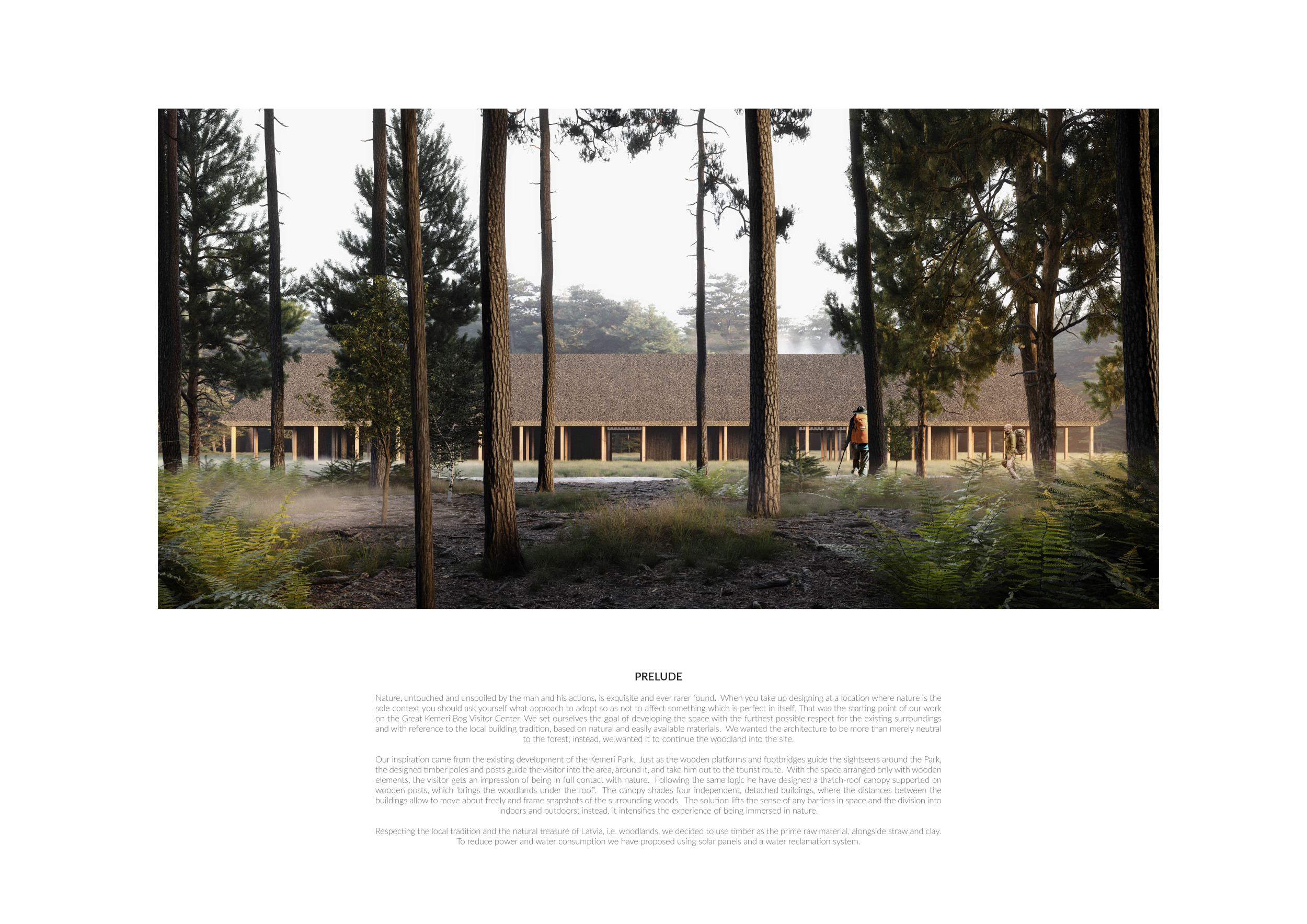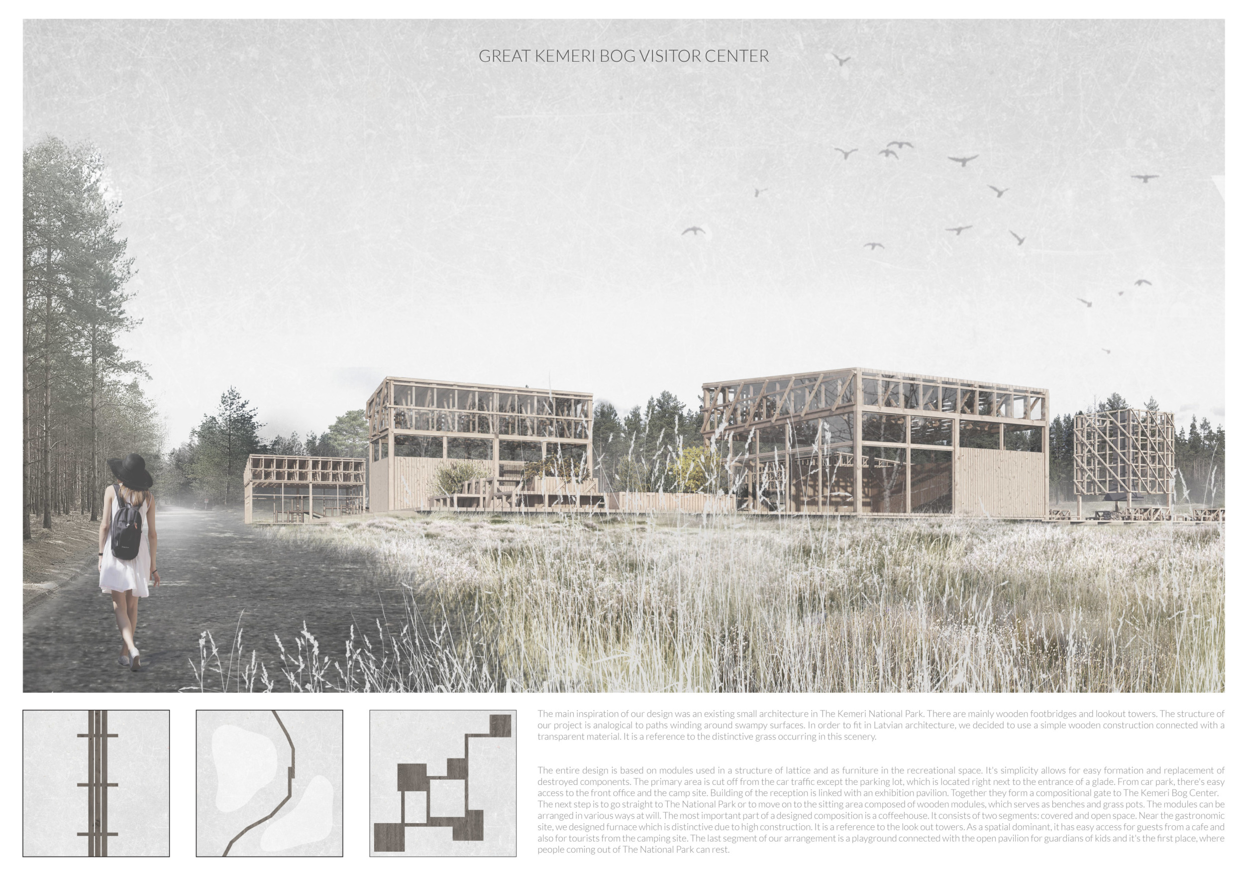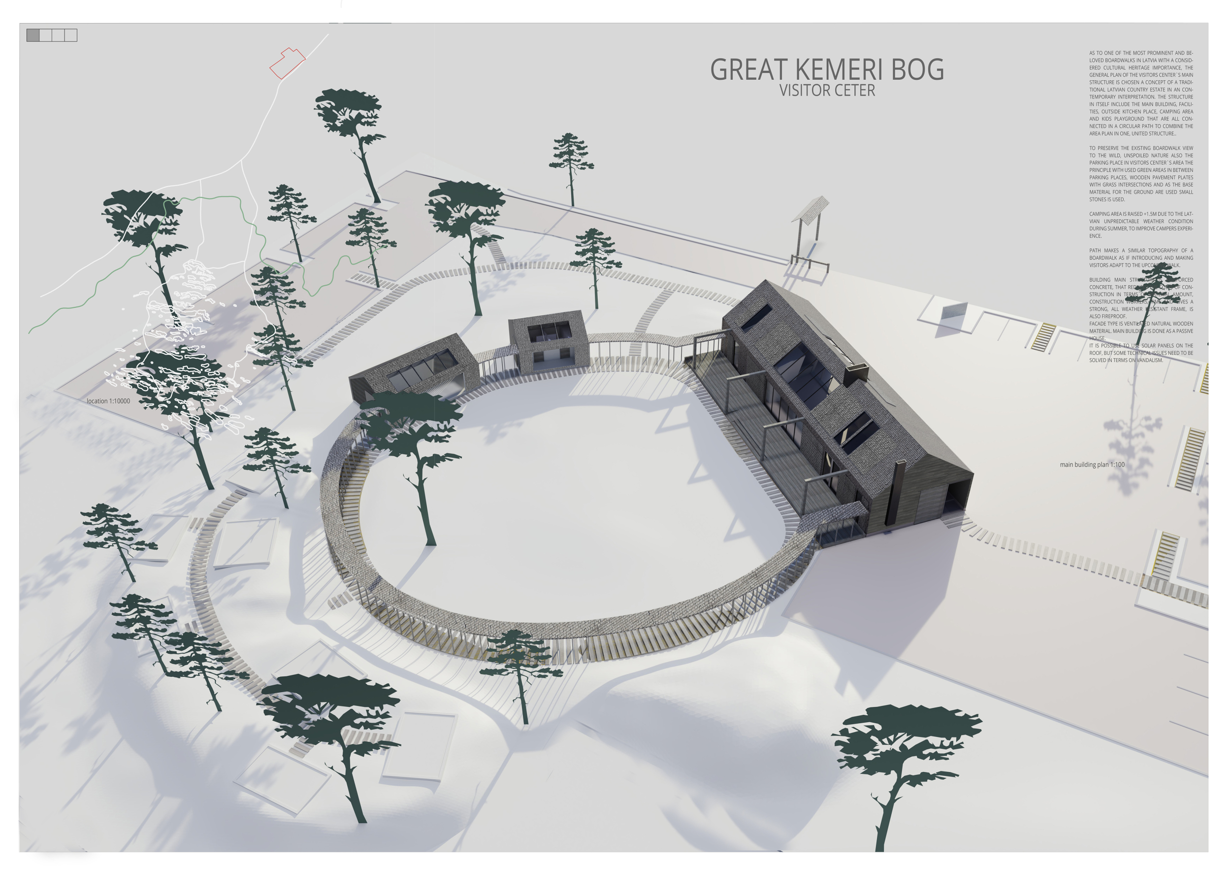 In the current competition participants were tasked with designing a visitor center on a site located at the entry to the Great Kemeri Bog boardwalk. The site is currently used as a car park and gathering point for boardwalk visitors.