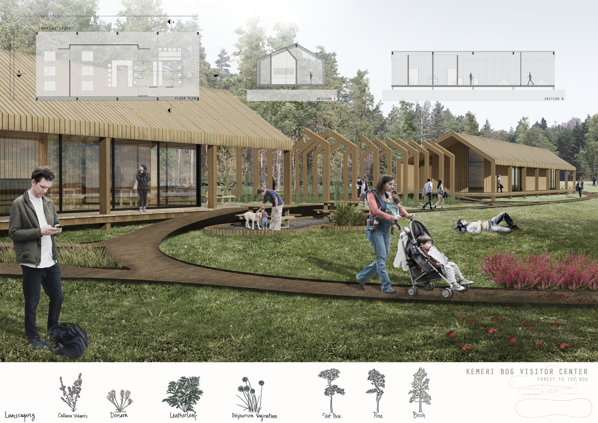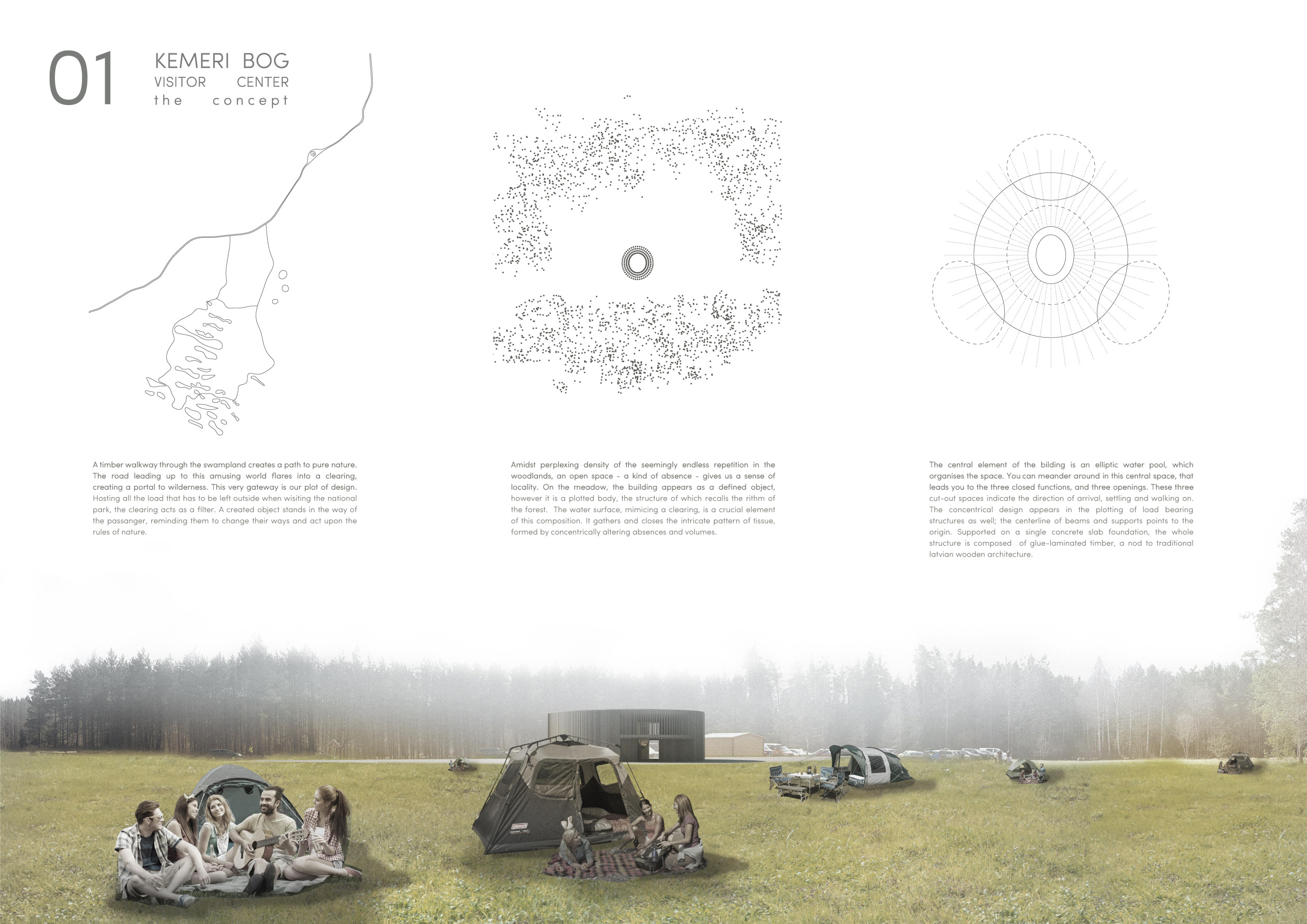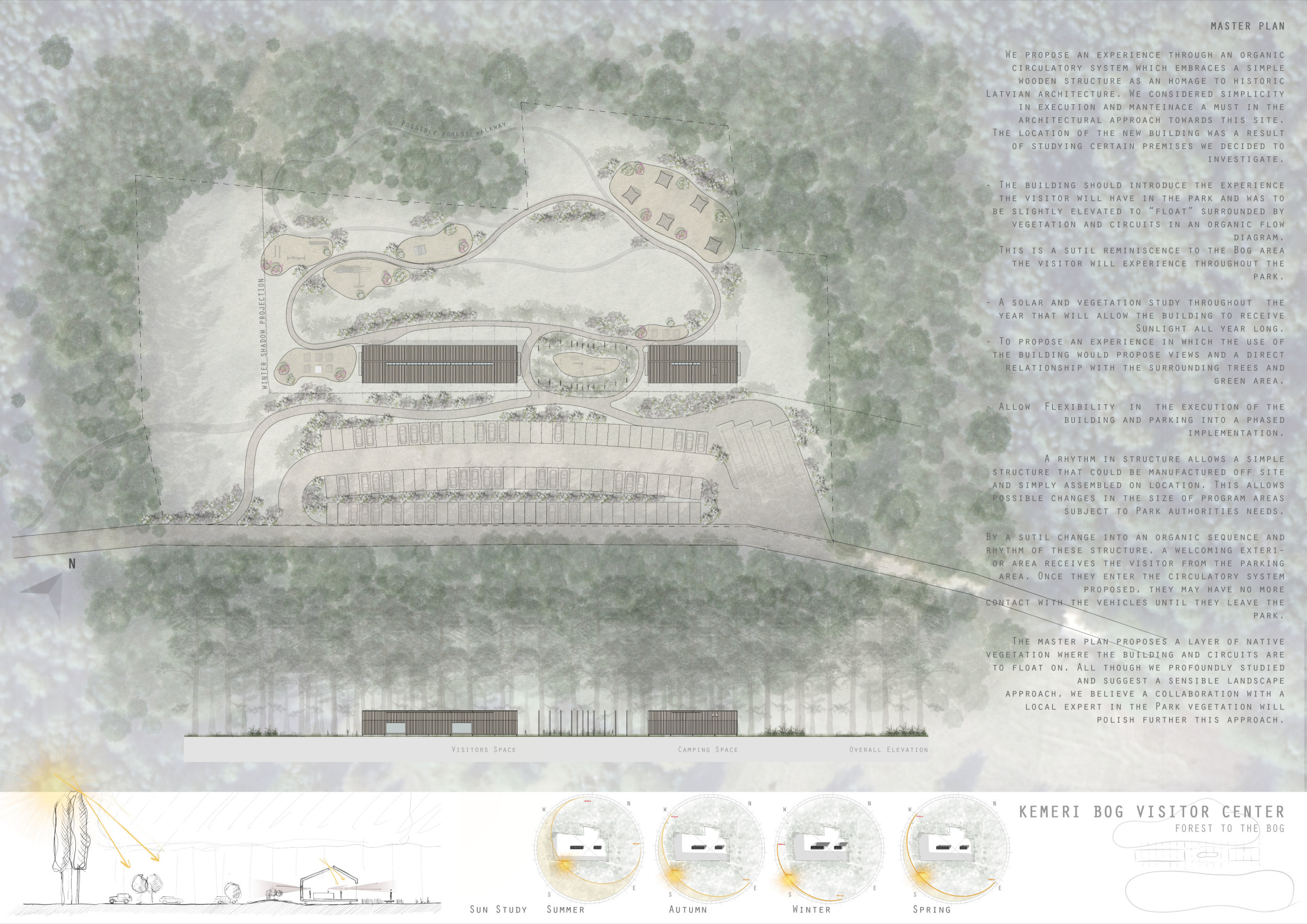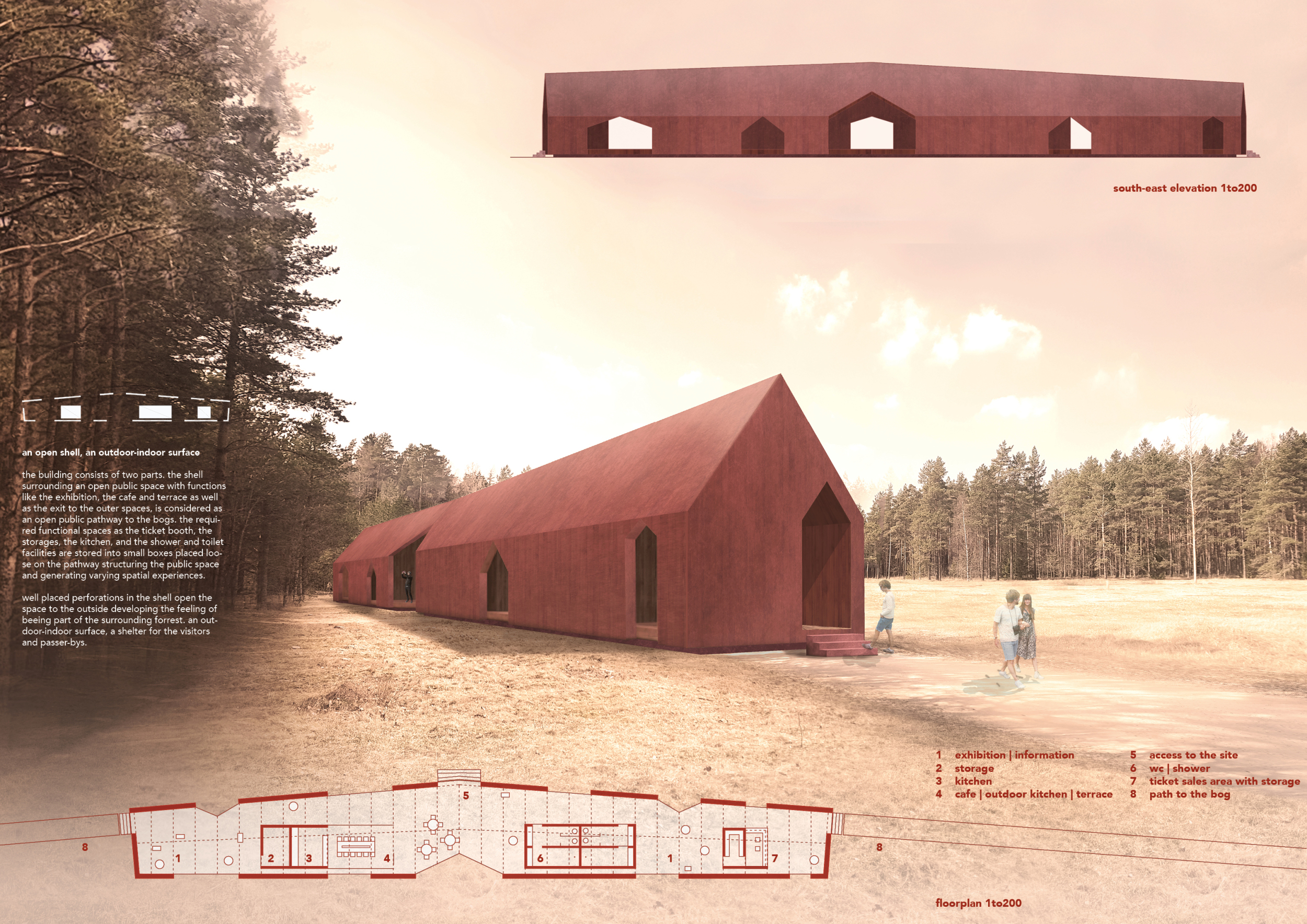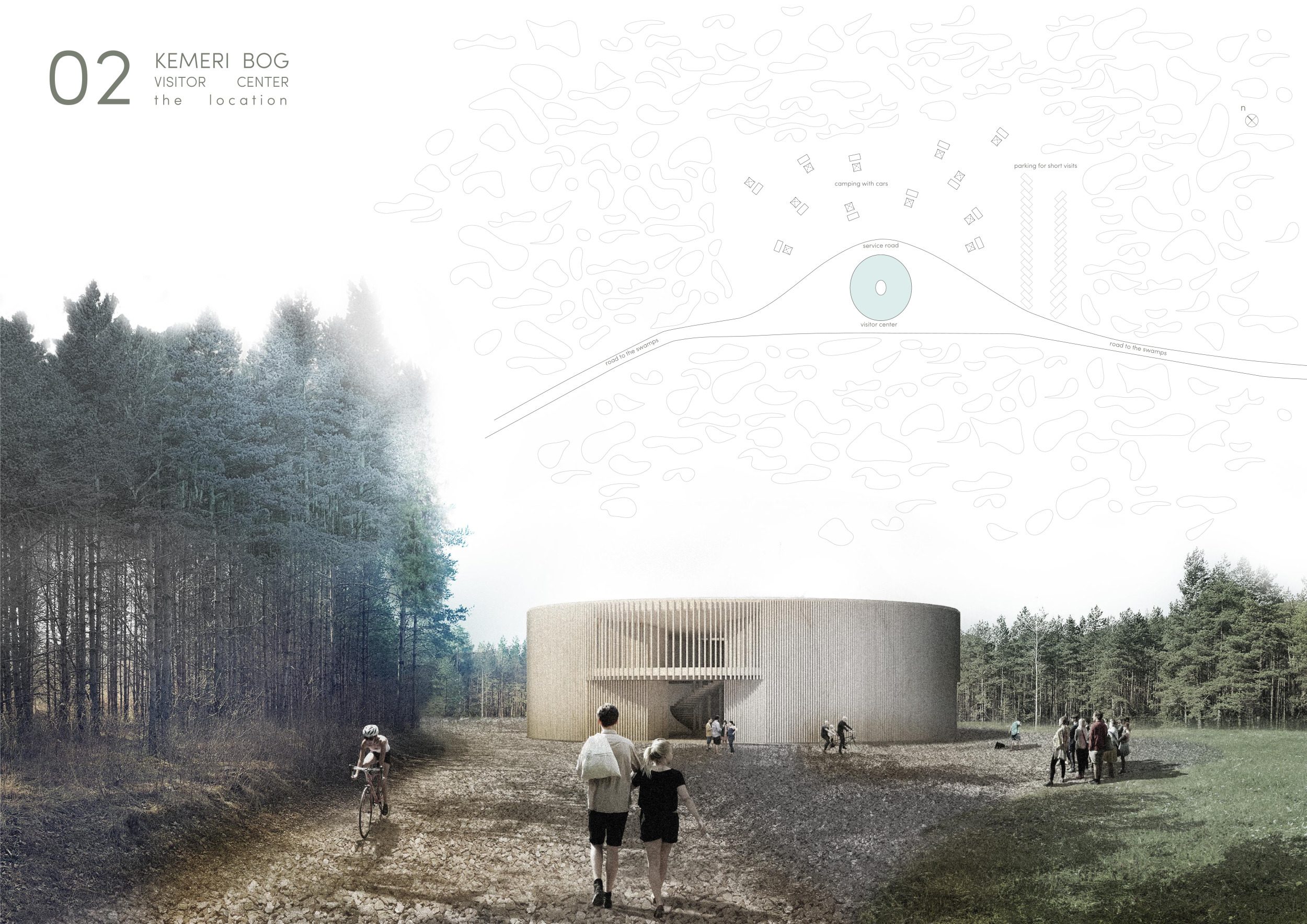 In the current competition participants were tasked with designing a visitor center on a site located at the entry to the Great Kemeri Bog boardwalk. The site is currently used as a car park and gathering point for boardwalk visitors.