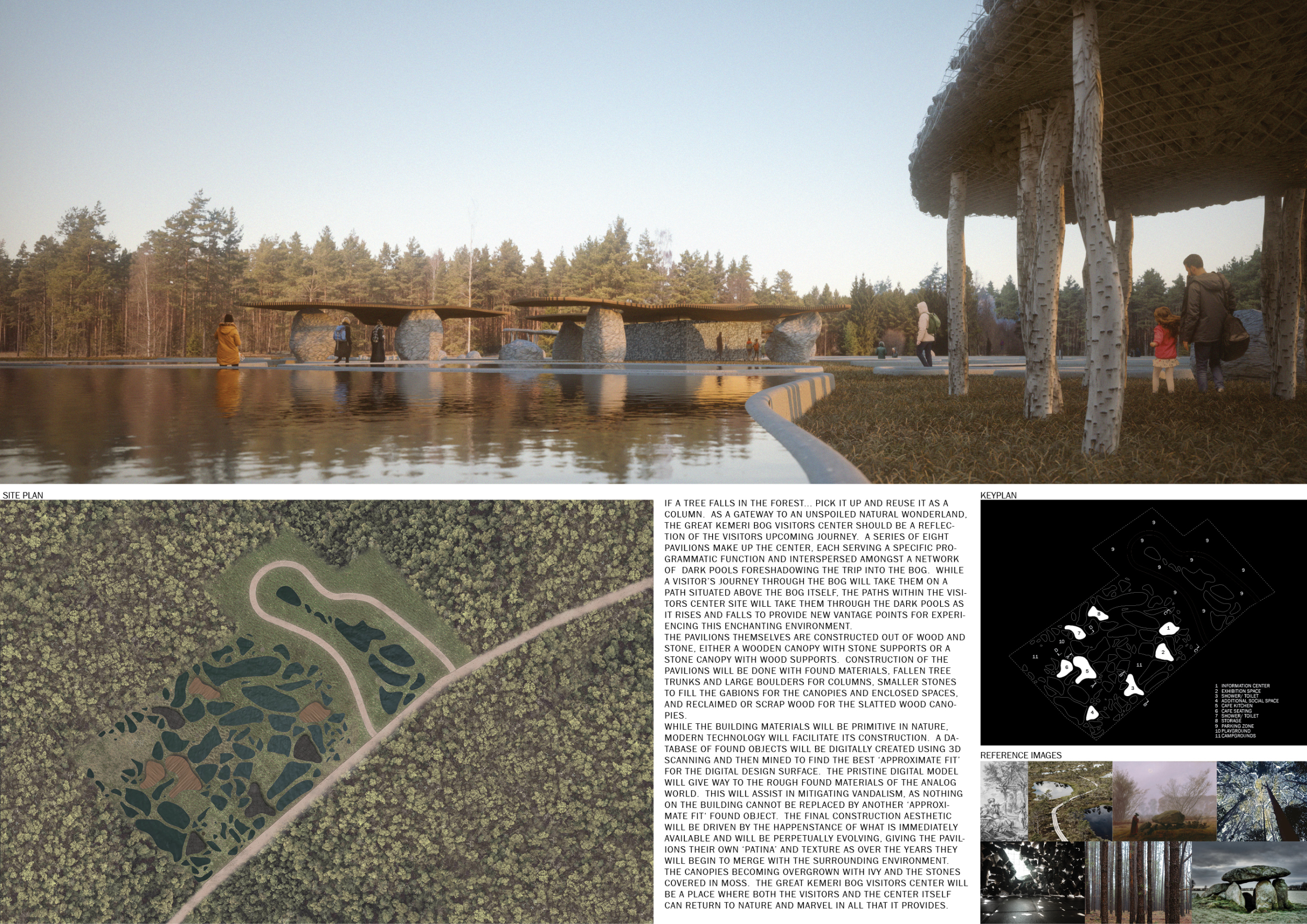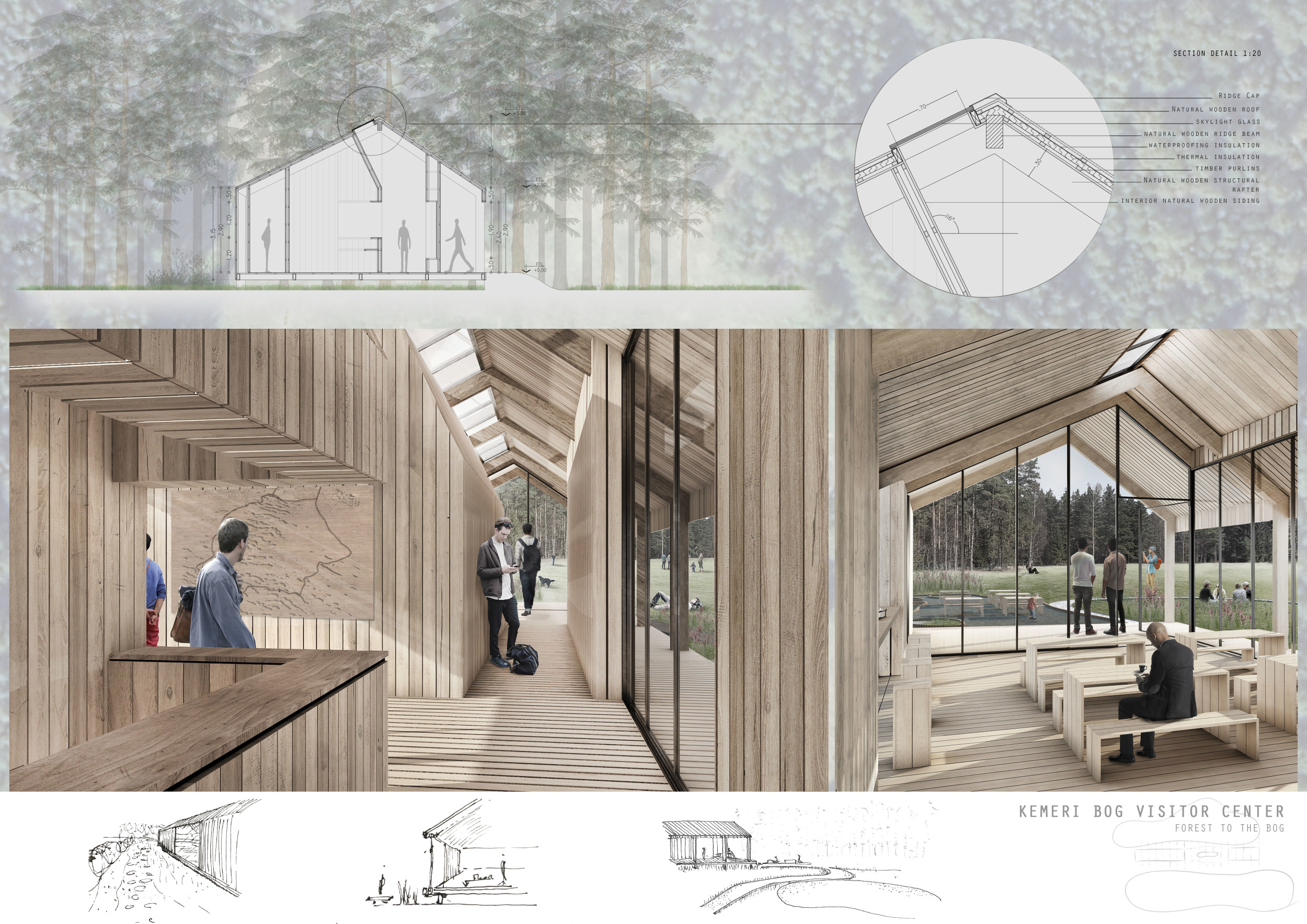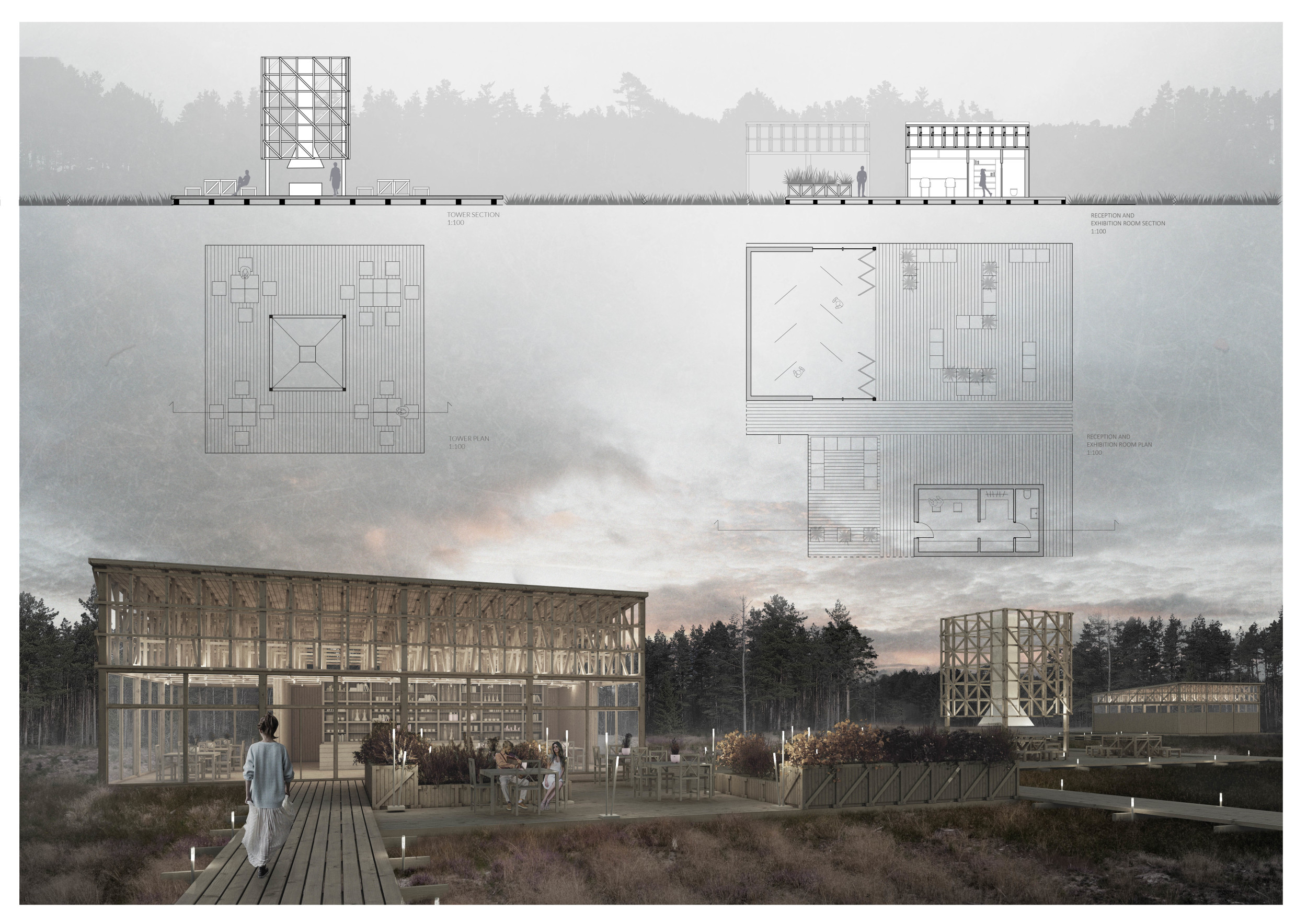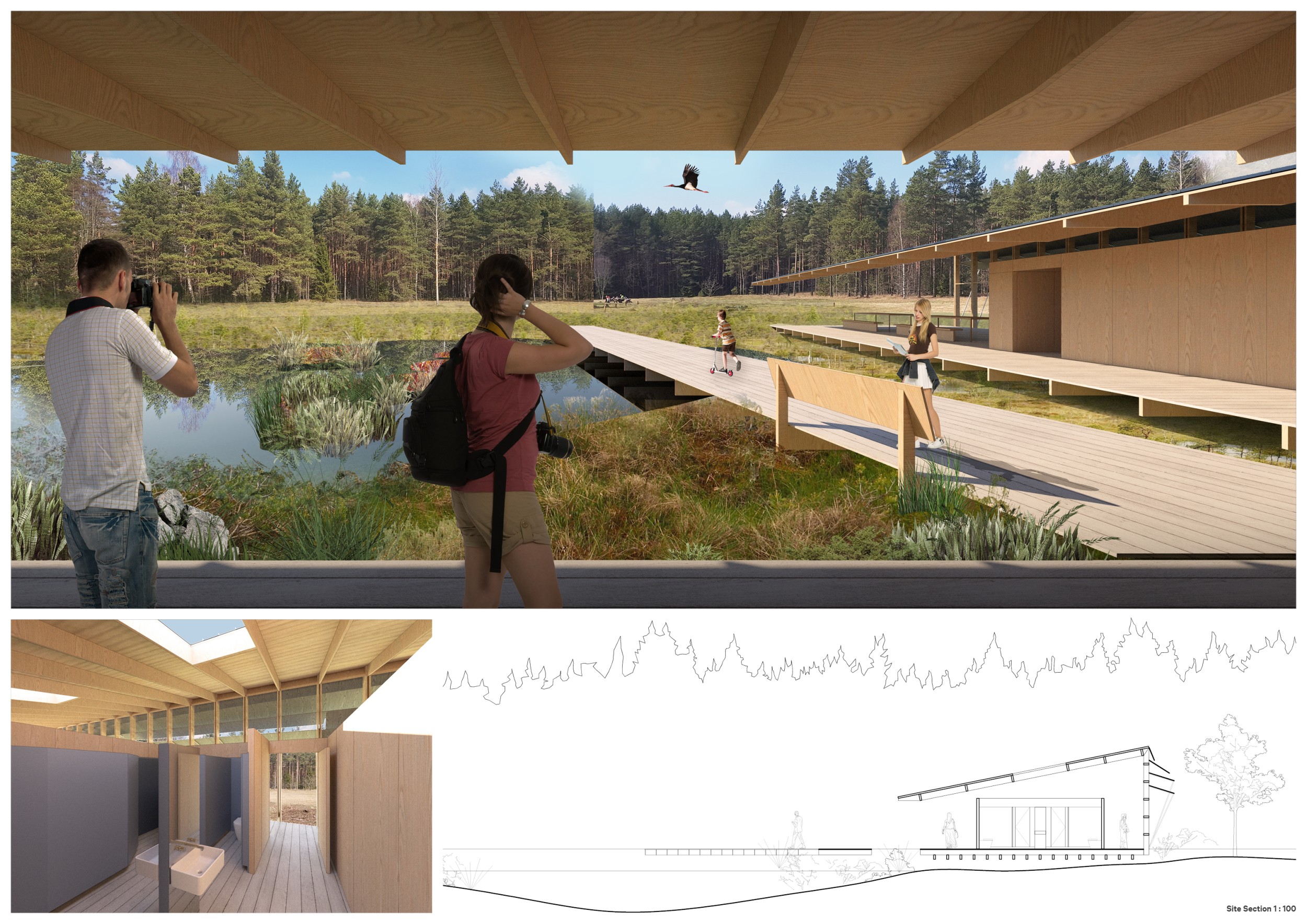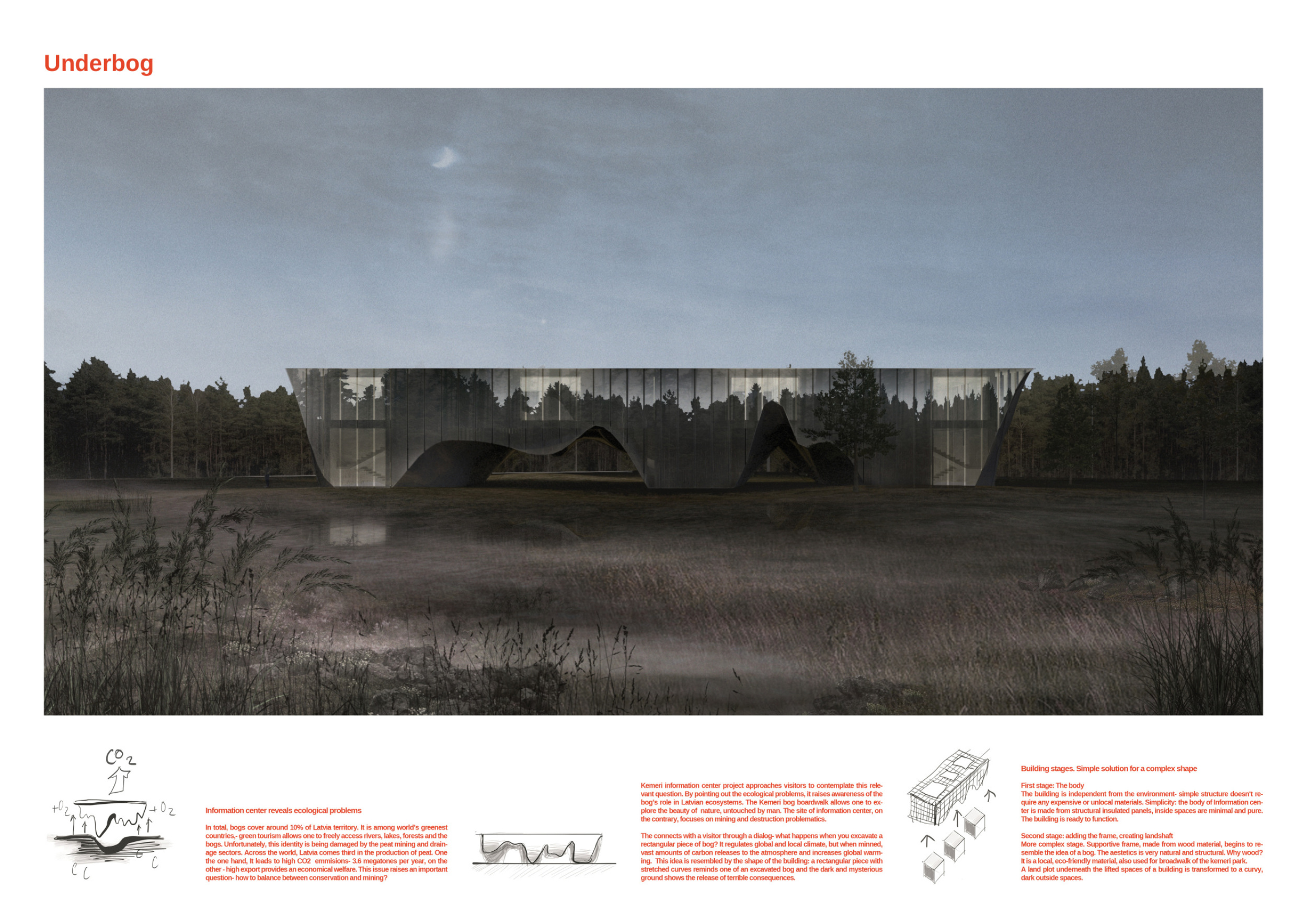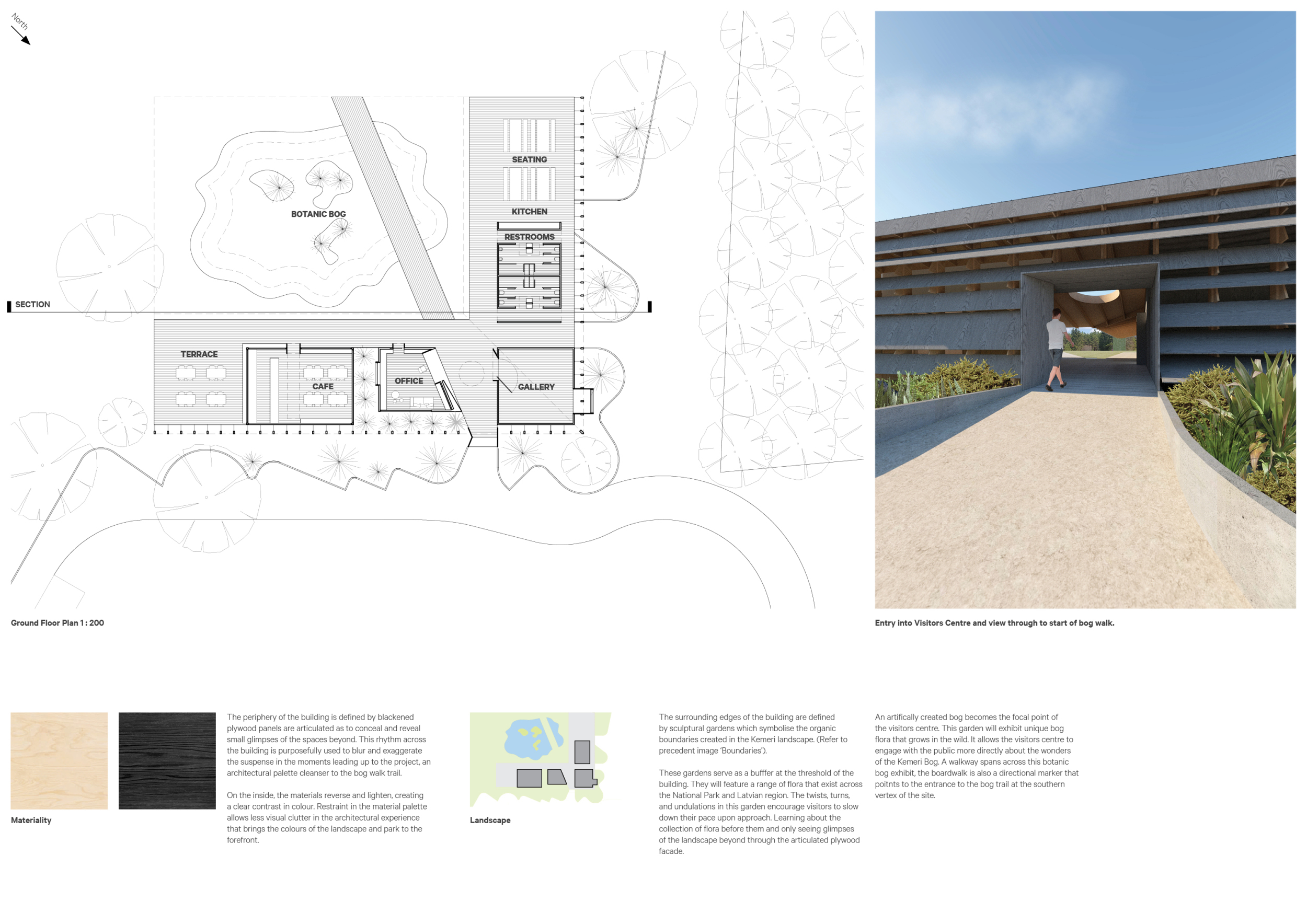 In the current competition participants were tasked with designing a visitor center on a site located at the entry to the Great Kemeri Bog boardwalk. The site is currently used as a car park and gathering point for boardwalk visitors.