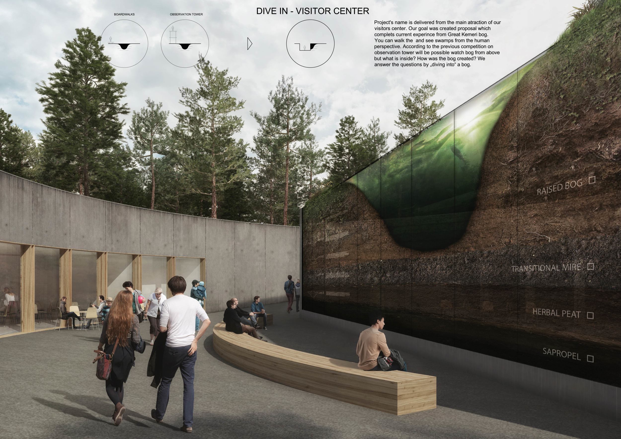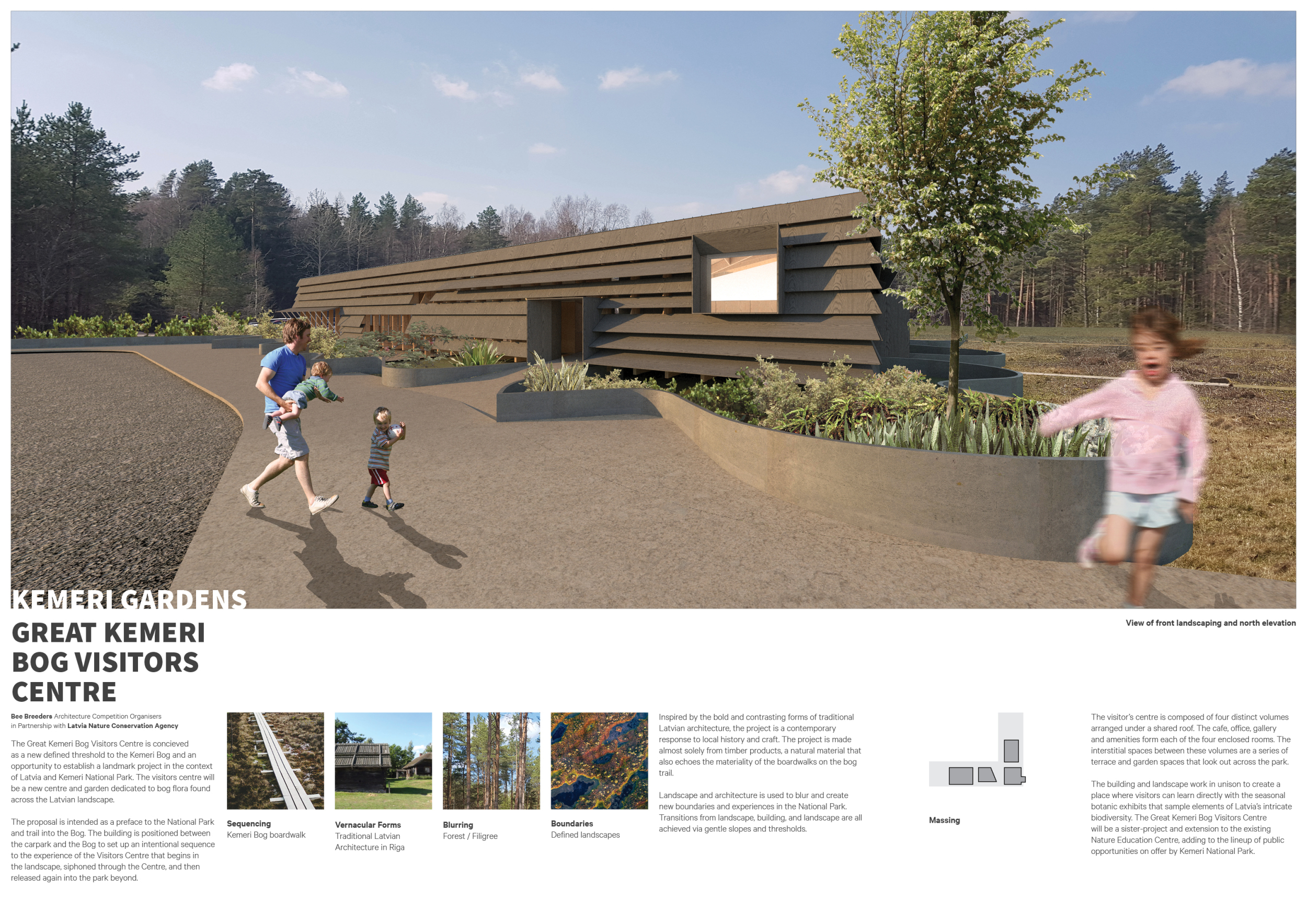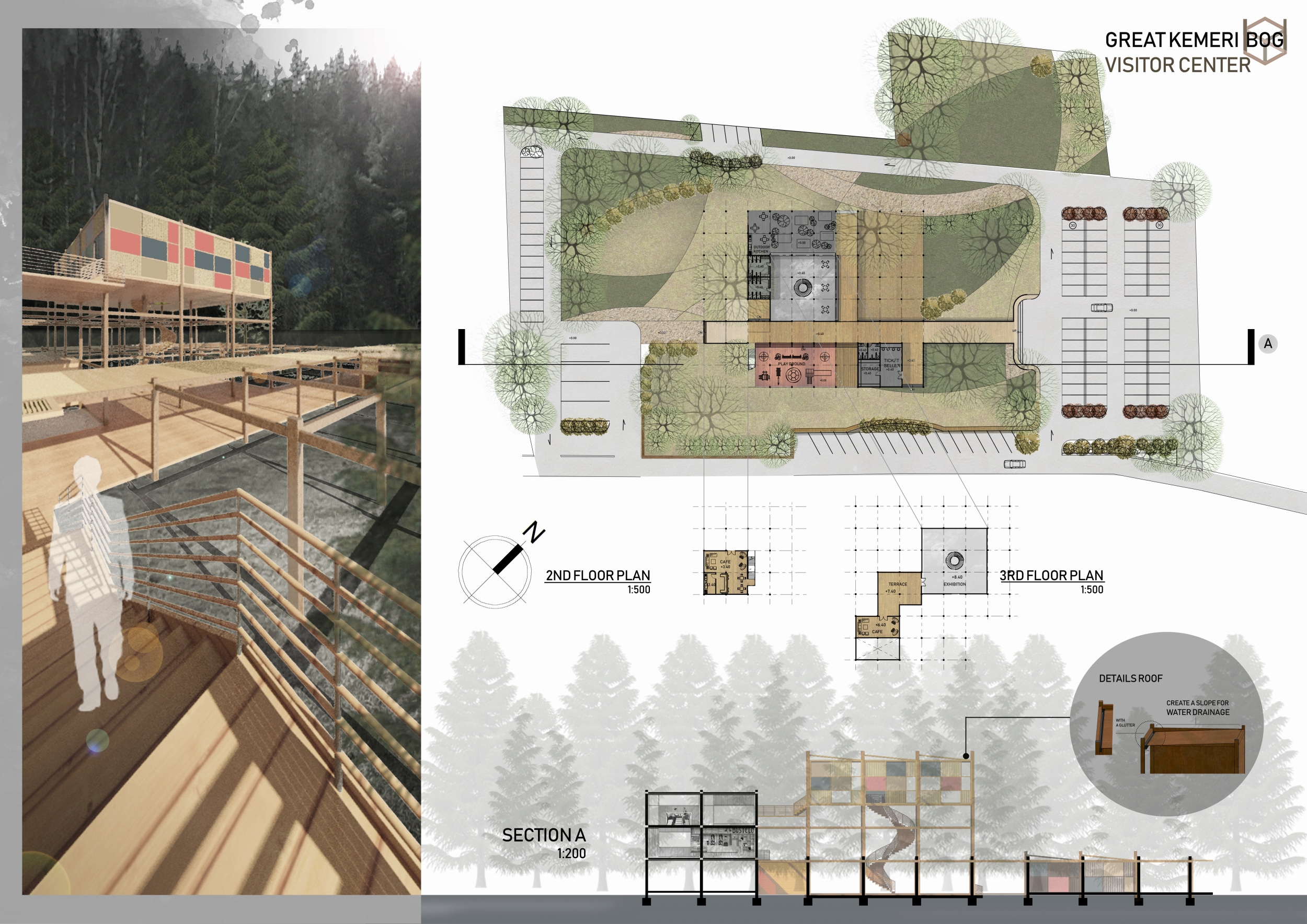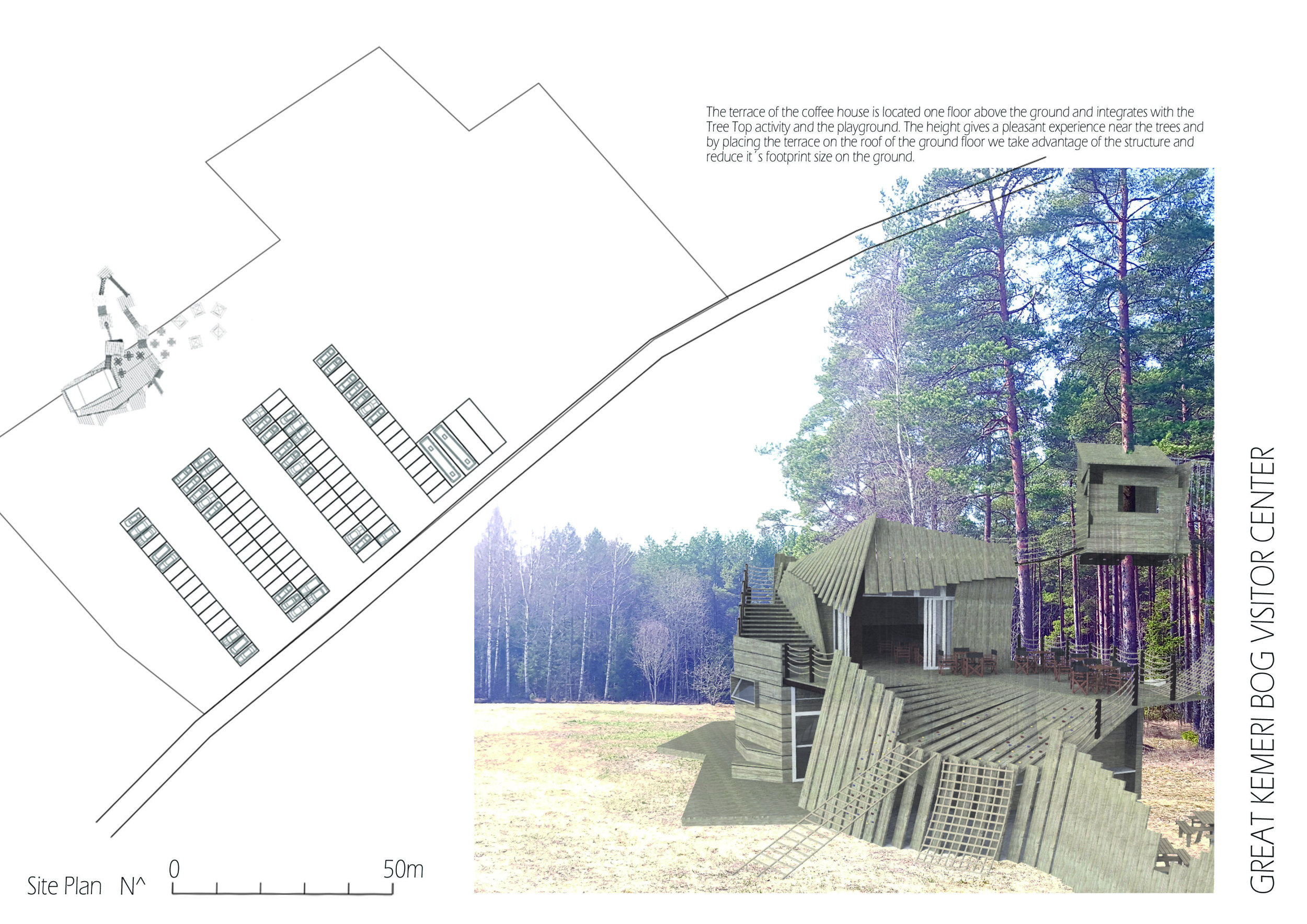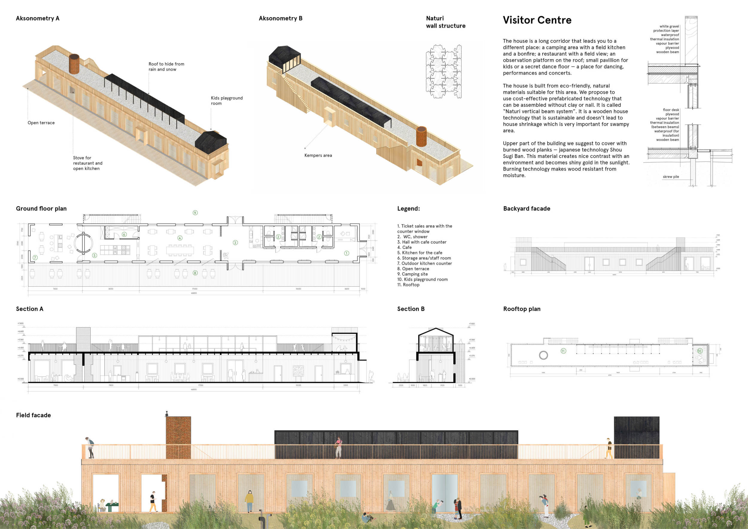 In the current competition participants were tasked with designing a visitor center on a site located at the entry to the Great Kemeri Bog boardwalk. The site is currently used as a car park and gathering point for boardwalk visitors.