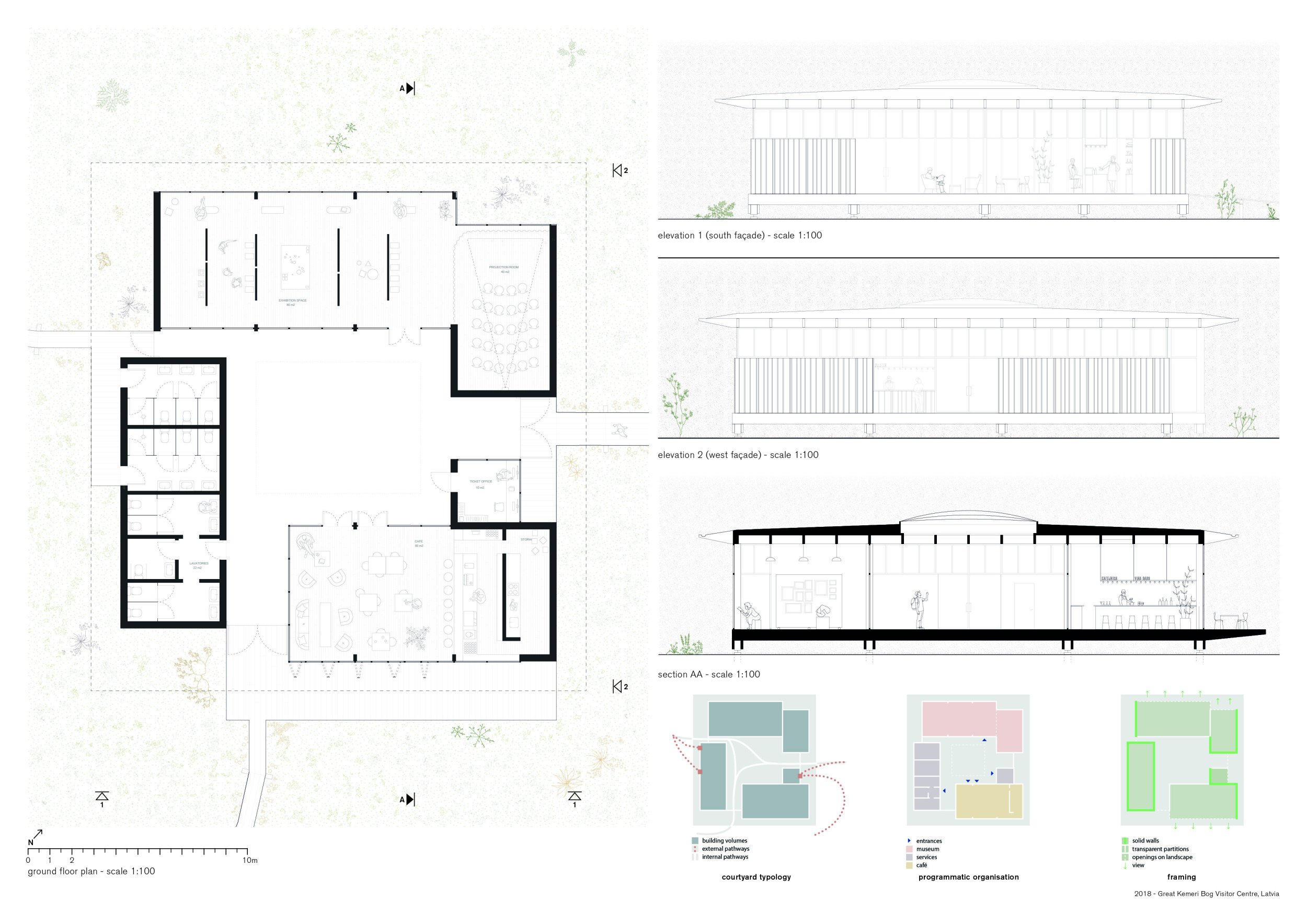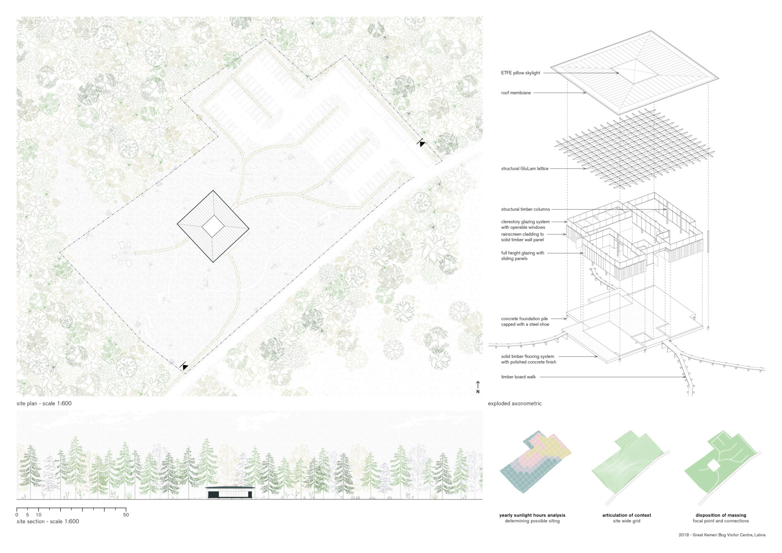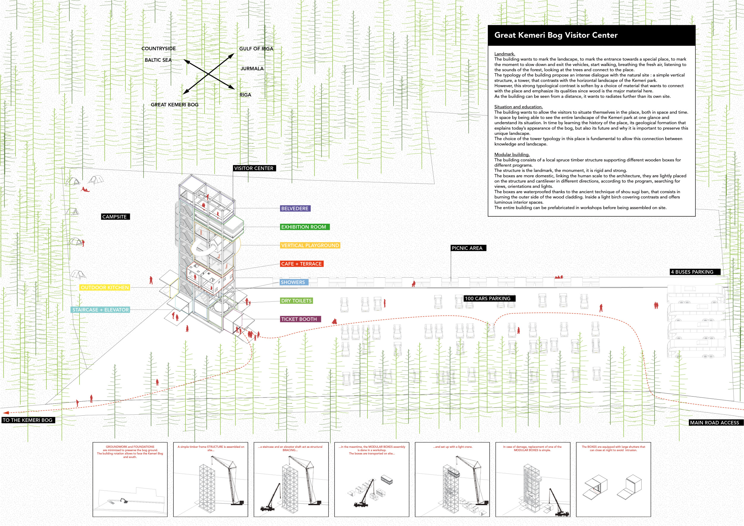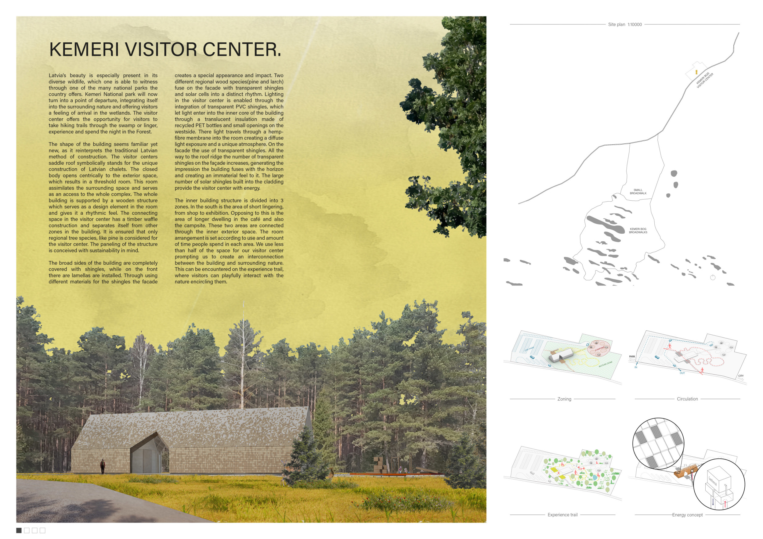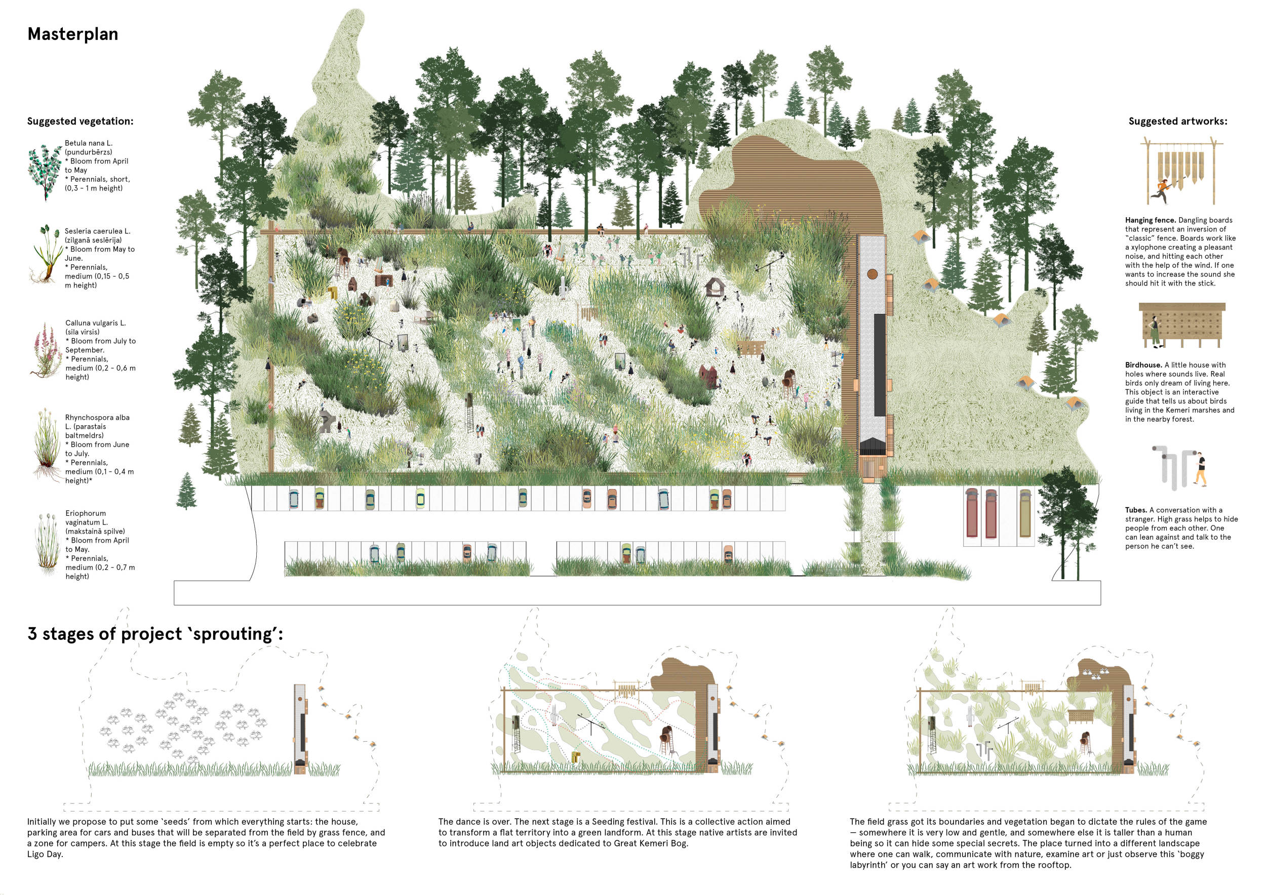 In the current competition participants were tasked with designing a visitor center on a site located at the entry to the Great Kemeri Bog boardwalk. The site is currently used as a car park and gathering point for boardwalk visitors.