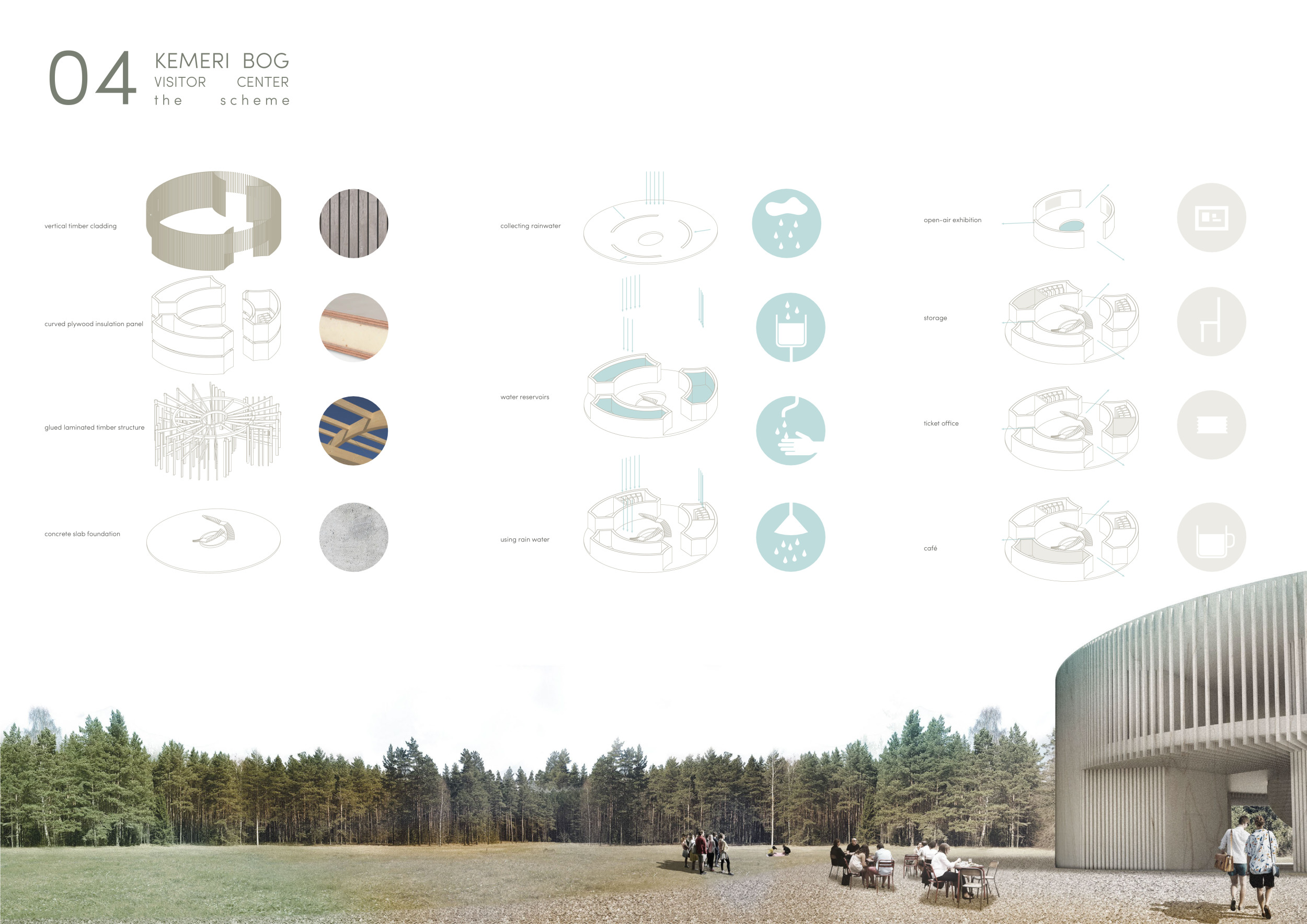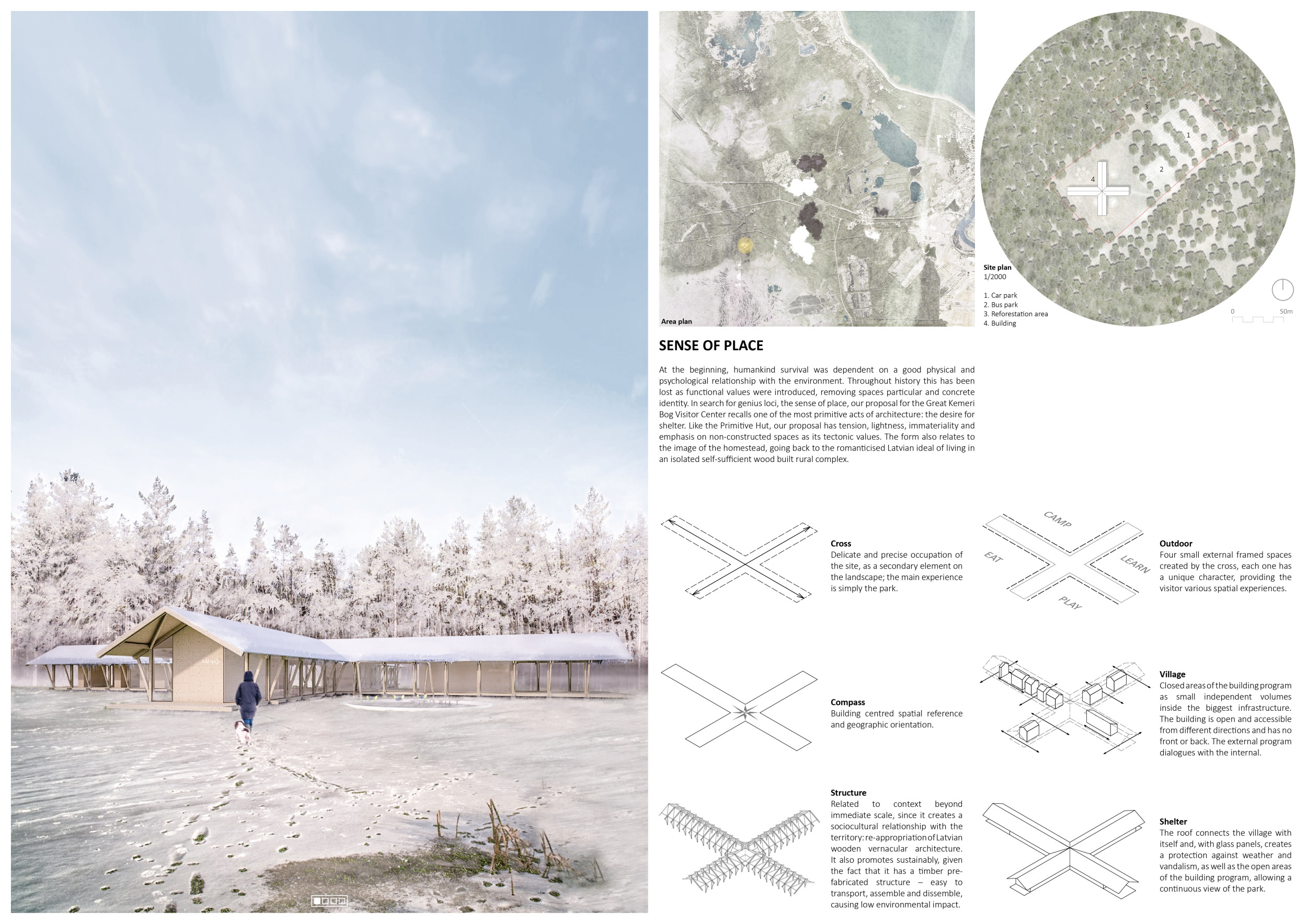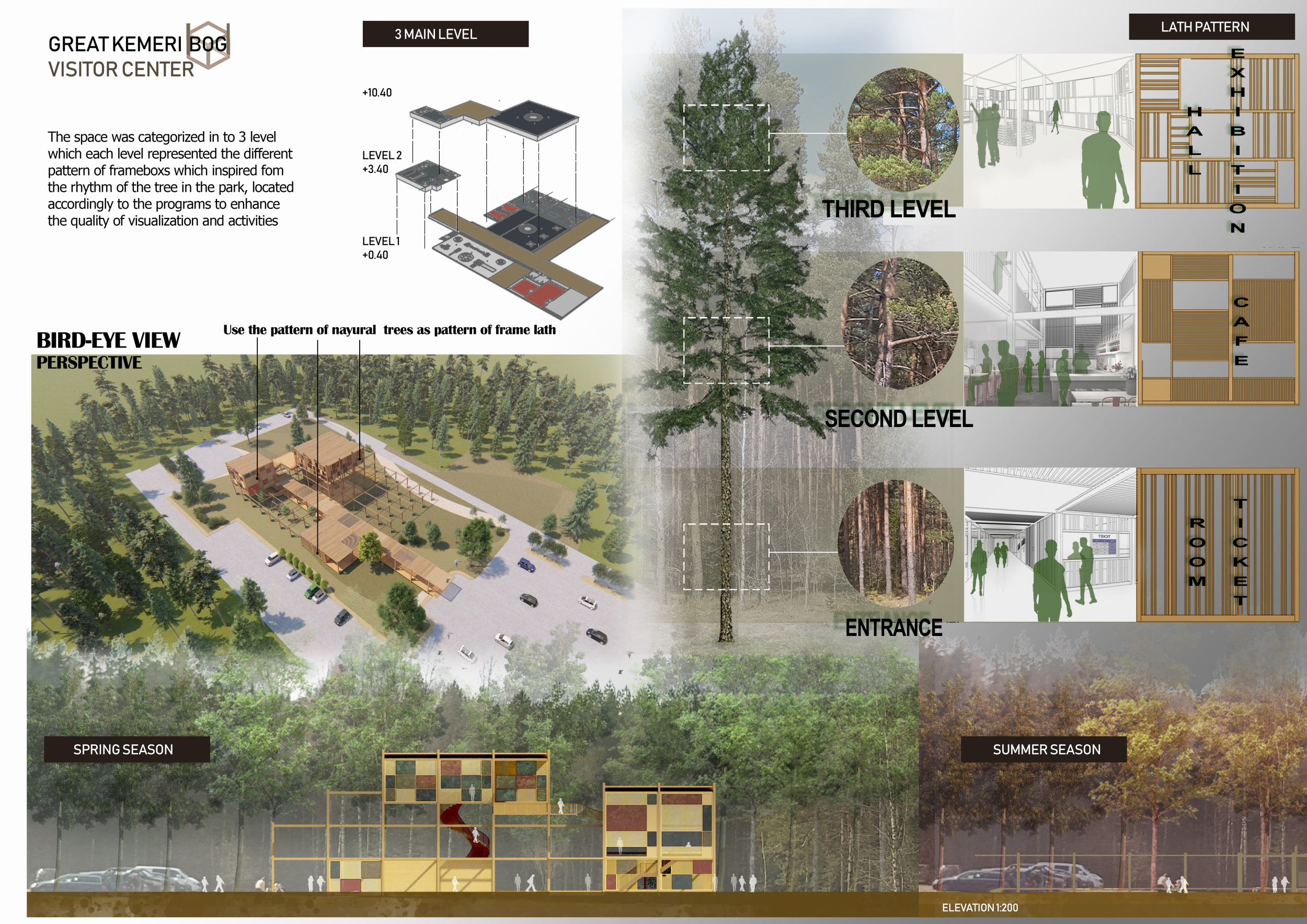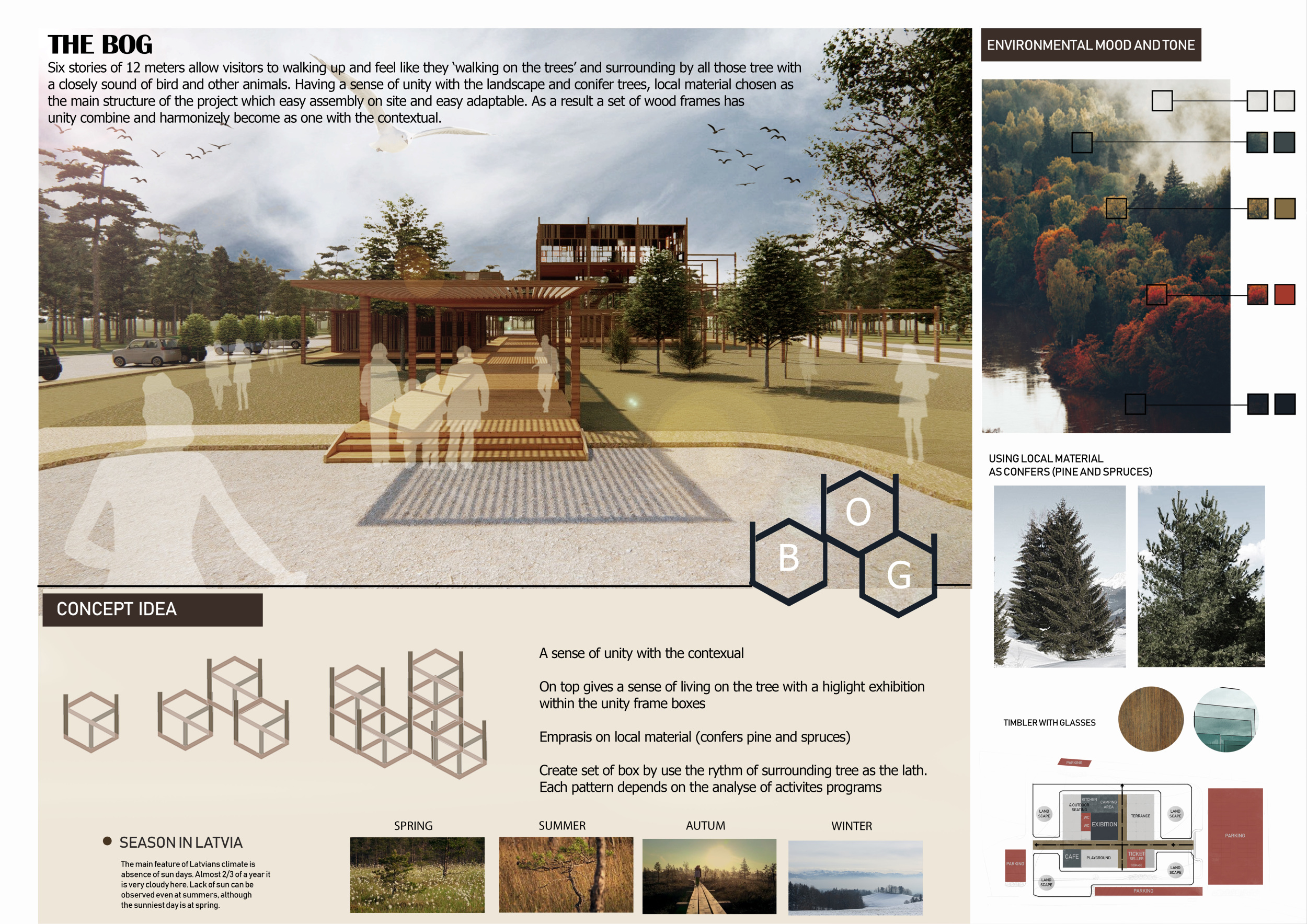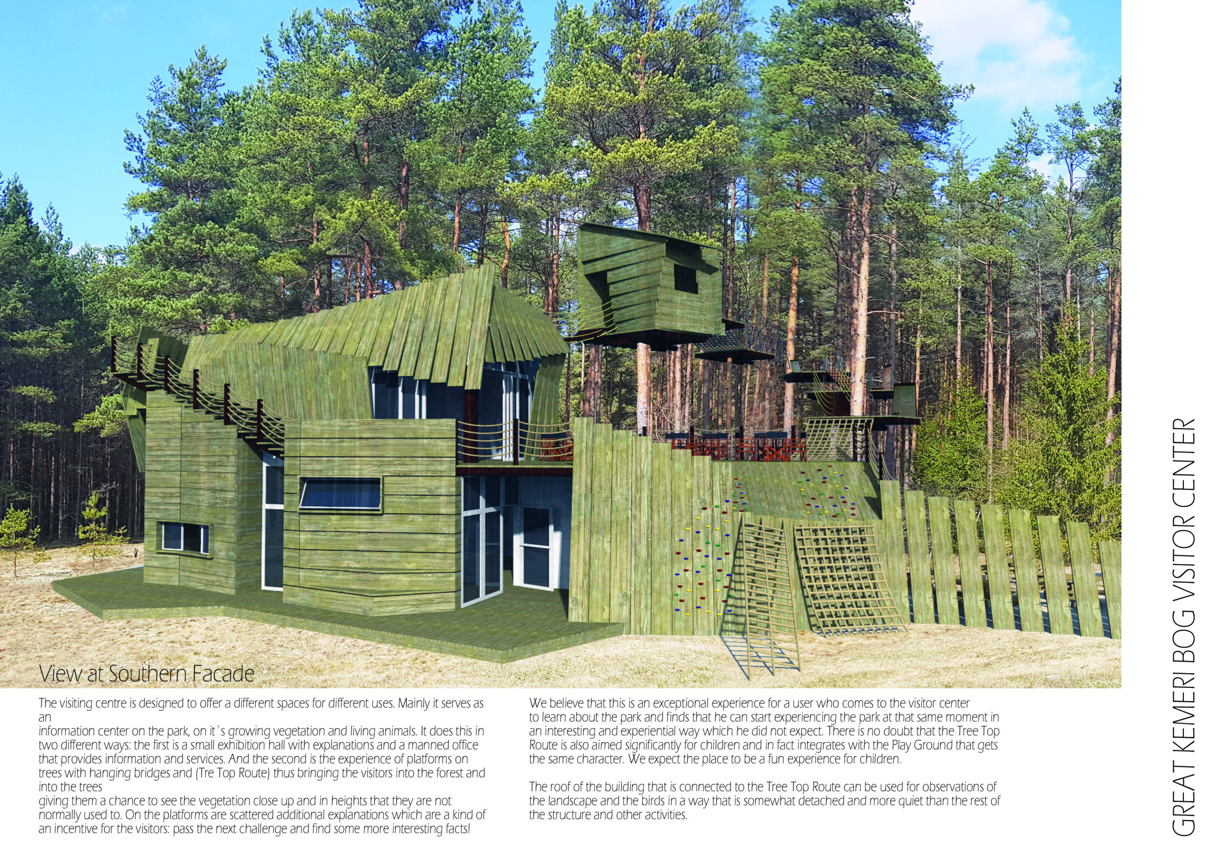 In the current competition participants were tasked with designing a visitor center on a site located at the entry to the Great Kemeri Bog boardwalk. The site is currently used as a car park and gathering point for boardwalk visitors.