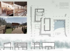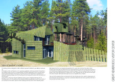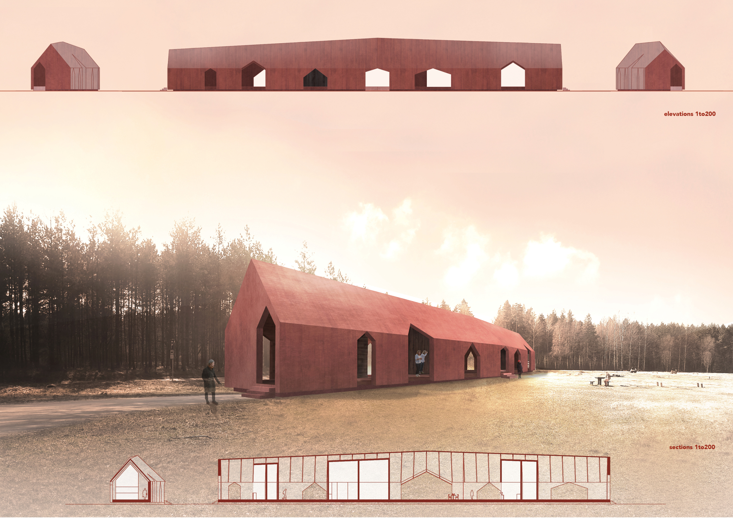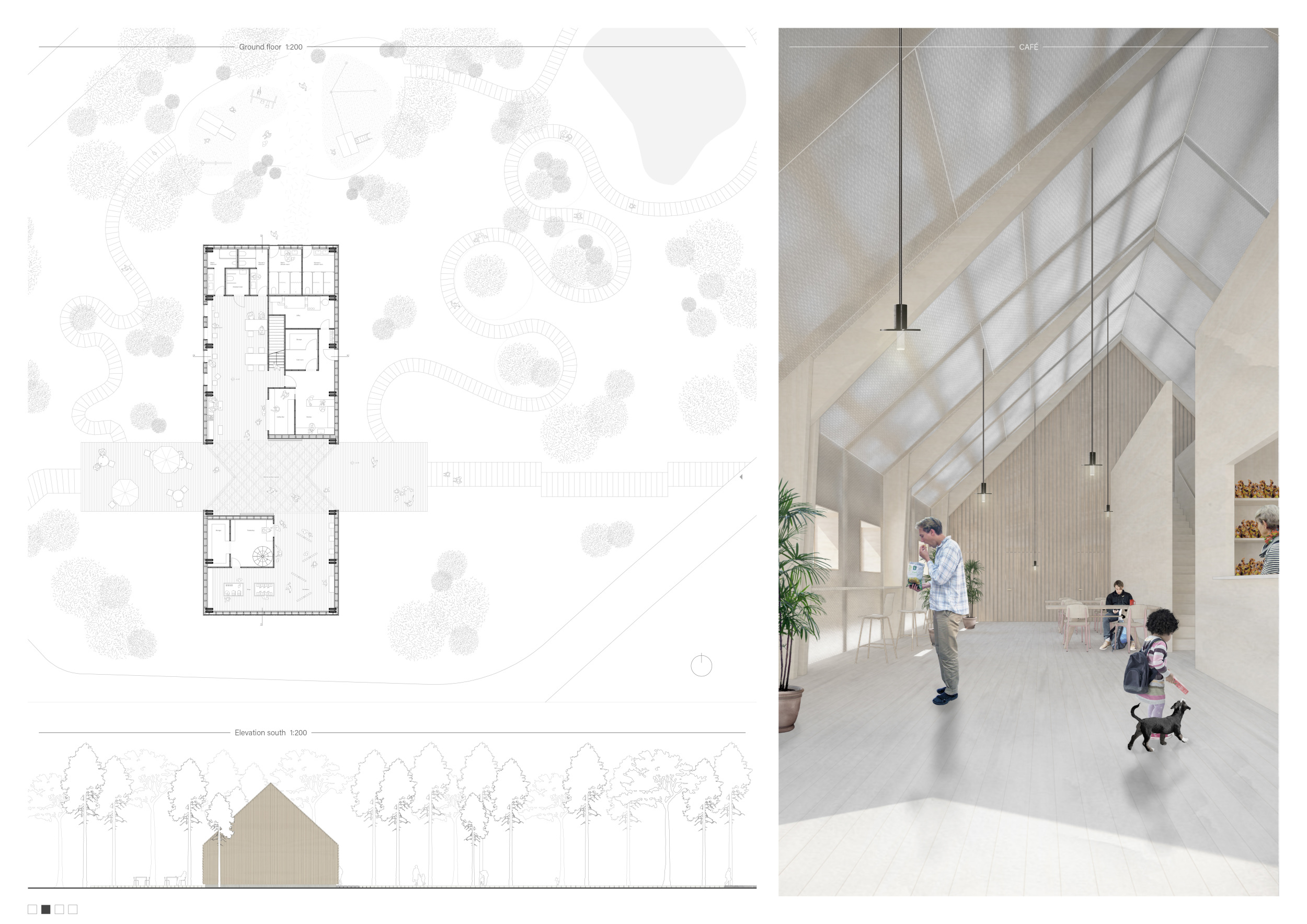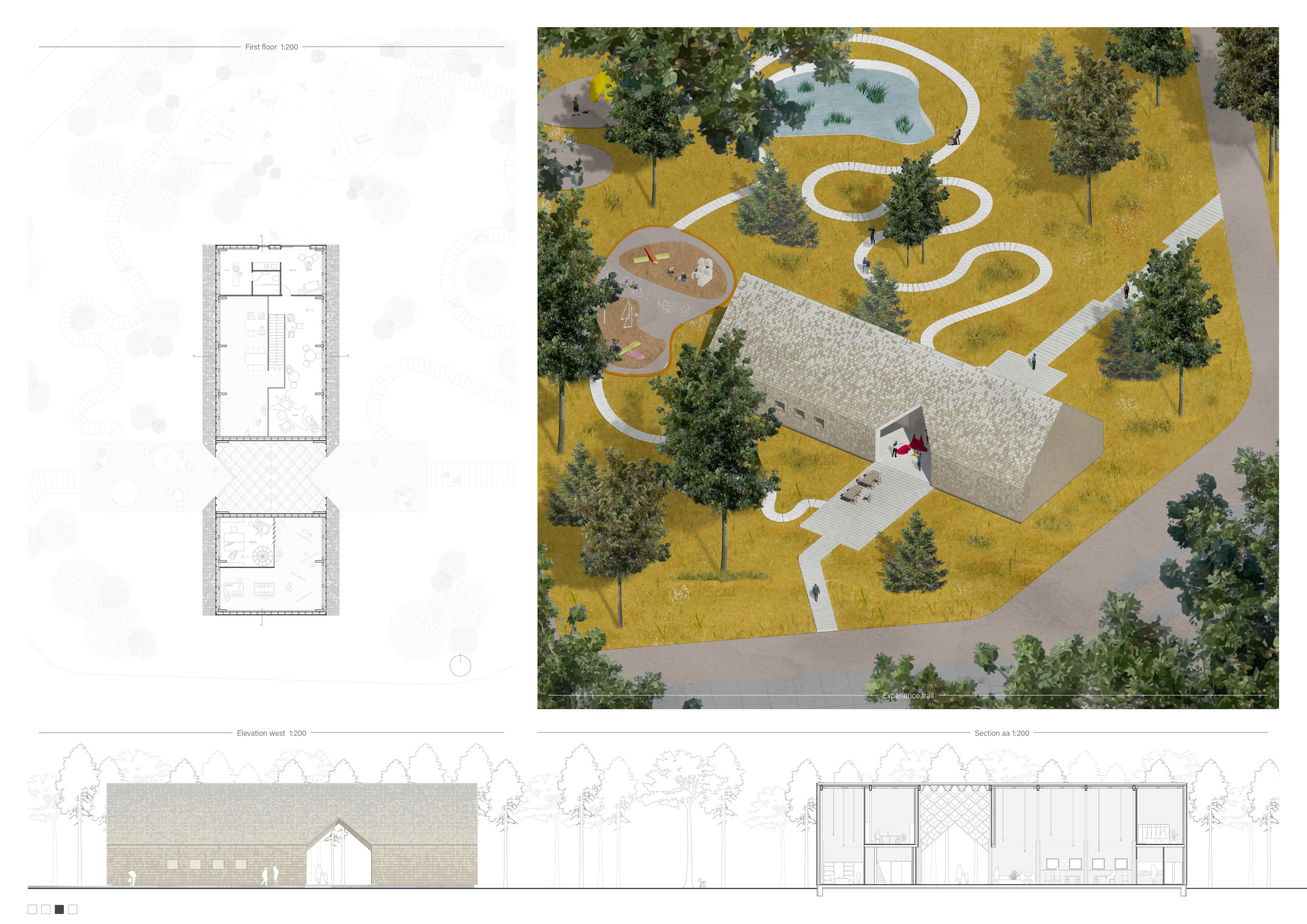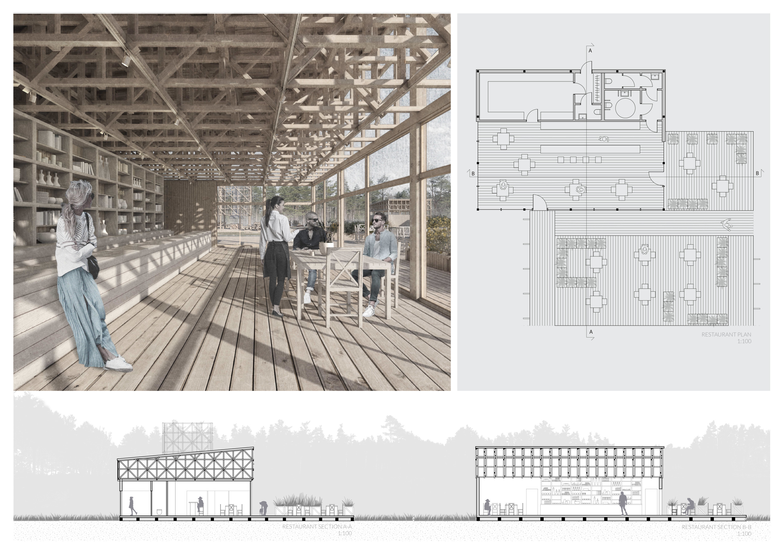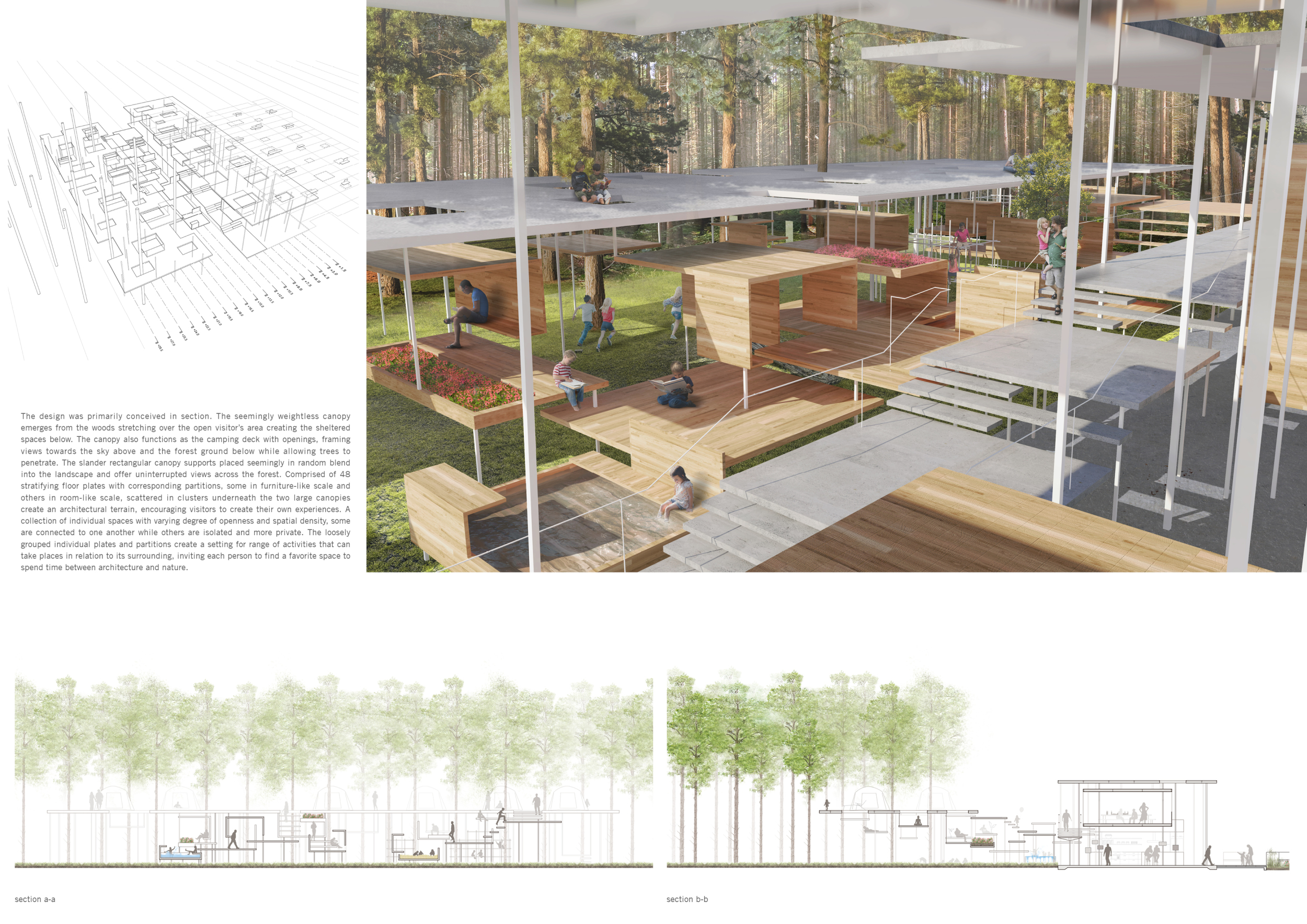 The design is commended for its use of a repeatable and constructable module that manages to create an organic, landscape-like form. The project proposes a burned-wood cladding that fortifies it against Latvia’s variable weather, and interiors of natural wood that connect it well with its forest surroundings. The section drawings and details are especially well-considered for modularity and construction using sustainable materials. Read more The building’s plan form strongly establishes a central gathering space, however the jury questions the vertical pitches and dips and wonders if the geometry might rather relate more strongly to its internal program. The project certainly has the potential to become a park landmark.