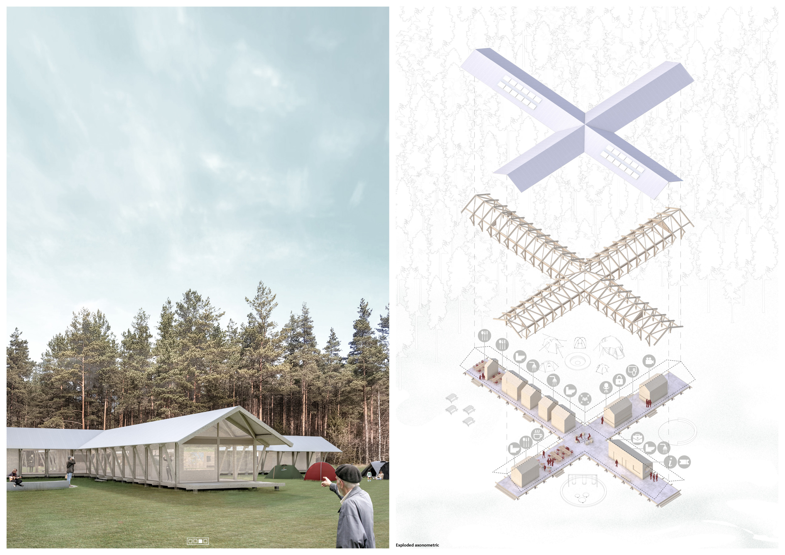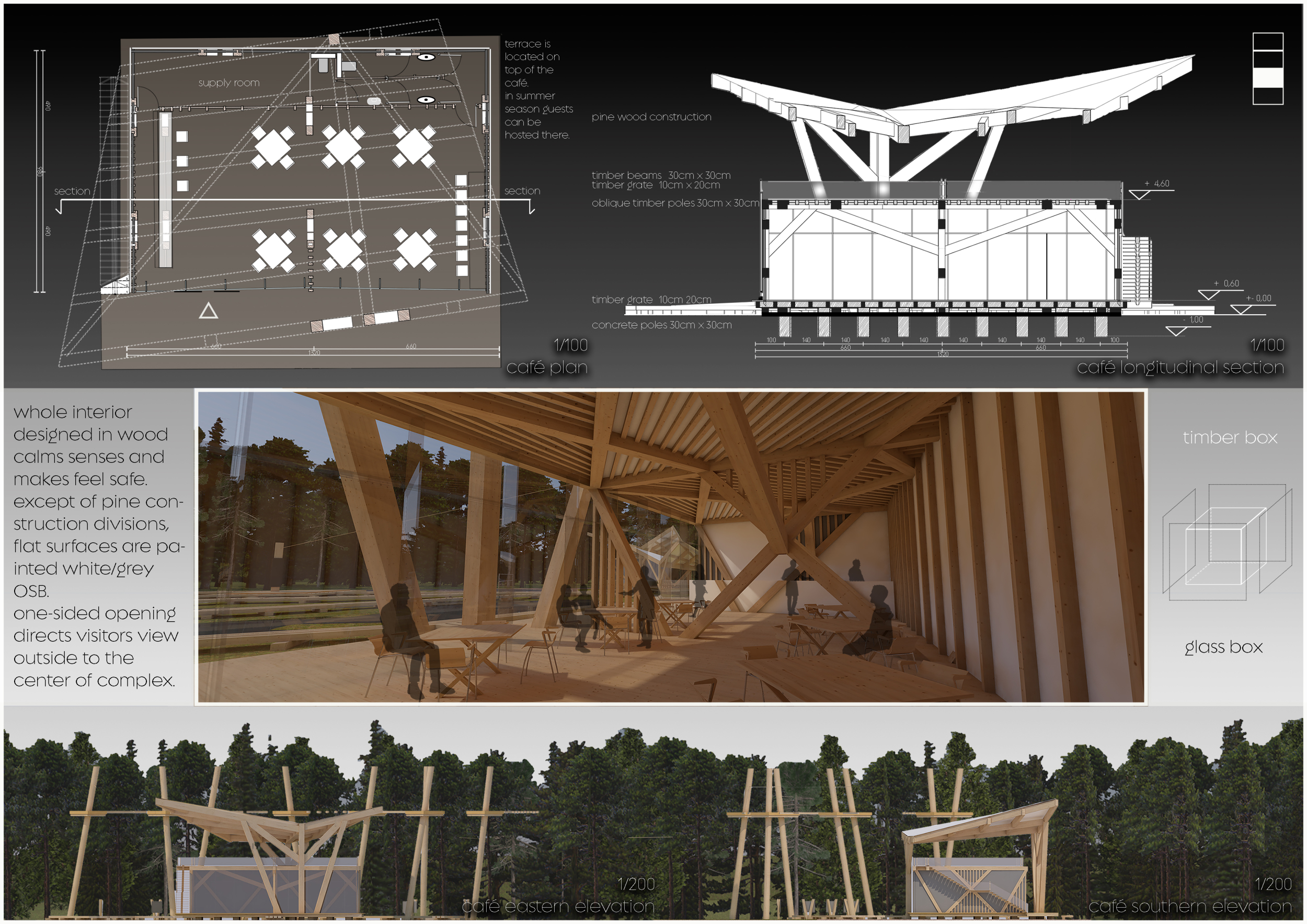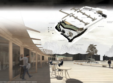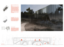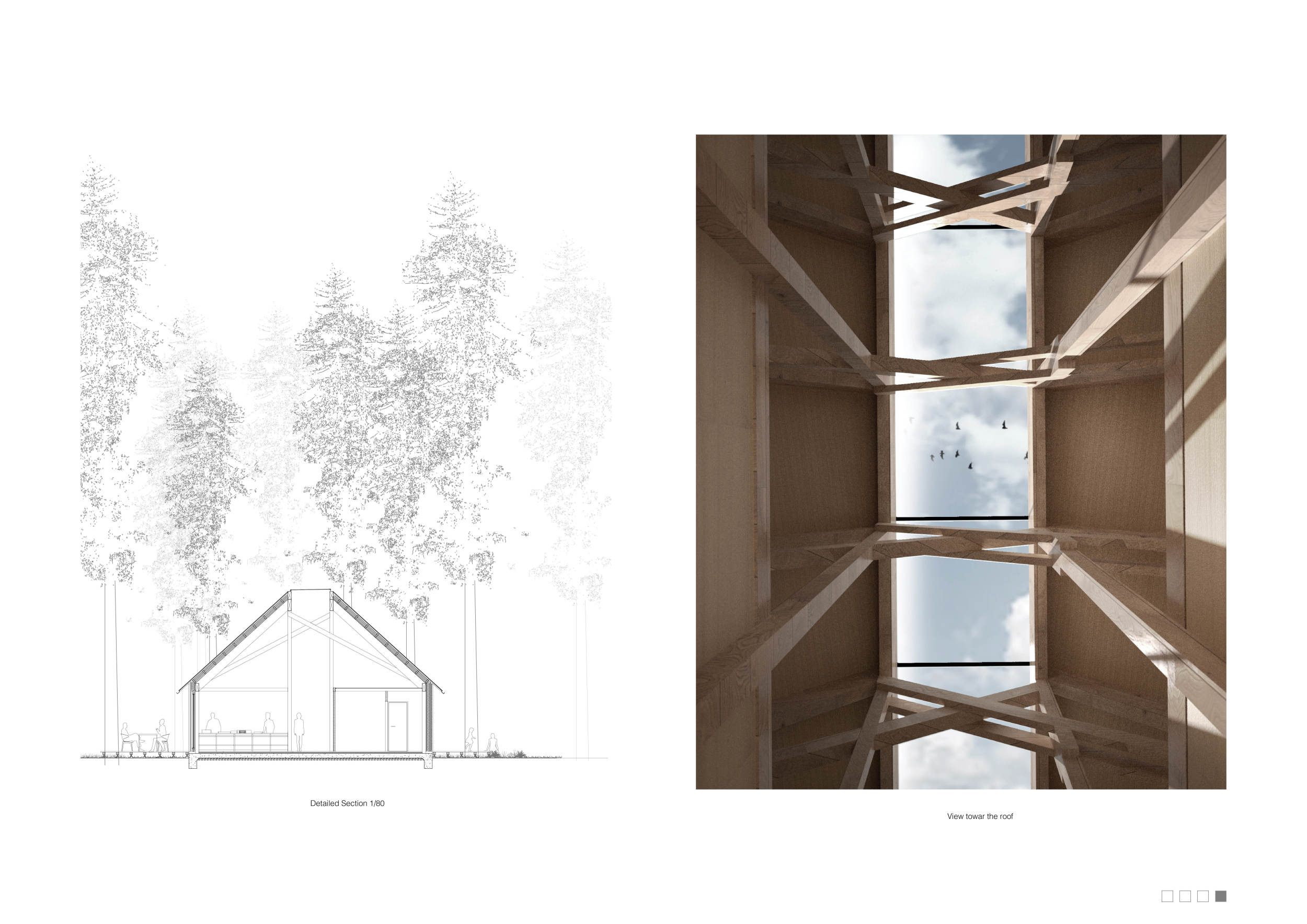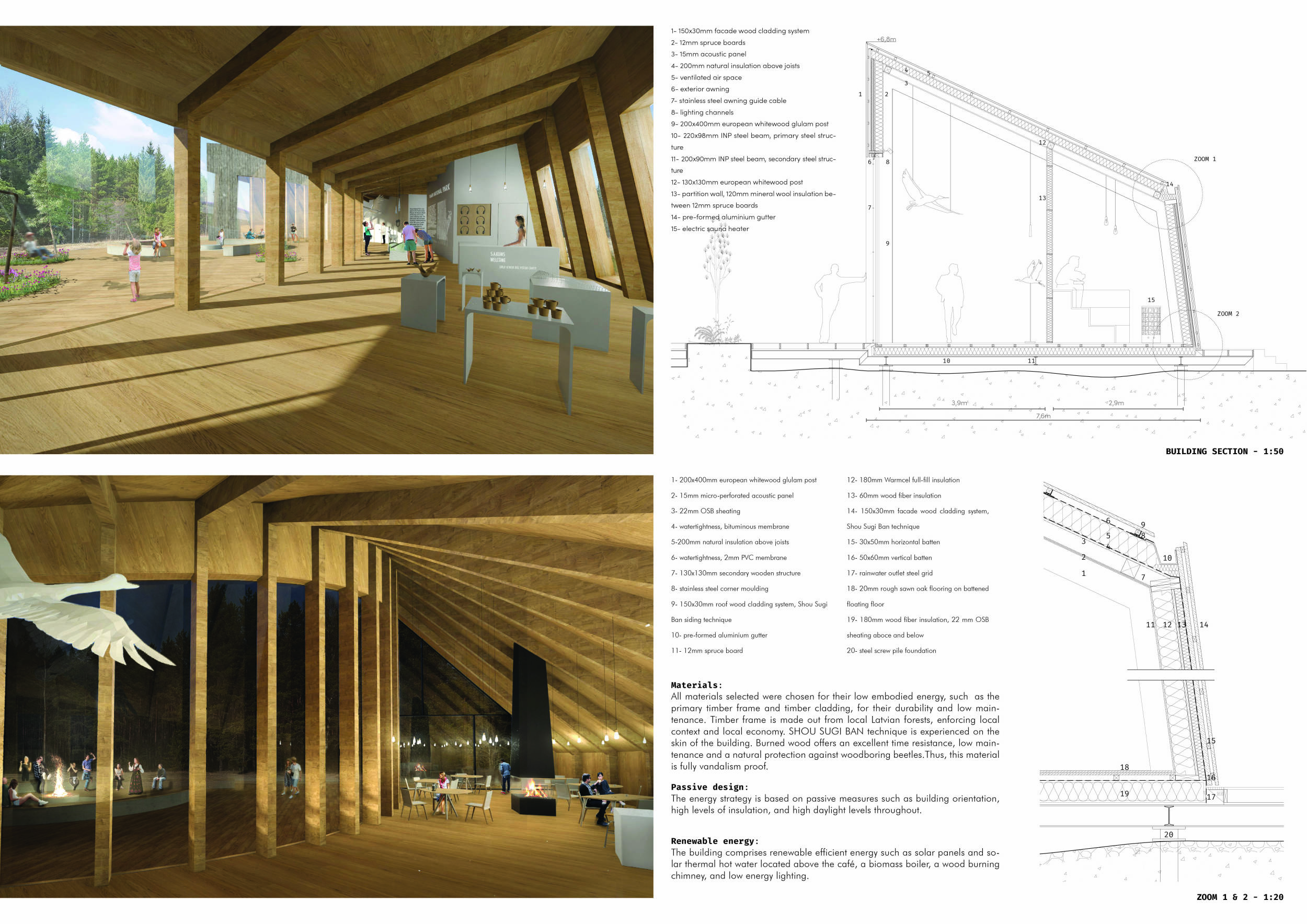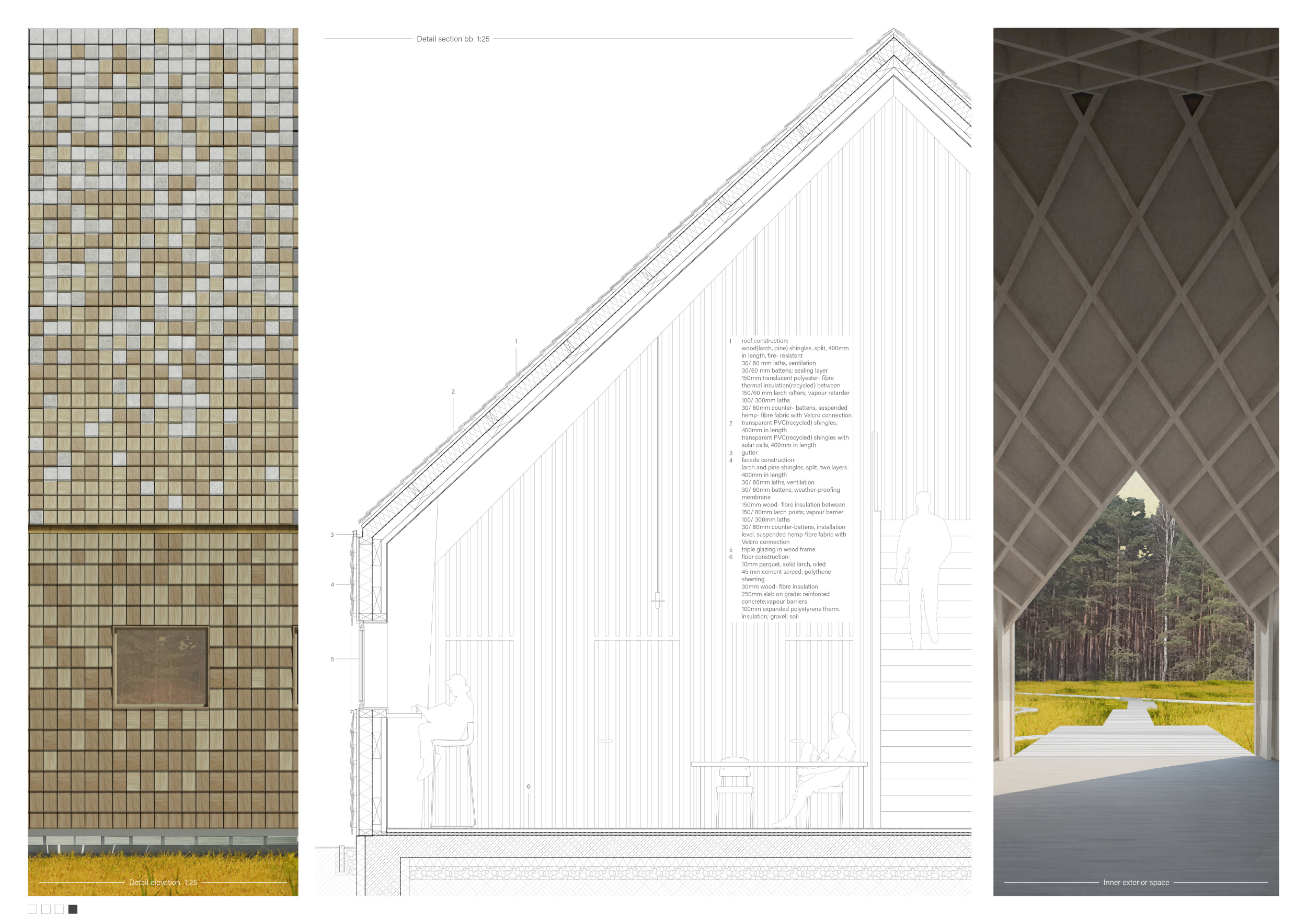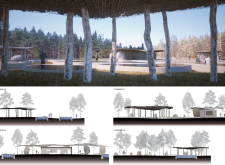 The design is commended for its use of a repeatable and constructable module that manages to create an organic, landscape-like form. The project proposes a burned-wood cladding that fortifies it against Latvia’s variable weather, and interiors of natural wood that connect it well with its forest surroundings. The section drawings and details are especially well-considered for modularity and construction using sustainable materials. Read more The building’s plan form strongly establishes a central gathering space, however the jury questions the vertical pitches and dips and wonders if the geometry might rather relate more strongly to its internal program. The project certainly has the potential to become a park landmark.