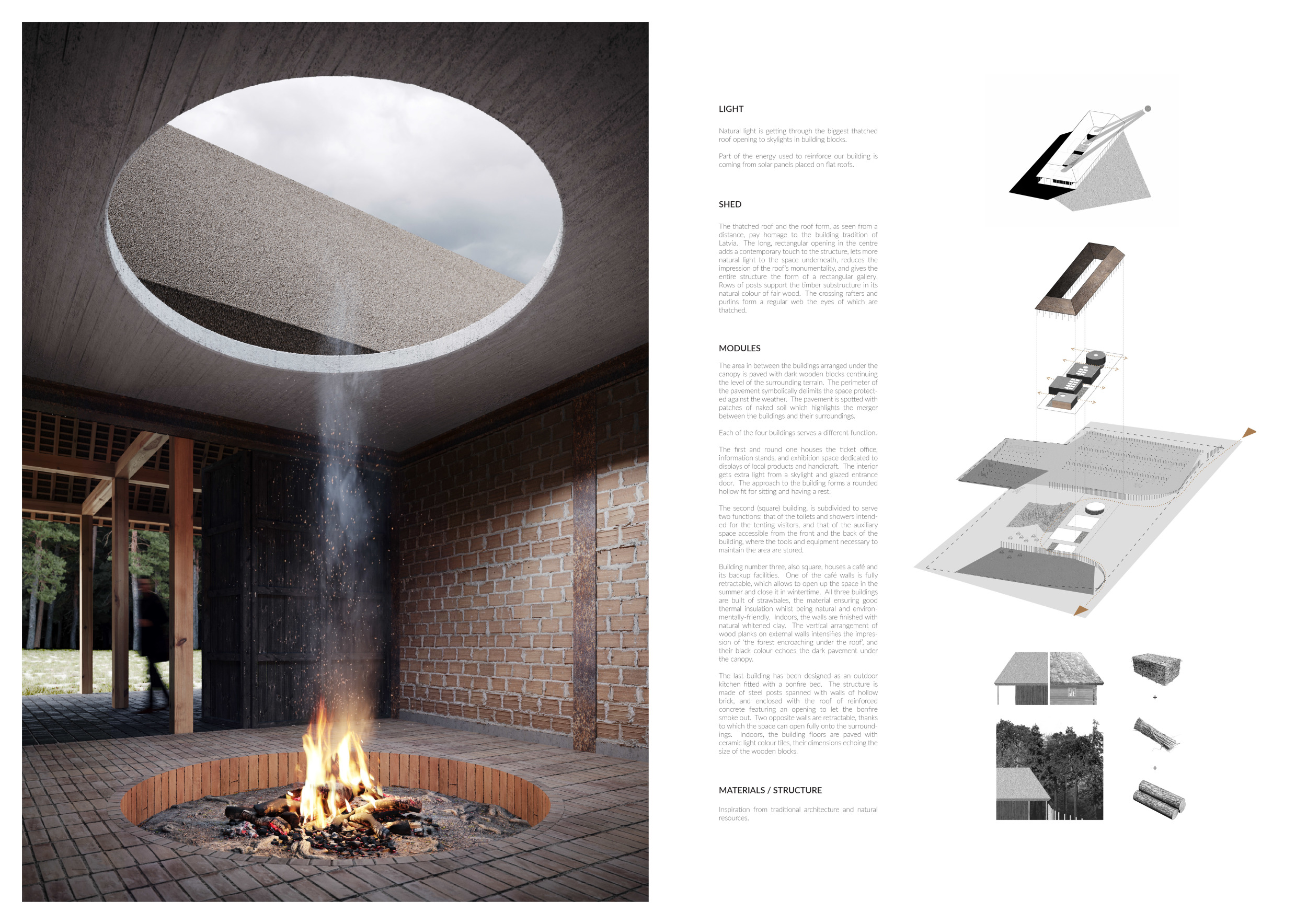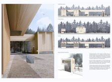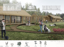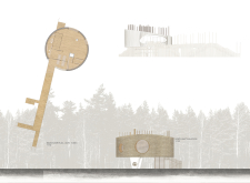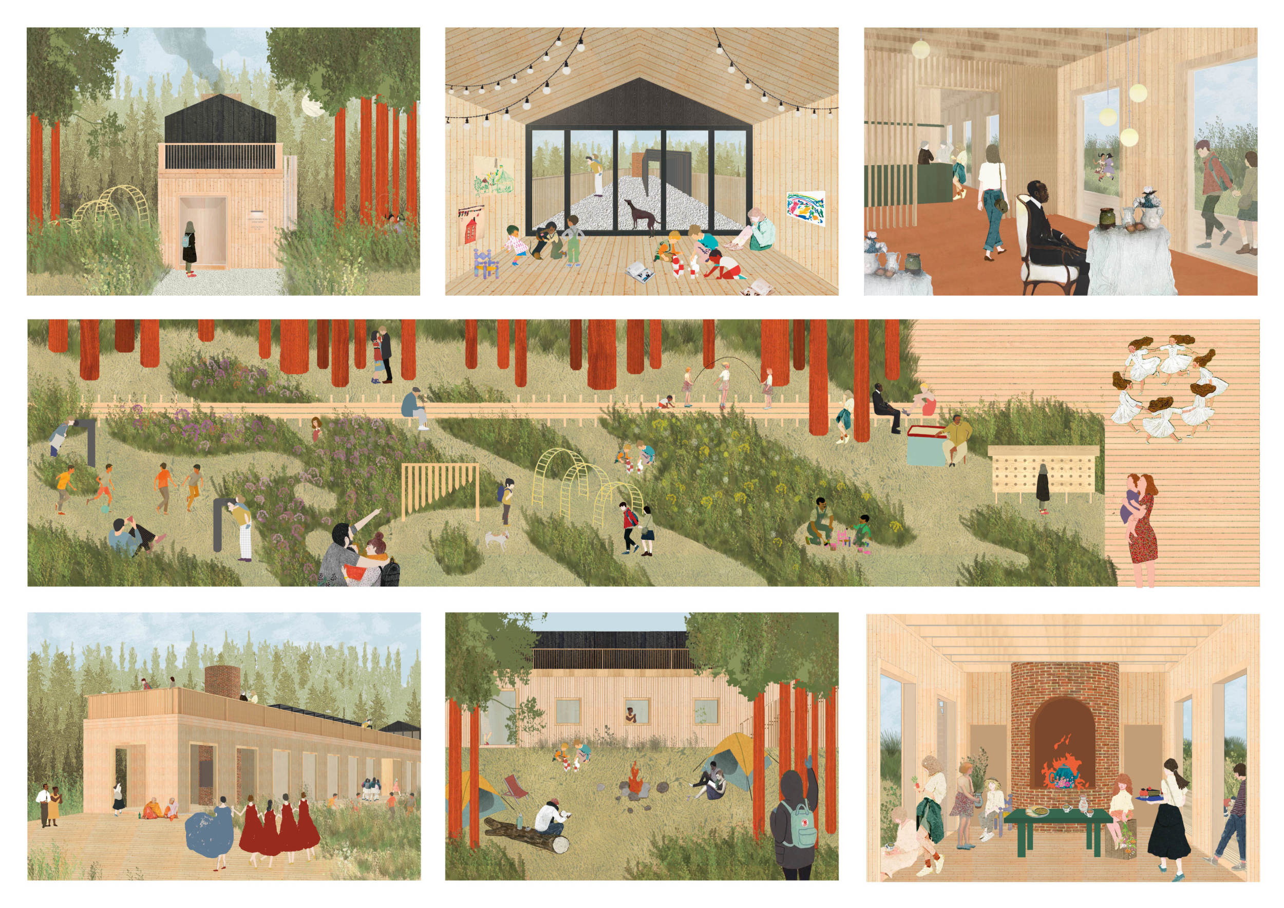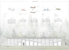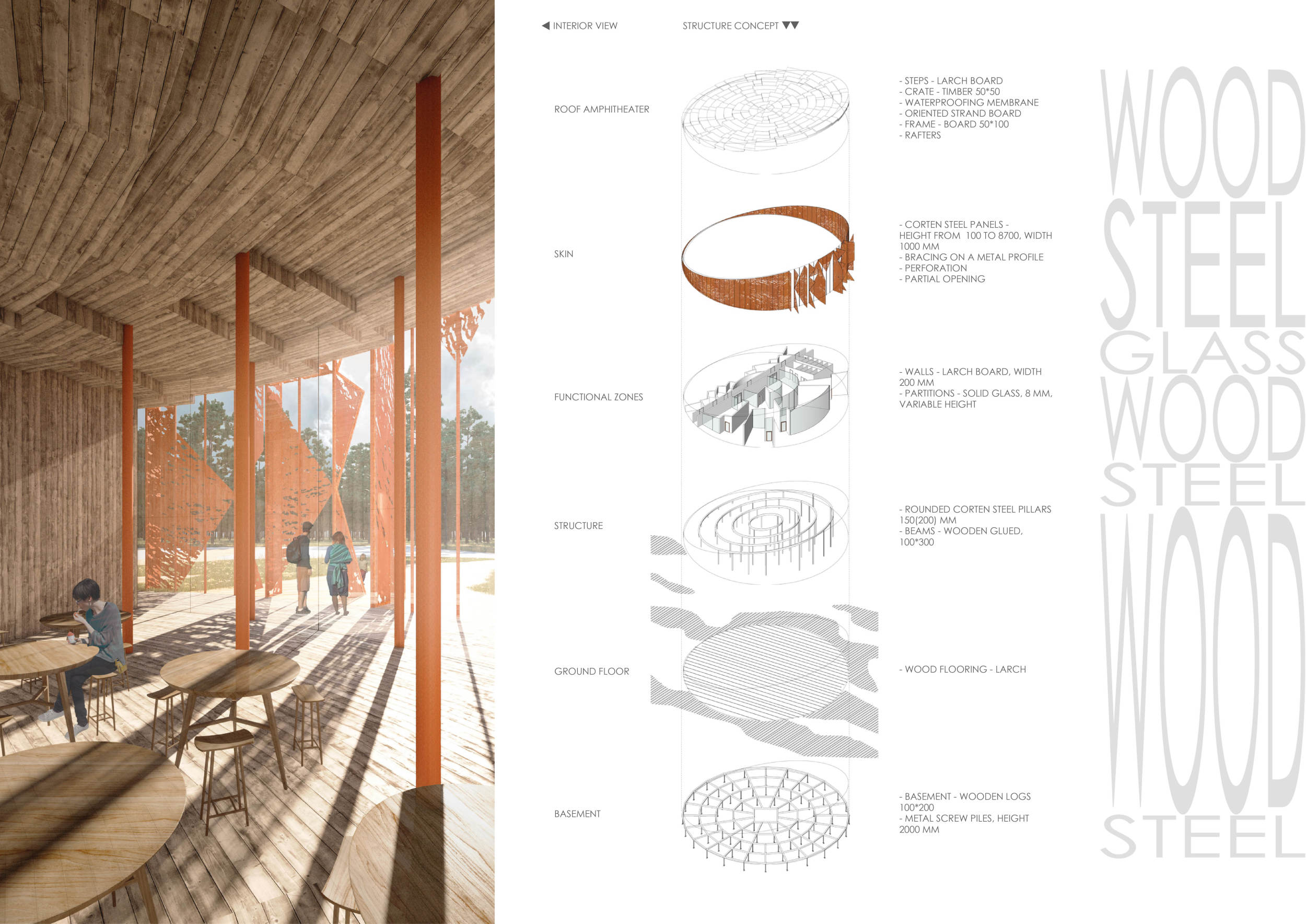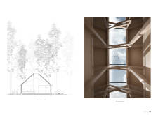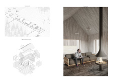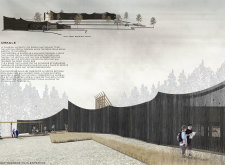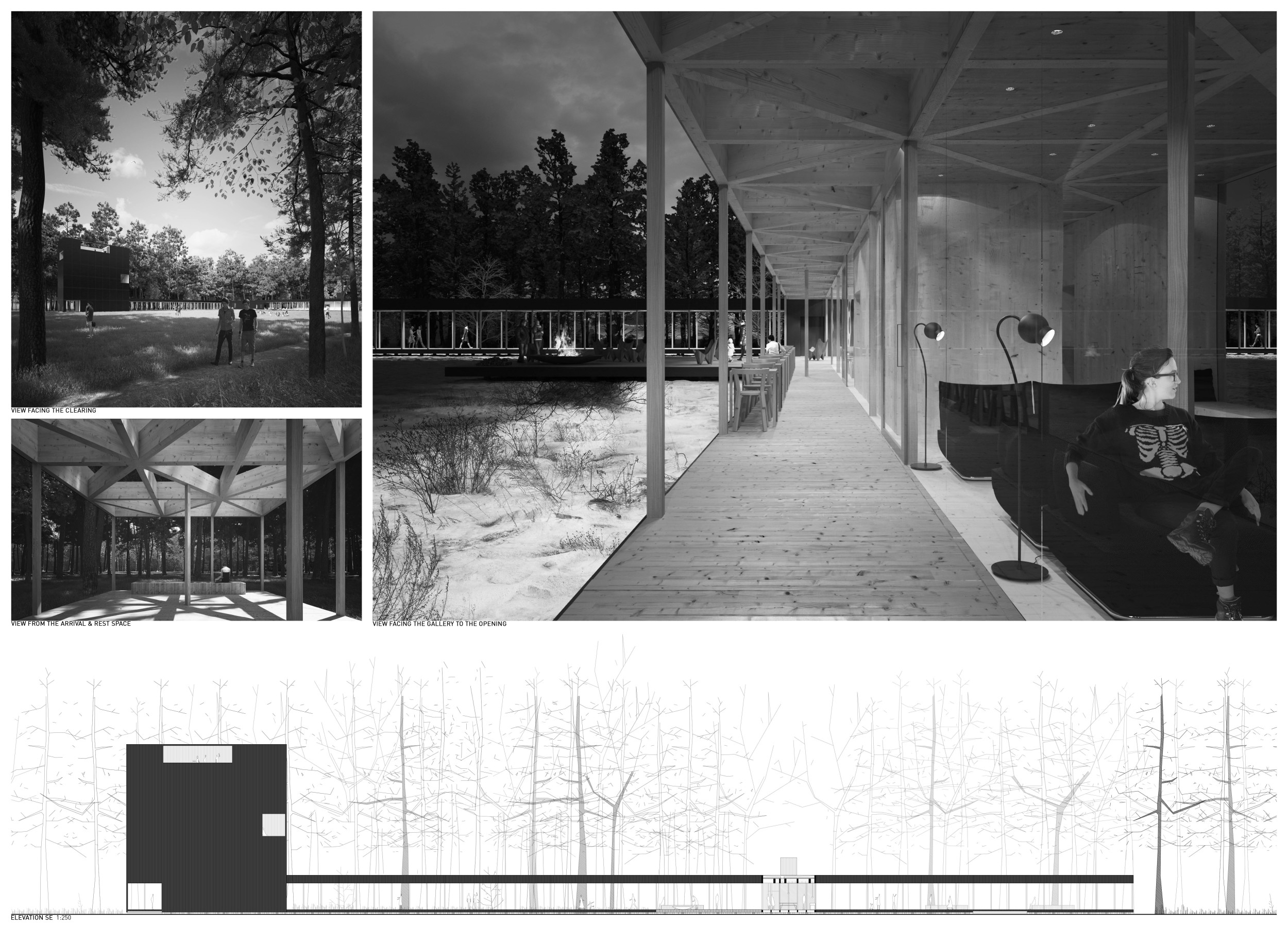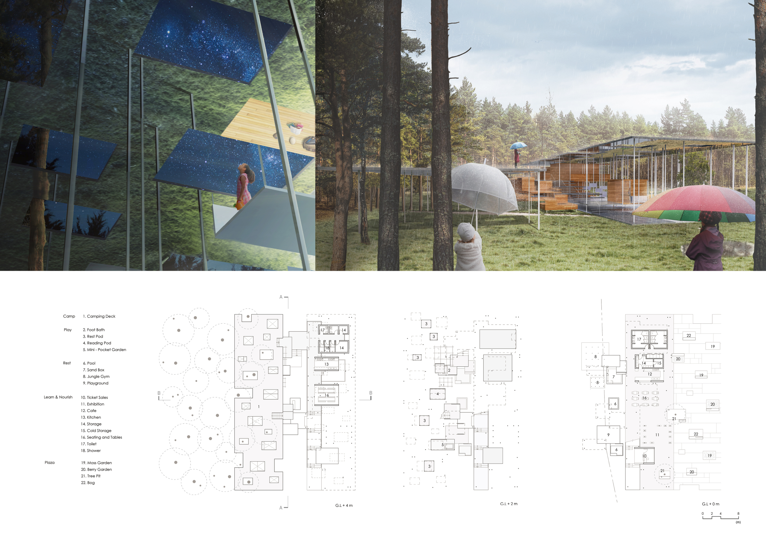 The design is commended for its use of a repeatable and constructable module that manages to create an organic, landscape-like form. The project proposes a burned-wood cladding that fortifies it against Latvia’s variable weather, and interiors of natural wood that connect it well with its forest surroundings. The section drawings and details are especially well-considered for modularity and construction using sustainable materials. Read more The building’s plan form strongly establishes a central gathering space, however the jury questions the vertical pitches and dips and wonders if the geometry might rather relate more strongly to its internal program. The project certainly has the potential to become a park landmark.