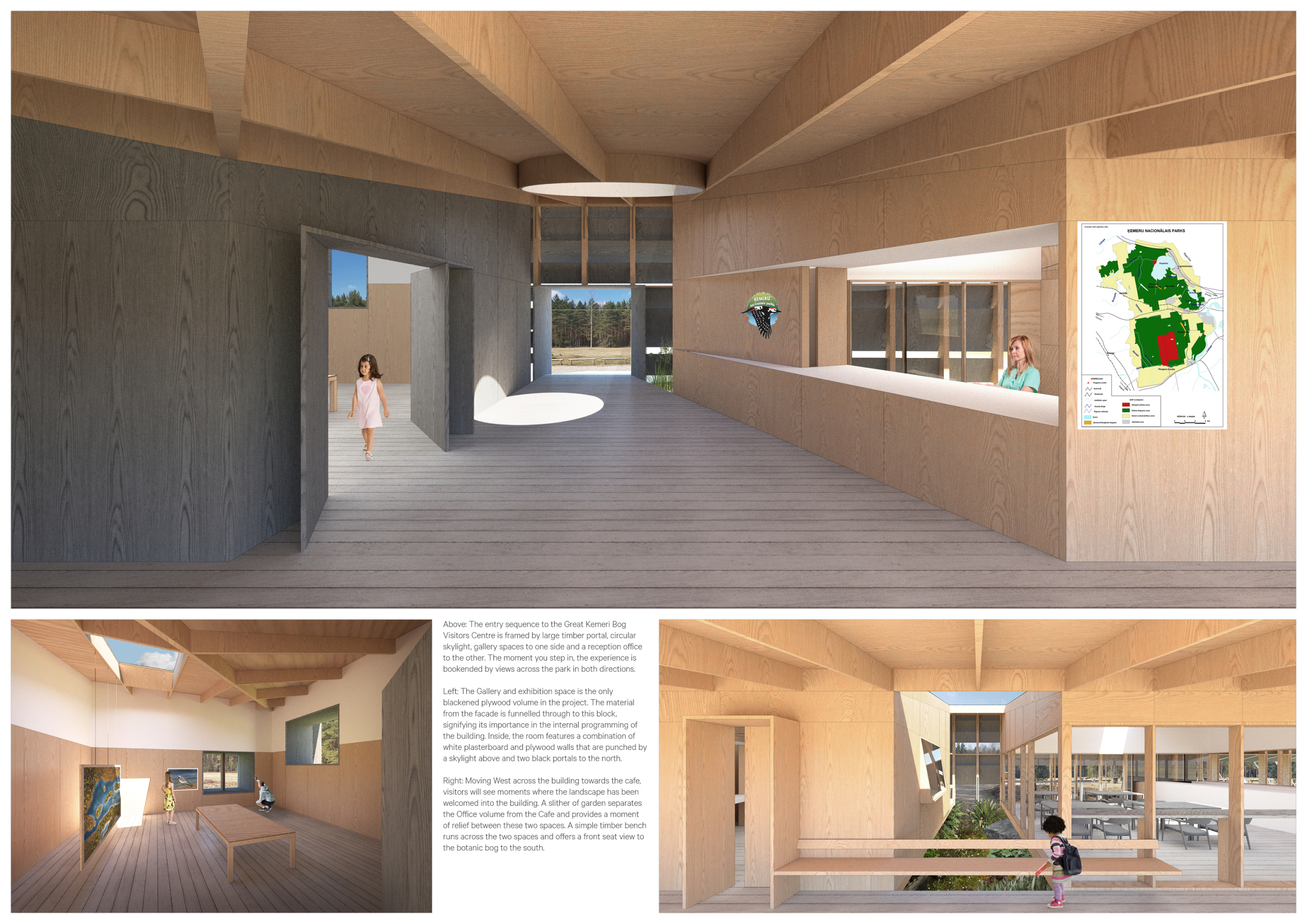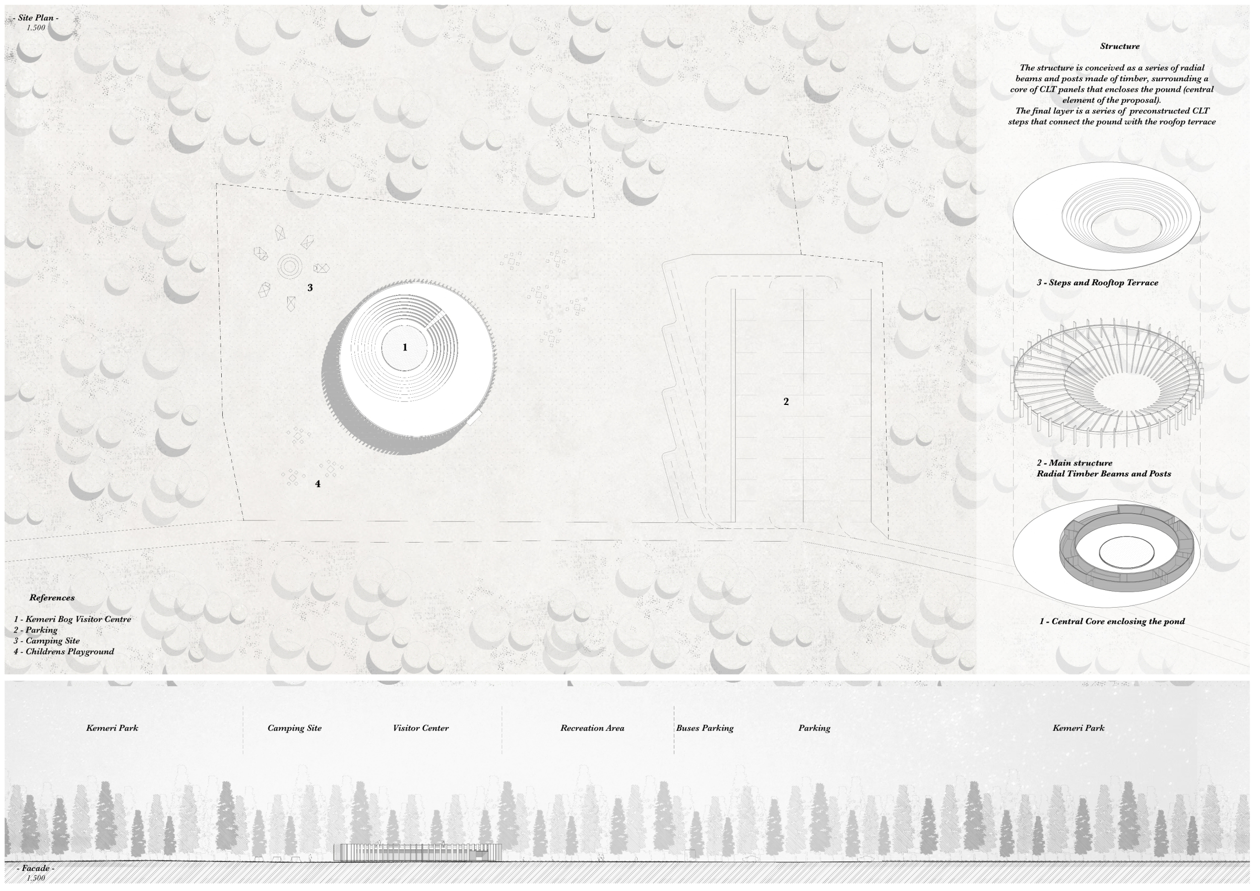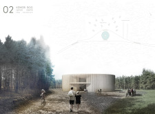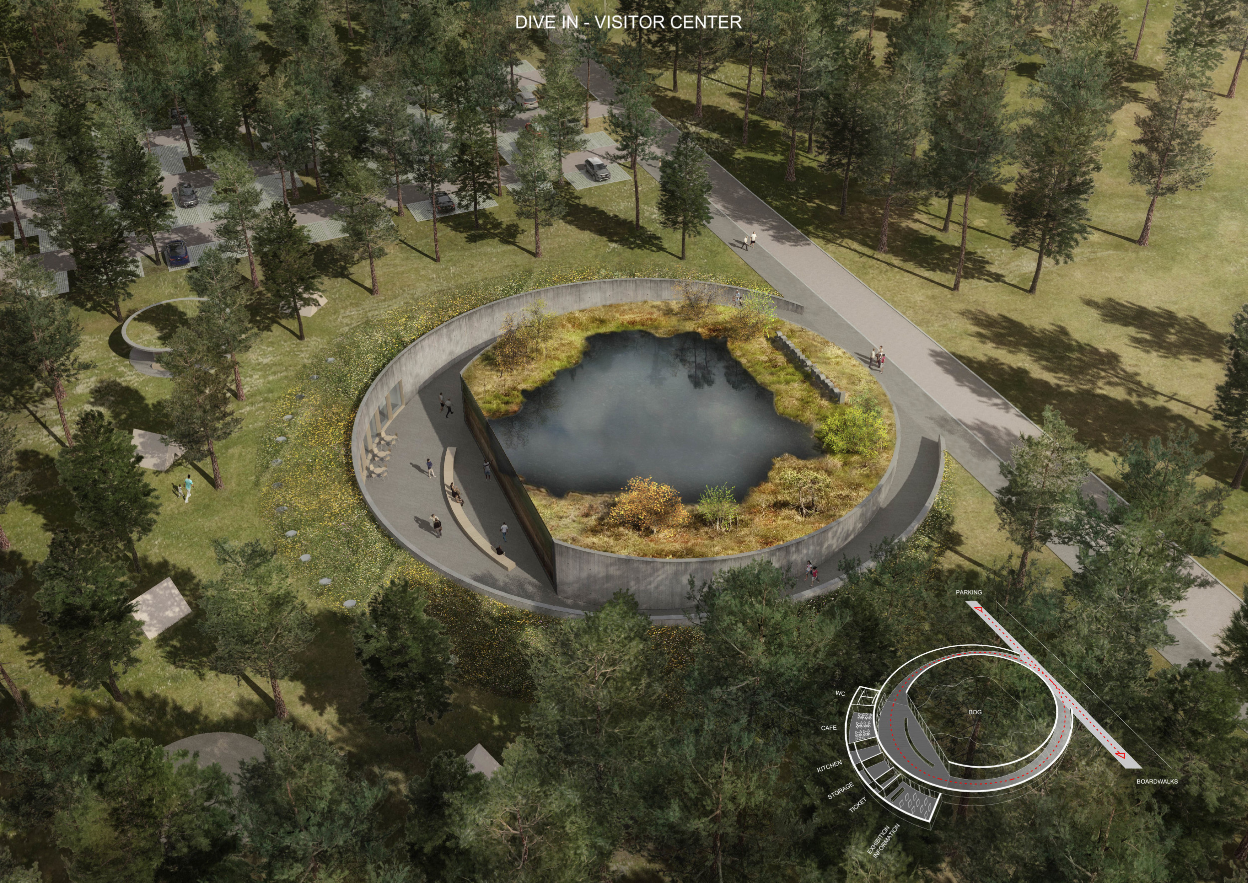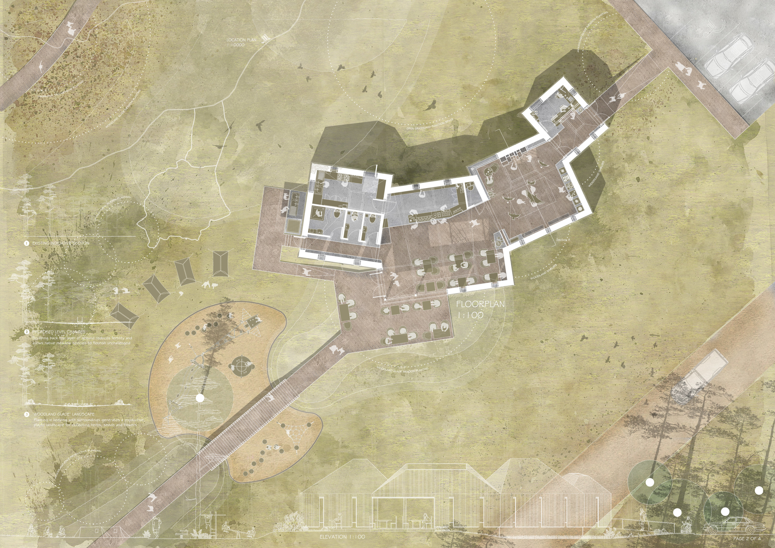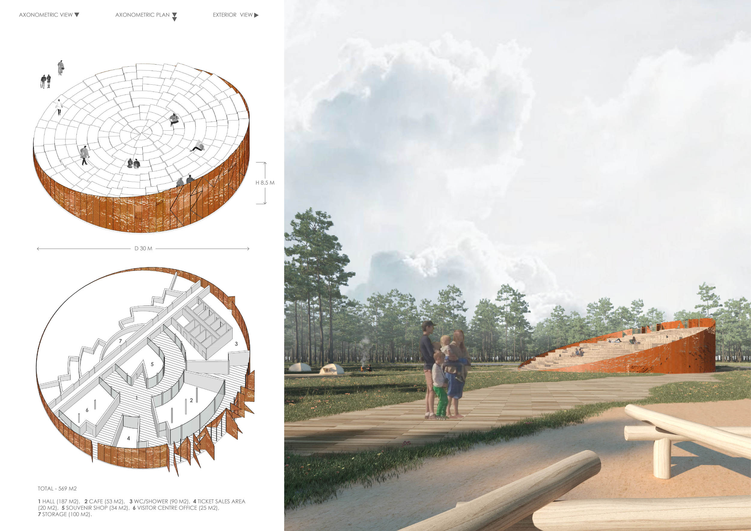 The project stood out to the jury for its simple, strong form. The circular visitor center’s repetitive and visually permeable facade of timber posts both connects to the surrounding site and encloses a space which monumentalises the relationship of the site with water. The central exterior space offers a quiet meditative area that focuses on the pond and the sky, yet it also has the potential to be used for group events. The walkable roof offers special views of the park. Read more The drawings and images are extremely effective at describing the circular form’s minimal disruption to the site. While the building’s central location on the site clearly sets it apart from the parking and within a natural ‘reservation area’, the jury would recommend the designer to further consider the building’s access from the car park and drive, as well as its connection to the bog boardwalk.