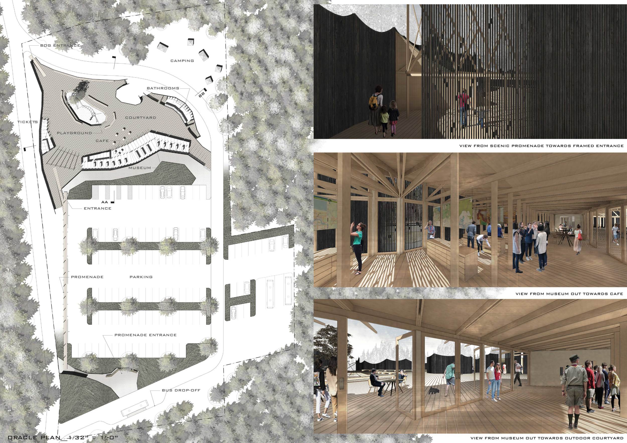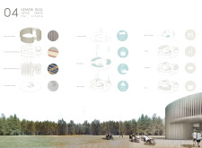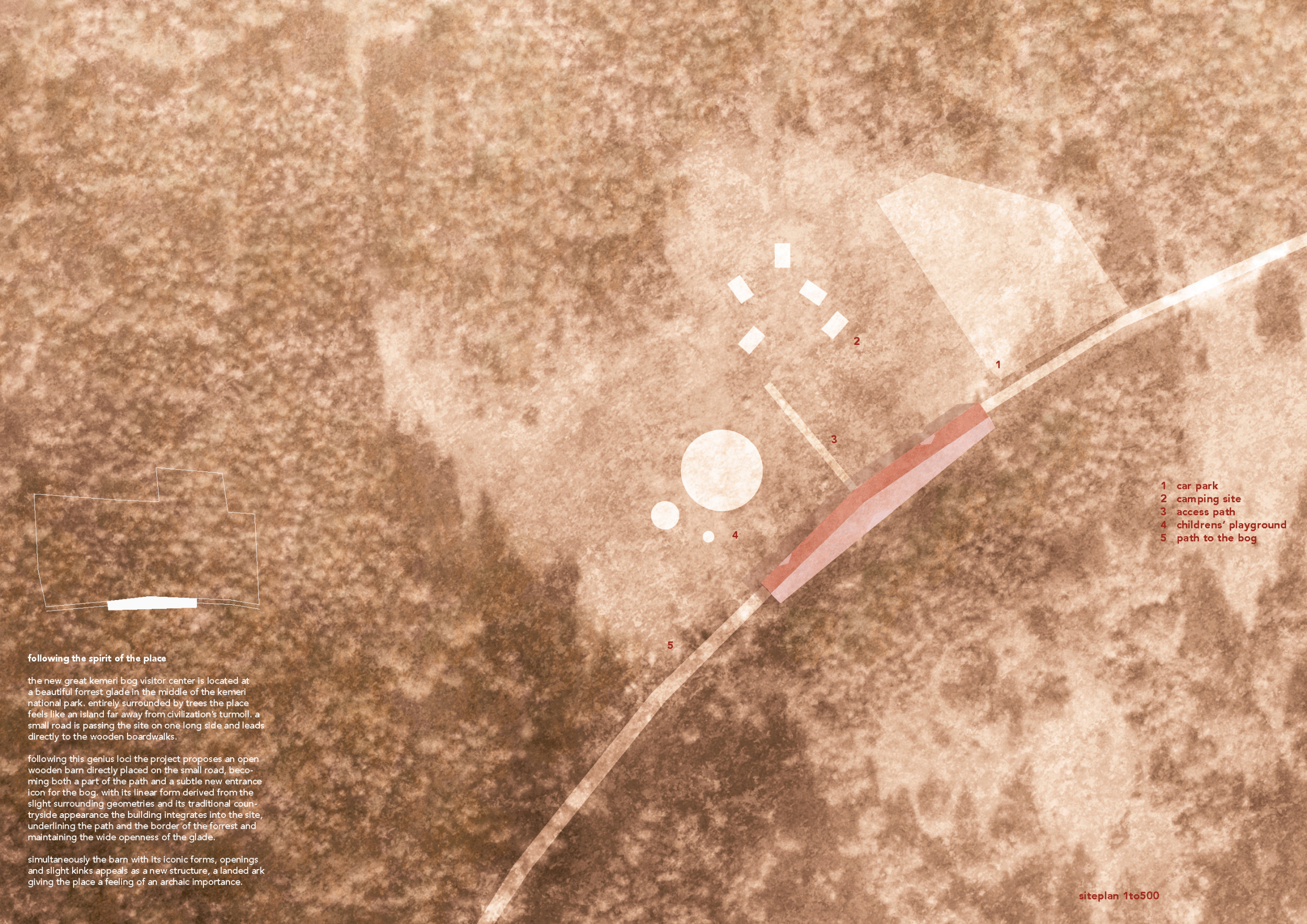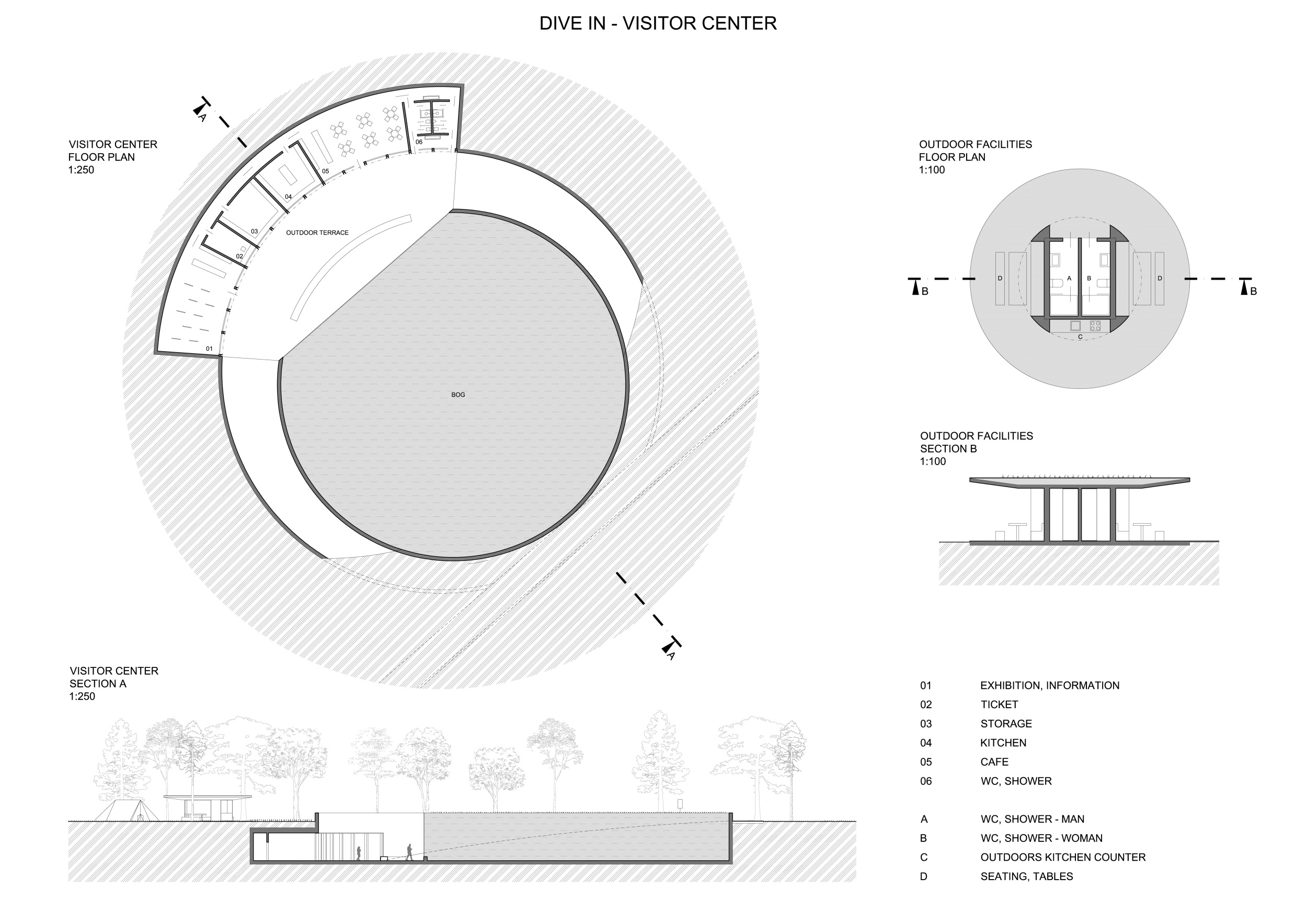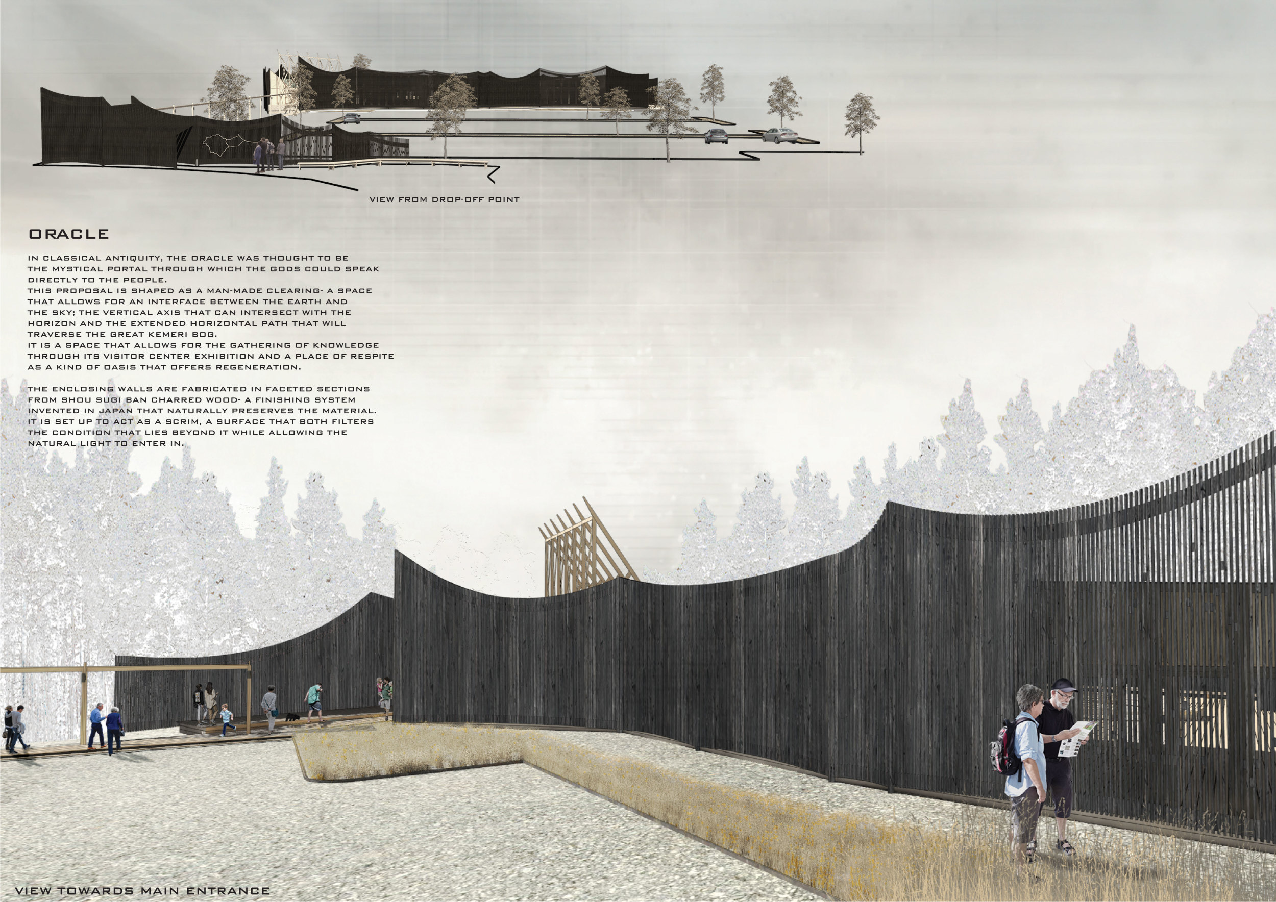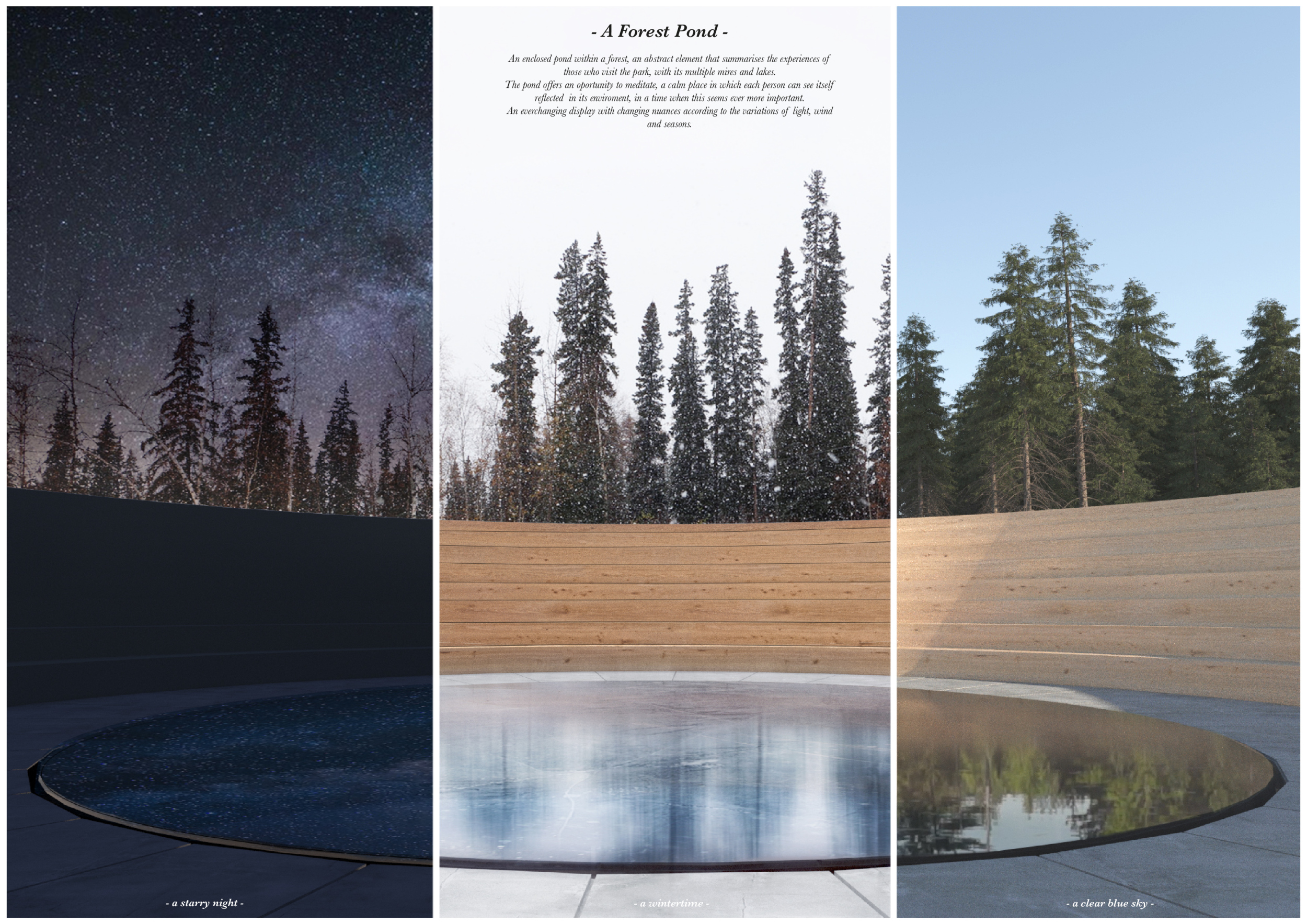 The project stood out to the jury for its simple, strong form. The circular visitor center’s repetitive and visually permeable facade of timber posts both connects to the surrounding site and encloses a space which monumentalises the relationship of the site with water. The central exterior space offers a quiet meditative area that focuses on the pond and the sky, yet it also has the potential to be used for group events. The walkable roof offers special views of the park. Read more The drawings and images are extremely effective at describing the circular form’s minimal disruption to the site. While the building’s central location on the site clearly sets it apart from the parking and within a natural ‘reservation area’, the jury would recommend the designer to further consider the building’s access from the car park and drive, as well as its connection to the bog boardwalk.