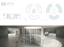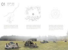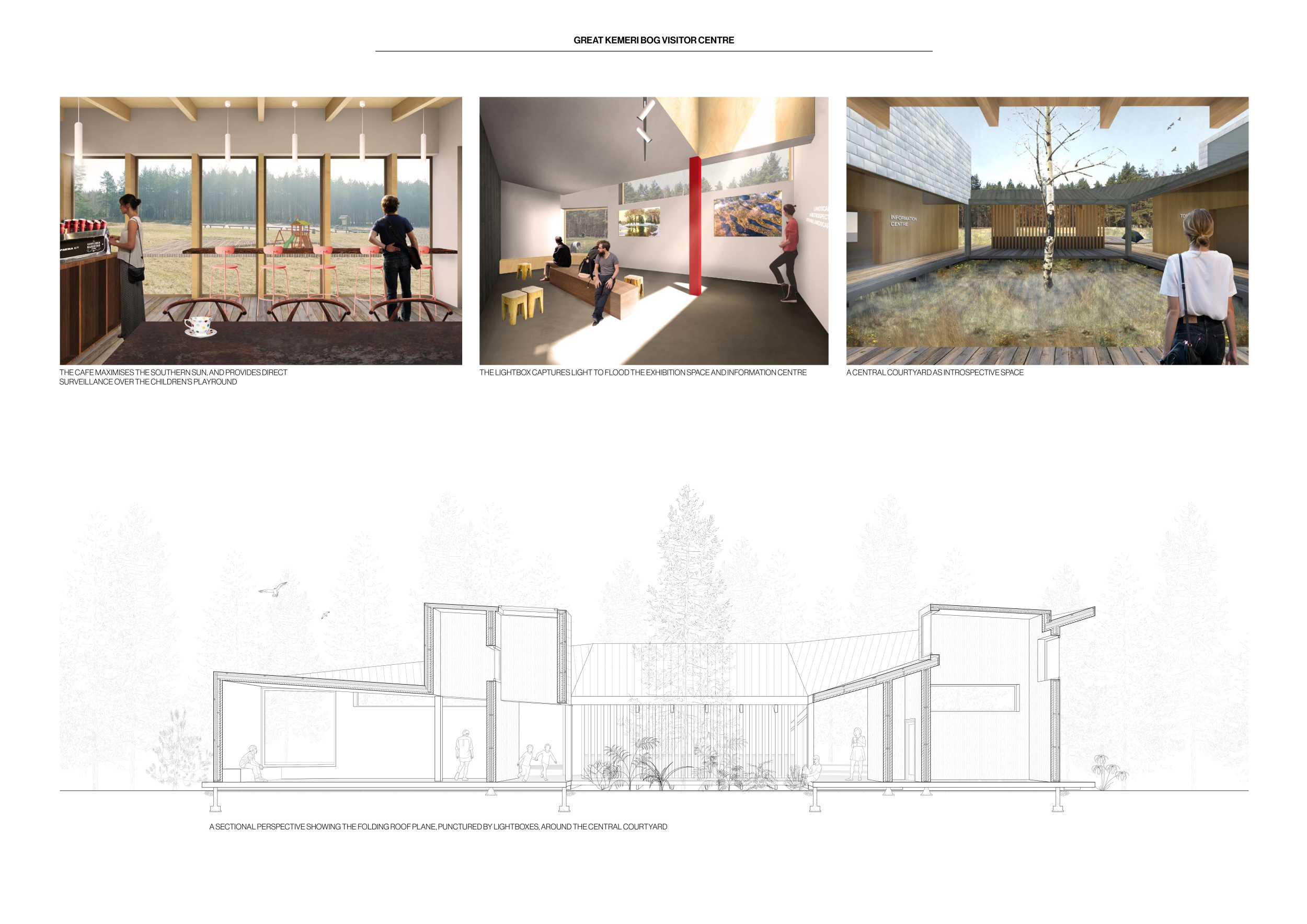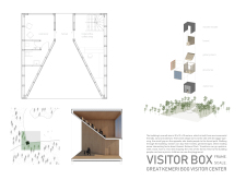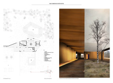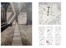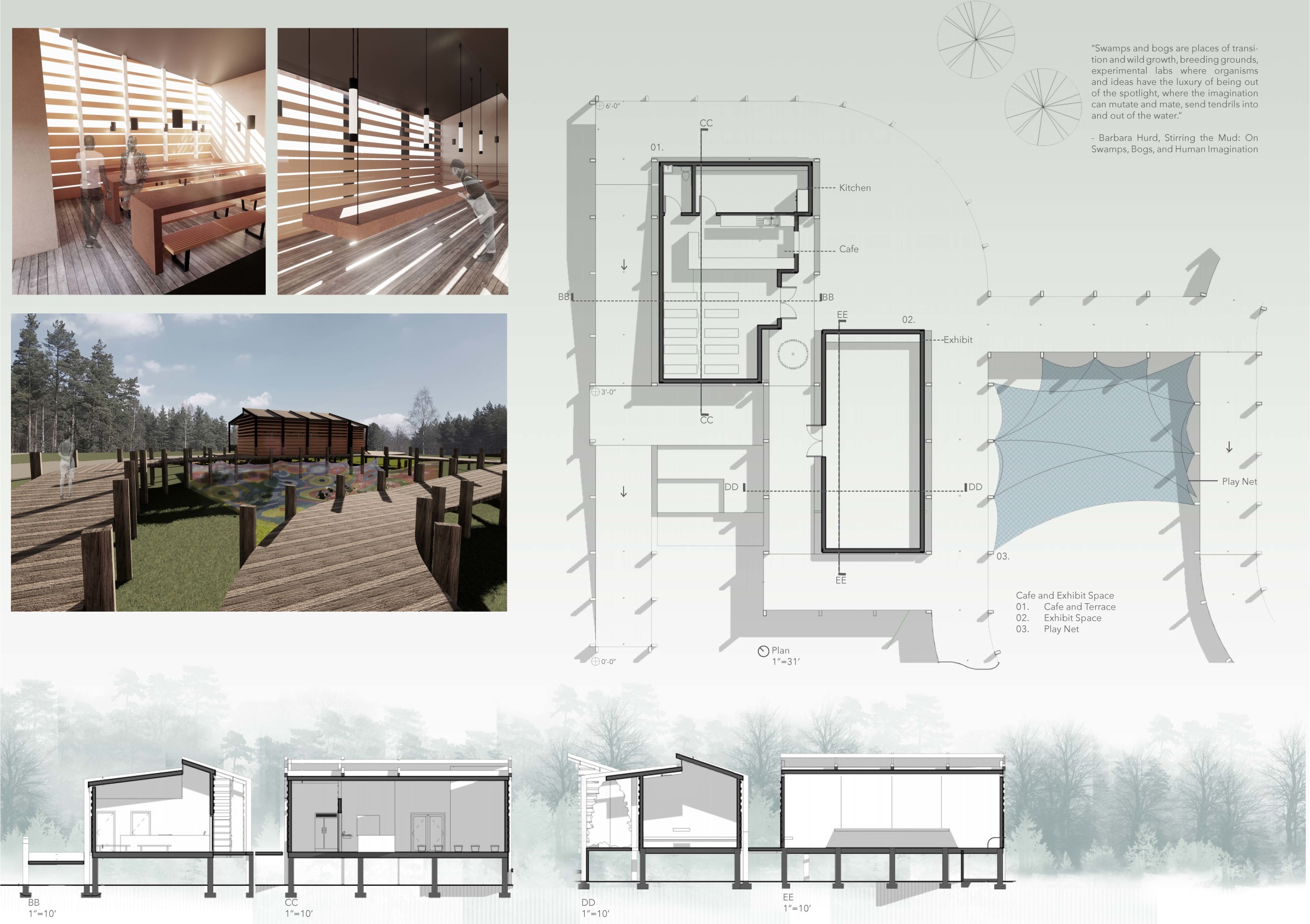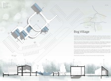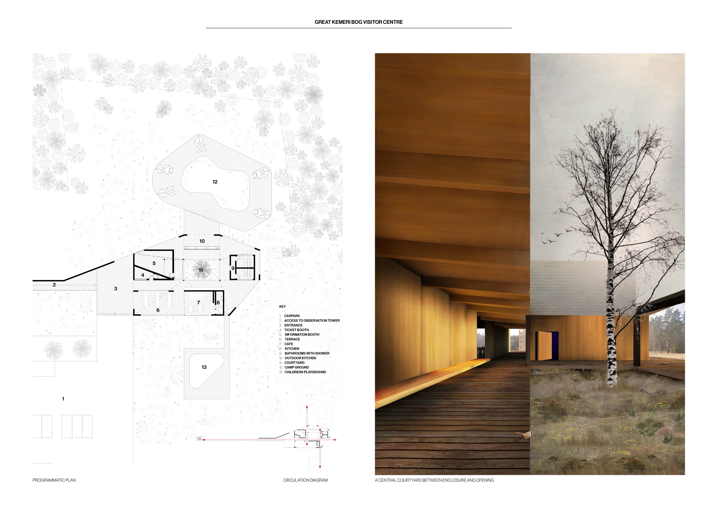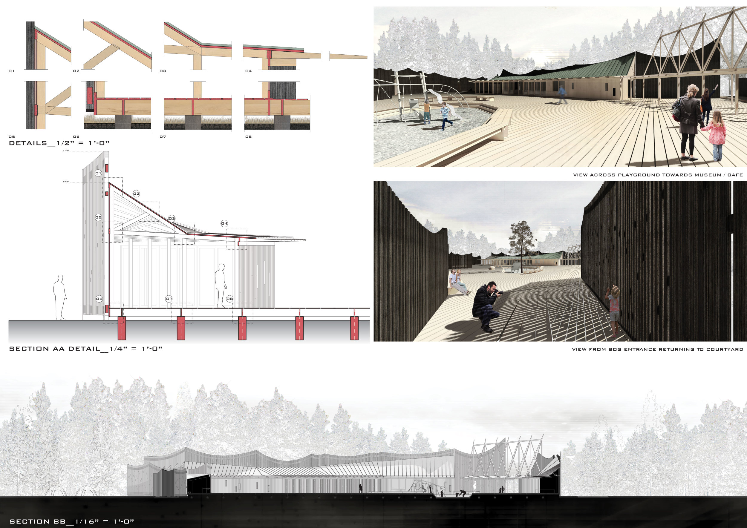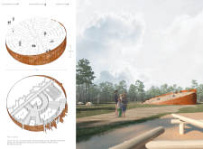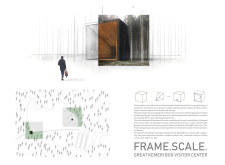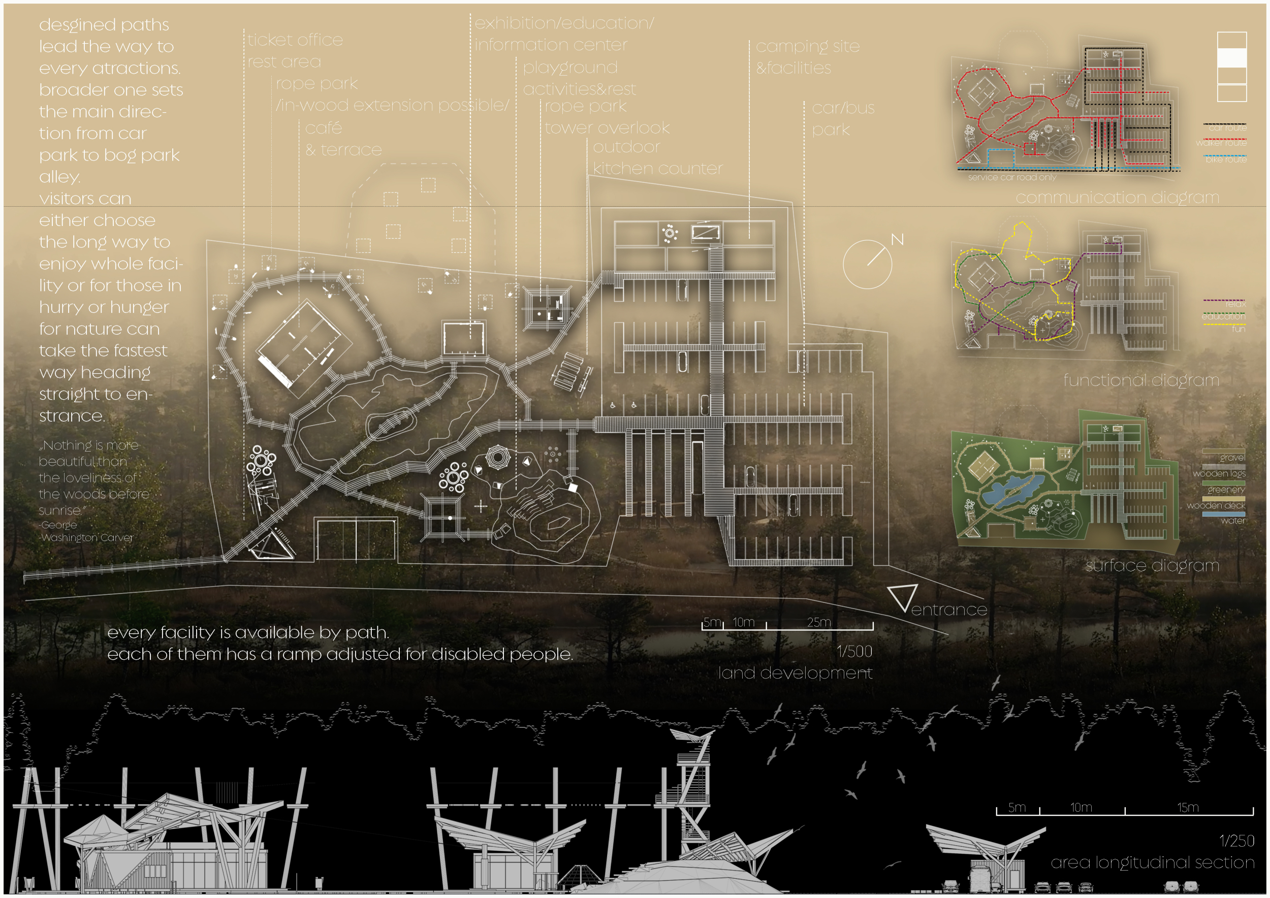 The project stood out to the jury for its simple, strong form. The circular visitor center’s repetitive and visually permeable facade of timber posts both connects to the surrounding site and encloses a space which monumentalises the relationship of the site with water. The central exterior space offers a quiet meditative area that focuses on the pond and the sky, yet it also has the potential to be used for group events. The walkable roof offers special views of the park. Read more The drawings and images are extremely effective at describing the circular form’s minimal disruption to the site. While the building’s central location on the site clearly sets it apart from the parking and within a natural ‘reservation area’, the jury would recommend the designer to further consider the building’s access from the car park and drive, as well as its connection to the bog boardwalk.