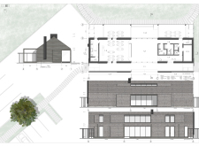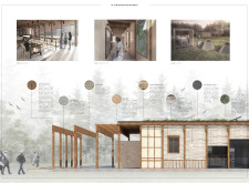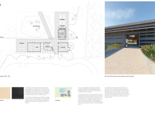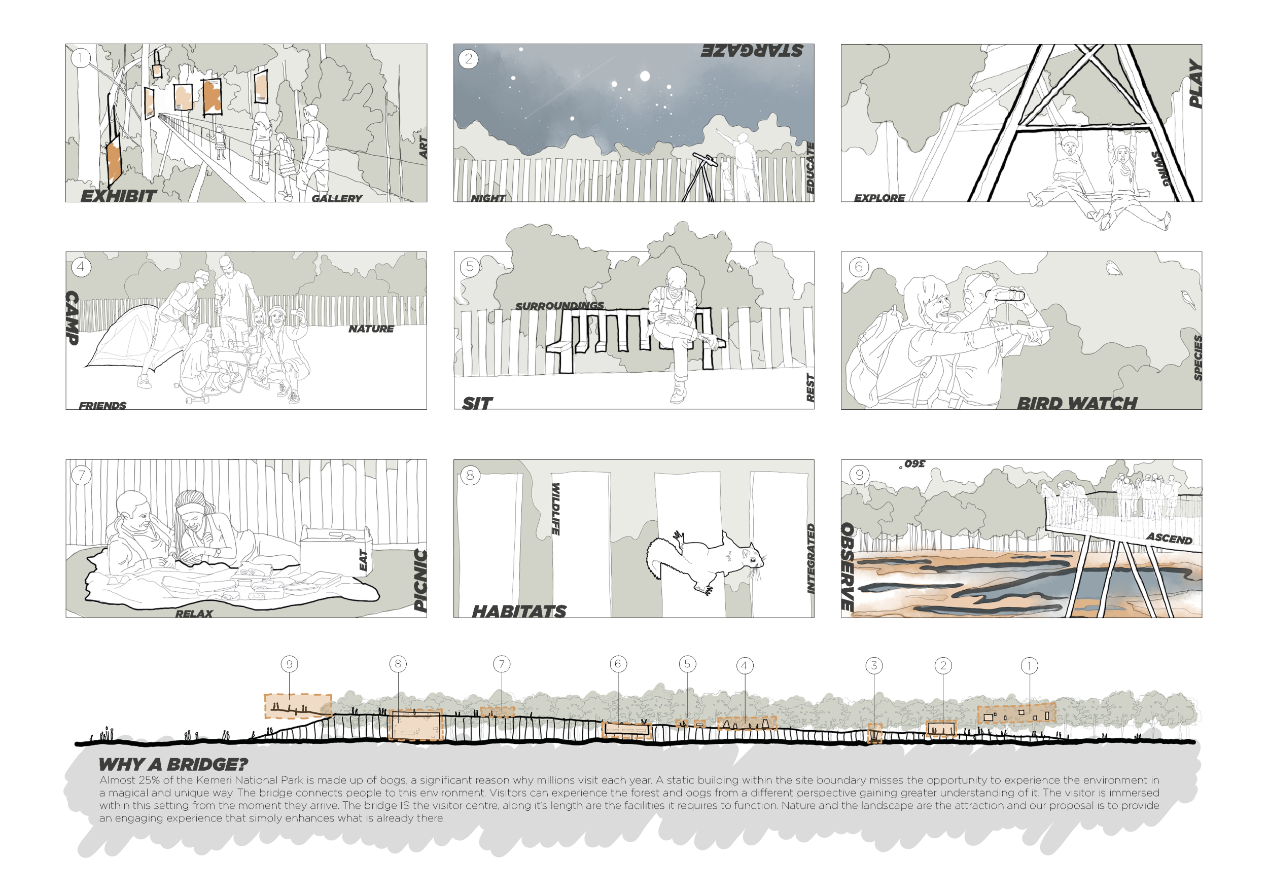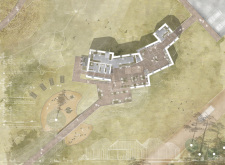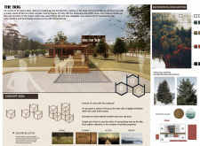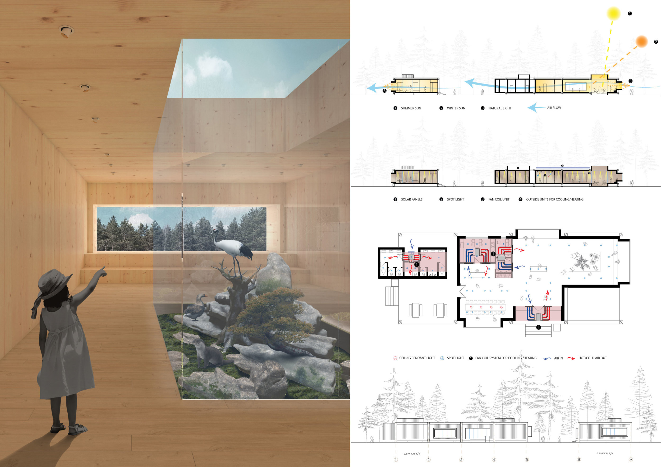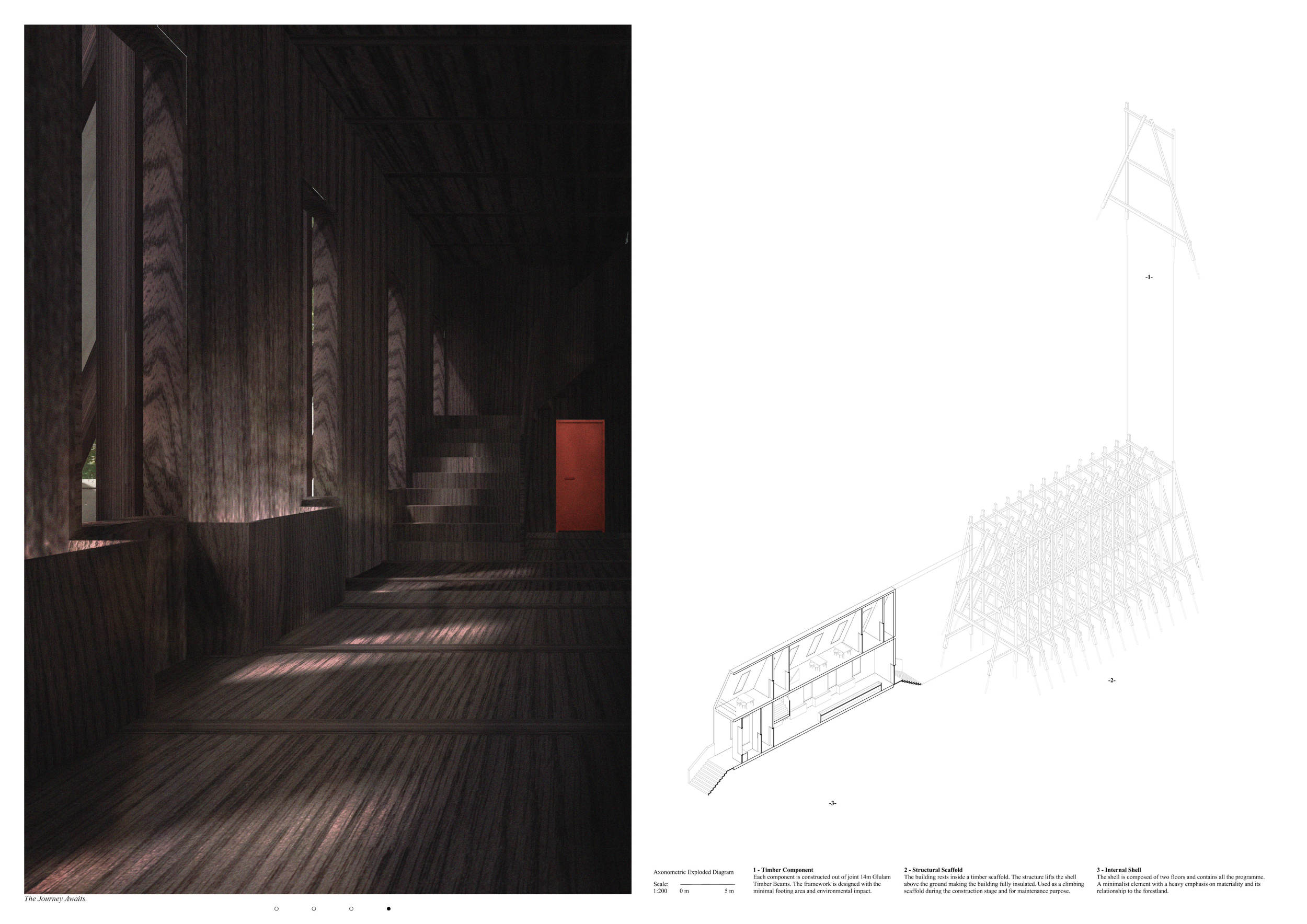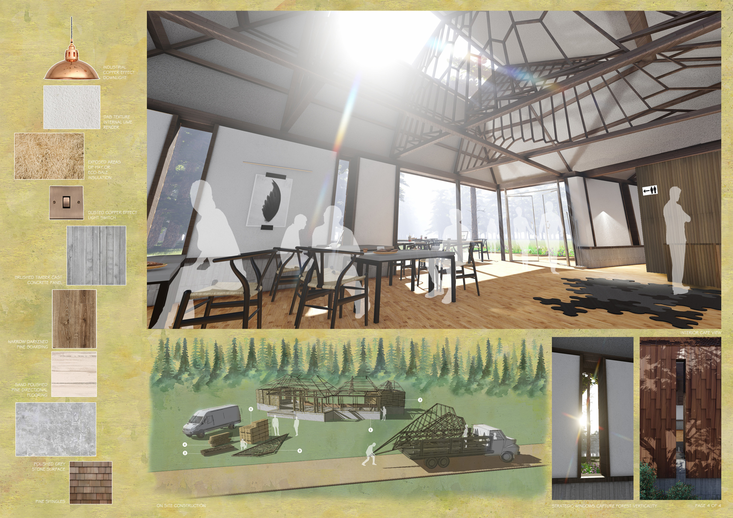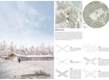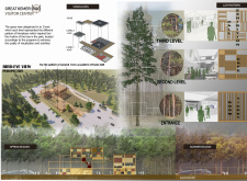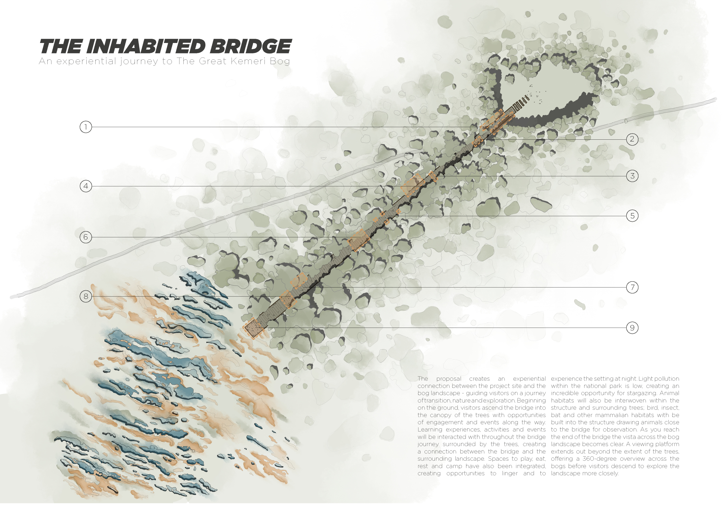 The project stood out to the jury for its simple, strong form. The circular visitor center’s repetitive and visually permeable facade of timber posts both connects to the surrounding site and encloses a space which monumentalises the relationship of the site with water. The central exterior space offers a quiet meditative area that focuses on the pond and the sky, yet it also has the potential to be used for group events. The walkable roof offers special views of the park. Read more The drawings and images are extremely effective at describing the circular form’s minimal disruption to the site. While the building’s central location on the site clearly sets it apart from the parking and within a natural ‘reservation area’, the jury would recommend the designer to further consider the building’s access from the car park and drive, as well as its connection to the bog boardwalk.