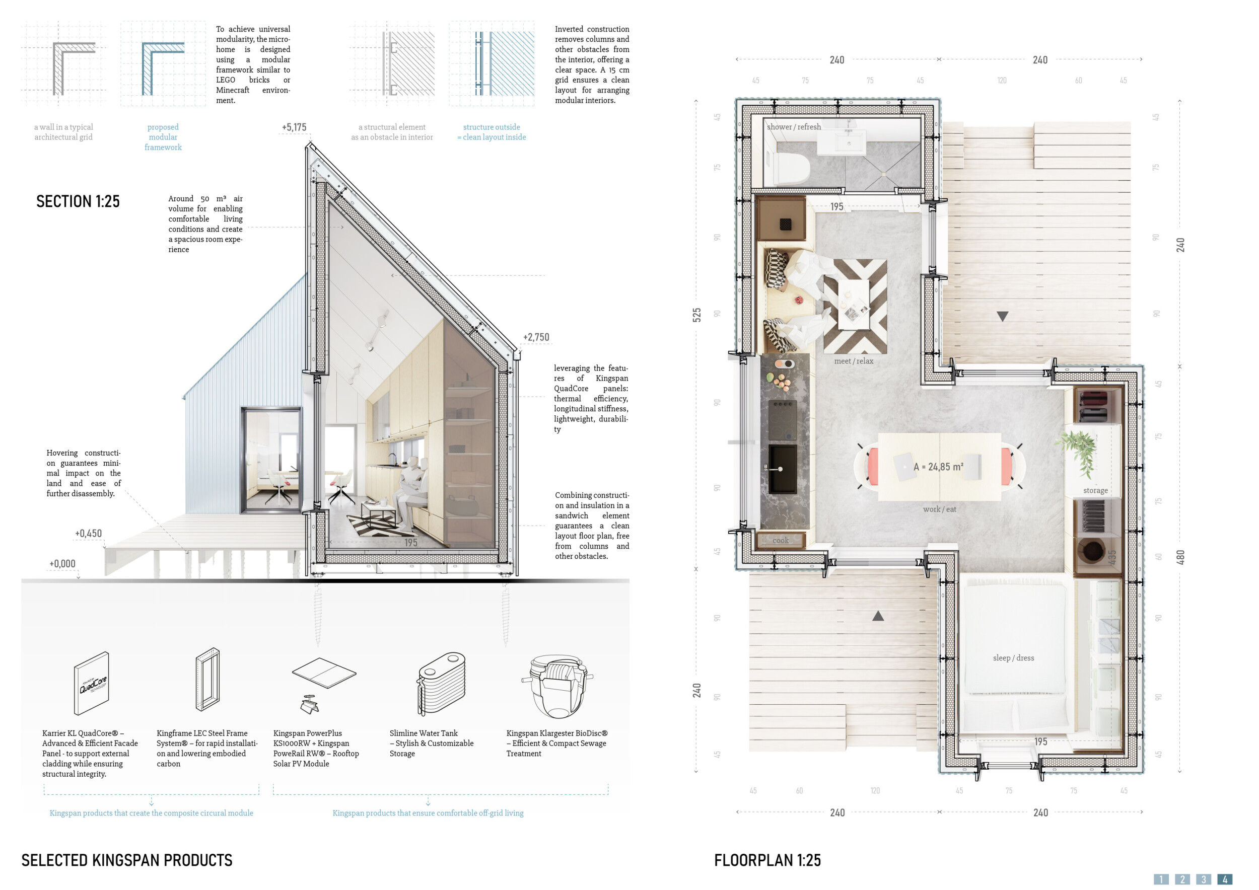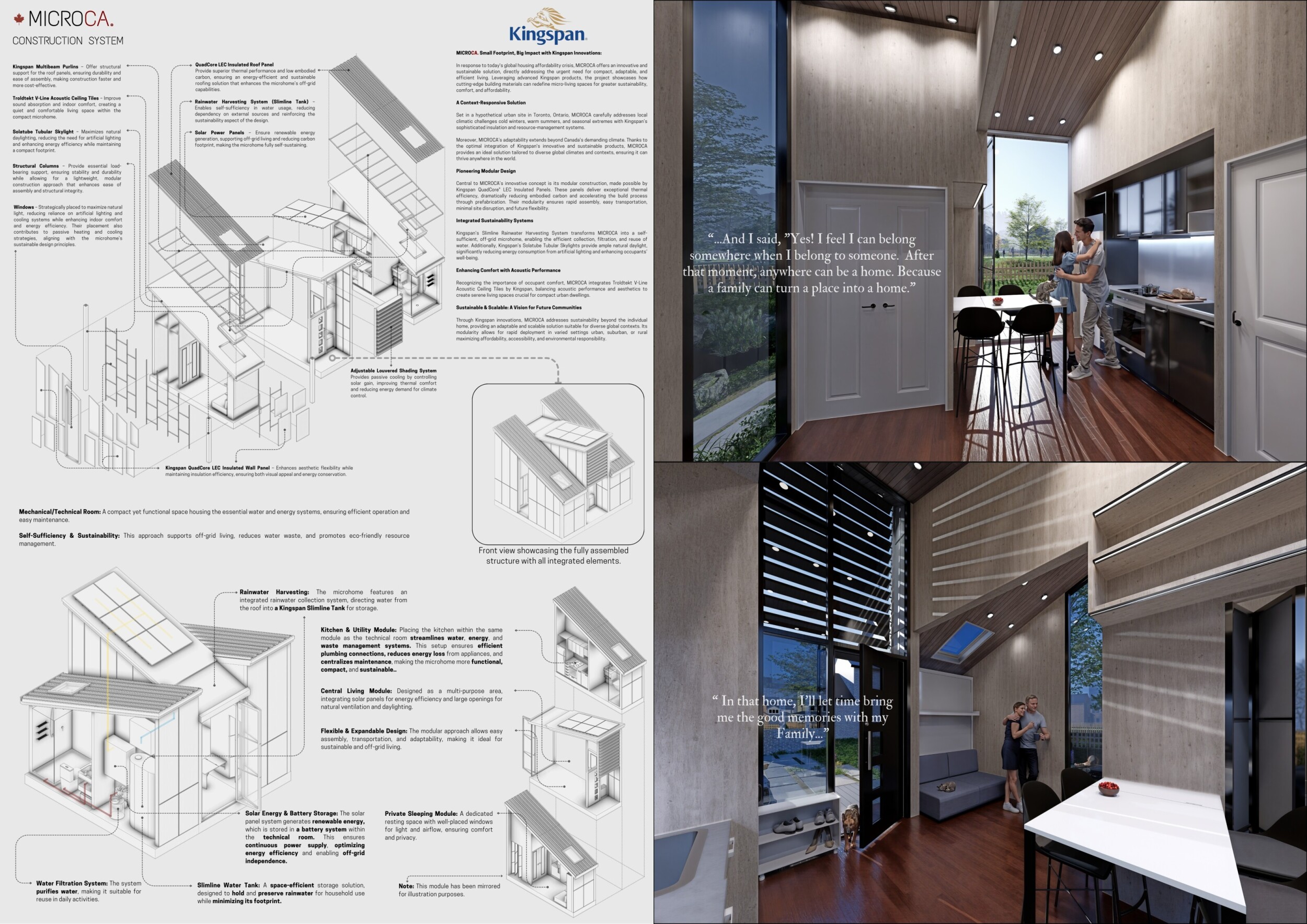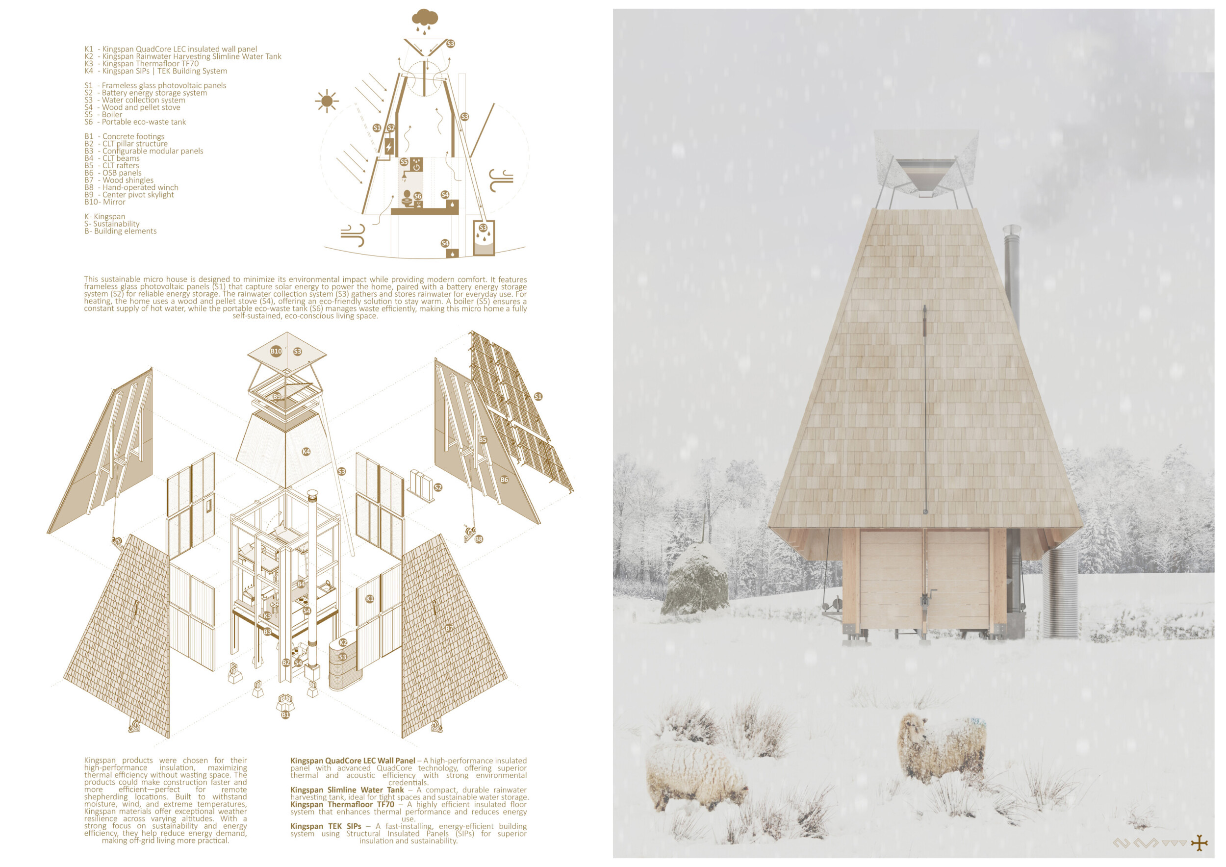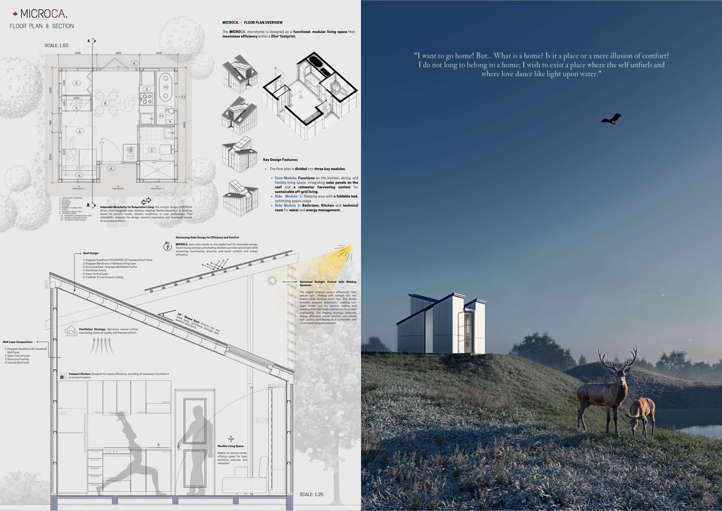 The MICROHOME Kingspan Edition invited participants to conceptualize an off-grid modular dwelling for a hypothetical young professional couple, with a total floor area not exceeding 25 square meters. This challenge encouraged innovative thinking in spatial organization, distinctive aesthetics, and the use of state-of-the-art technologies and materials. The competition had no geographical restrictions on the hypothetical sites, allowing for unlimited creativity whether urban or rural. Participants were asked to focus on key design considerations including community Integration, sustainability and environmental impact, affordability and accessibility, adaptability and scalability, and educational and social awareness. The global housing crisis is intensifying, with rising property costs and insufficient housing supply affecting millions. As urban areas grow and environmental concerns increase, there is a pressing need for affordable, sustainable, and compact housing solutions. Architects are crucial in addressing this issue by designing efficient and environmentally responsible homes. Compact living offers a practical approach to providing affordable housing while supporting sustainable urban development. By focusing on these aspects, architects can contribute to creating functional and equitable housing solutions that meet current and future needs.