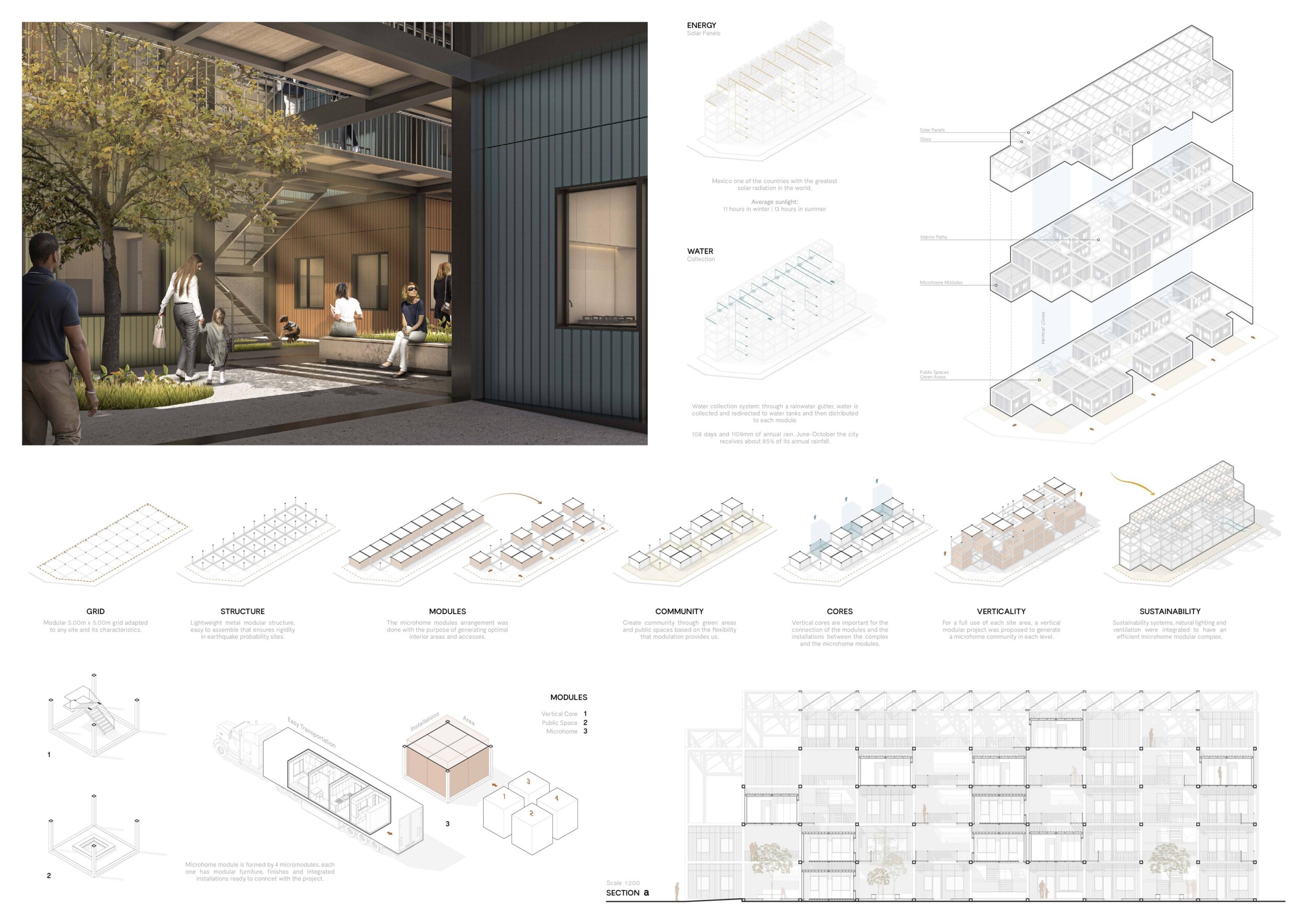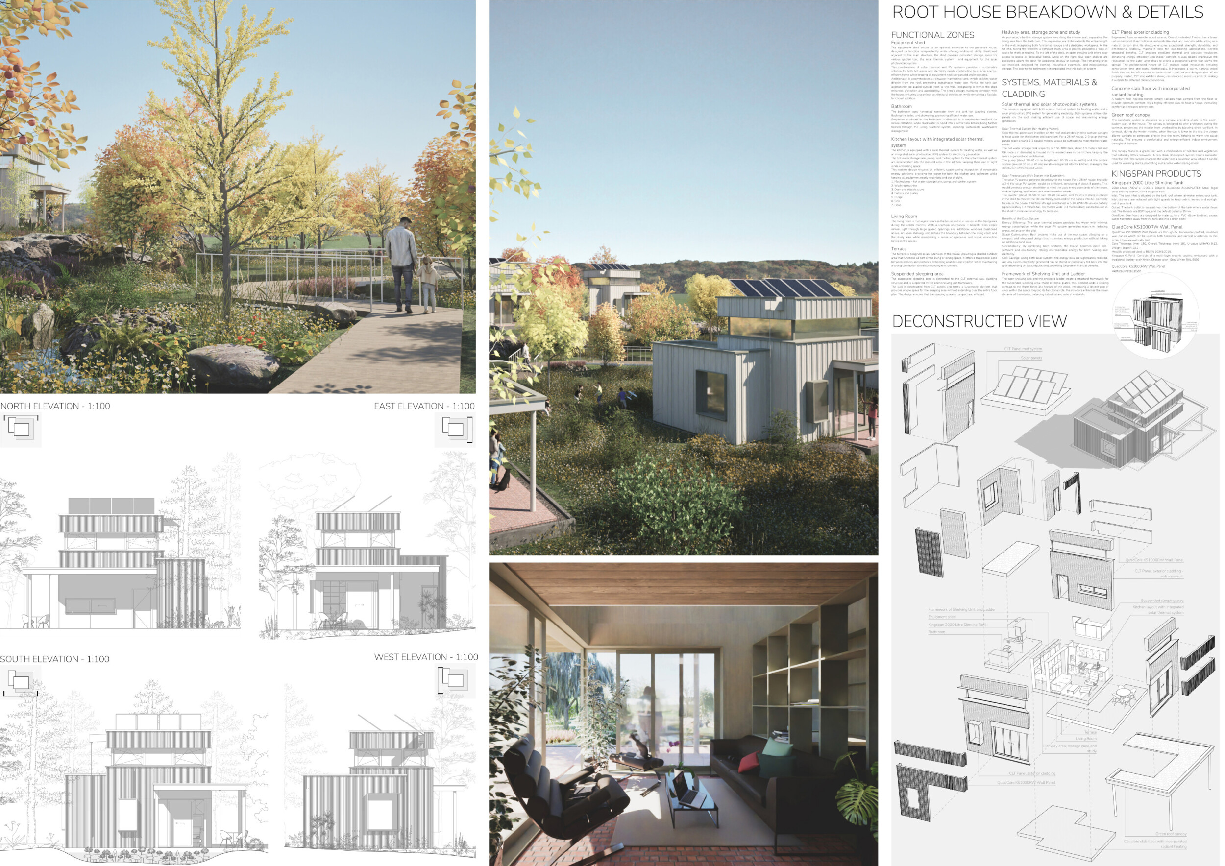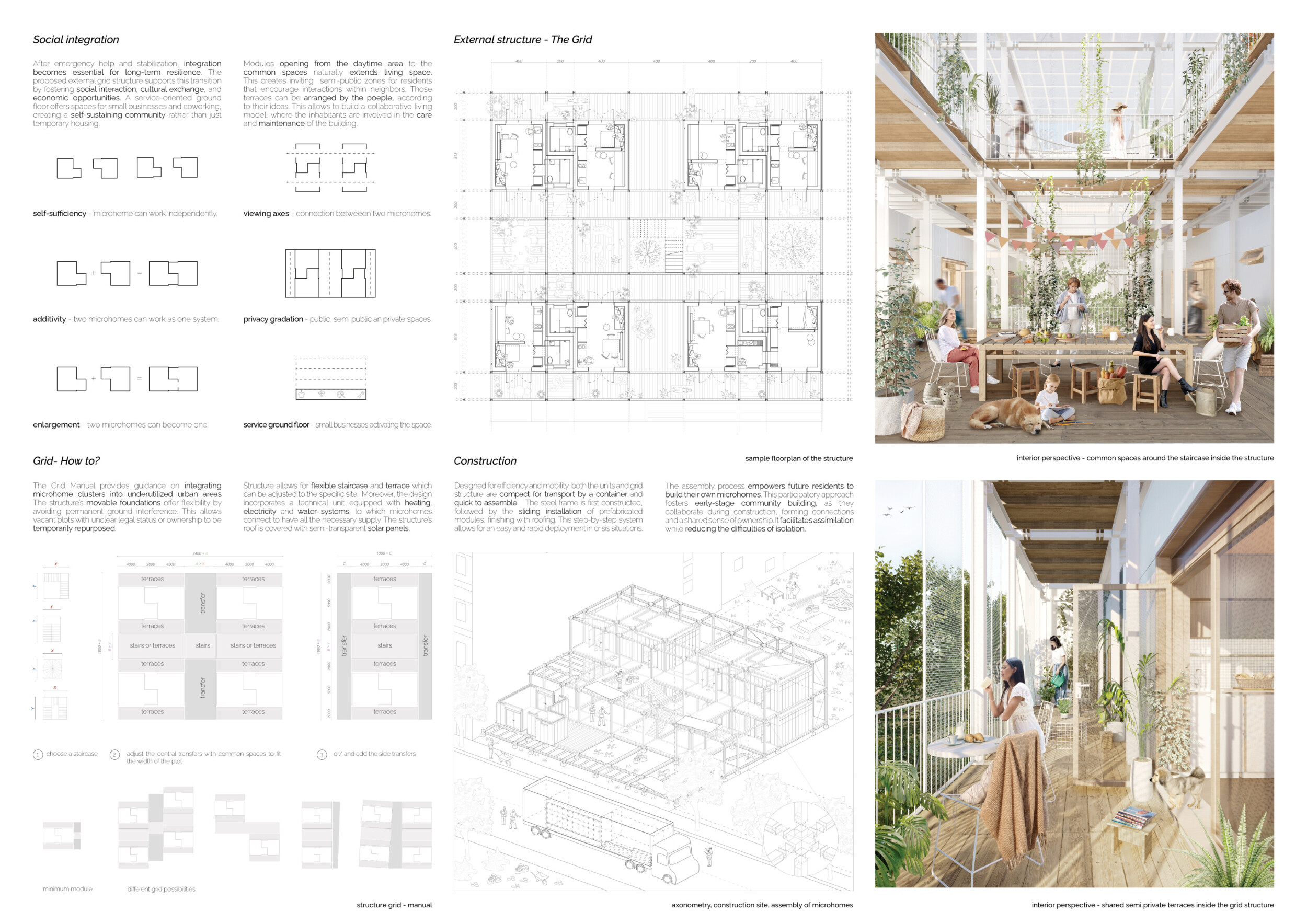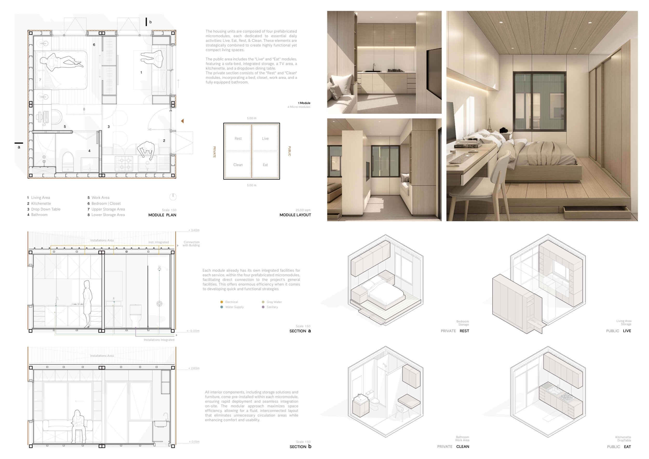 The project offers a clear and engaging narrative through its strong layout and thoughtful balance between rendered imagery and technical diagrams, successfully establishing the project's context and modular design strategy. The use of large visuals on the first and last sheets immediately draws the viewer in, though greater variation in color tones across the sheets could further enrich visual engagement.