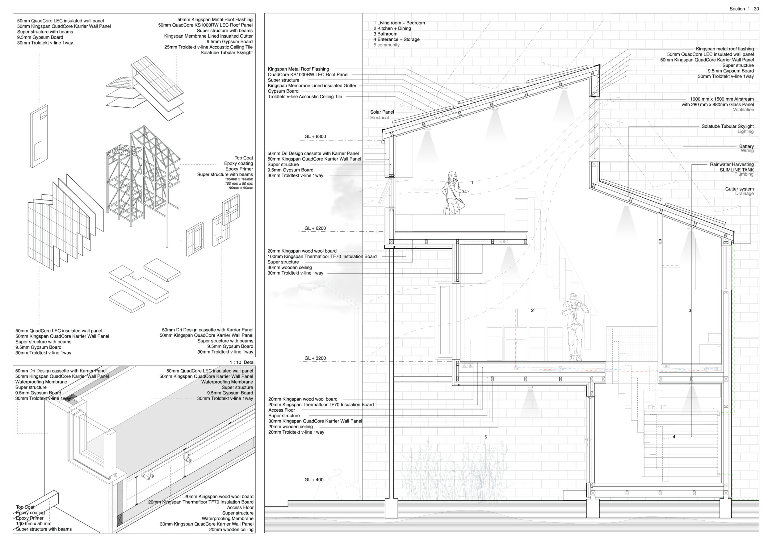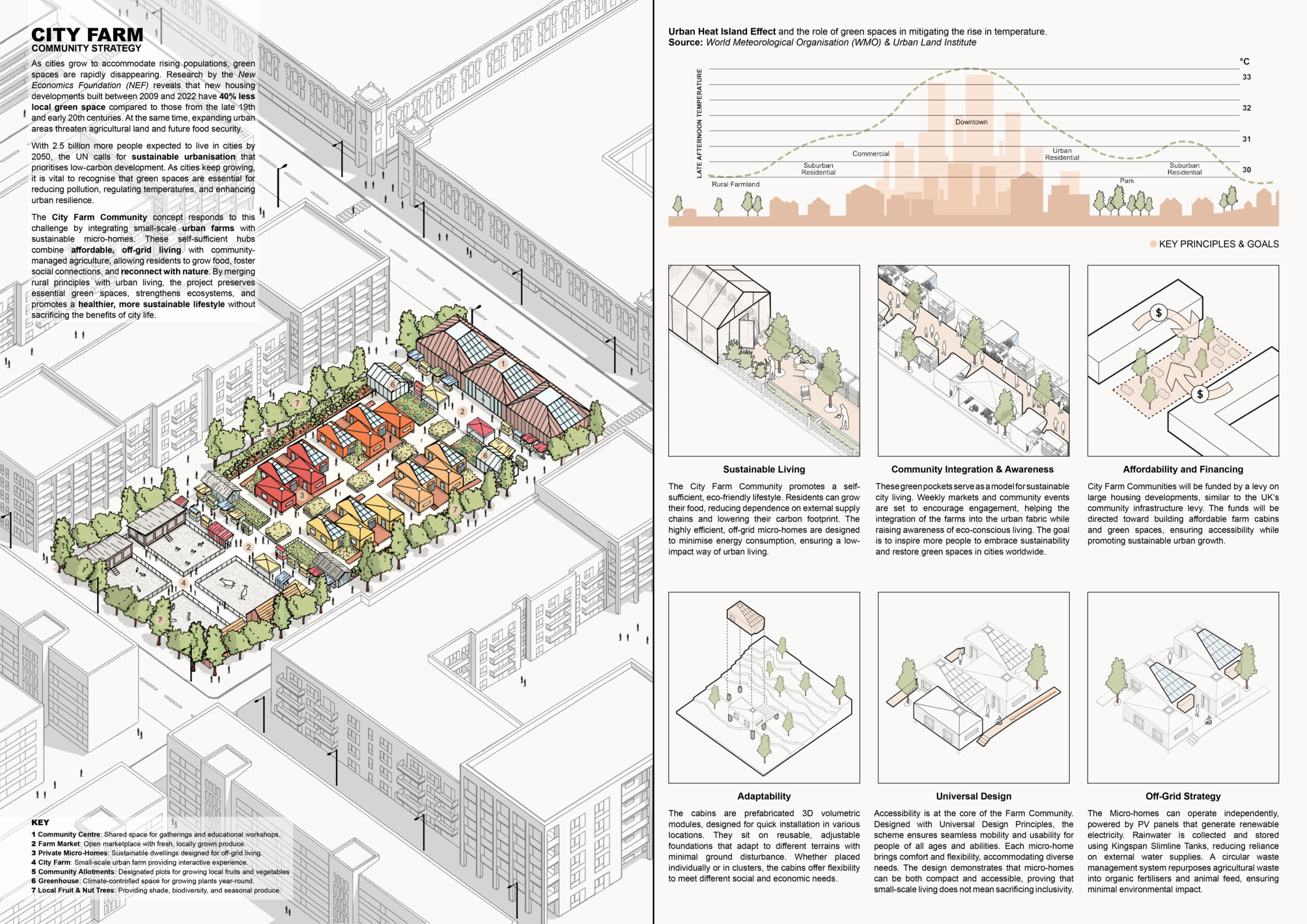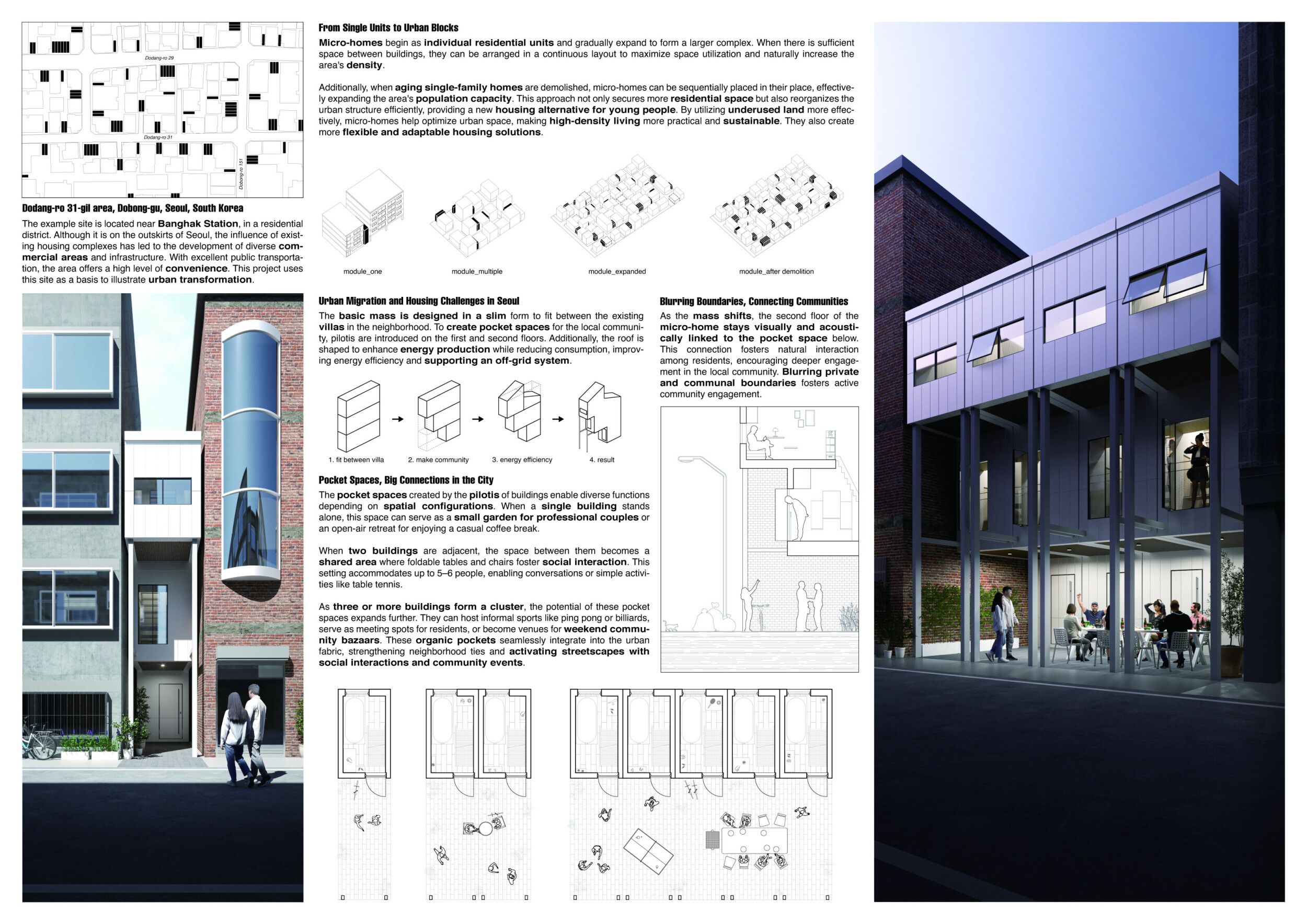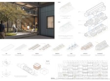 The project offers a clear and engaging narrative through its strong layout and thoughtful balance between rendered imagery and technical diagrams, successfully establishing the project's context and modular design strategy. The use of large visuals on the first and last sheets immediately draws the viewer in, though greater variation in color tones across the sheets could further enrich visual engagement.