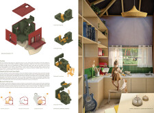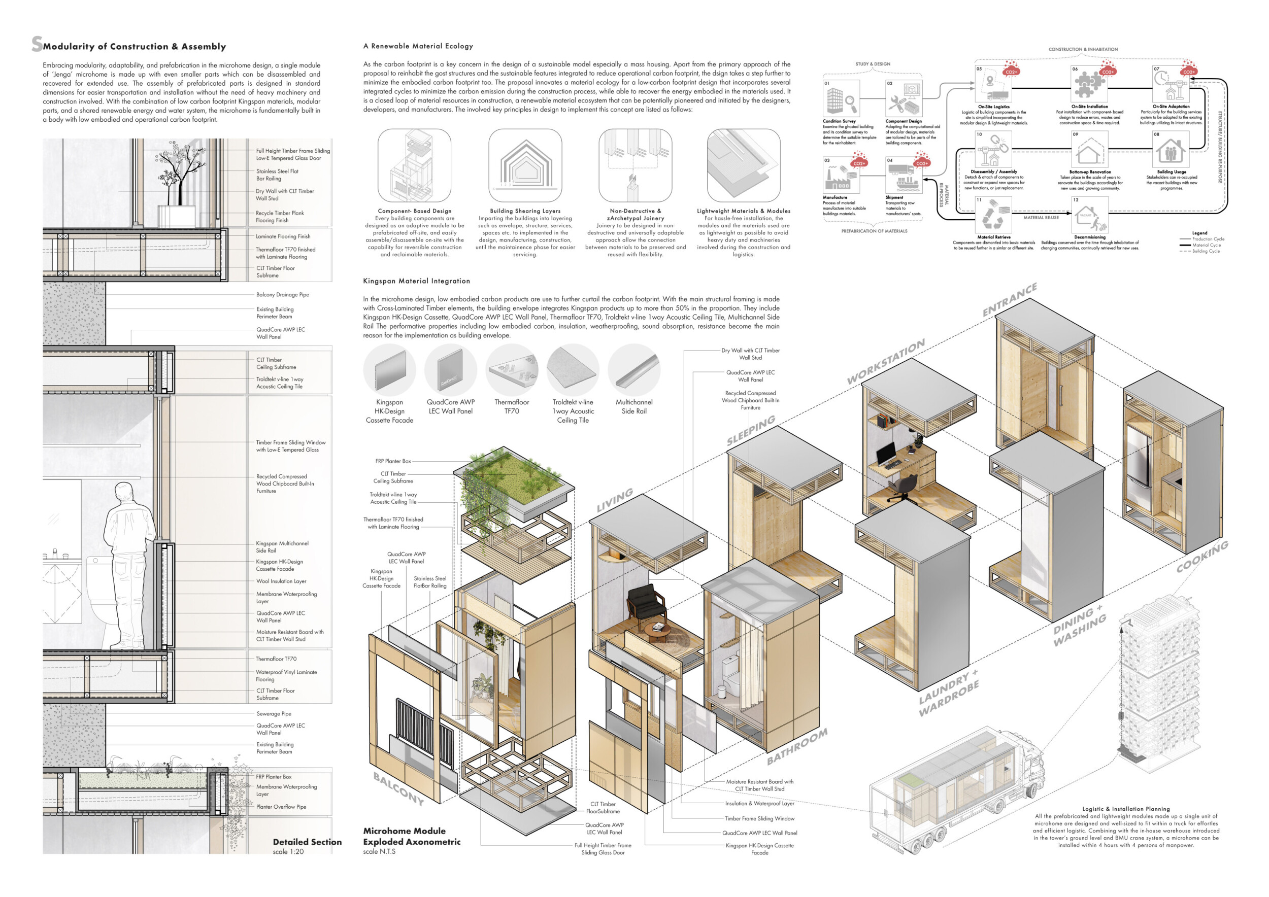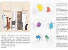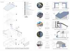 The project presents a highly structured and visually rich composition that clearly communicates the modular housing concept at multiple scales, from unit assembly to full vertical neighborhood transformation. The balance of color is particularly effective, adding vibrancy and legibility to complex diagrams and axonometric views, while the precise linework, especially in section drawings, enhances clarity without overwhelming the reader.