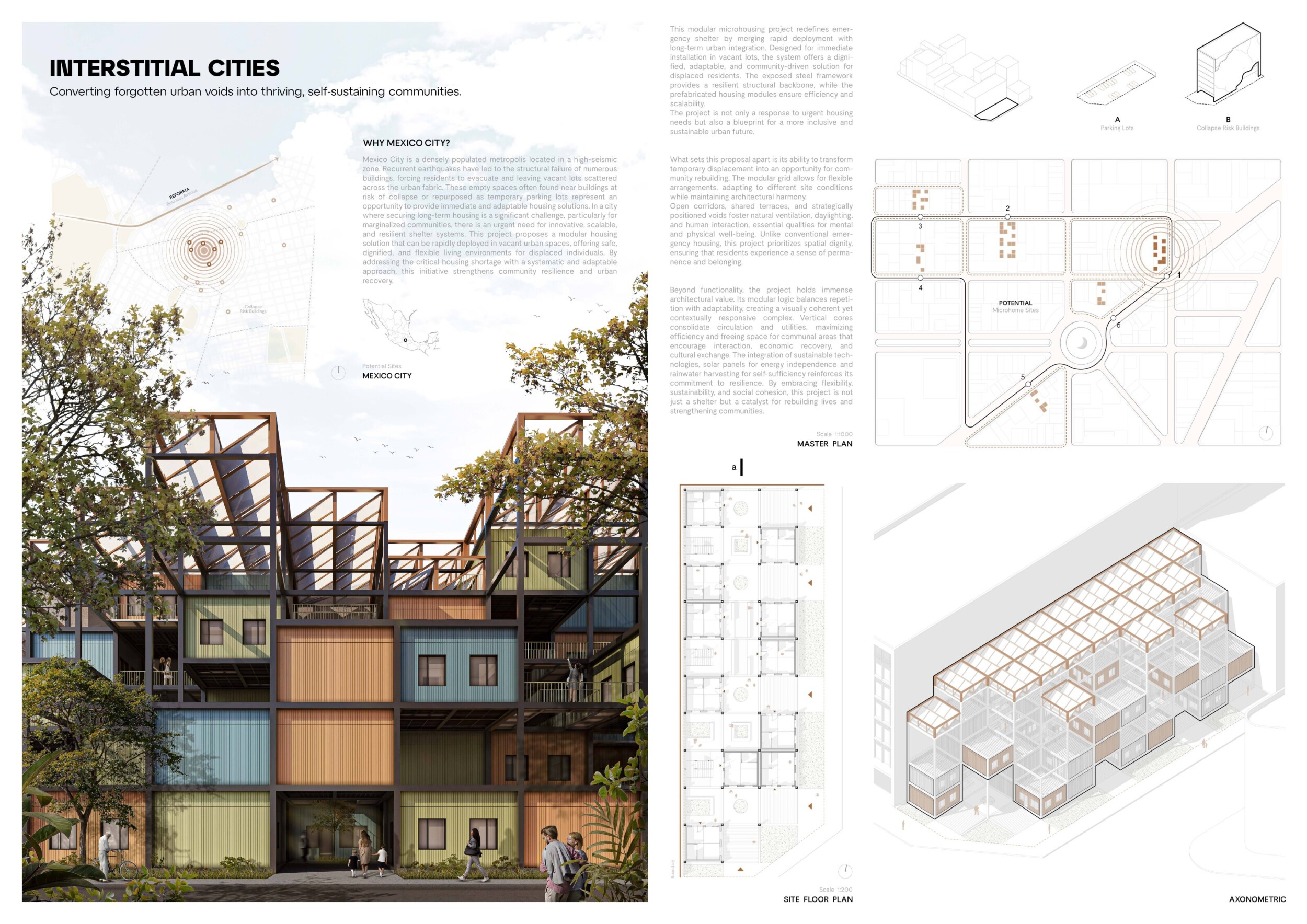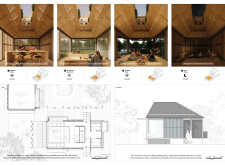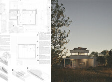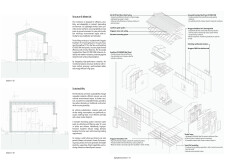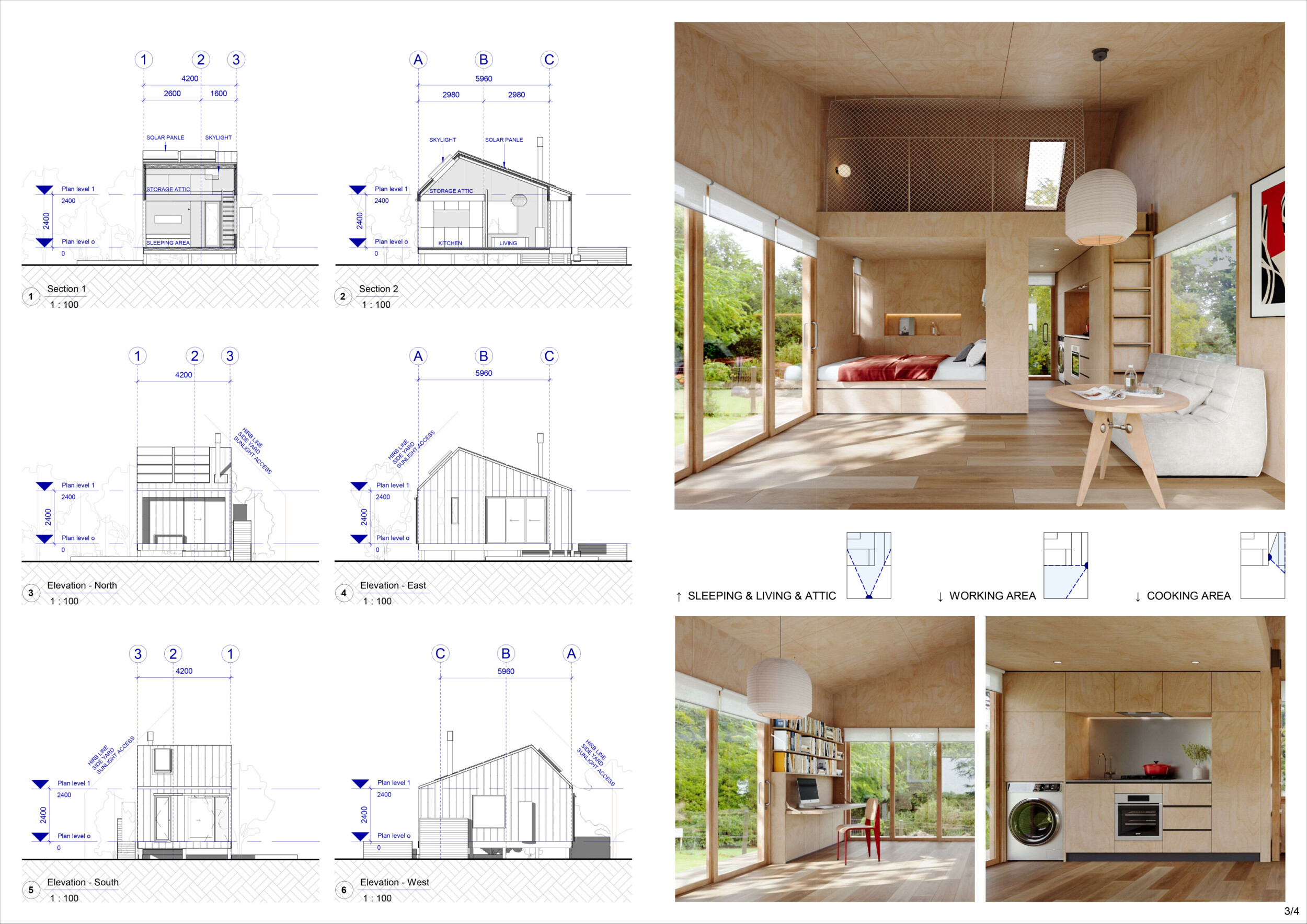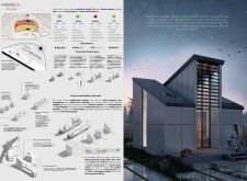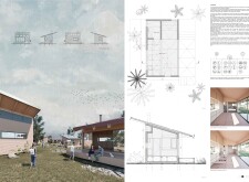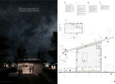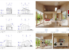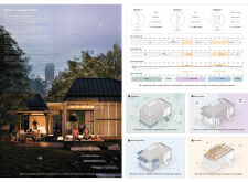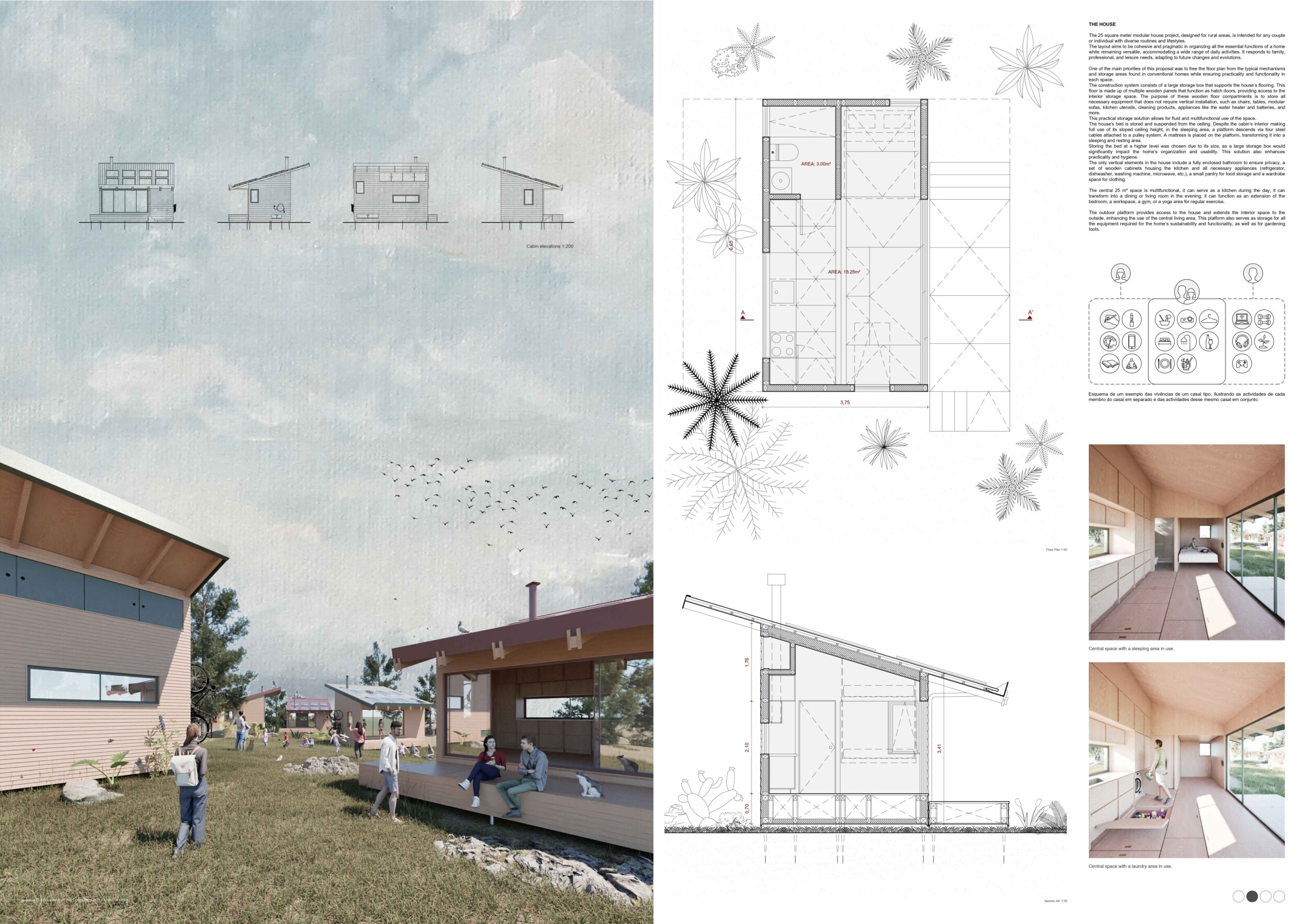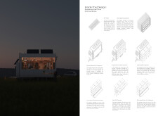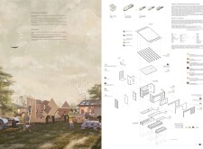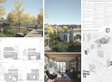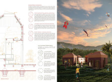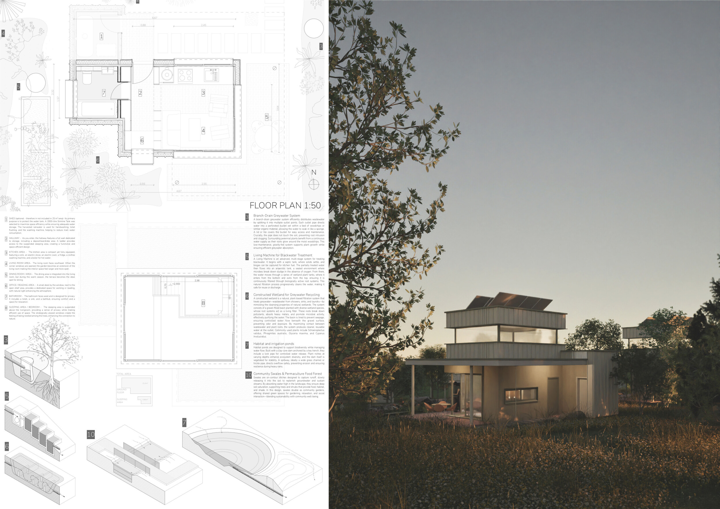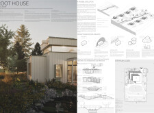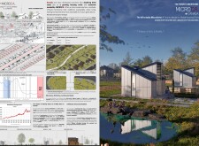 The project's primary image effectively conveys the flood-adapted micro-homes' form, materiality, and environmental response, with atmospheric renderings and aerial perspectives that clearly illustrate the modular planning. Read more The layout is well-organized, balancing technical information with visual storytelling, and the use of subtitles and bolded headers supports easy navigation. Text is generally well-placed, though some blocks could be further condensed. The drawings and diagrams provide a clear sense of scale and construction, while the interior perspectives help communicate the spatial experience. The presentation could be strengthened by including more close-up views of material details or lived activities to better convey the human scale.