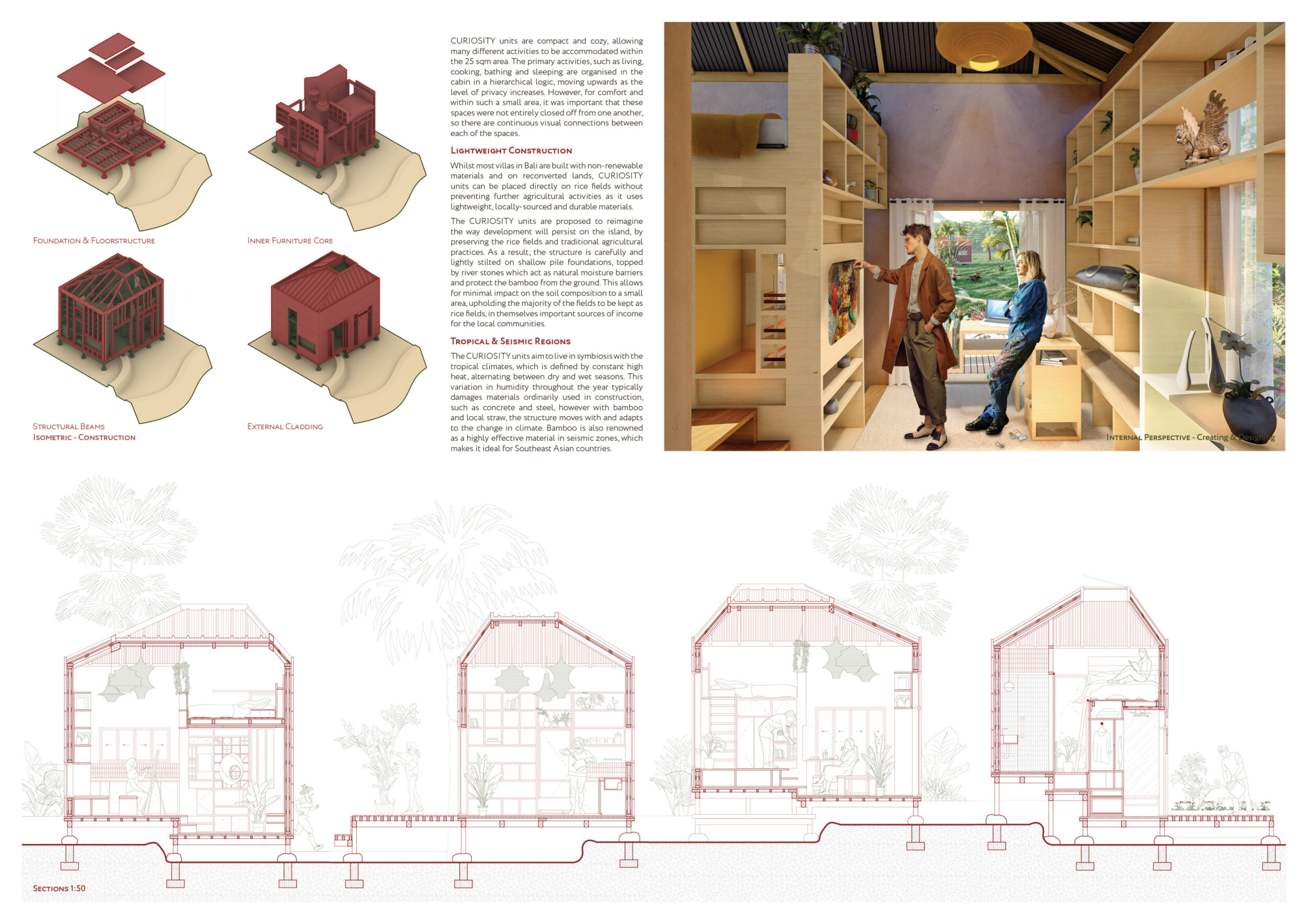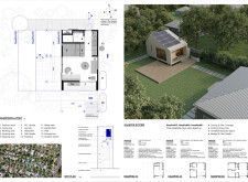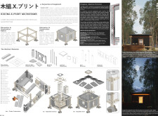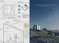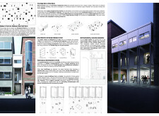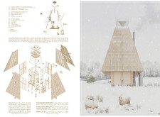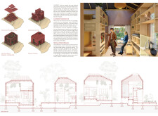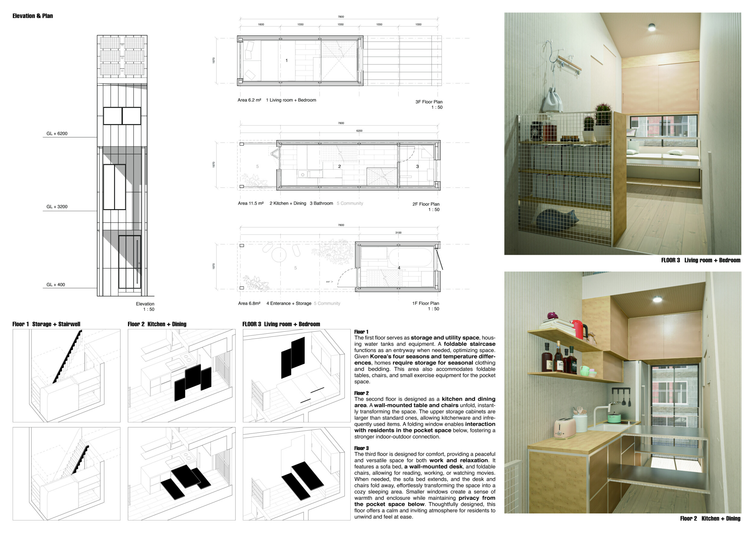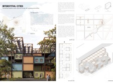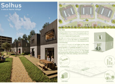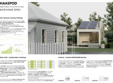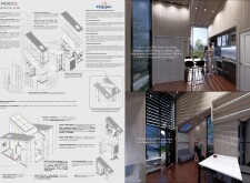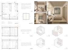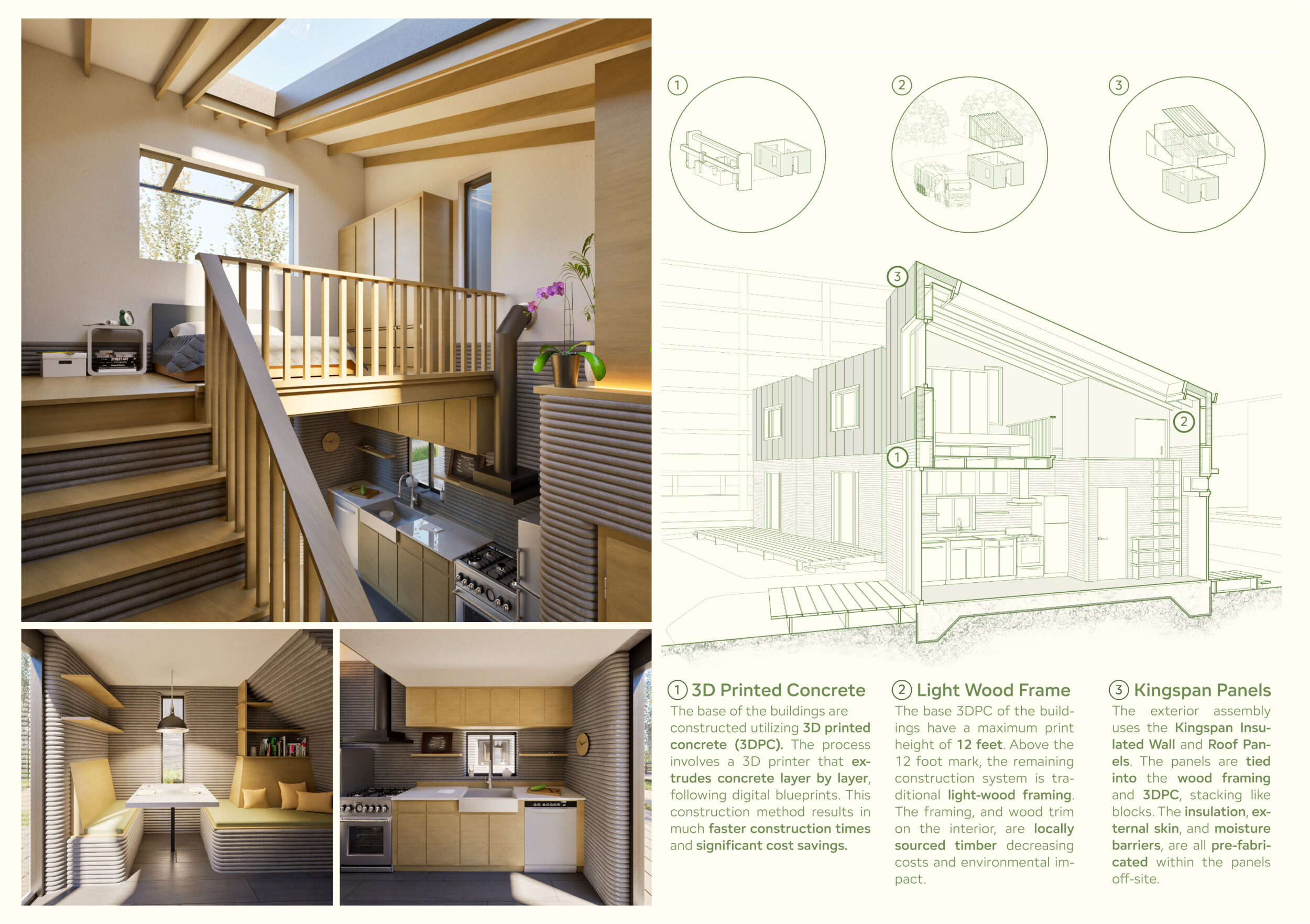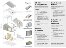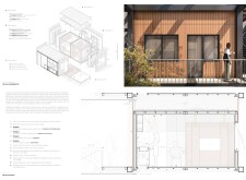 The project's primary image effectively conveys the flood-adapted micro-homes' form, materiality, and environmental response, with atmospheric renderings and aerial perspectives that clearly illustrate the modular planning. Read more The layout is well-organized, balancing technical information with visual storytelling, and the use of subtitles and bolded headers supports easy navigation. Text is generally well-placed, though some blocks could be further condensed. The drawings and diagrams provide a clear sense of scale and construction, while the interior perspectives help communicate the spatial experience. The presentation could be strengthened by including more close-up views of material details or lived activities to better convey the human scale.
