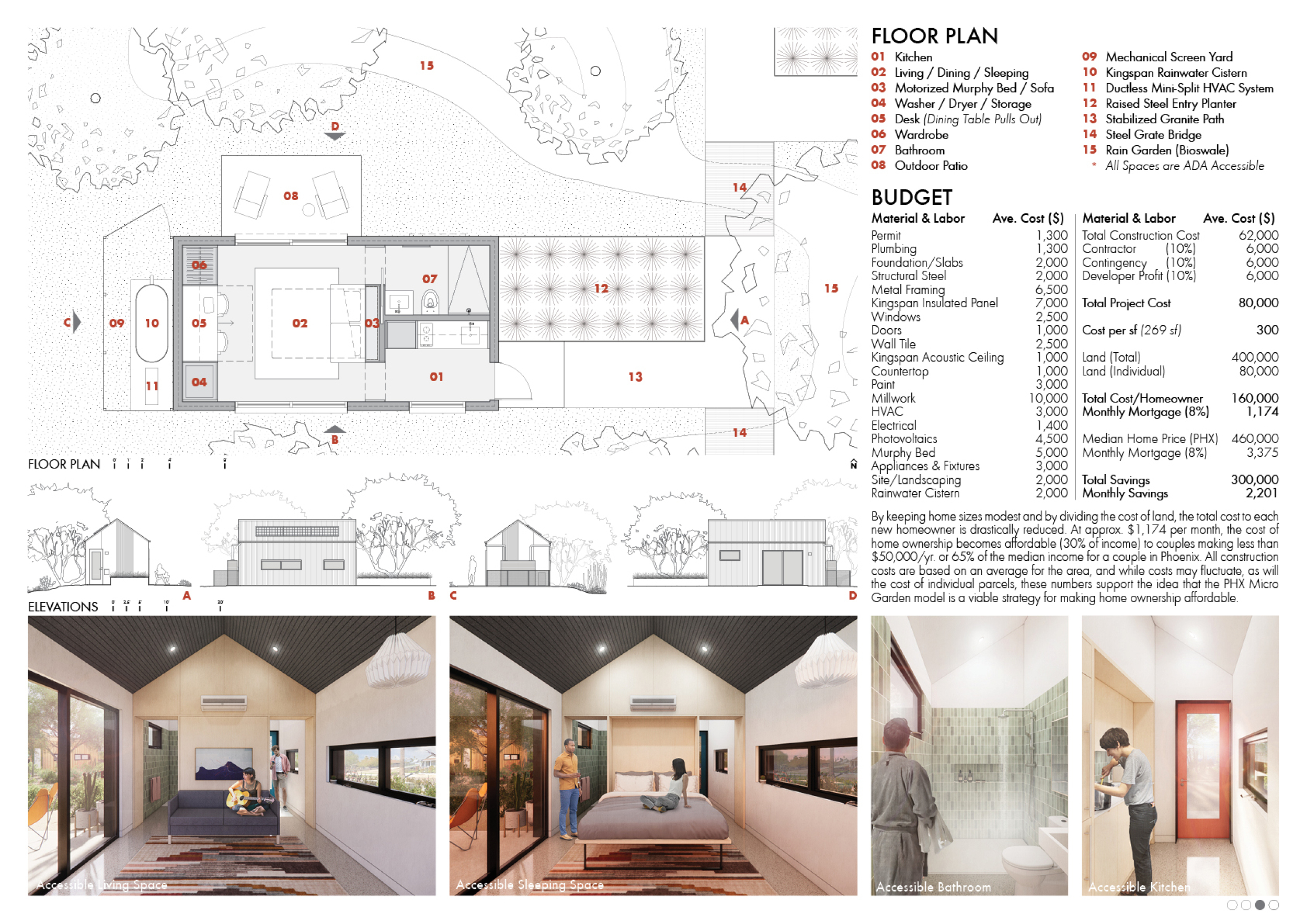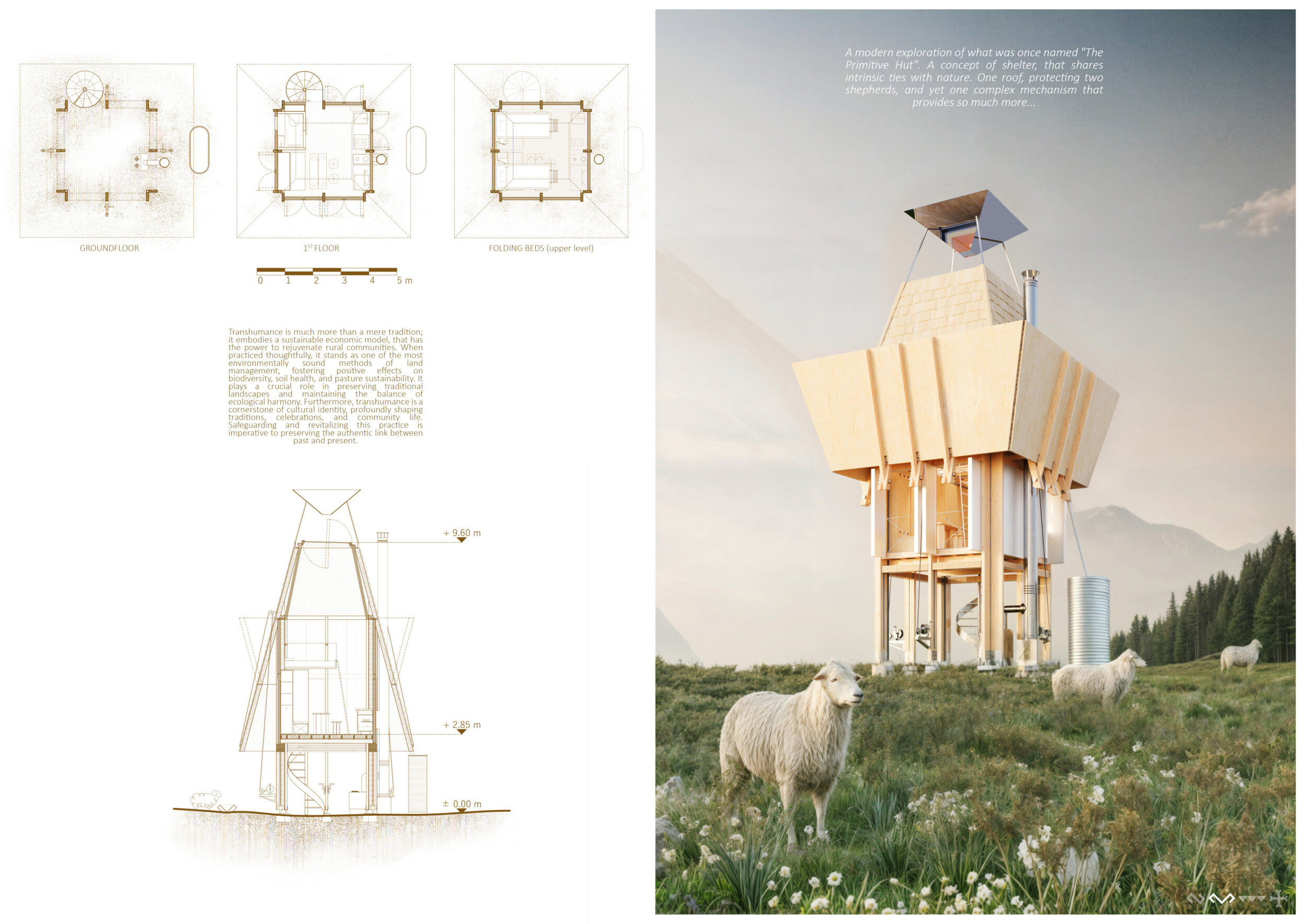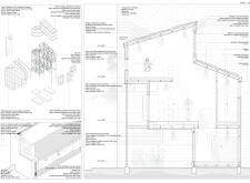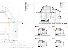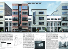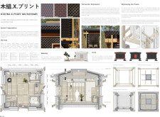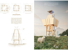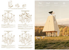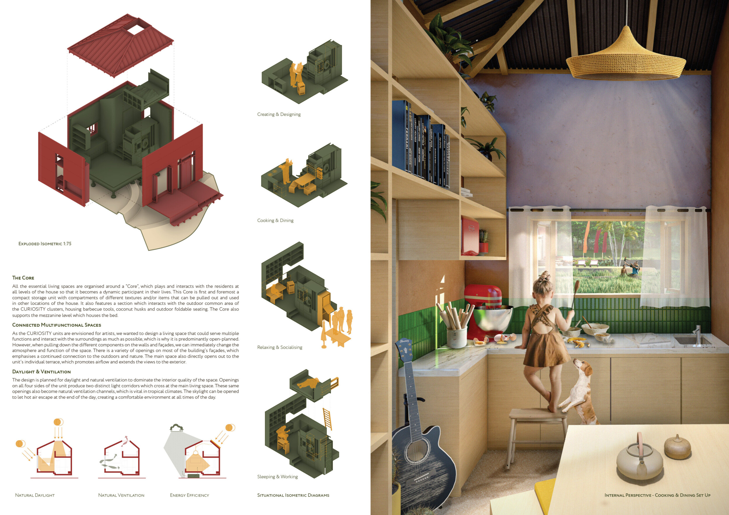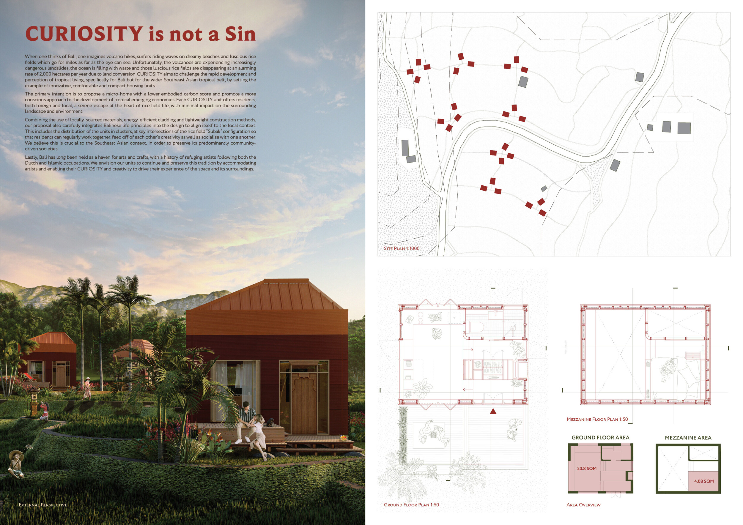 The project's primary image effectively conveys the flood-adapted micro-homes' form, materiality, and environmental response, with atmospheric renderings and aerial perspectives that clearly illustrate the modular planning. Read more The layout is well-organized, balancing technical information with visual storytelling, and the use of subtitles and bolded headers supports easy navigation. Text is generally well-placed, though some blocks could be further condensed. The drawings and diagrams provide a clear sense of scale and construction, while the interior perspectives help communicate the spatial experience. The presentation could be strengthened by including more close-up views of material details or lived activities to better convey the human scale.