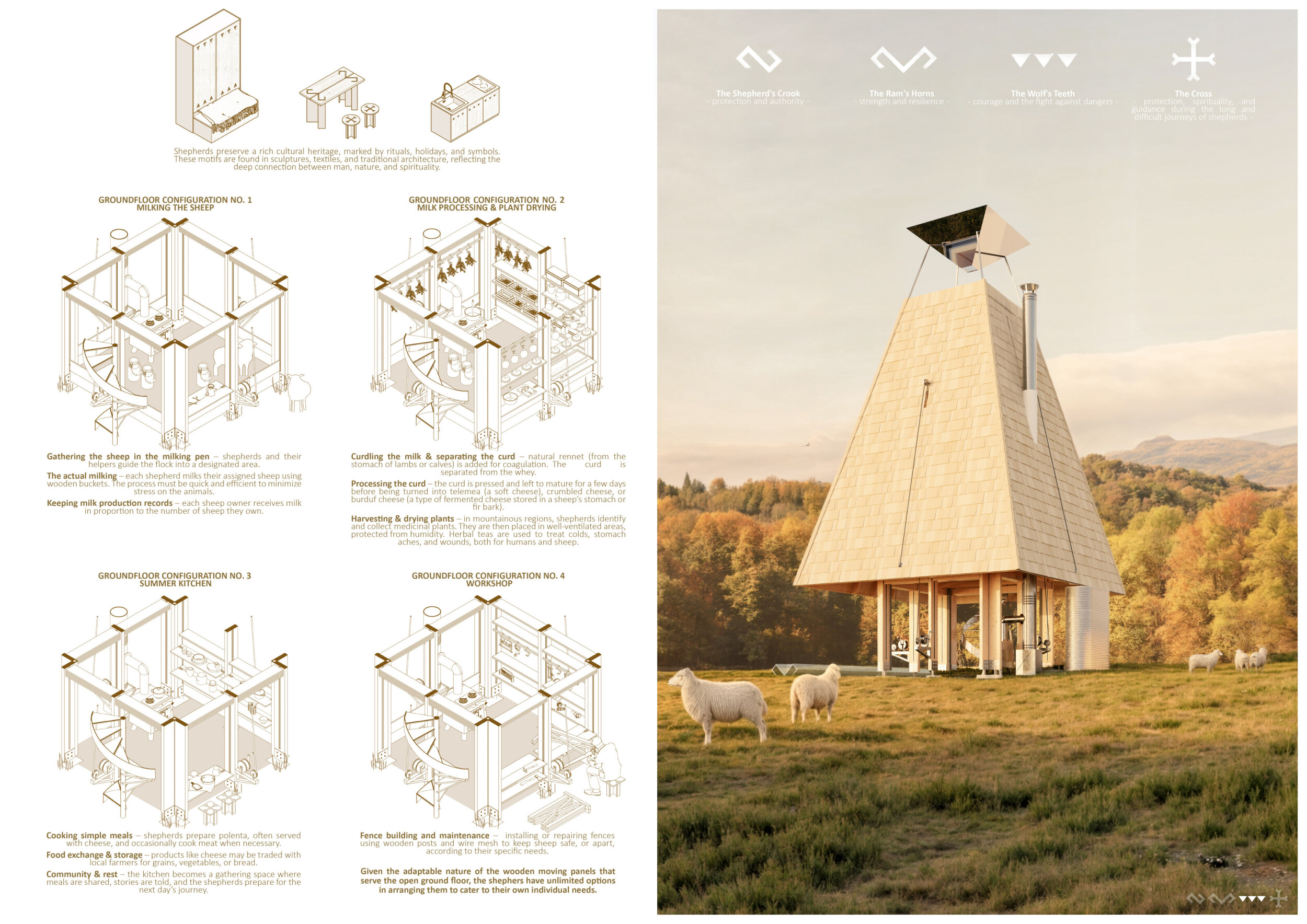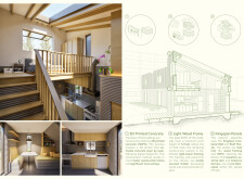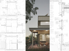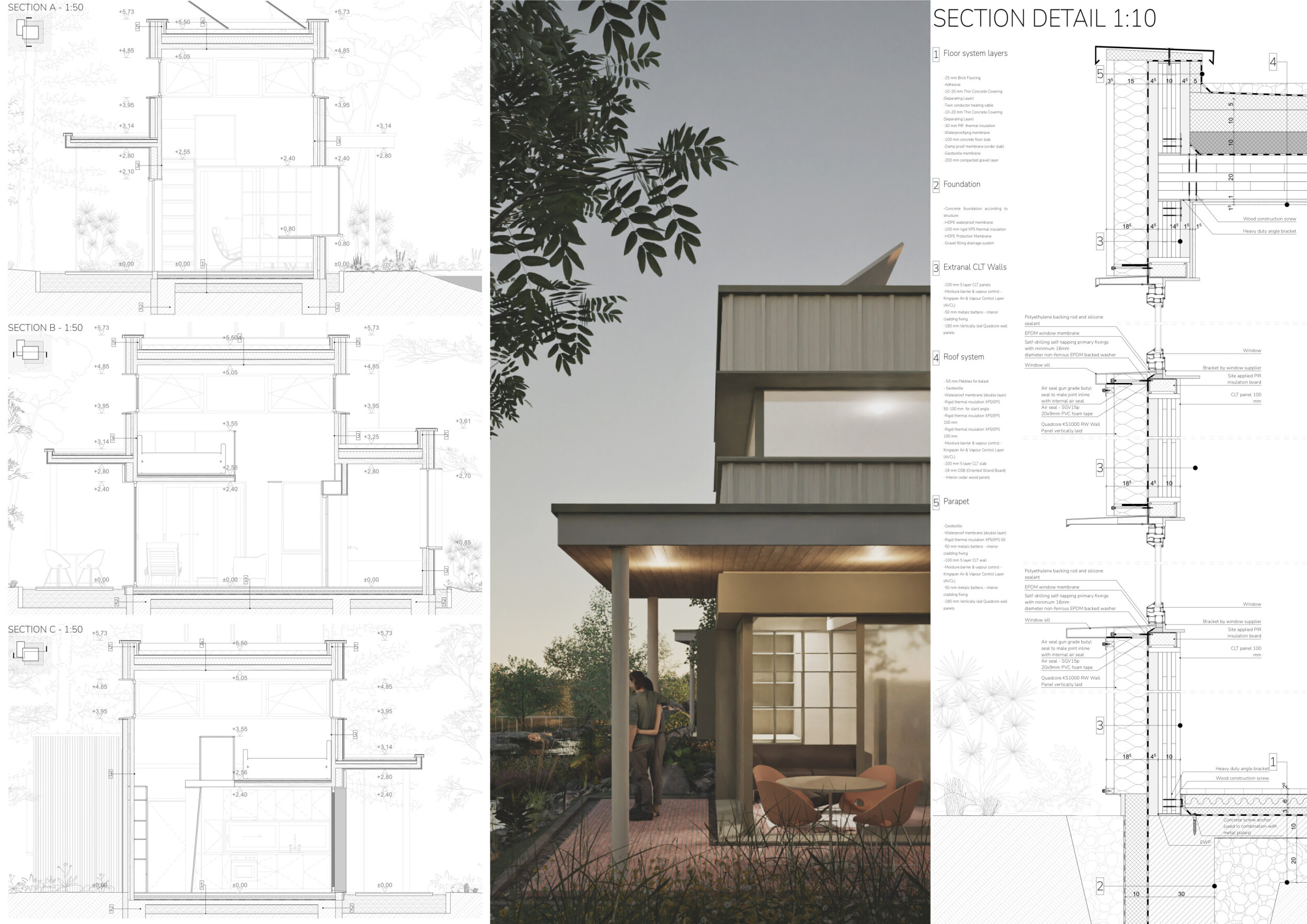 The project achieves a cohesive and visually compelling presentation, with high-quality drawings, refined linework, and a rich balance of color that supports both technical and atmospheric storytelling. The layout is carefully structured, guiding the viewer through construction, habitation, and broader landscape integration without losing clarity or rhythm.