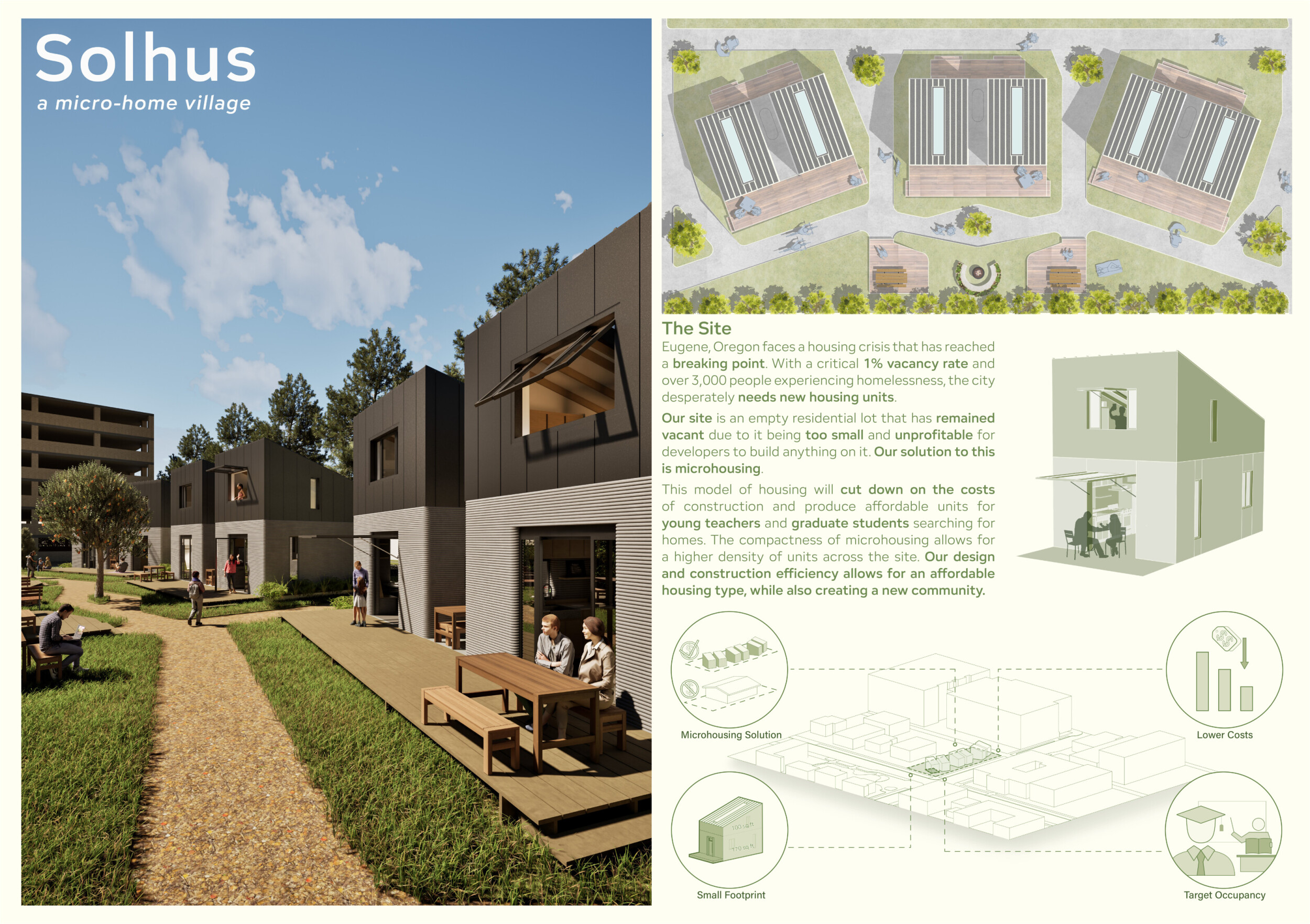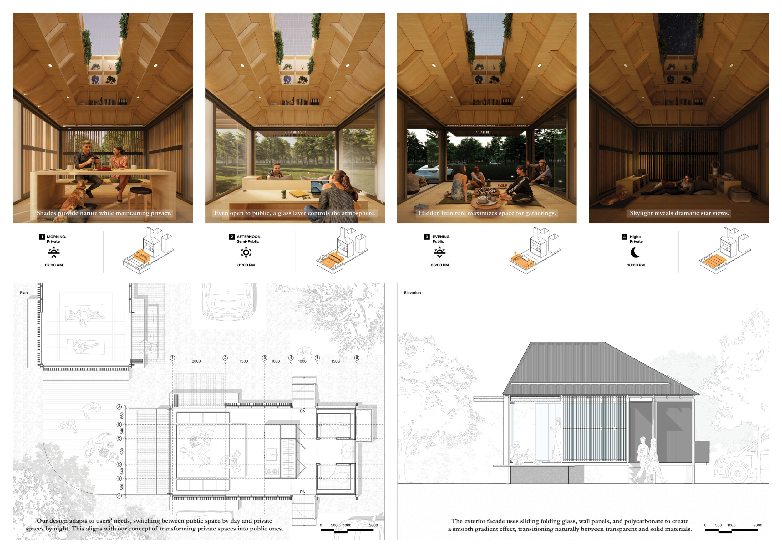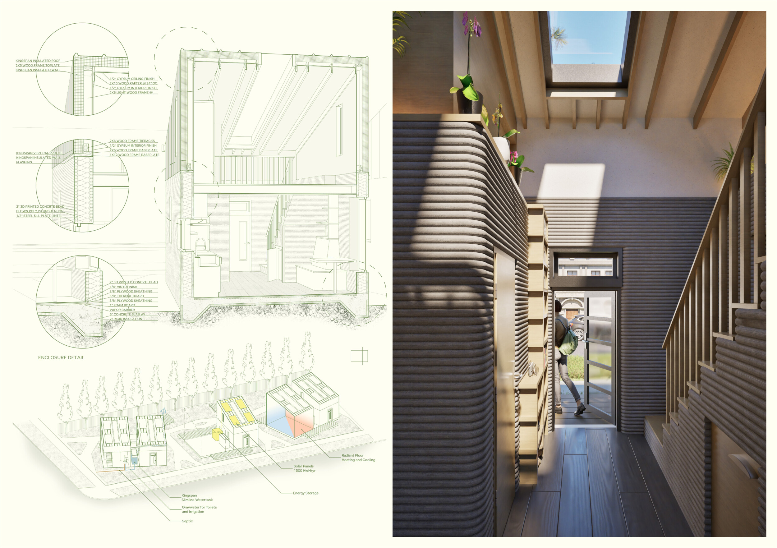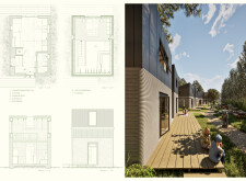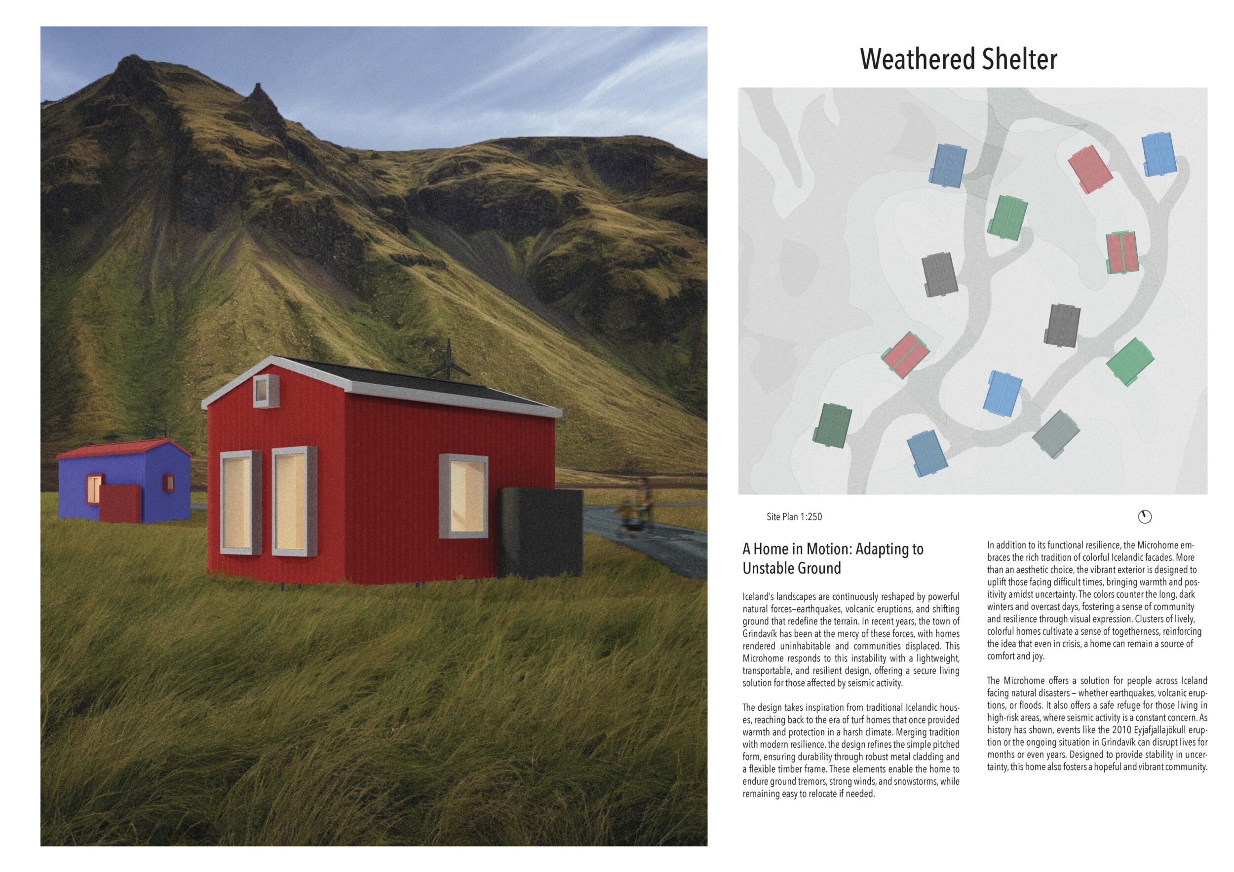 This project addresses wildfire recovery by combining off-grid sustainability strategies with modular construction and passive house principles. Built from cross-laminated timber with charred wood cladding for fire resistance, the design integrates water harvesting, solar energy systems, and biogenic septic treatment. Flexible shutter elements extend living spaces outdoors, while maintaining resilience against environmental risks.