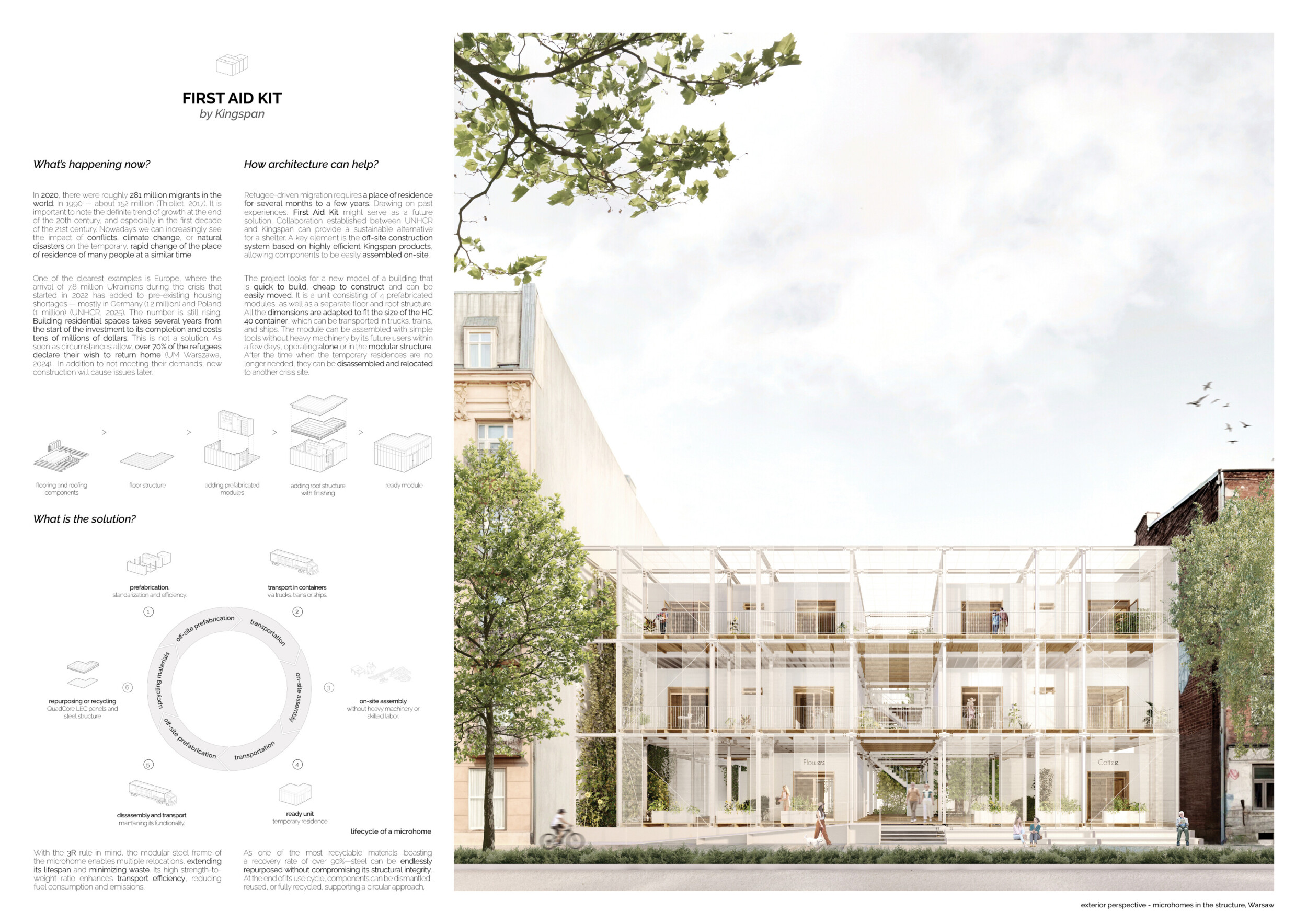 First Aid Kit is a modular microhome system designed for rapid deployment in response to displacement crises. Based on prefabrication and passive house principles, the system adapts to varied climates through adjustable construction elements such as wall thickness and shading devices. Units can operate independently or aggregate into larger structures around communal spaces, supporting long-term integration and social resilience.