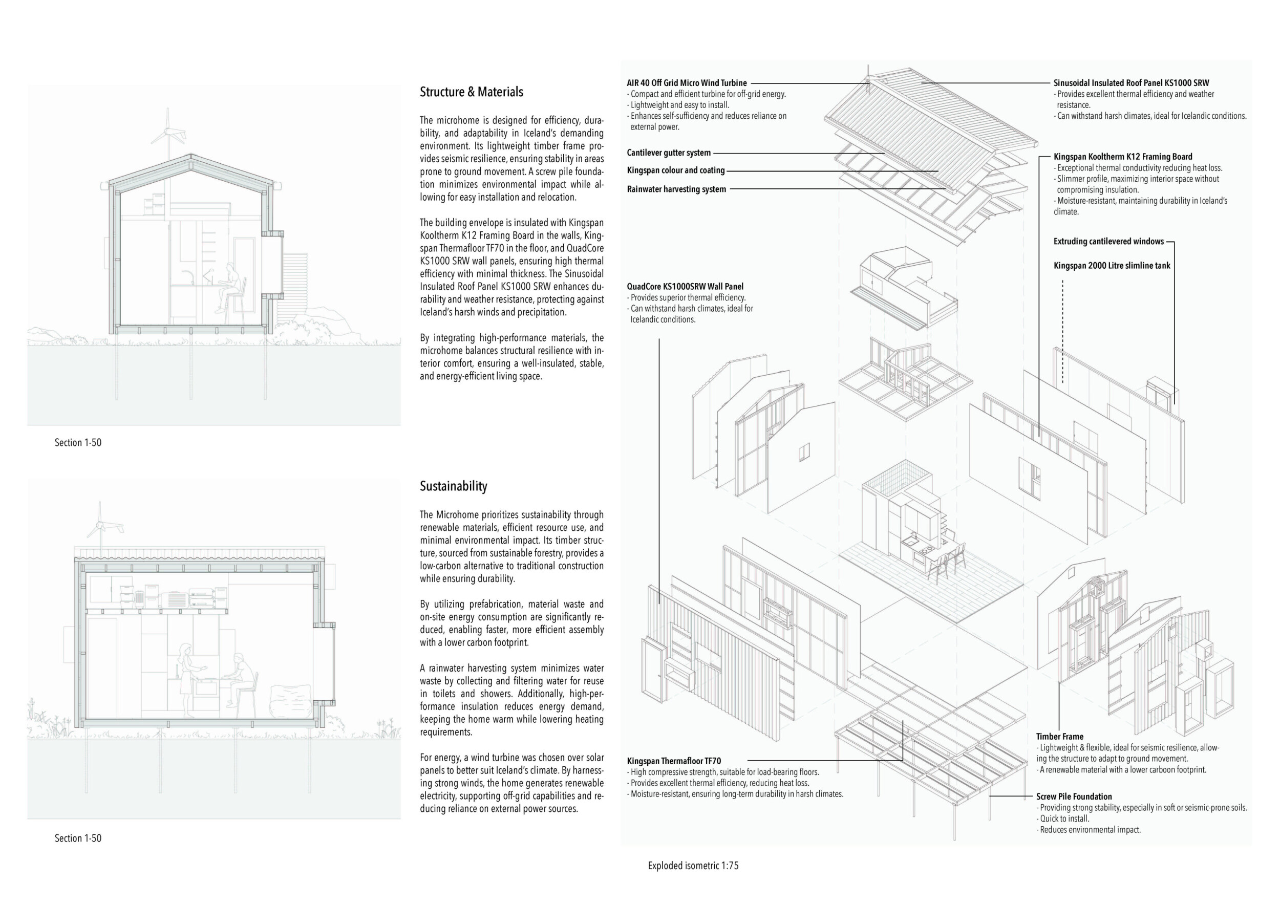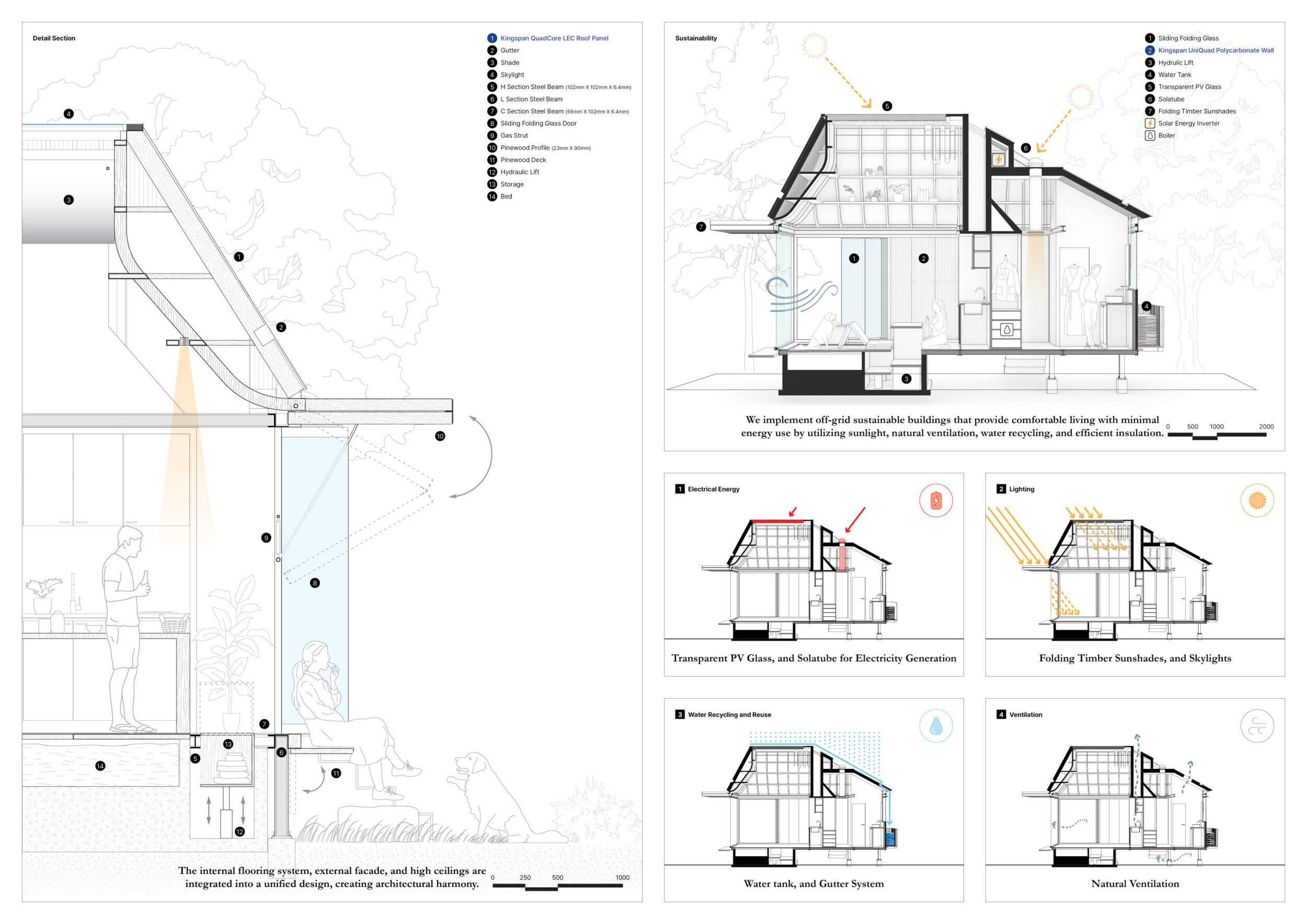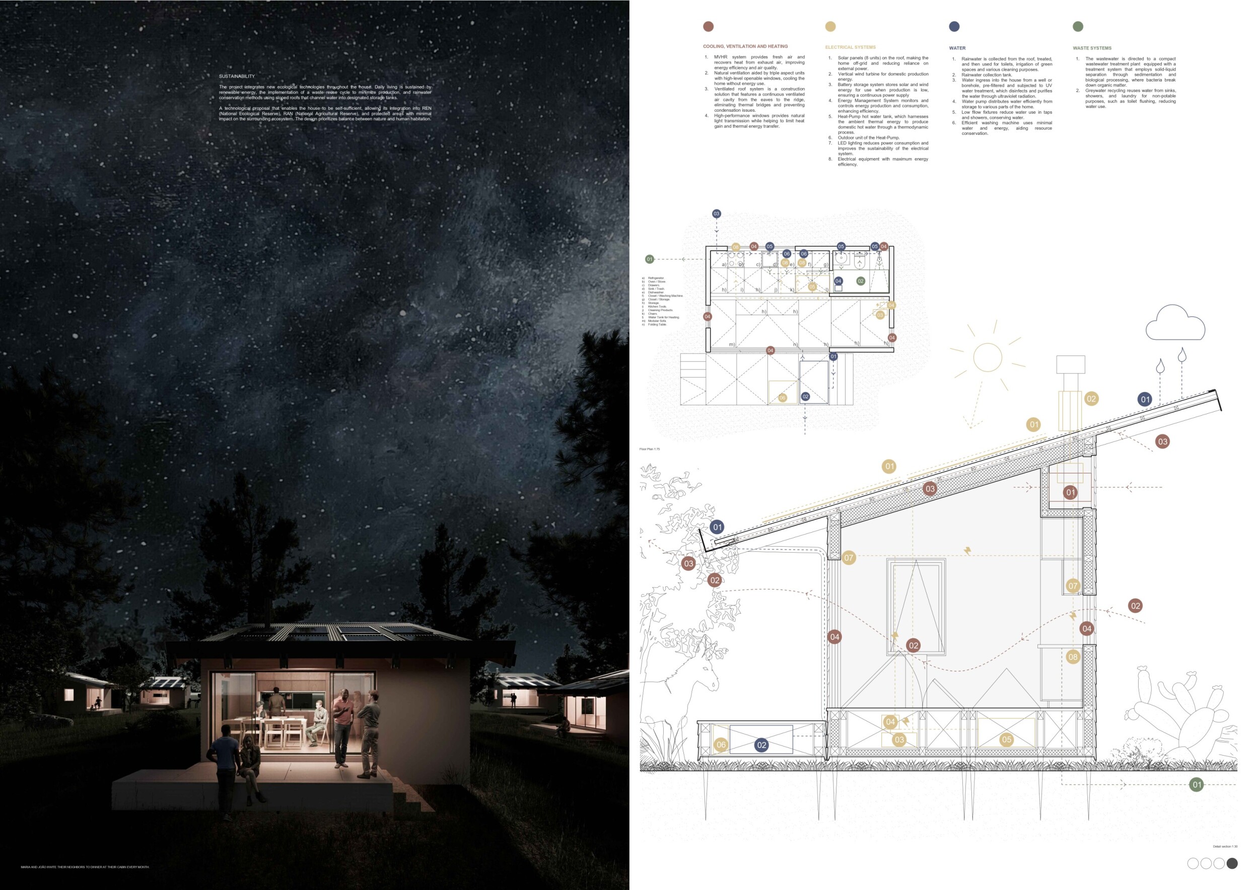 Strong technical diagrams and environmental performance data clearly explain the self-sufficiency strategy, though varied lineweights could enhance visual clarity. The plans and sections are well-drawn, but rendered views would benefit from more direct annotation to connect visuals with design intentions. The first sheet’s dense text overlay weakens readability and would be stronger with more hierarchy and conciseness.