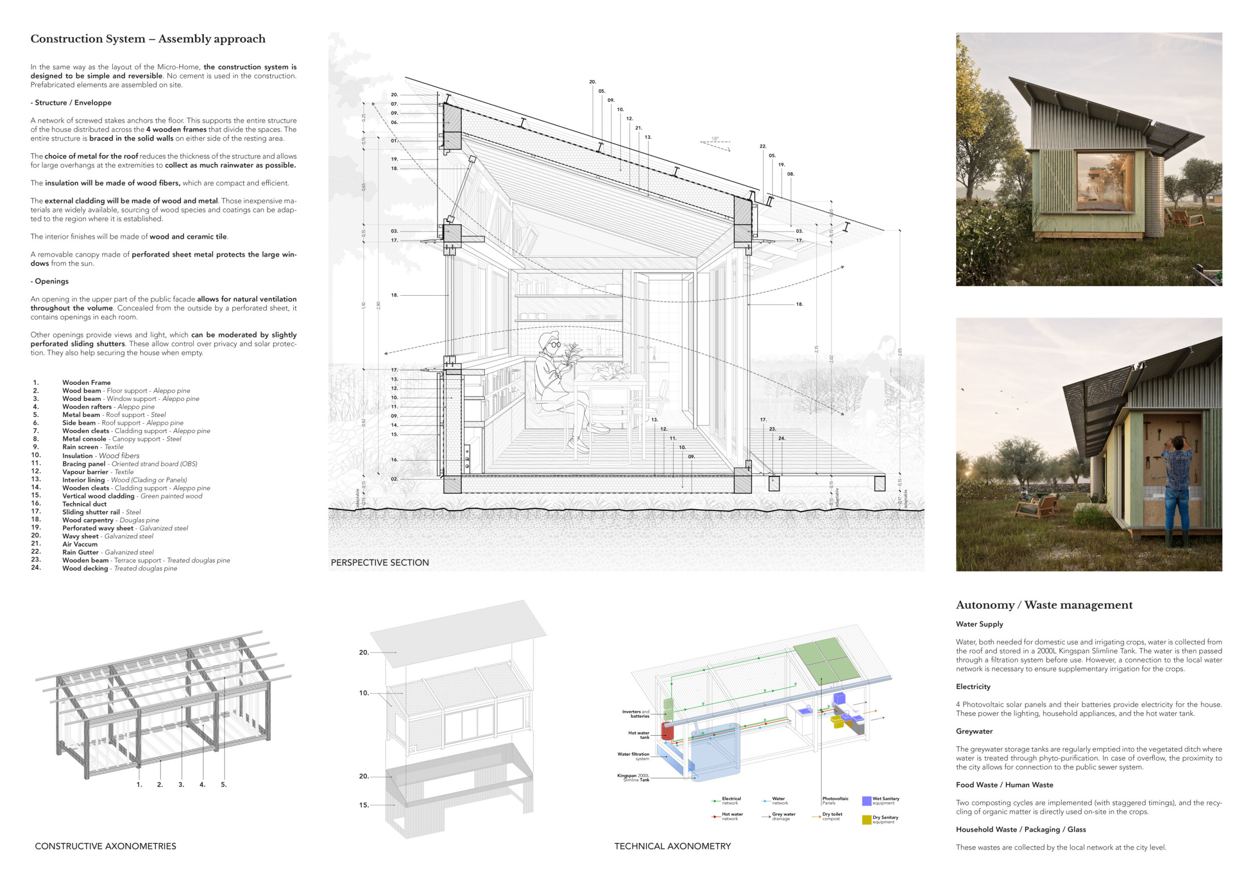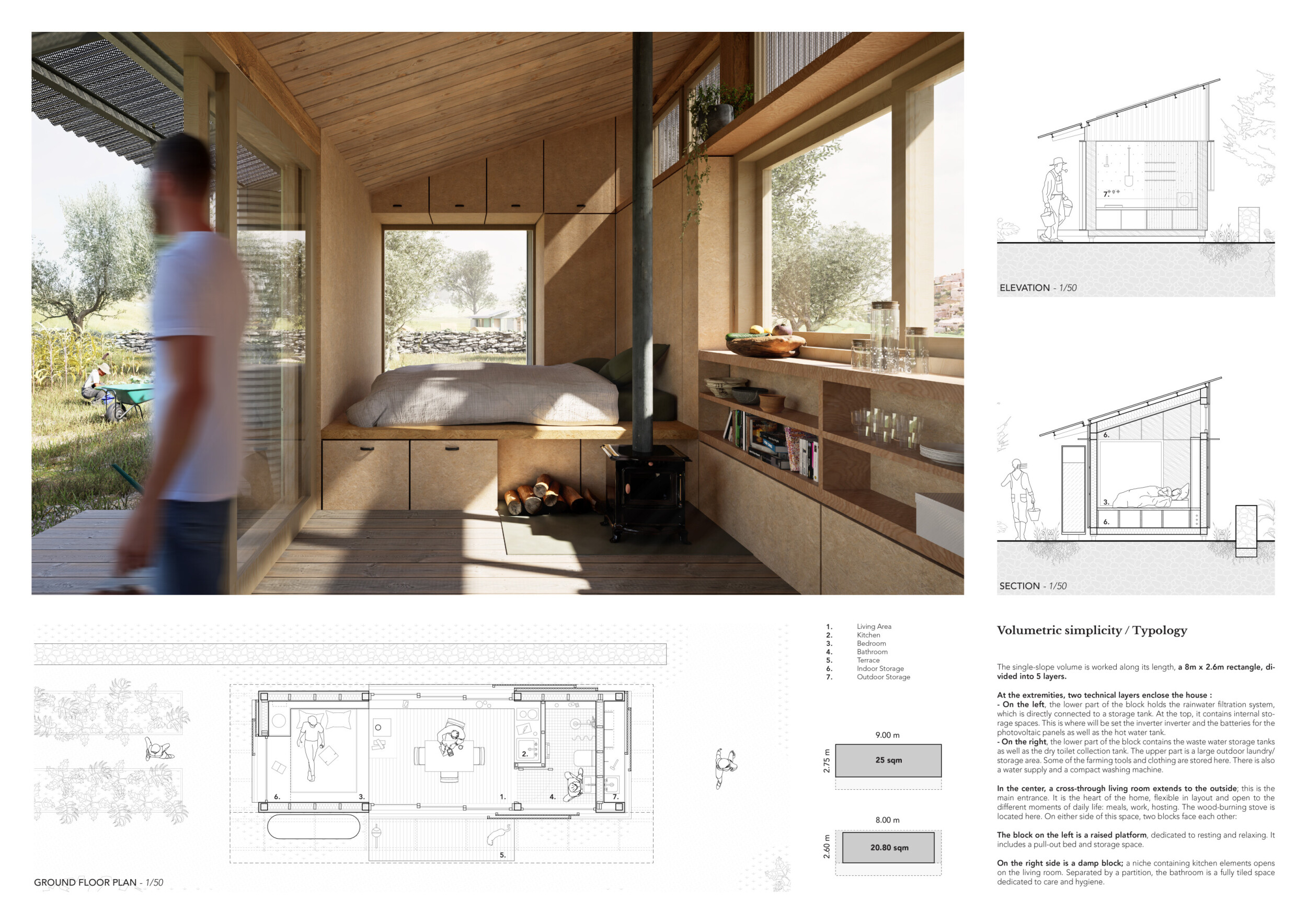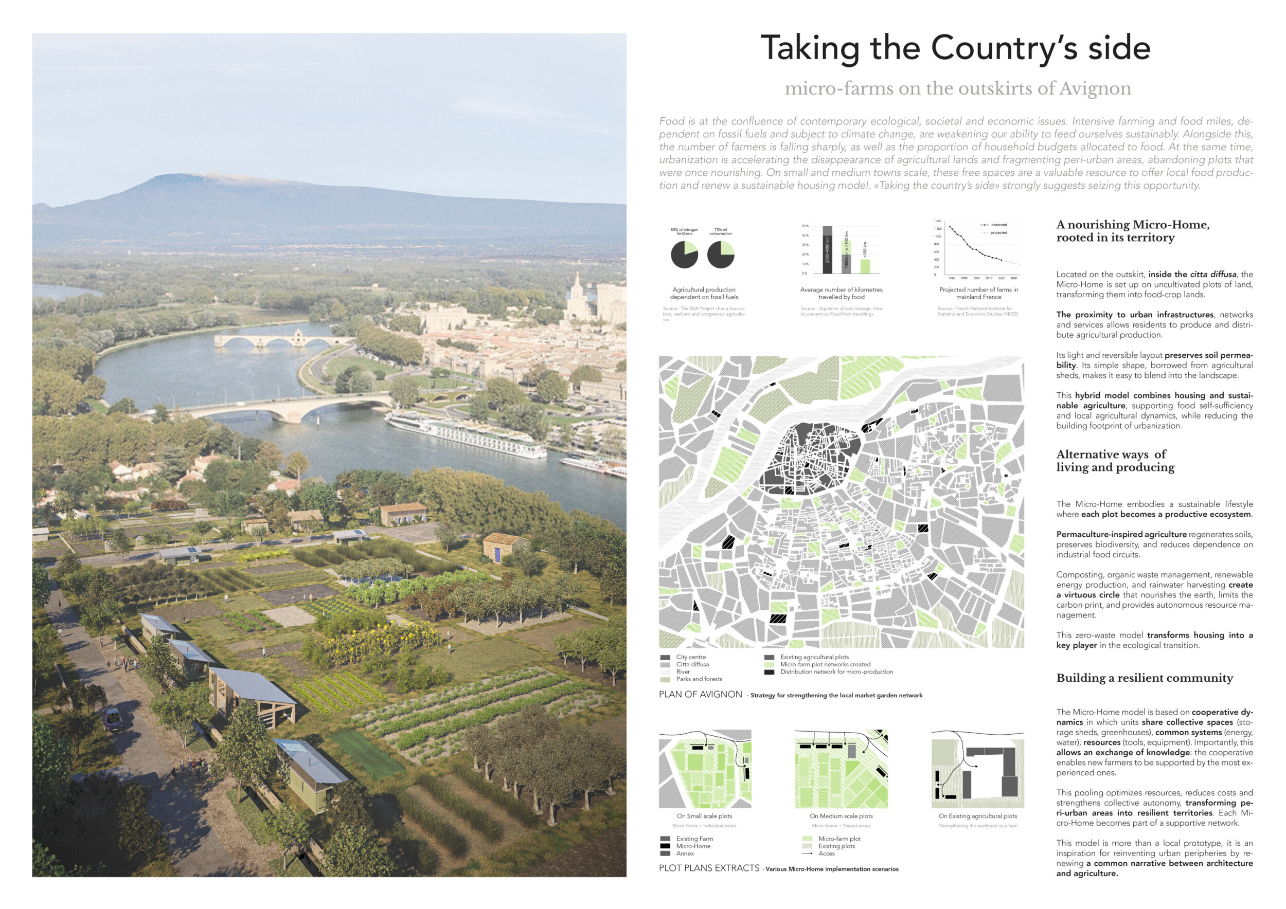 This project proposes small-scale housing integrated with agricultural production on the outskirts of Avignon. Prefabricated units constructed with lightweight timber frames and no cement are assembled on-site, incorporating autonomous systems for water collection, greywater treatment, solar energy, and composting.