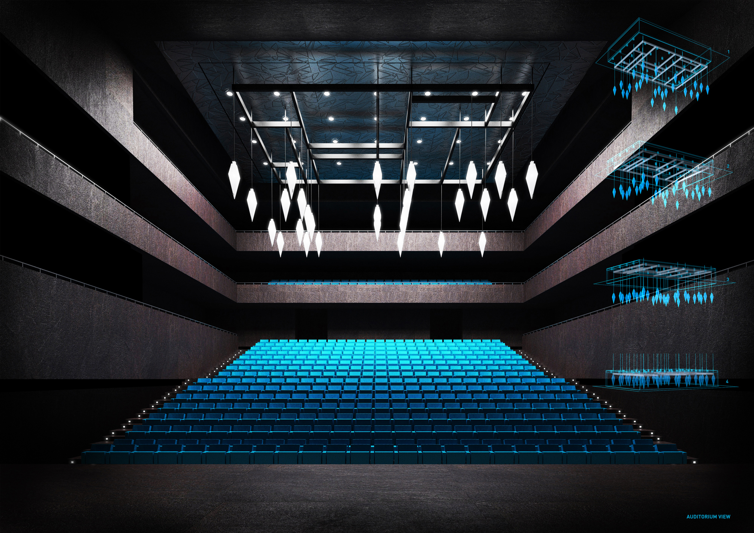 The first place entry for the Kip Island Auditorium was chosen for its proposal to completely entangle city and stage, creating a performance space radically deconstructing the separation between proscenium and audience. The project centerpiece is an elevated theatre space, cantilevered as a truss over the site, creating an iconic figure in the city.