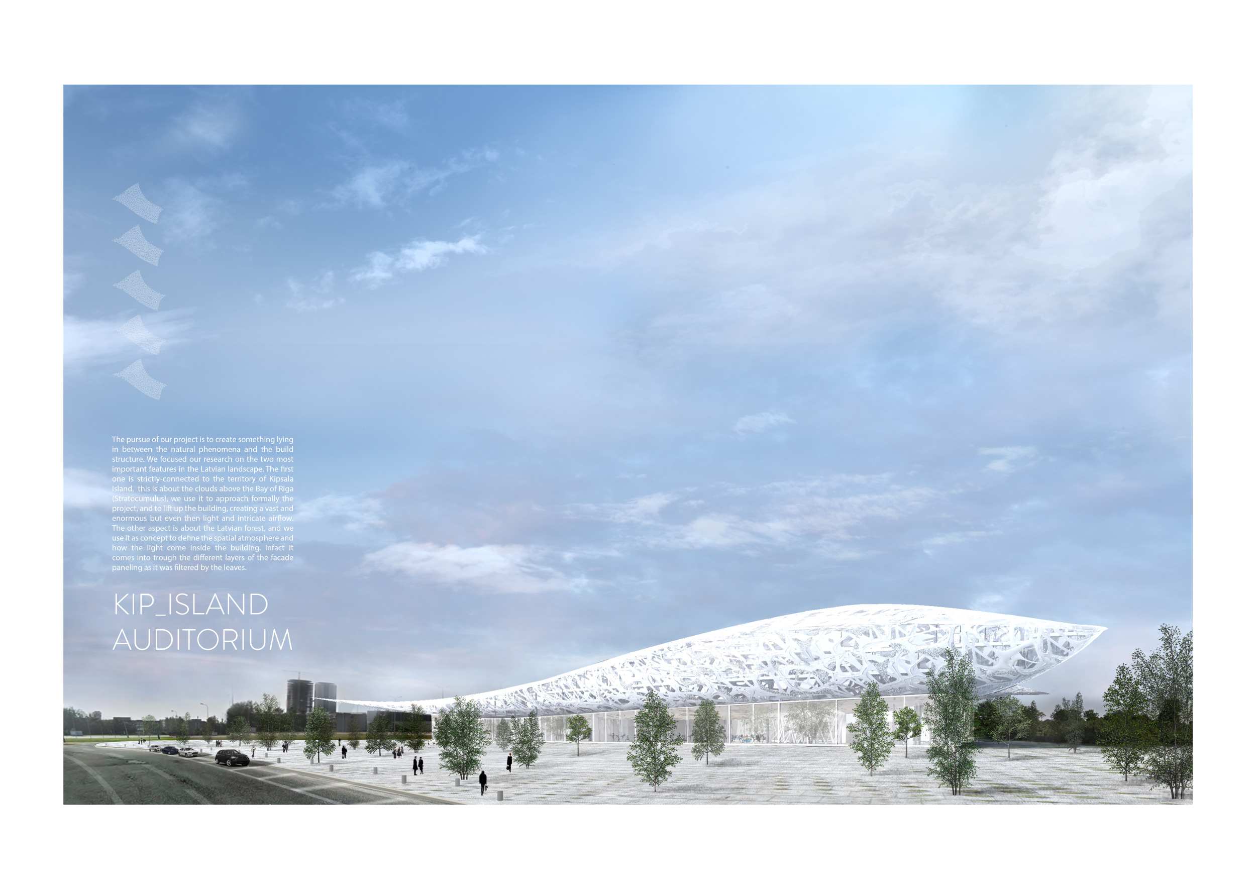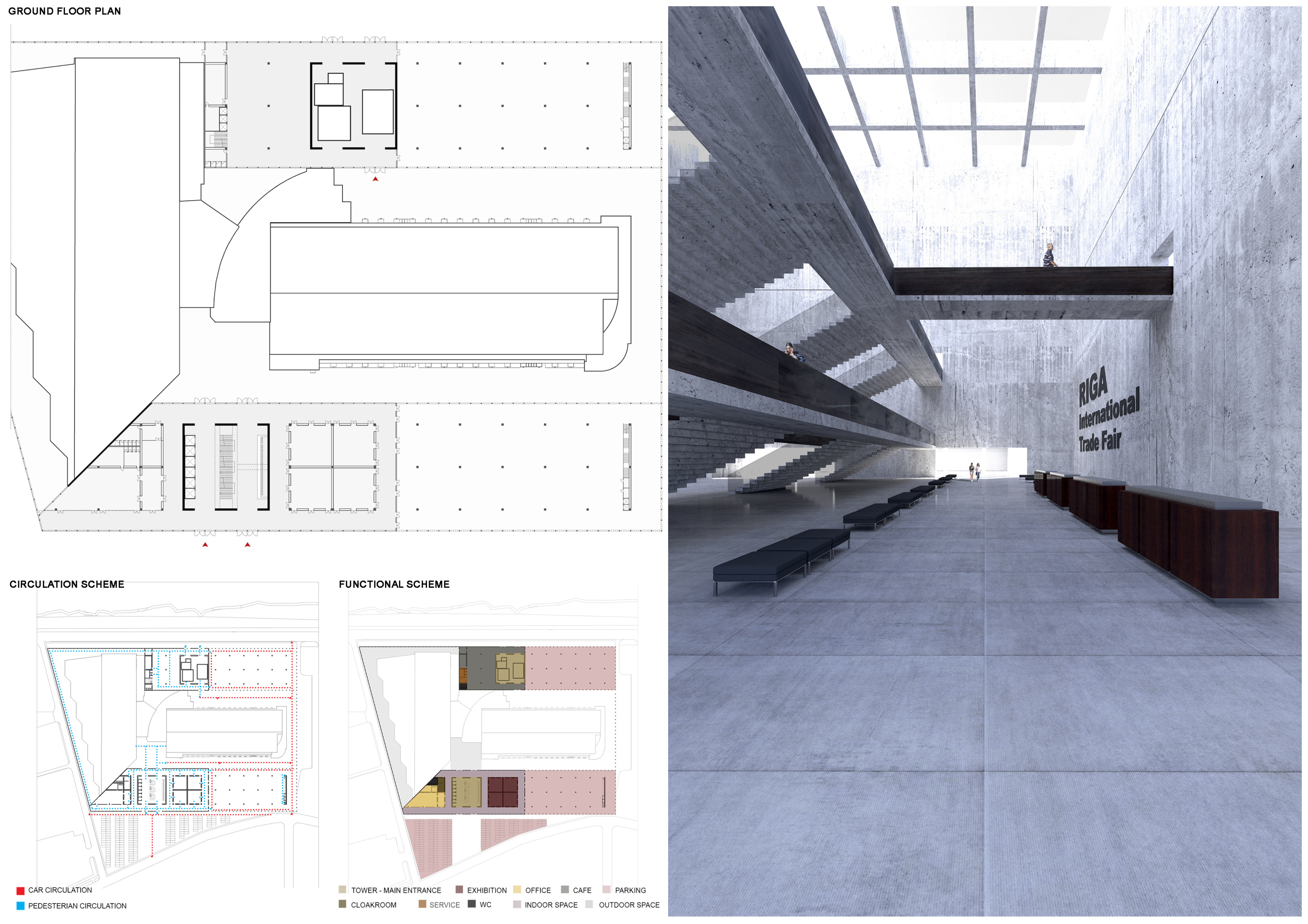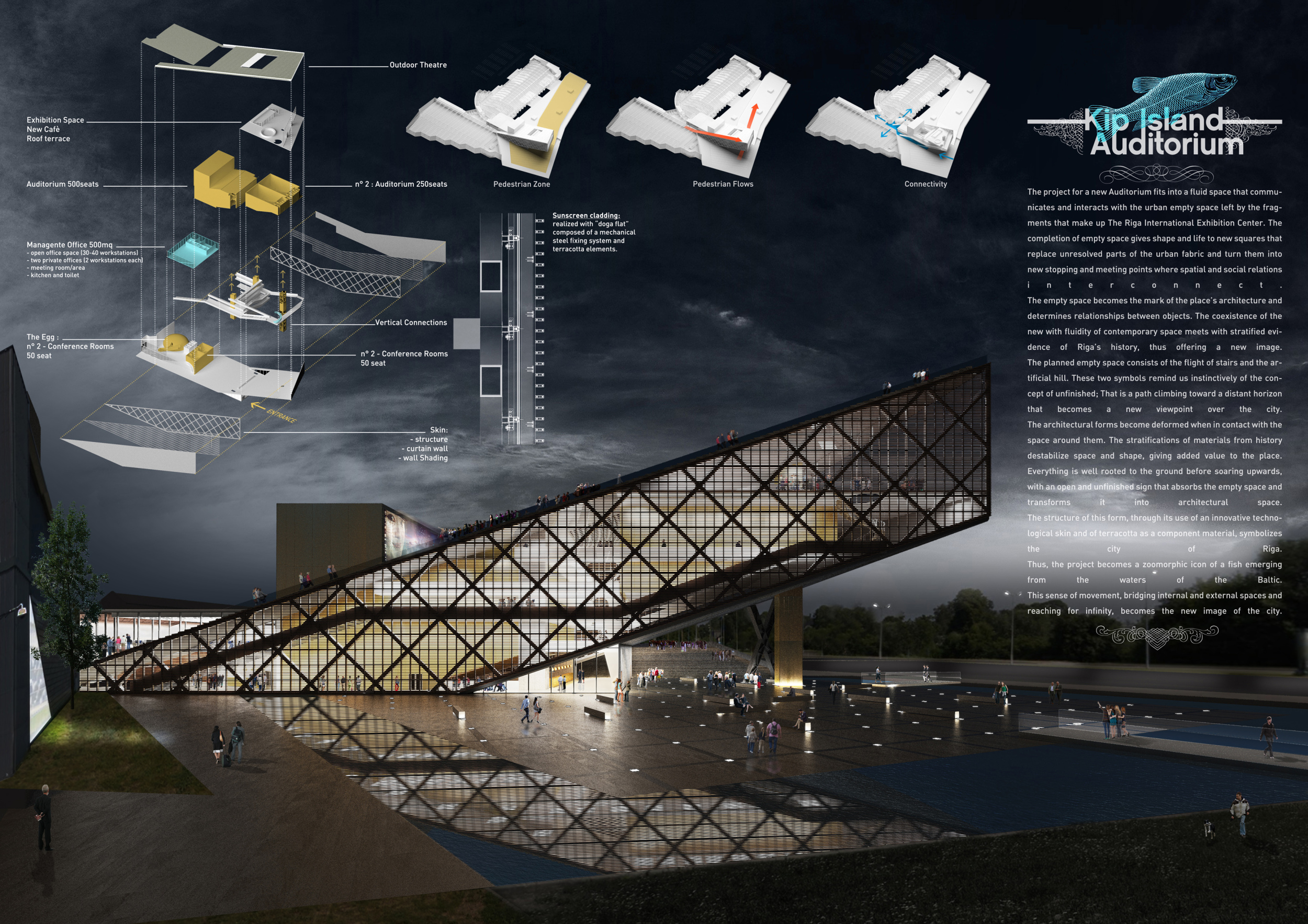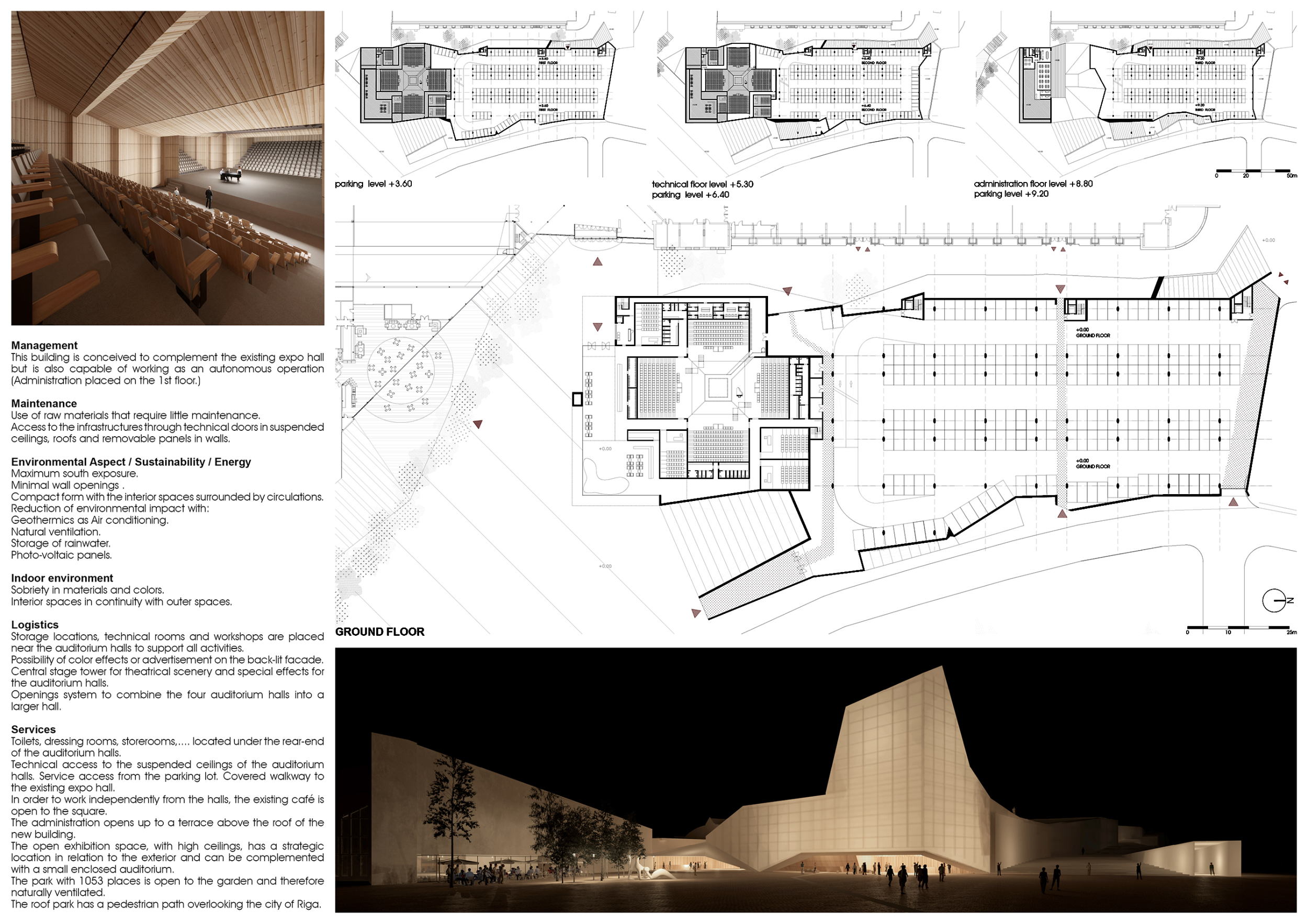 The competition for an auditorium at the Riga International Convention Centre invites critical consideration of an all too often neglected urban function. The importance of this competition arises from its social and cultural circumstance: a reappraisal of the convention center, a somewhat problematic though ubiquitous paradigm in its current form, besmirching the fabric of many contemporary cities.