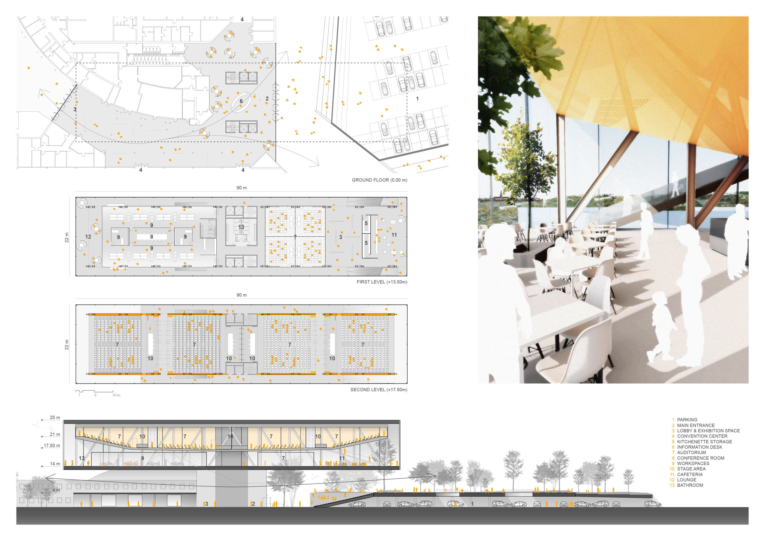 The strength of the third place entry arises from its urban engagement and social inclusion. The project takes a stance on the nature of large exhibition centers, making a case for the public. Expo and convention center typologies, due to their scale often create a barrier within the city, isolating the pedestrian rather than including.