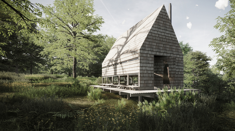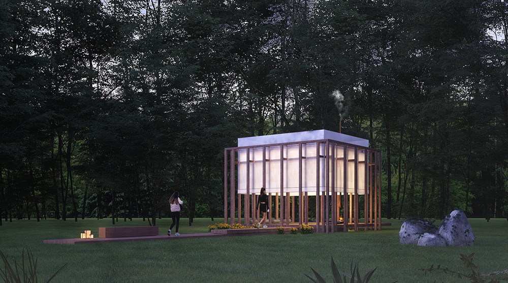 Second prize winner Mat Winter from Canada designed a ‘Meditation House’ with a small-footprint volume, clad in frosted glass panels to let in light yet blur visibility, casting shadows in both directions. Lukáš Valenčinm and Zuzana Capková from Slovakia took third prize for their ‘Tiny Kiwi Meditation Cabin’ which has a homogenous and simple form with clean lines defined by rows of windows low to the floor, offering clear visibility of nature.