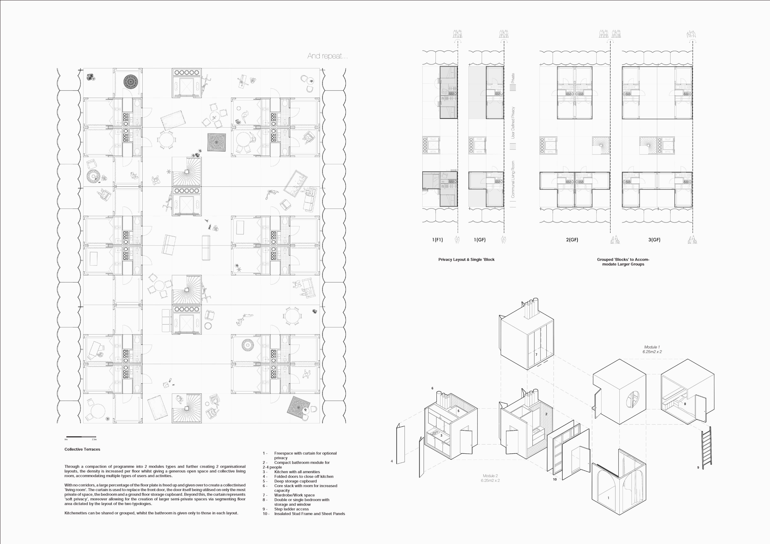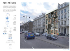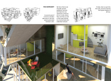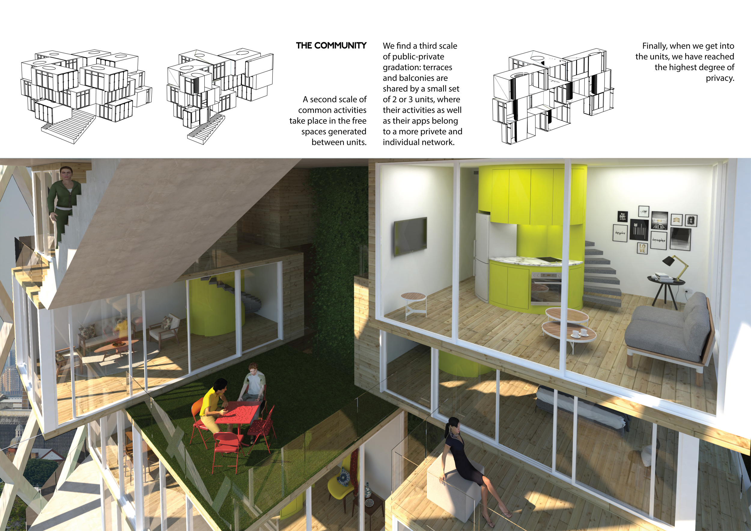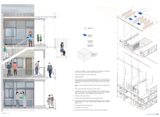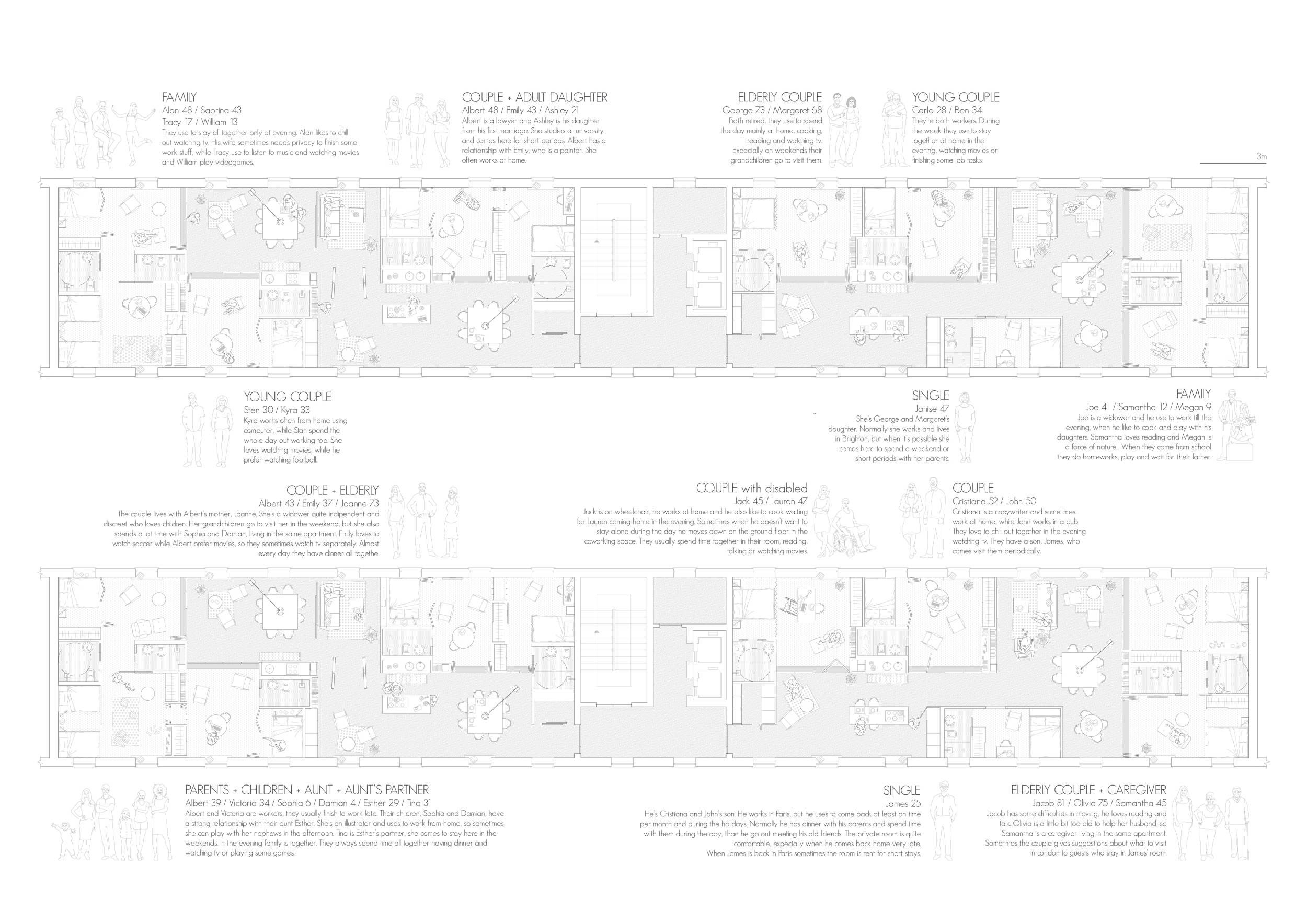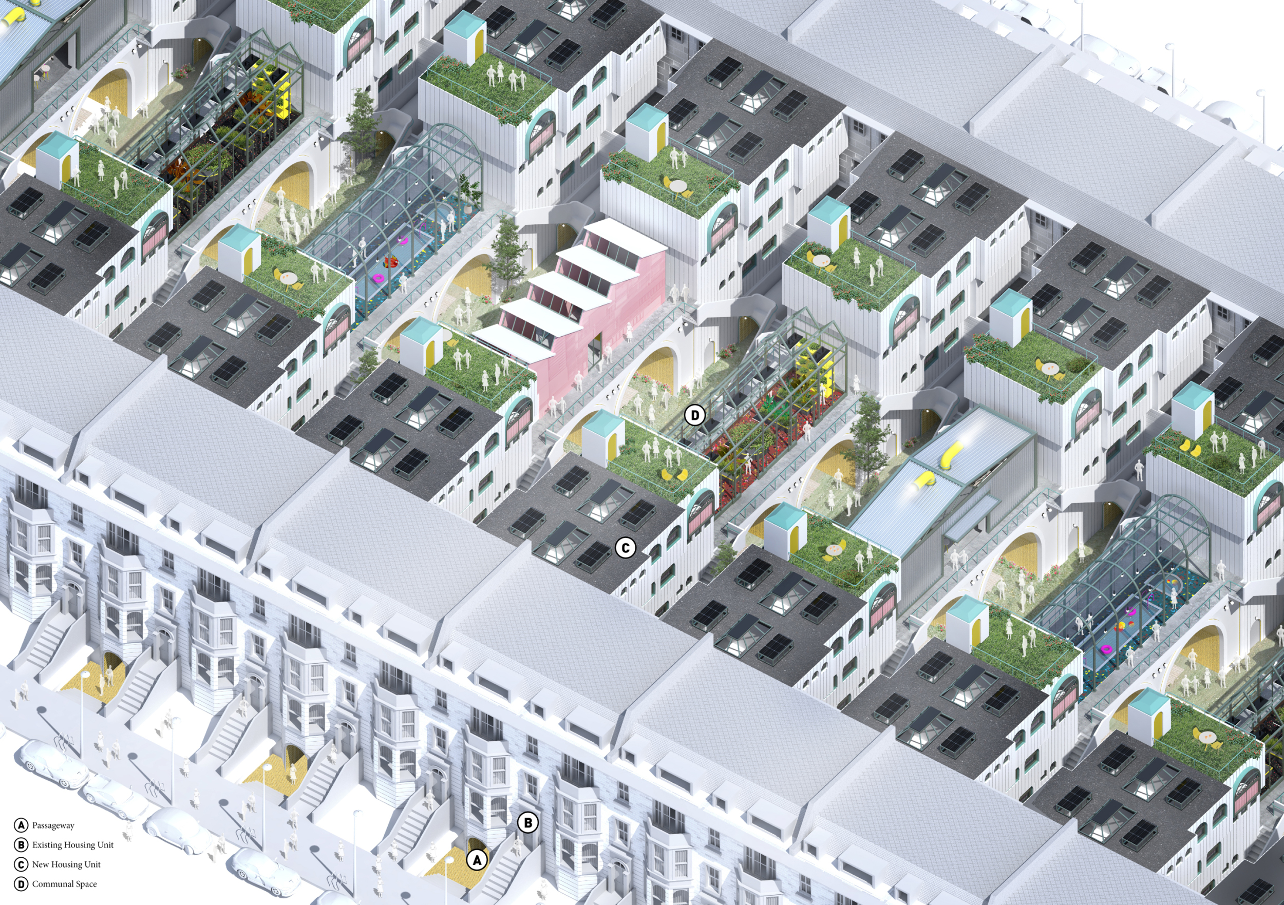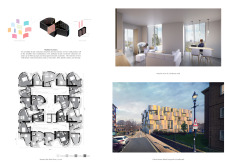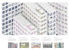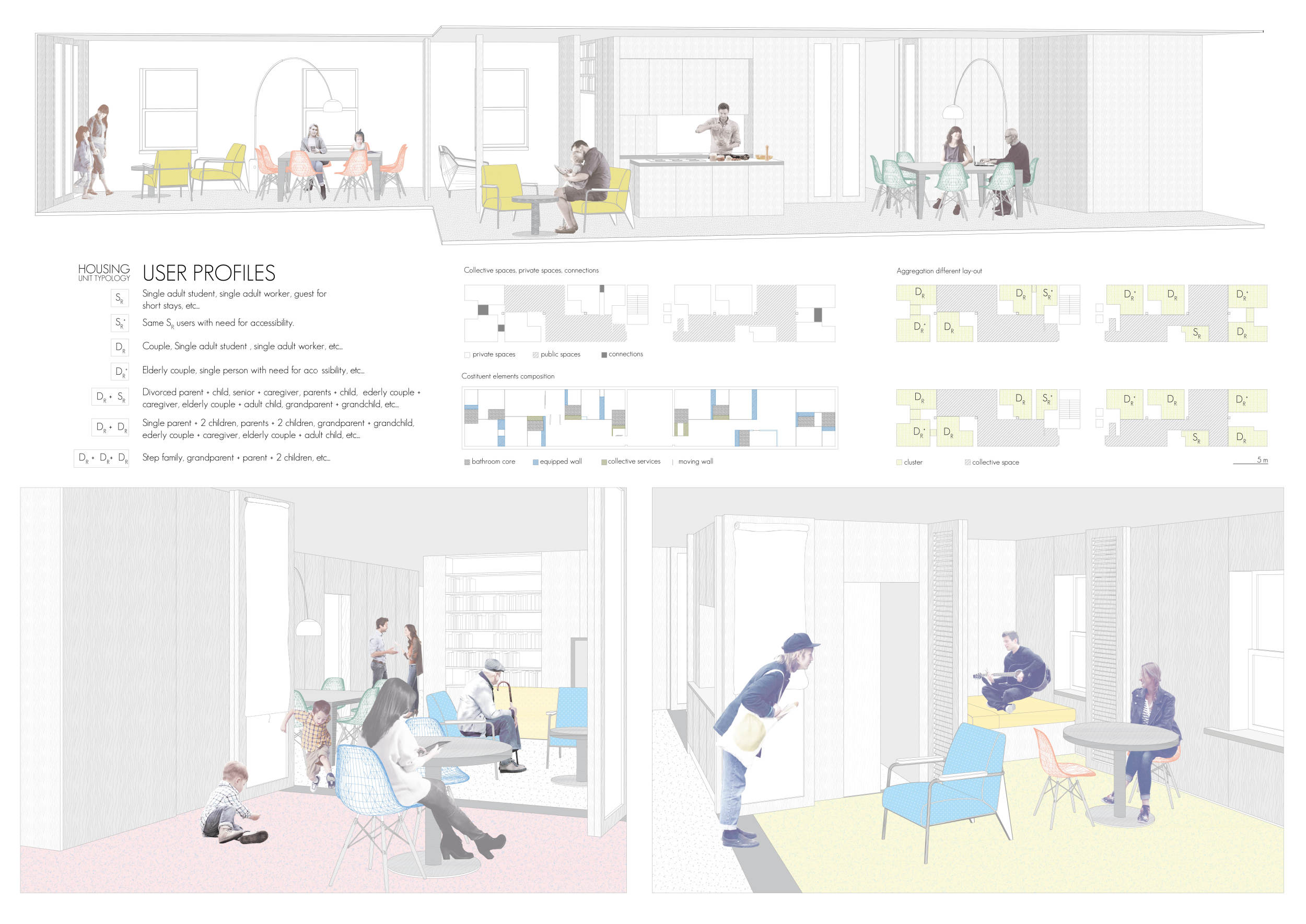 Coliving and cohabitation serve to increase density by reorganizing the layouts of existing buildings for more efficient spaces, and to include shared amenities for larger groups of inhabitants. The designer of this project states: “the real revolution in housing is indoors.” The proposal rearranges the interior layout of a typical london housing block, as the designer claims, to mirror the growing variety of job positions and of family arrangements.