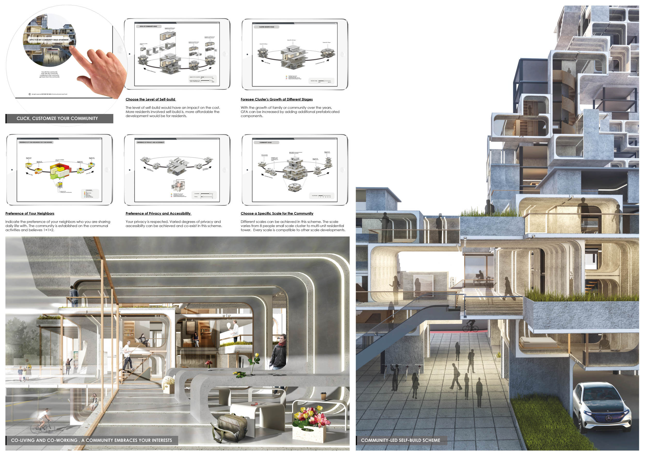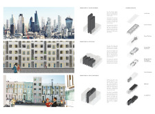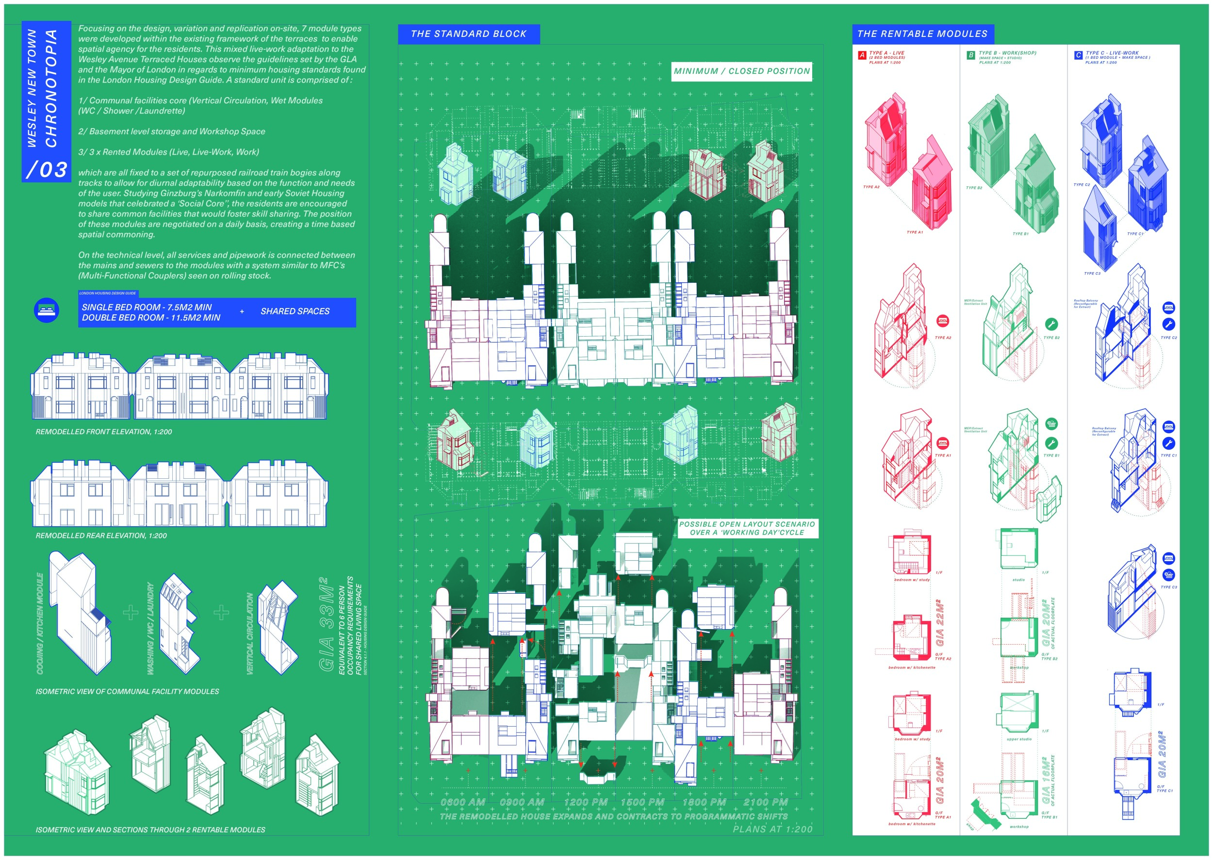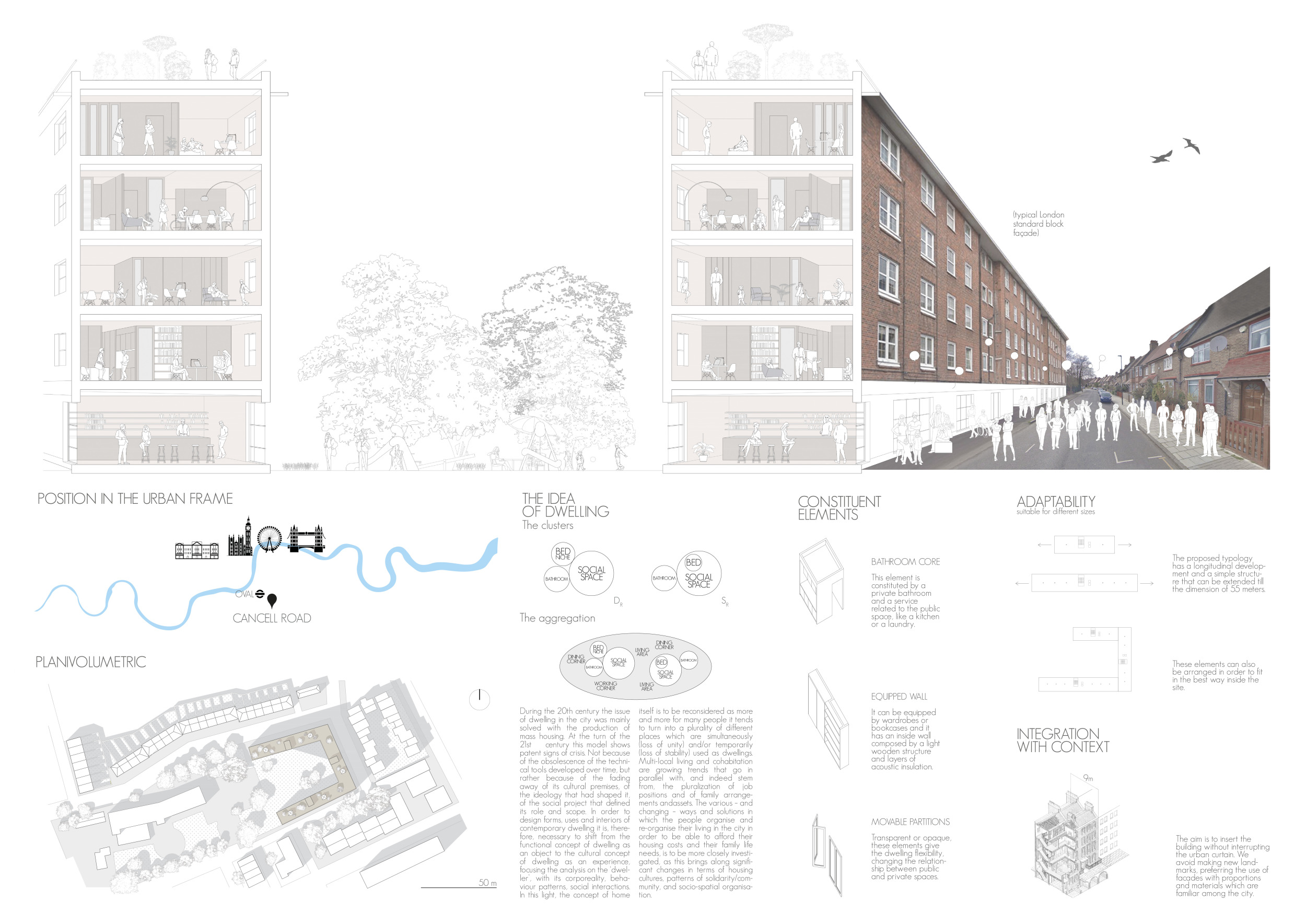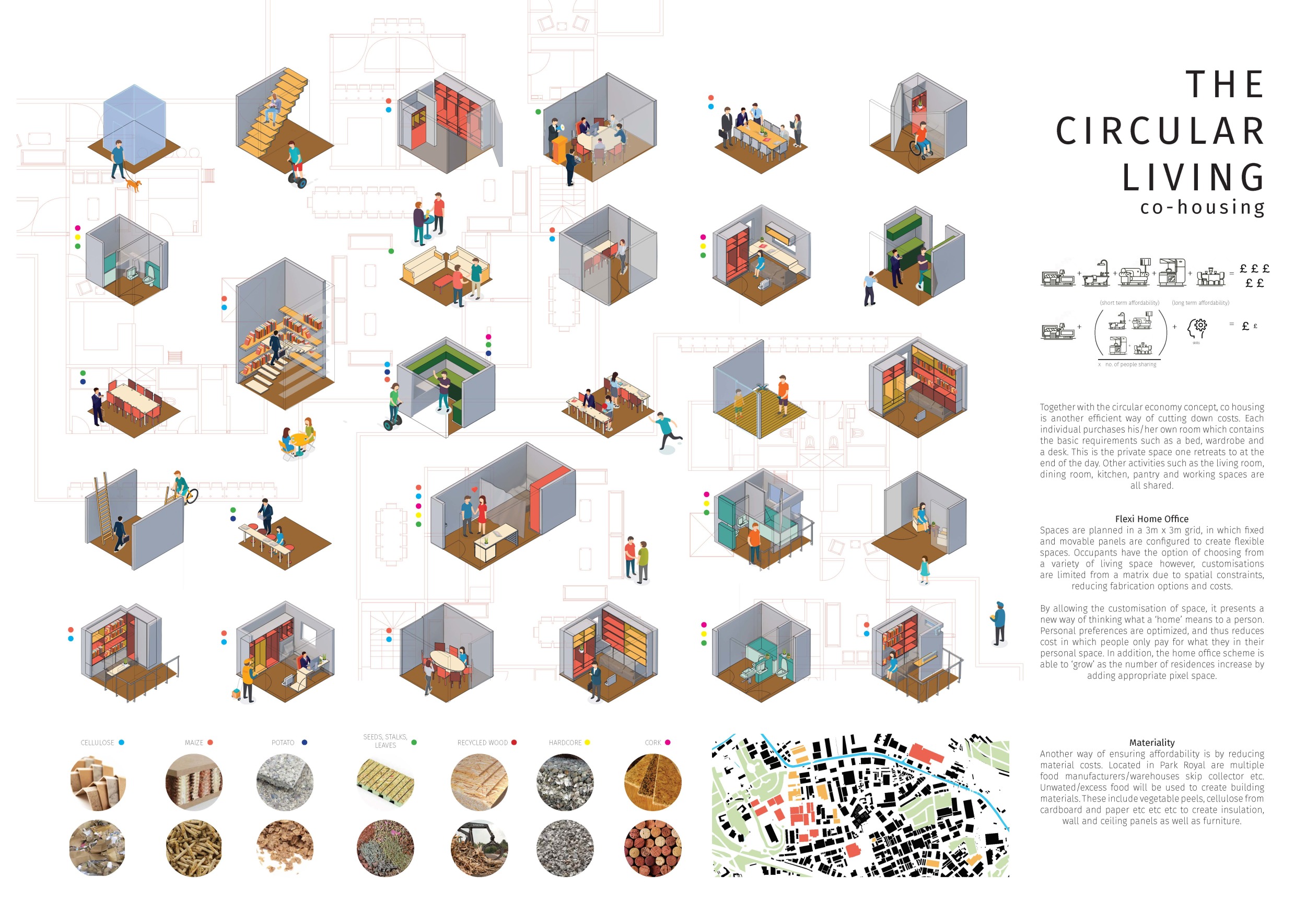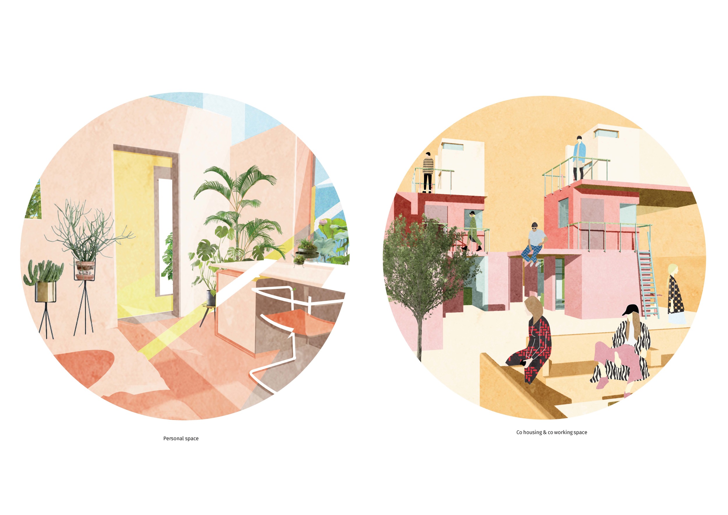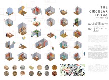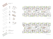 Coliving and cohabitation serve to increase density by reorganizing the layouts of existing buildings for more efficient spaces, and to include shared amenities for larger groups of inhabitants. The designer of this project states: “the real revolution in housing is indoors.” The proposal rearranges the interior layout of a typical london housing block, as the designer claims, to mirror the growing variety of job positions and of family arrangements.