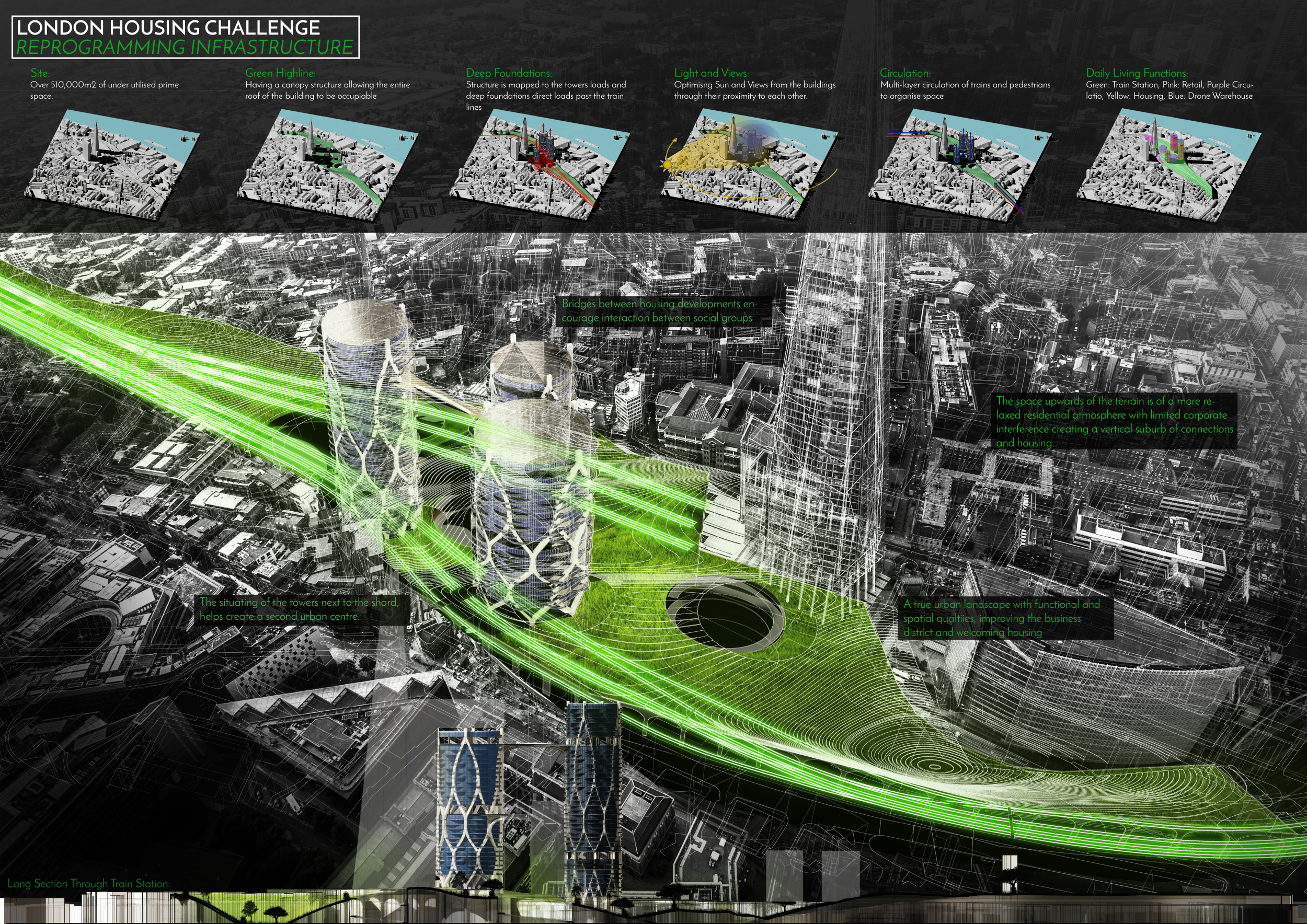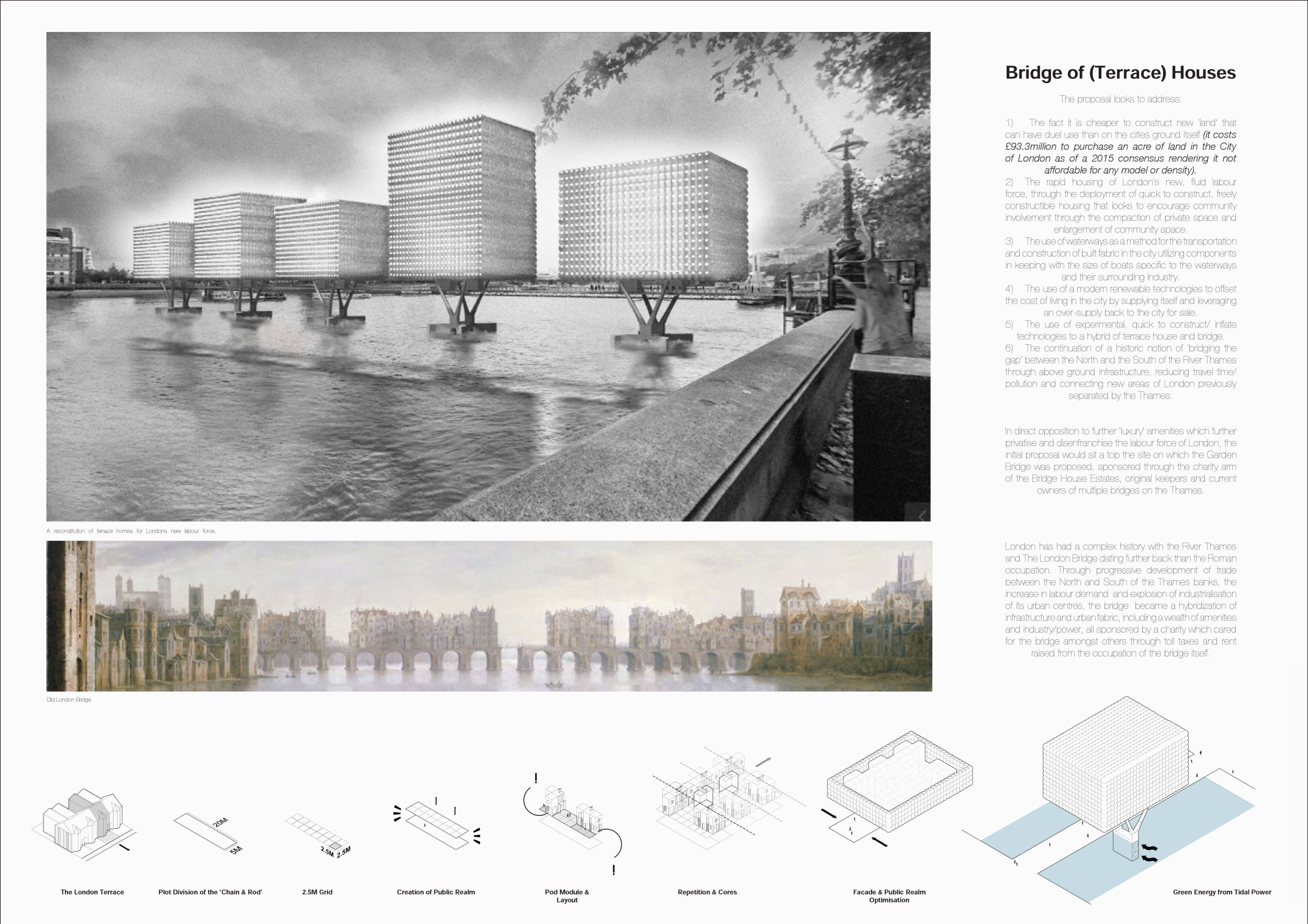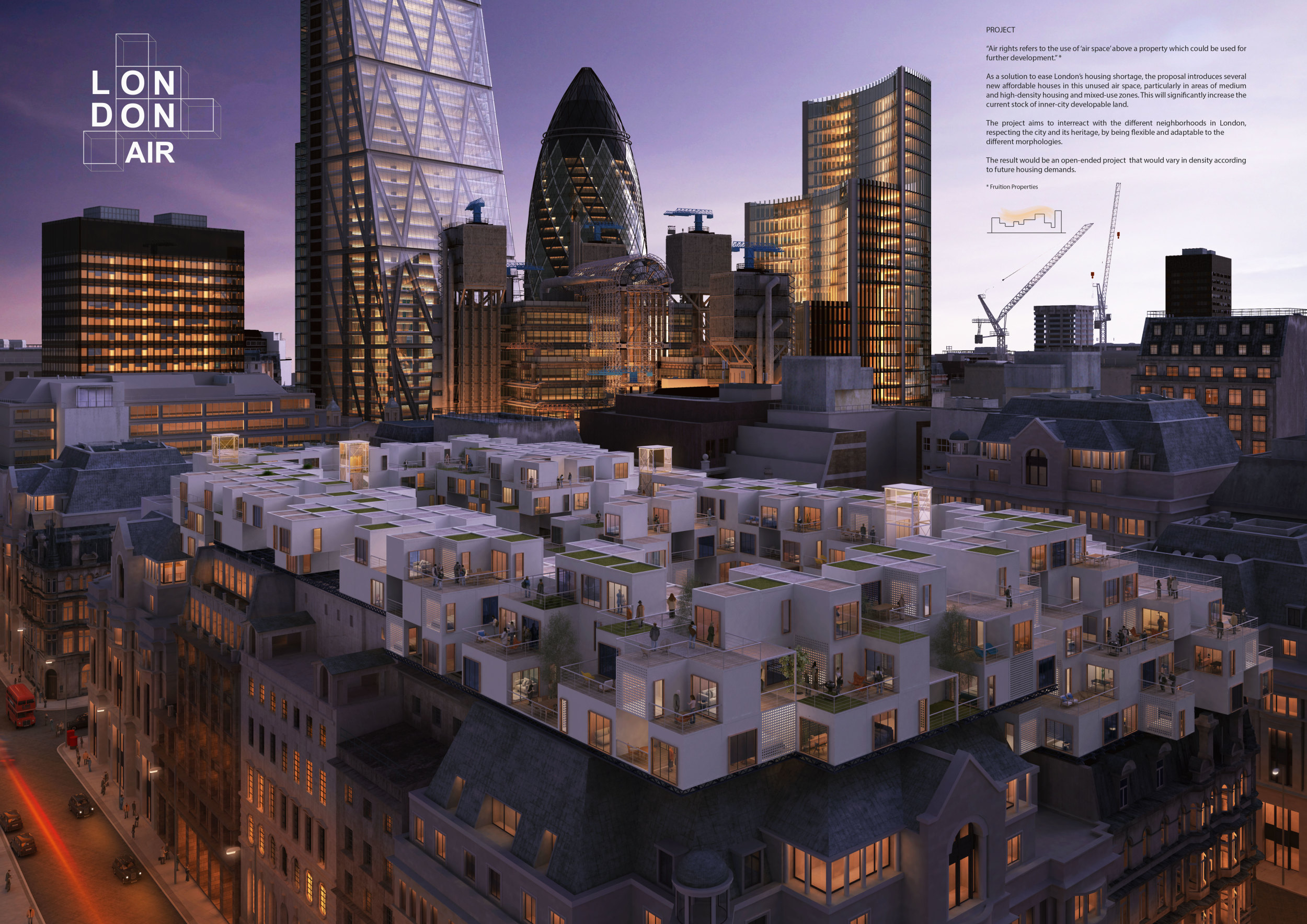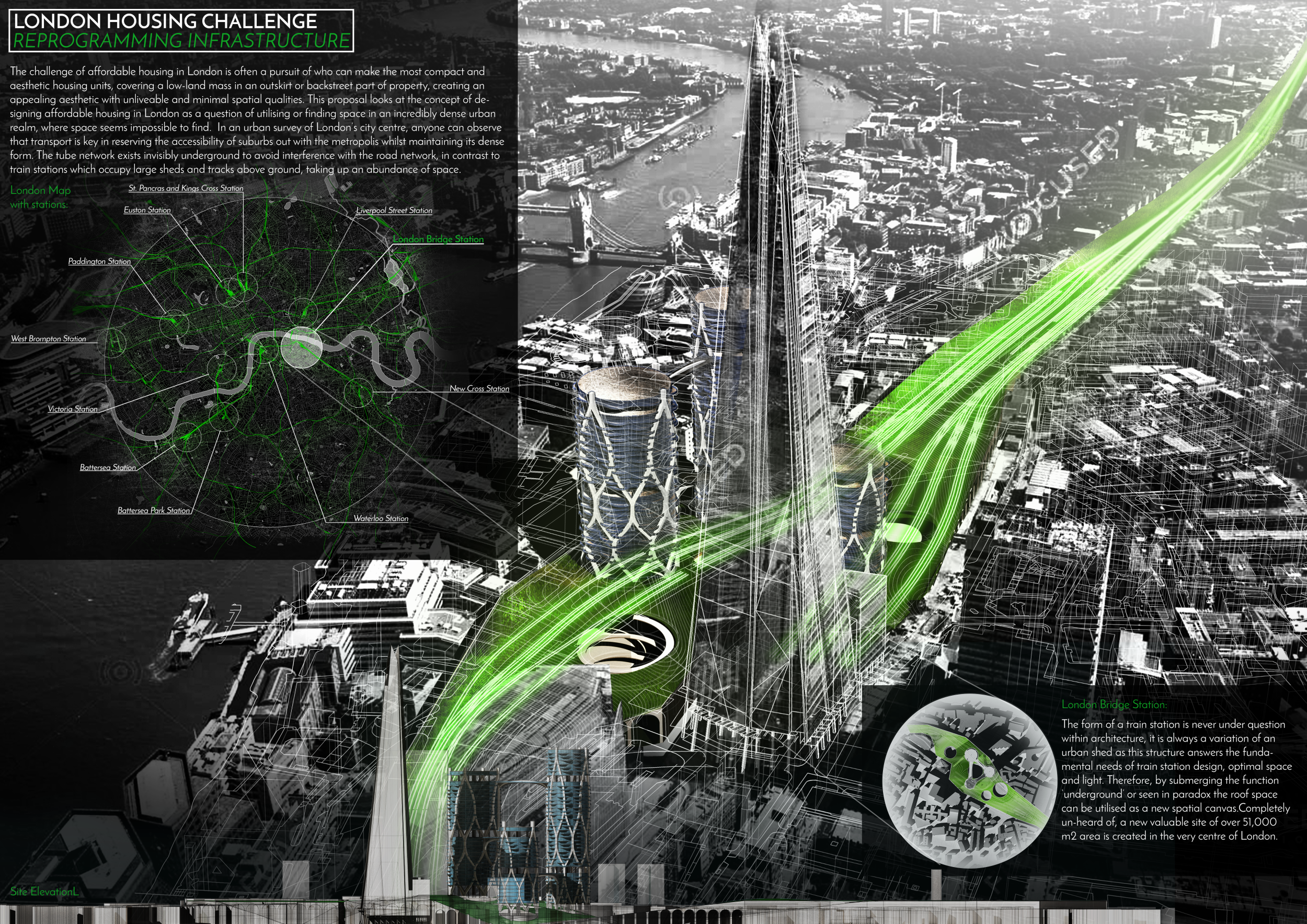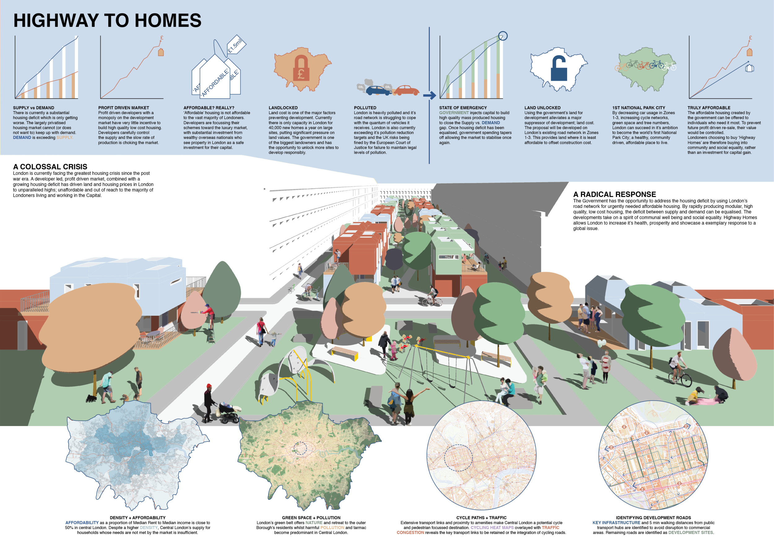 A range of ideas were submitted, some realistic and others conceptual. Common themes that were investigated include: methods of increasing density within the existing building stock; using shared or state-owned spaces like rivers, highways, bridges, train tracks, and even Buckingham Palace, to construct new housing above, below, or within; reworking low-density building types like warehouses and industrial spaces; and reintroducing alternative methods for land ownership, like community land trusts.