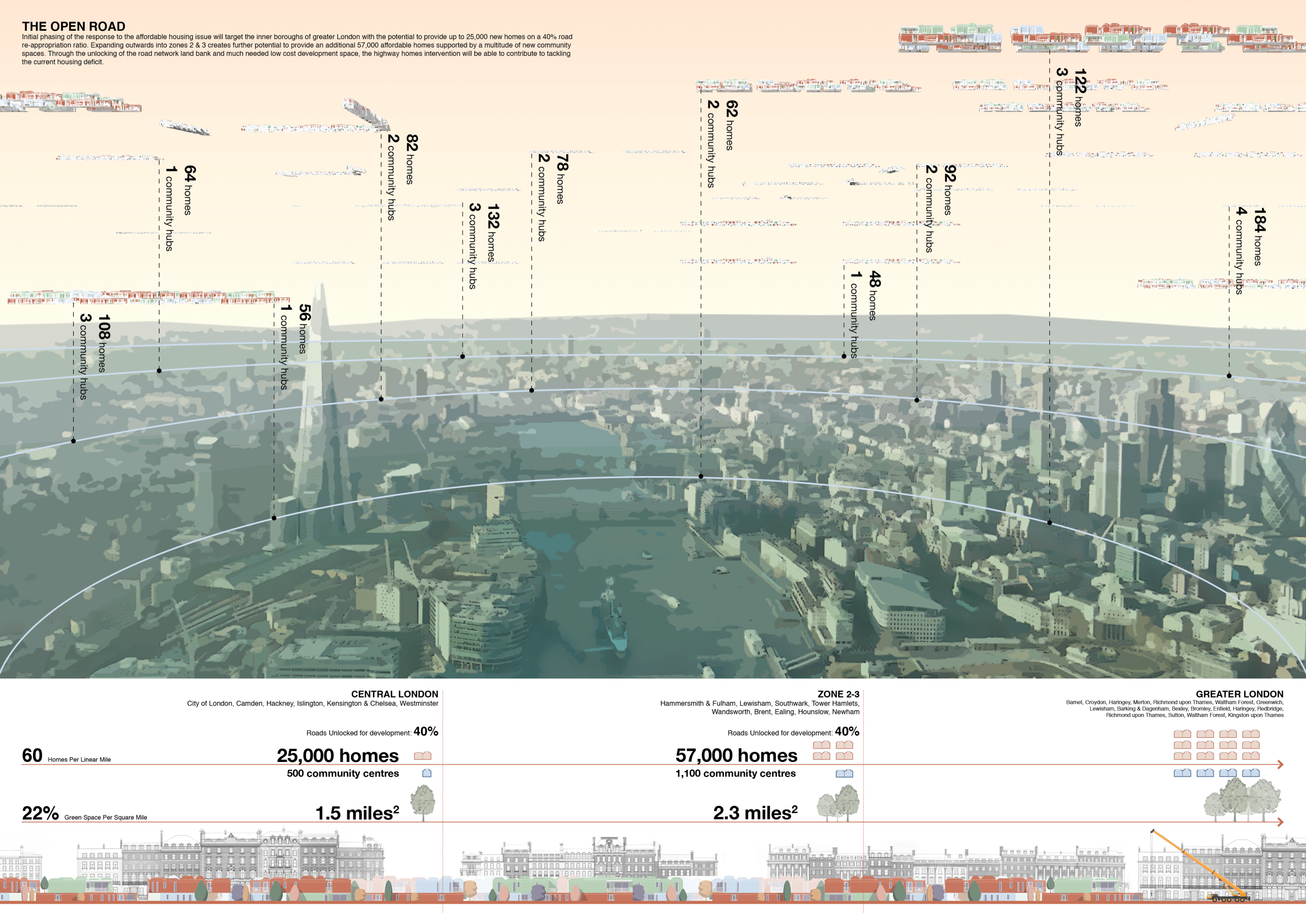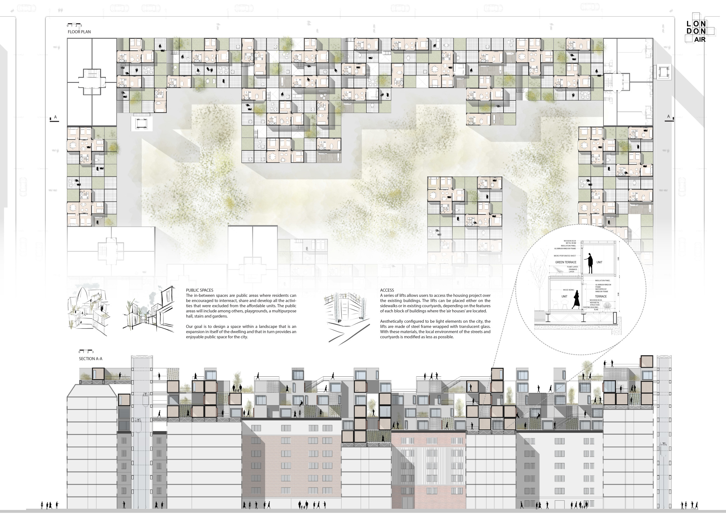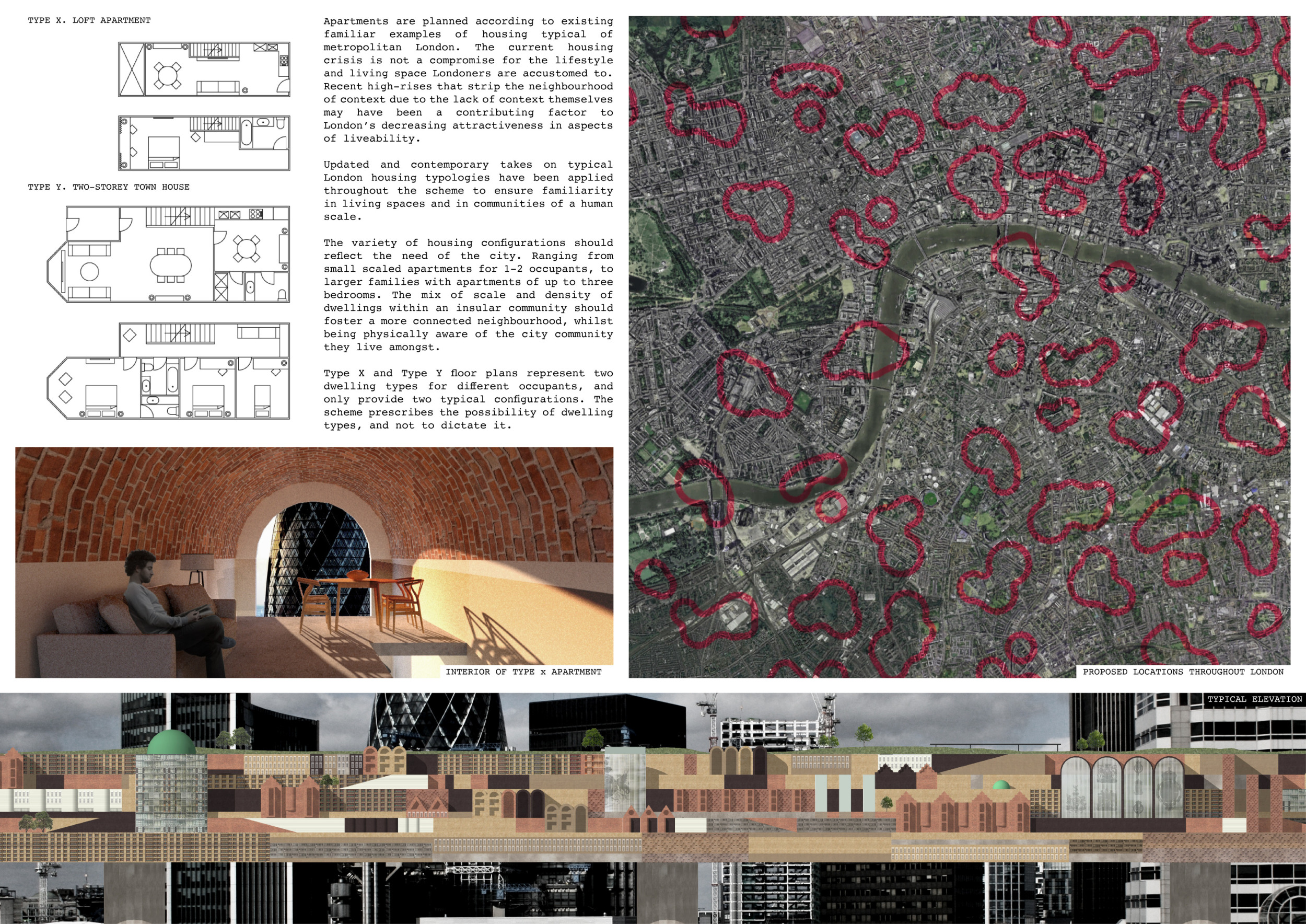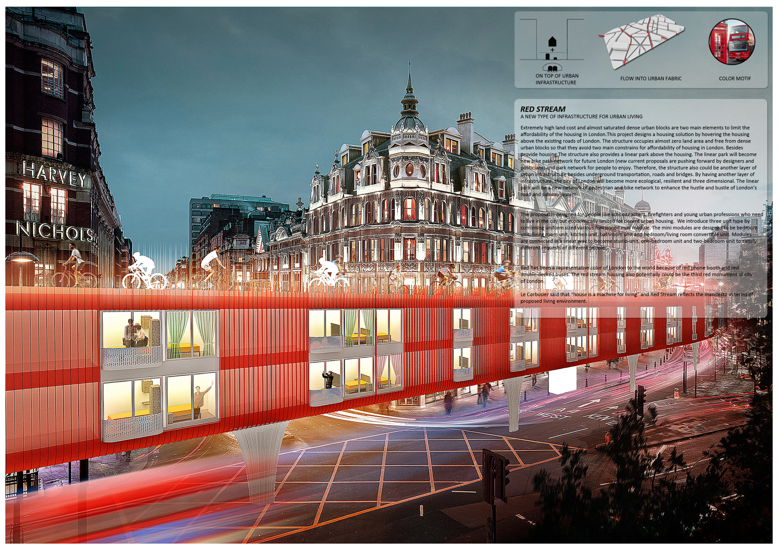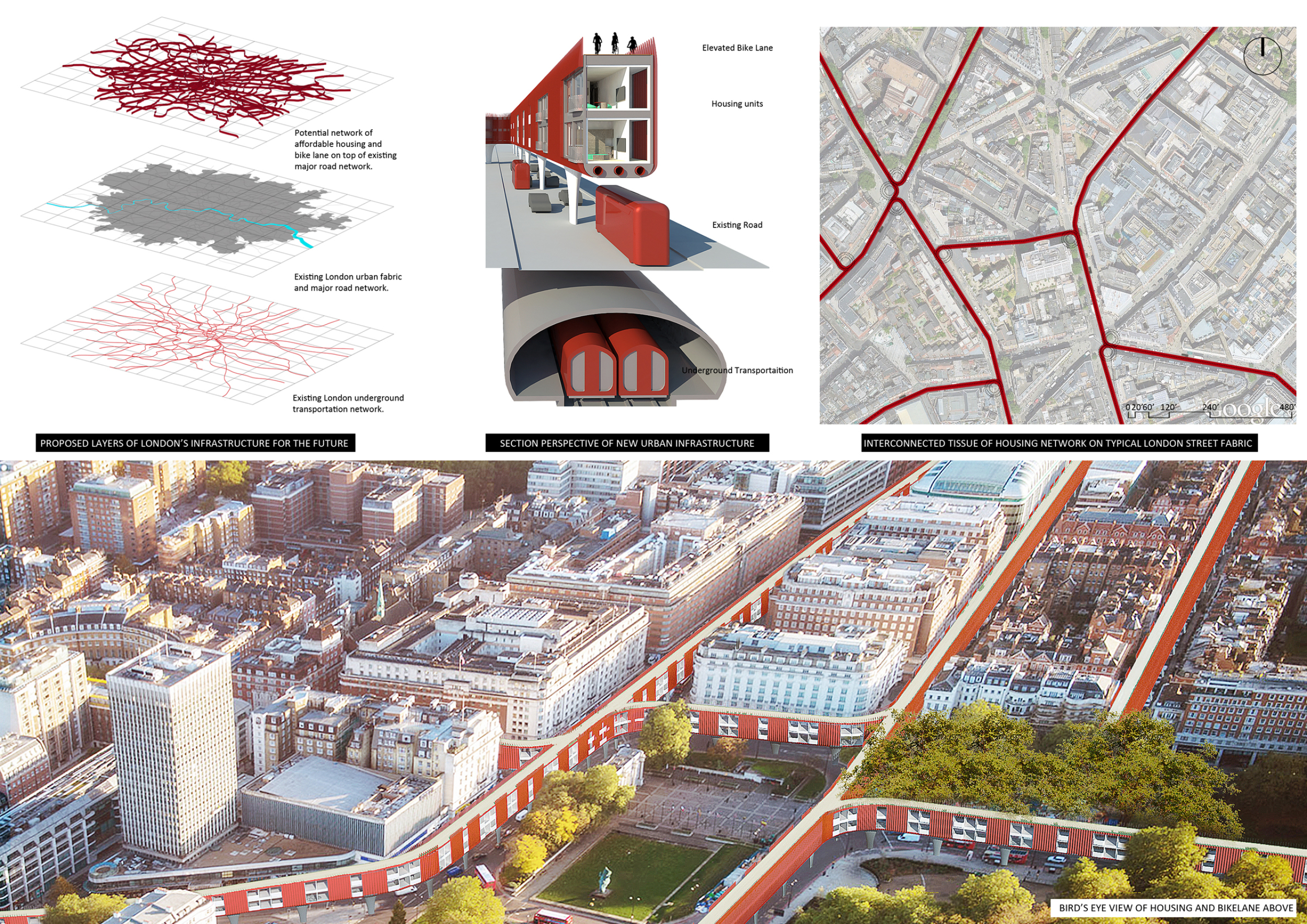 A range of ideas were submitted, some realistic and others conceptual. Common themes that were investigated include: methods of increasing density within the existing building stock; using shared or state-owned spaces like rivers, highways, bridges, train tracks, and even Buckingham Palace, to construct new housing above, below, or within; reworking low-density building types like warehouses and industrial spaces; and reintroducing alternative methods for land ownership, like community land trusts.