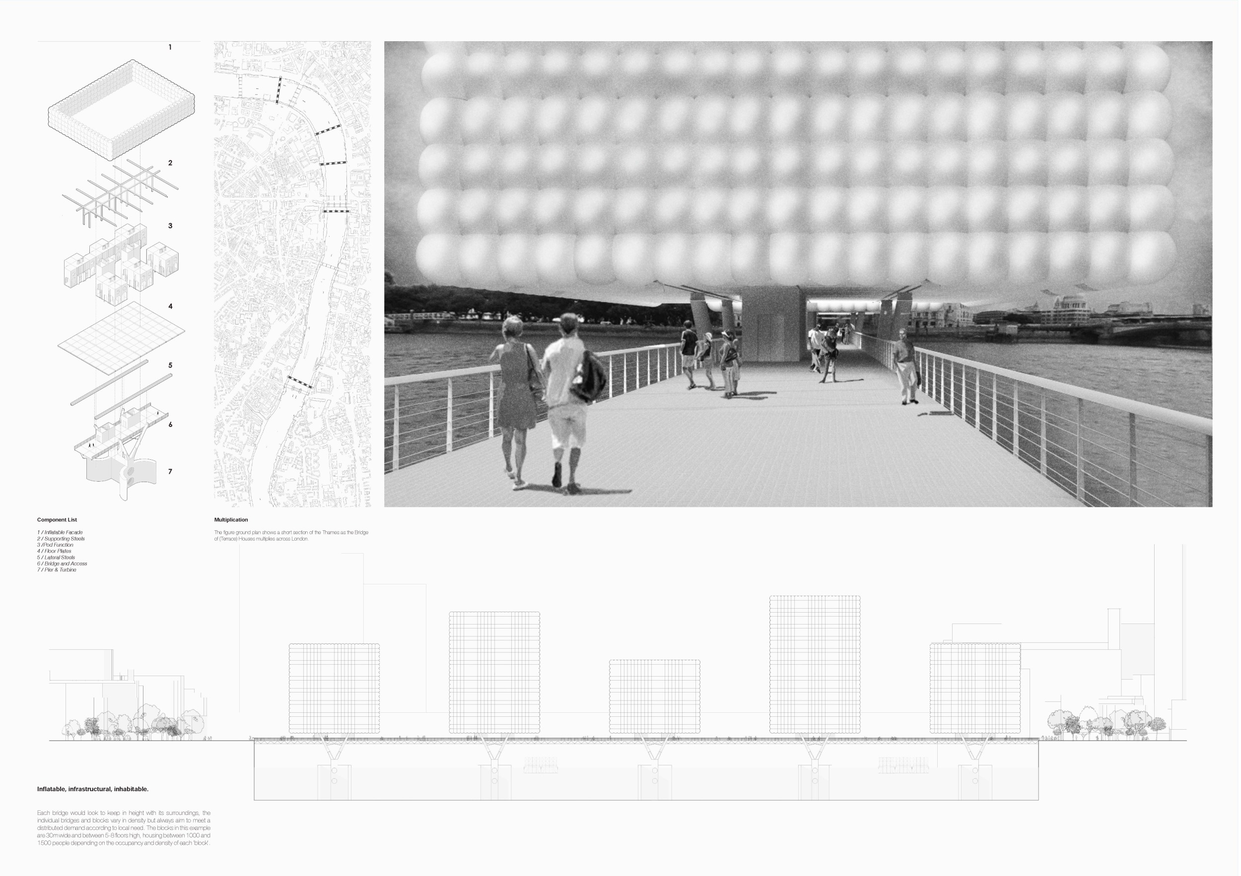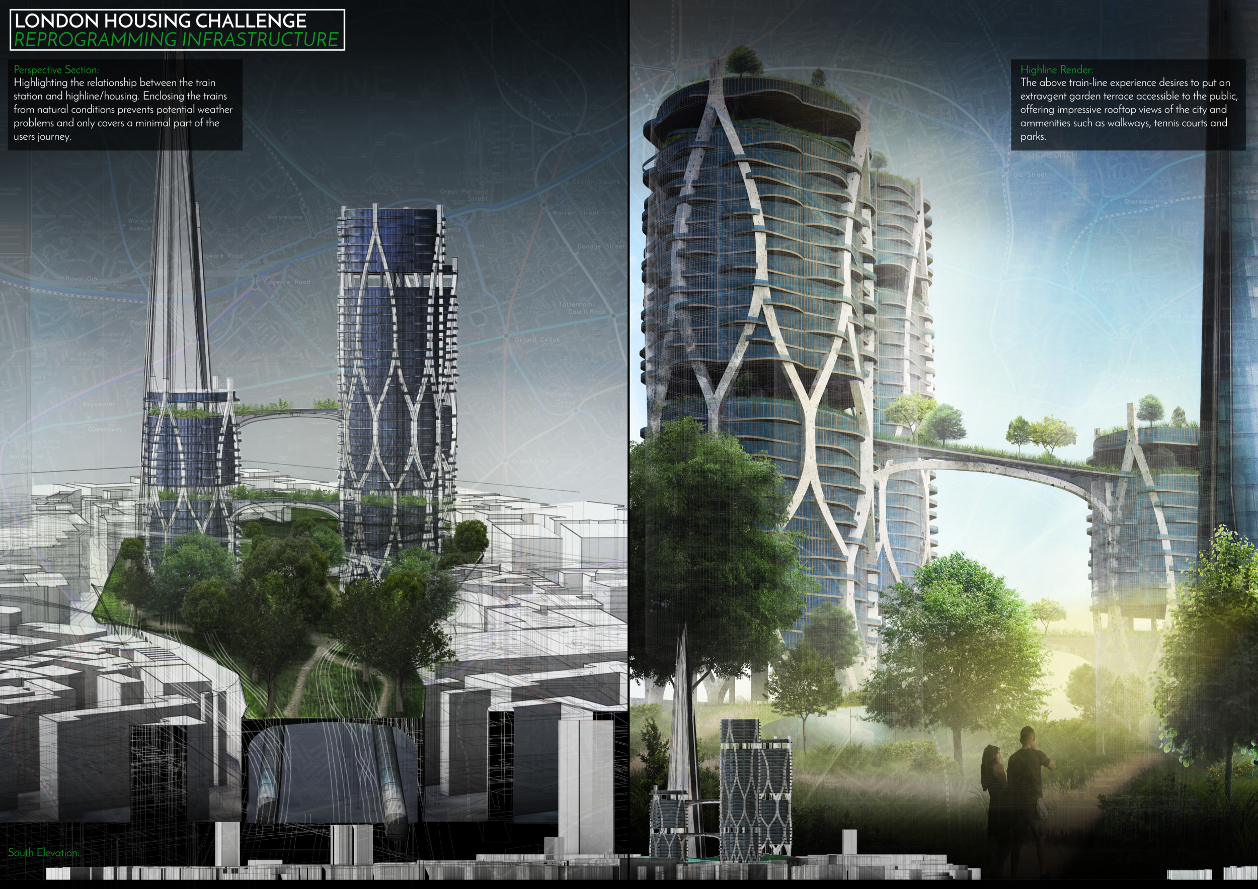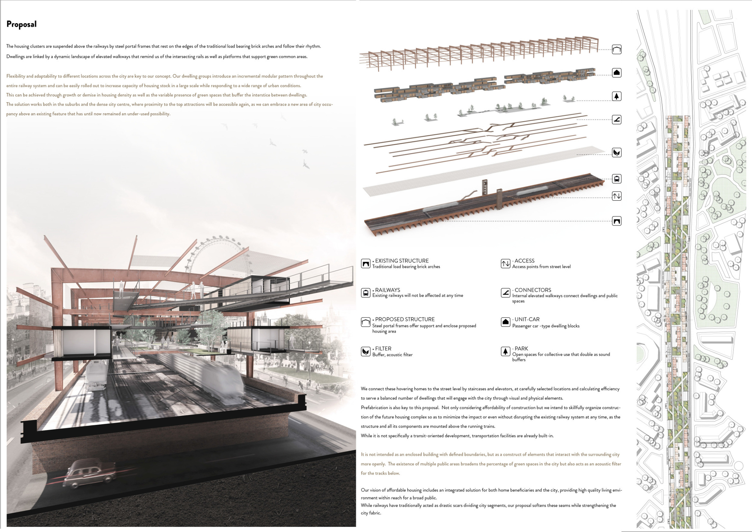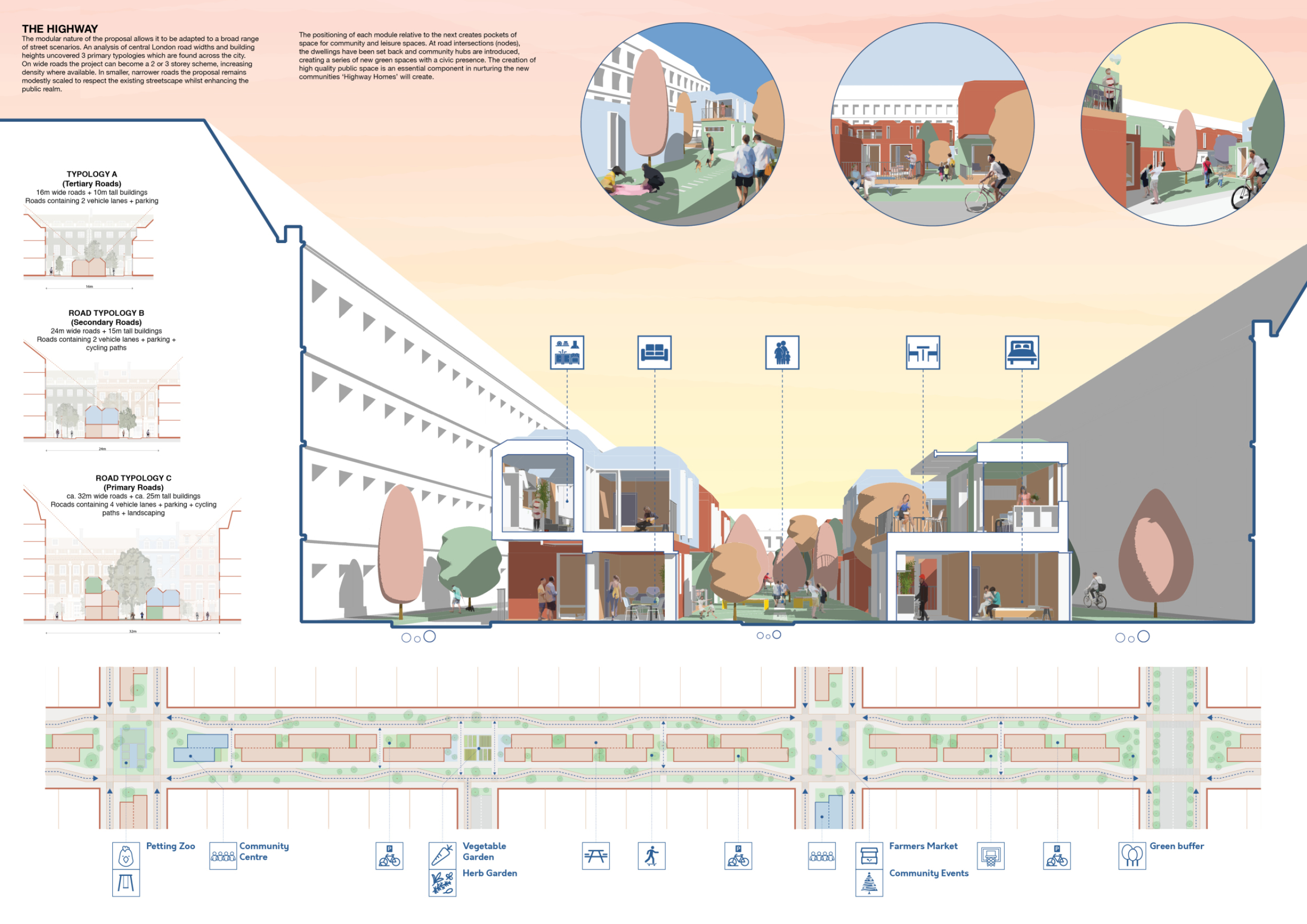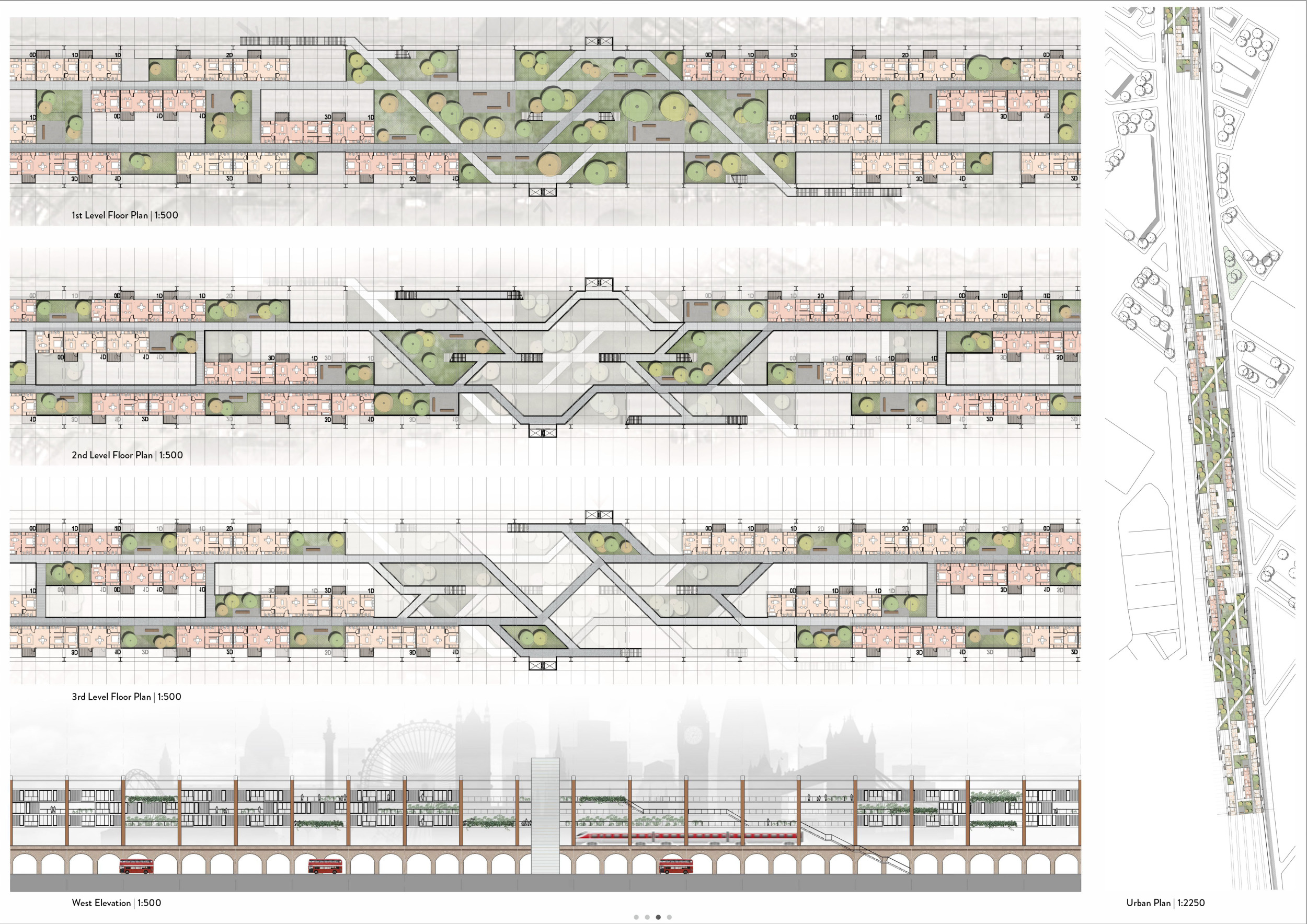 A range of ideas were submitted, some realistic and others conceptual. Common themes that were investigated include: methods of increasing density within the existing building stock; using shared or state-owned spaces like rivers, highways, bridges, train tracks, and even Buckingham Palace, to construct new housing above, below, or within; reworking low-density building types like warehouses and industrial spaces; and reintroducing alternative methods for land ownership, like community land trusts.