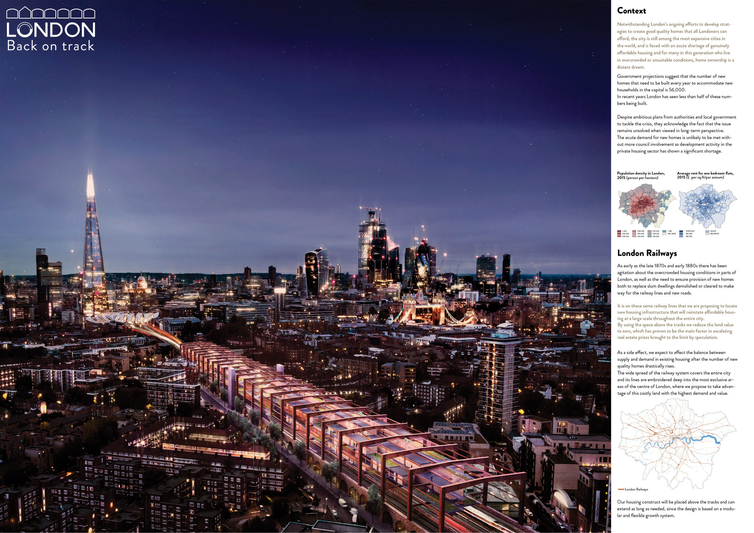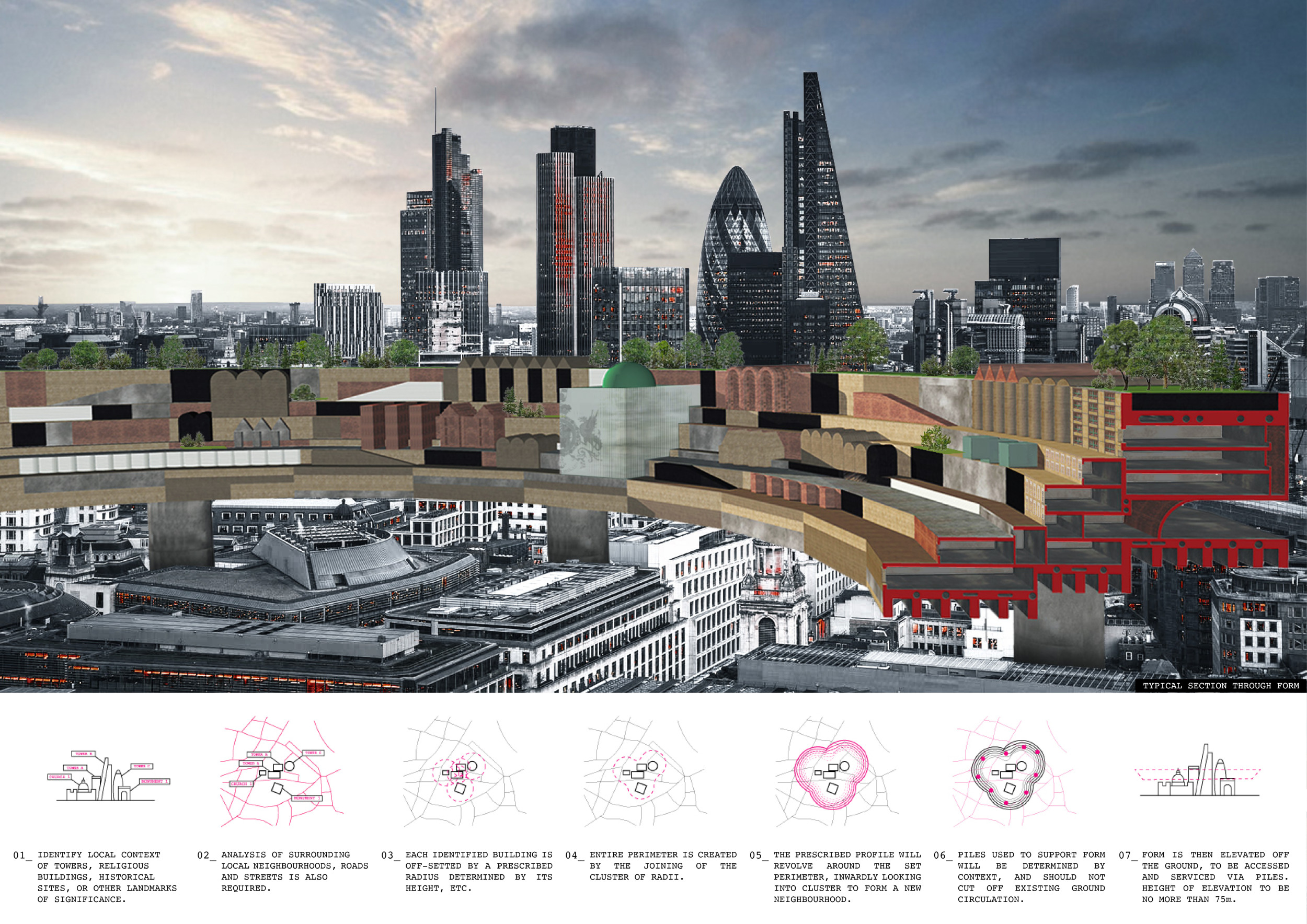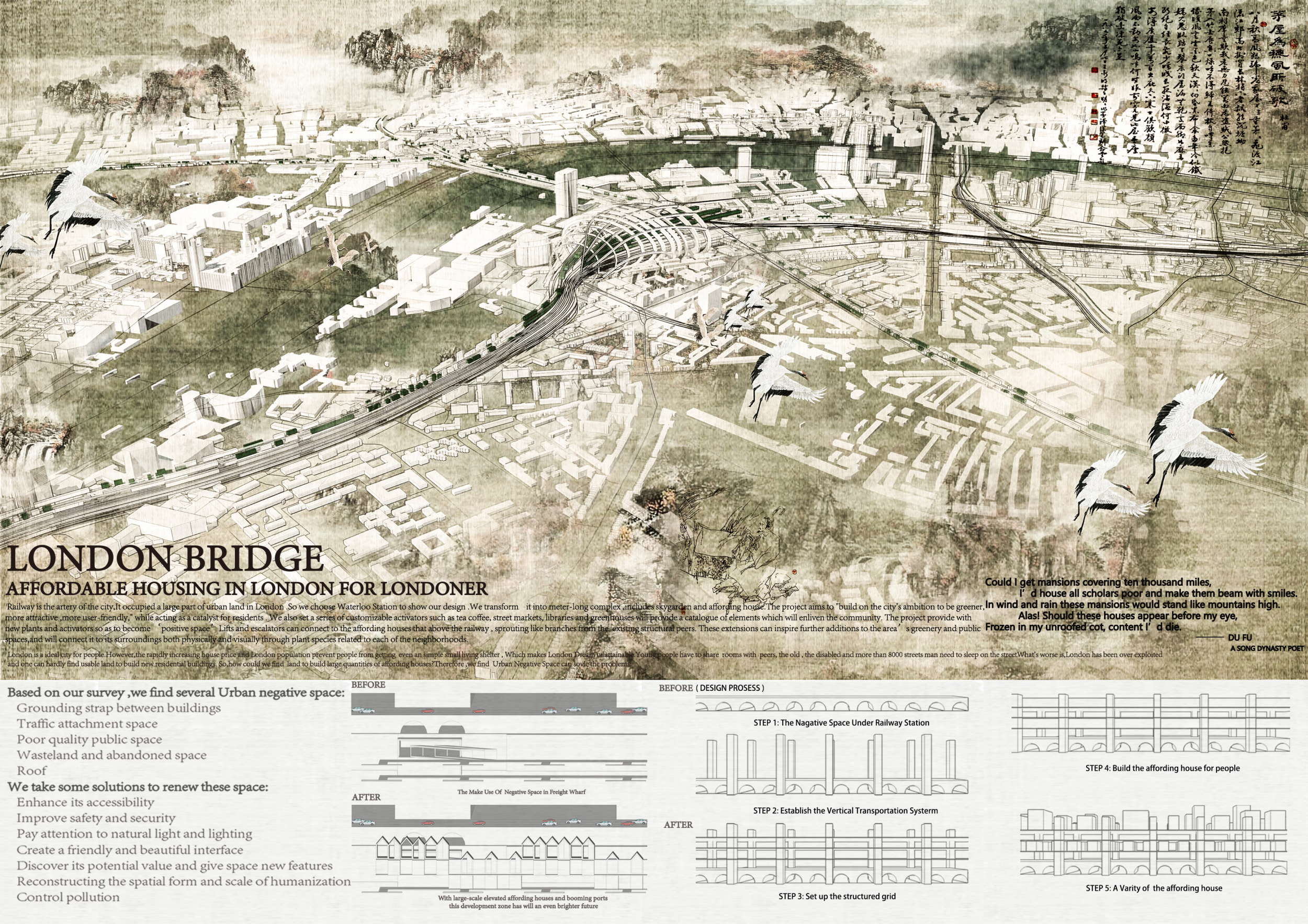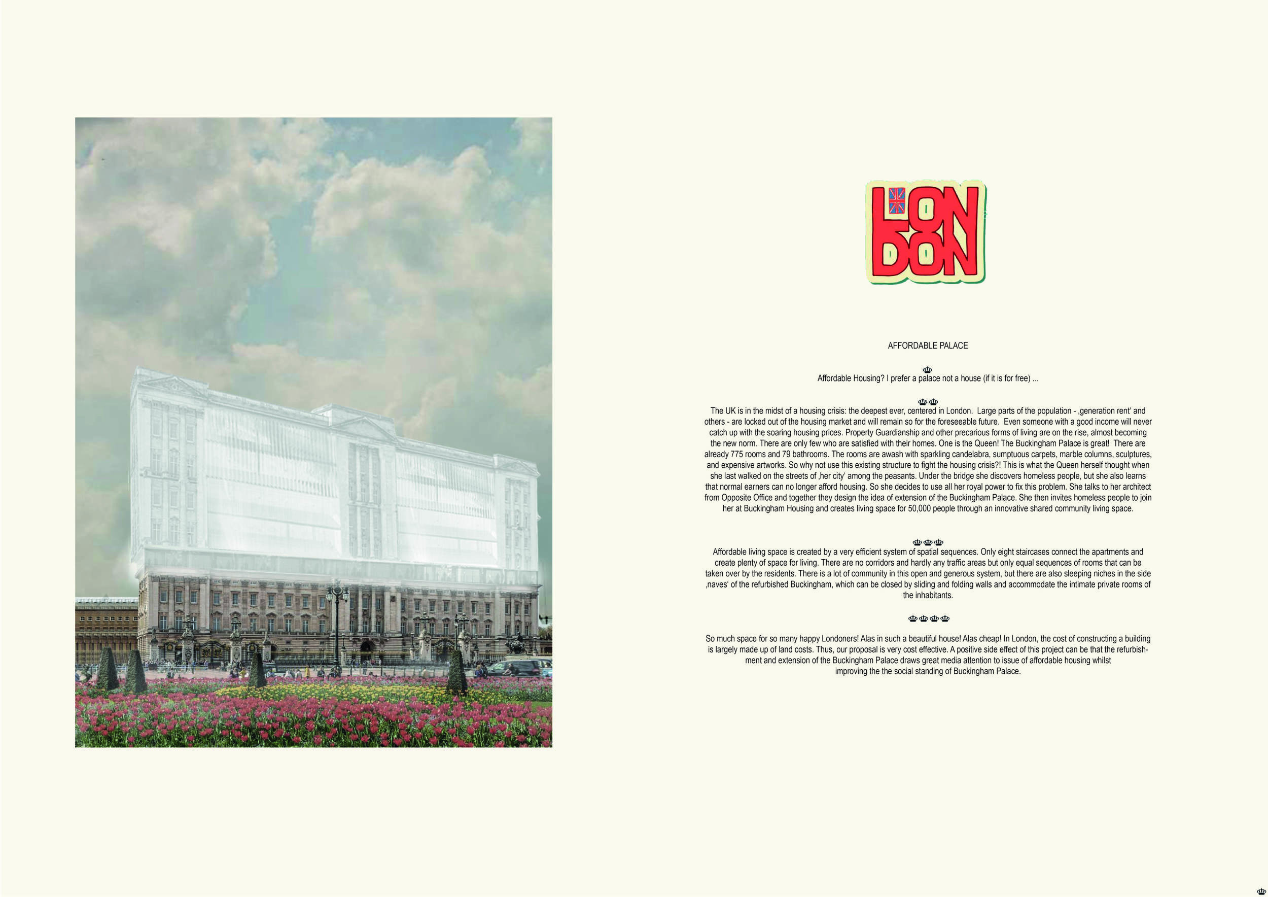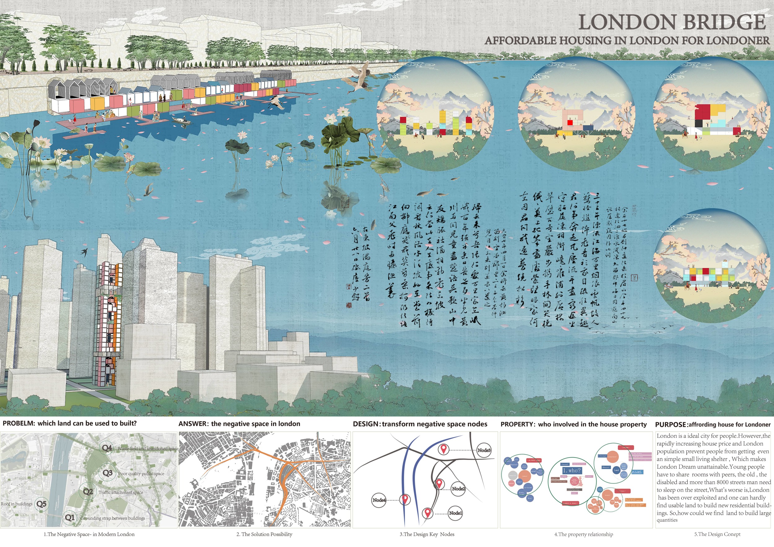 A range of ideas were submitted, some realistic and others conceptual. Common themes that were investigated include: methods of increasing density within the existing building stock; using shared or state-owned spaces like rivers, highways, bridges, train tracks, and even Buckingham Palace, to construct new housing above, below, or within; reworking low-density building types like warehouses and industrial spaces; and reintroducing alternative methods for land ownership, like community land trusts.