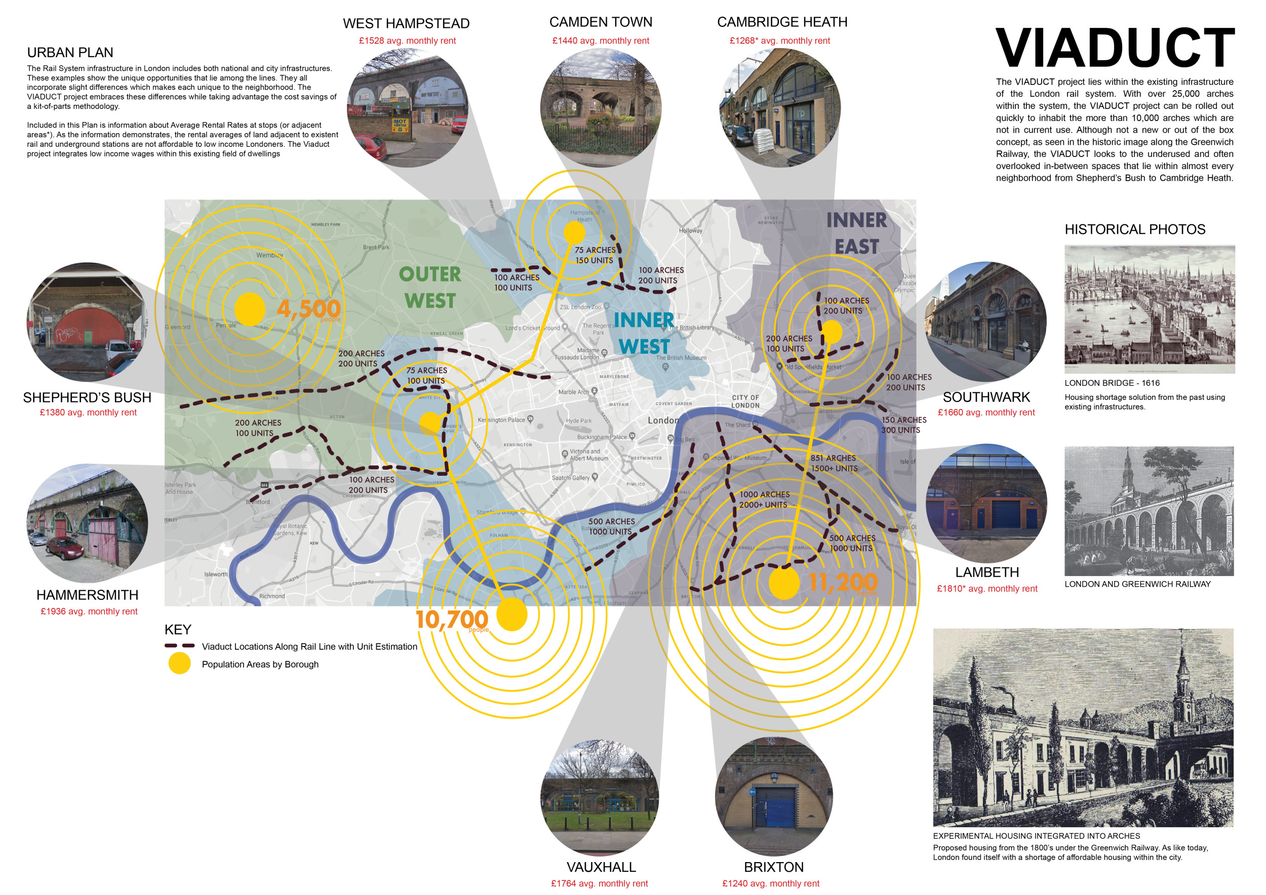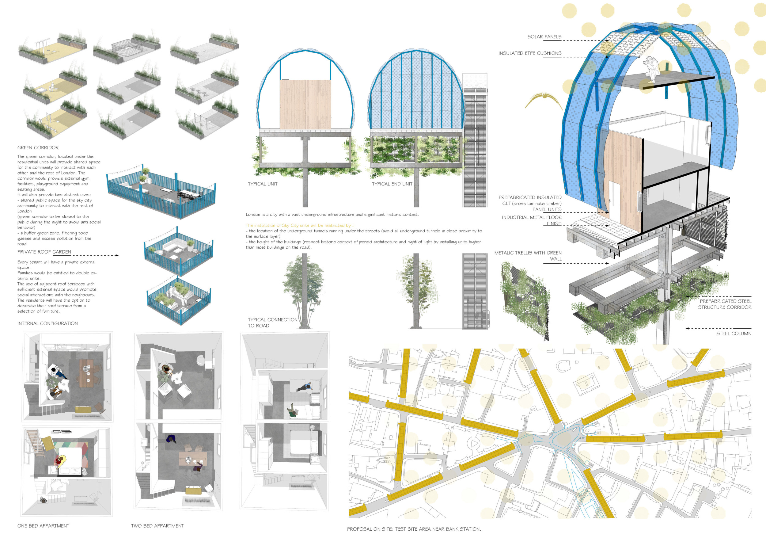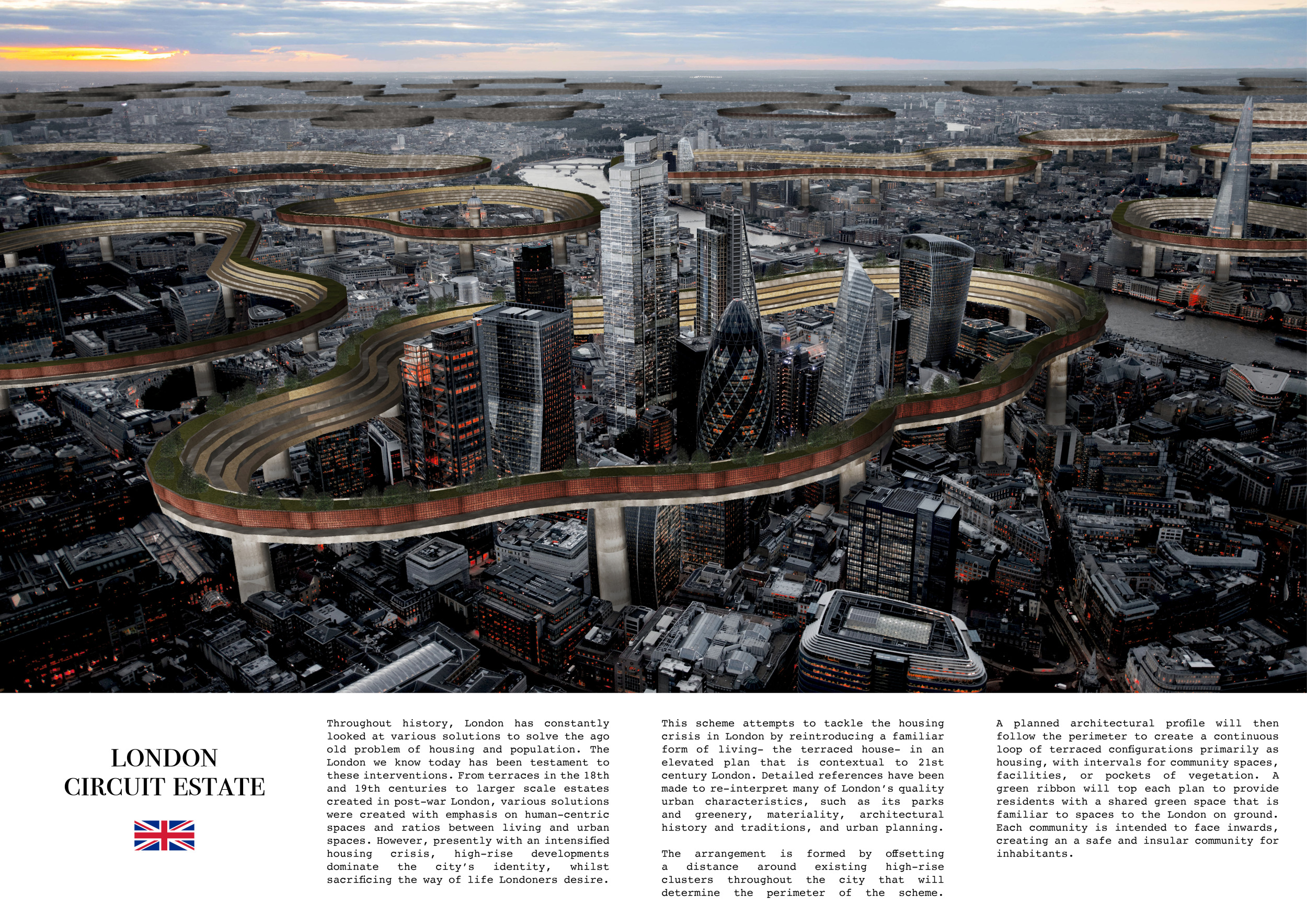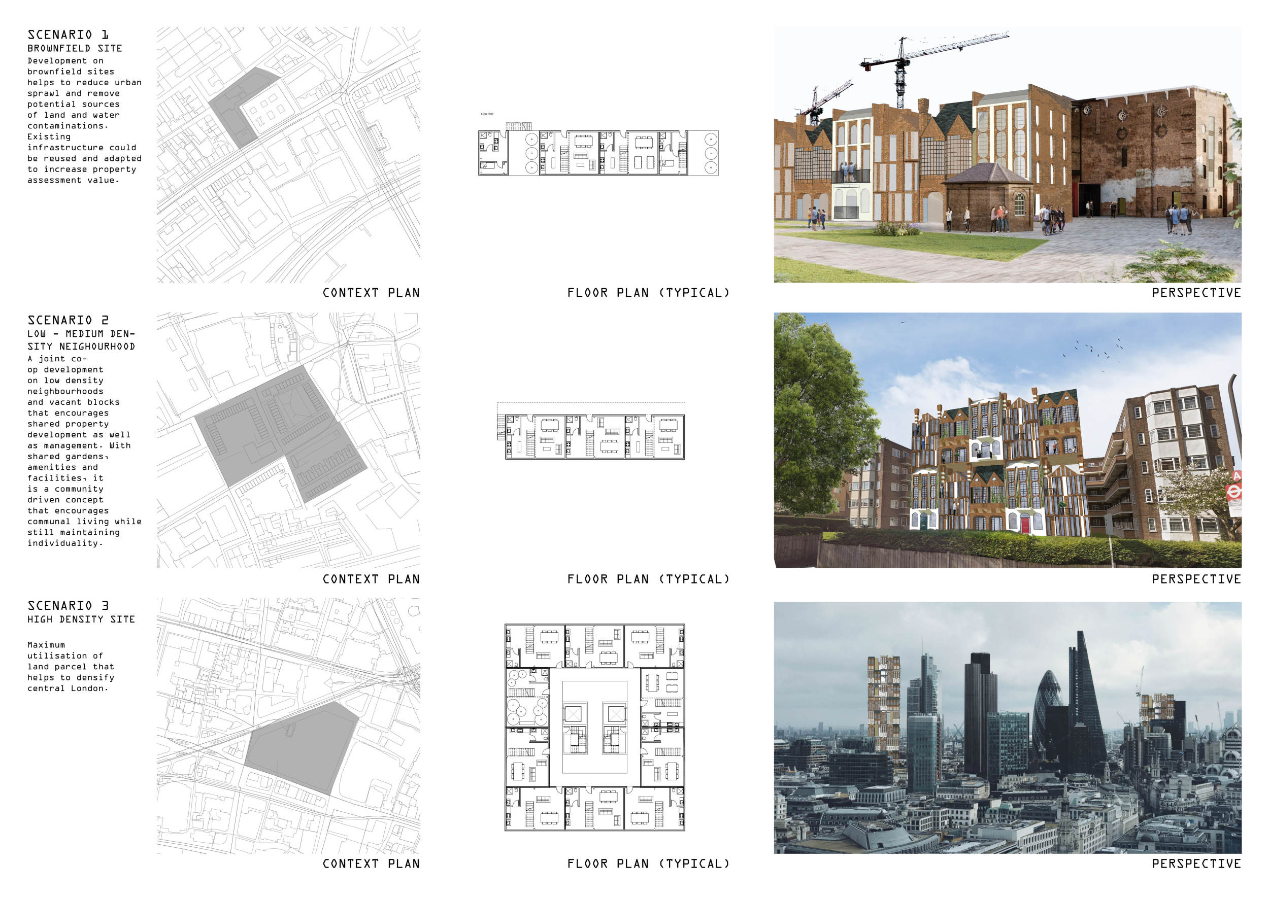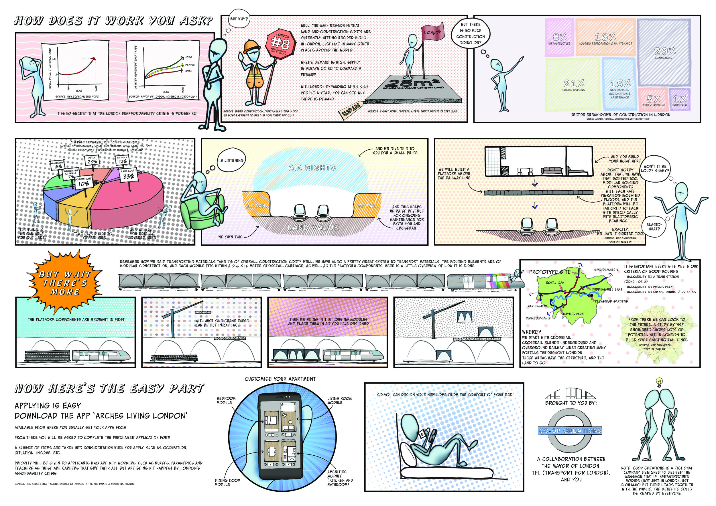 A range of ideas were submitted, some realistic and others conceptual. Common themes that were investigated include: methods of increasing density within the existing building stock; using shared or state-owned spaces like rivers, highways, bridges, train tracks, and even Buckingham Palace, to construct new housing above, below, or within; reworking low-density building types like warehouses and industrial spaces; and reintroducing alternative methods for land ownership, like community land trusts.