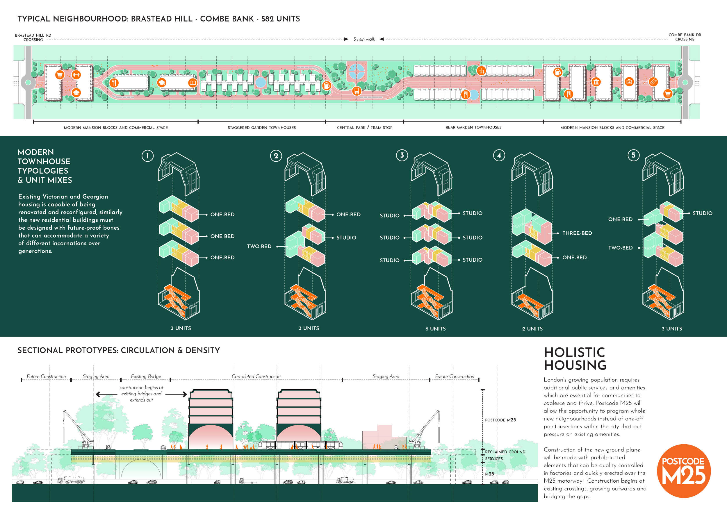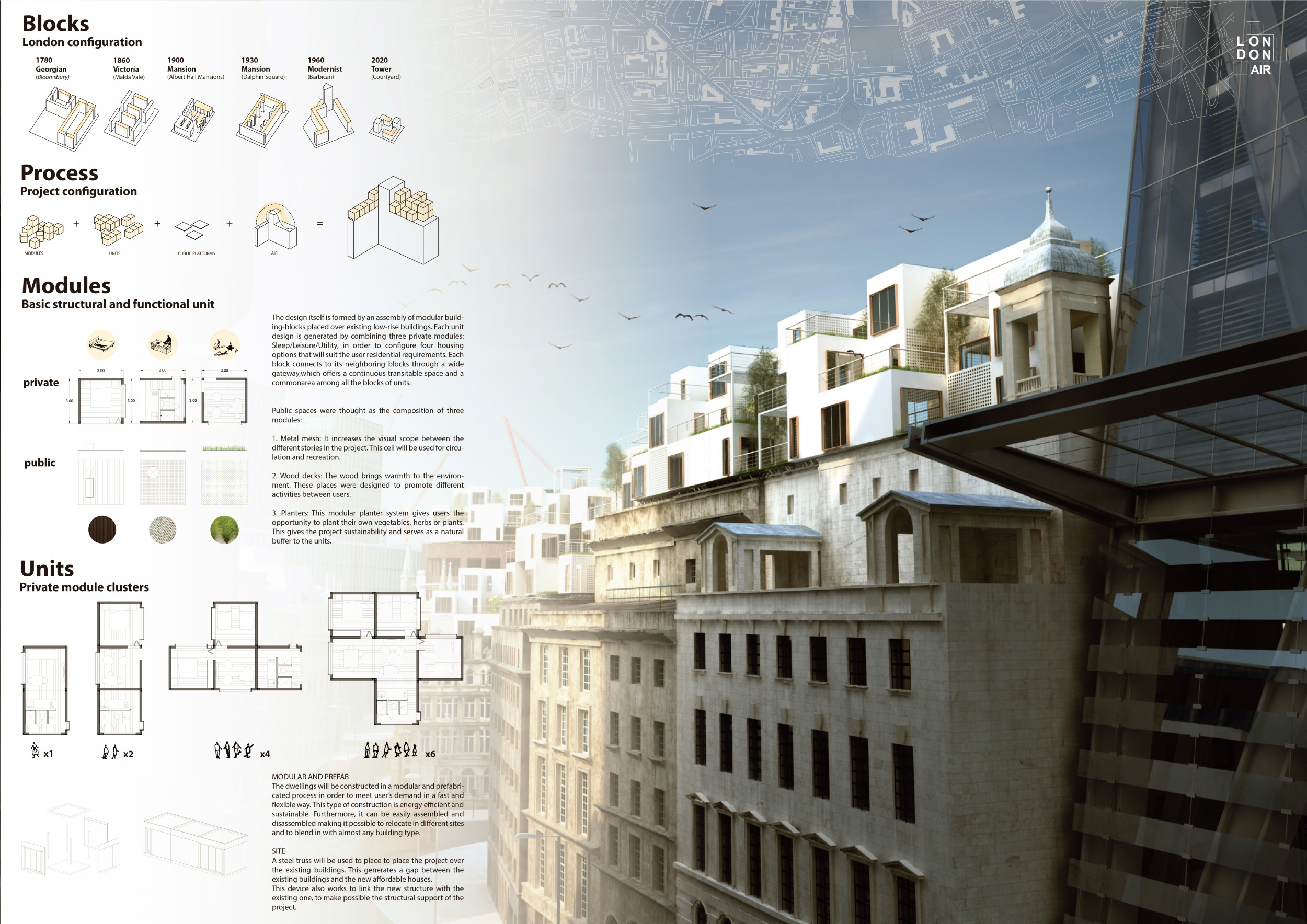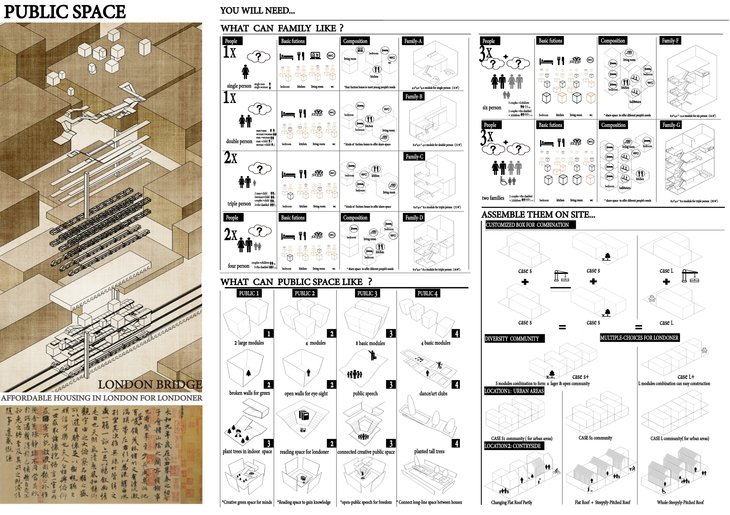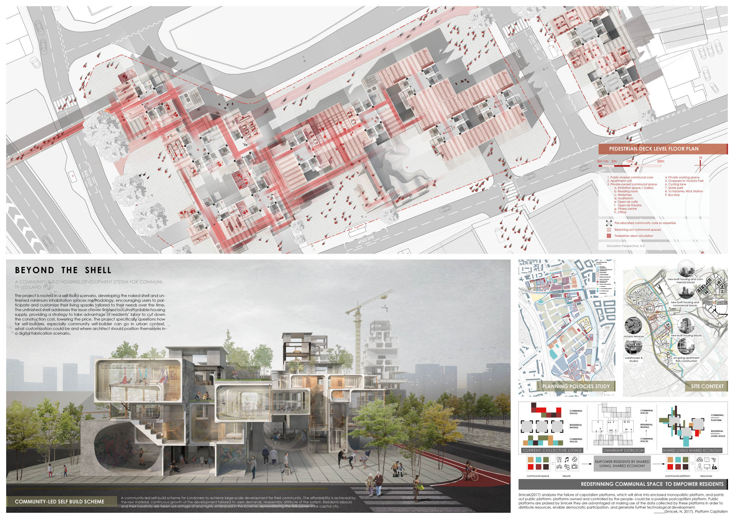 A range of ideas were submitted, some realistic and others conceptual. Common themes that were investigated include: methods of increasing density within the existing building stock; using shared or state-owned spaces like rivers, highways, bridges, train tracks, and even Buckingham Palace, to construct new housing above, below, or within; reworking low-density building types like warehouses and industrial spaces; and reintroducing alternative methods for land ownership, like community land trusts.