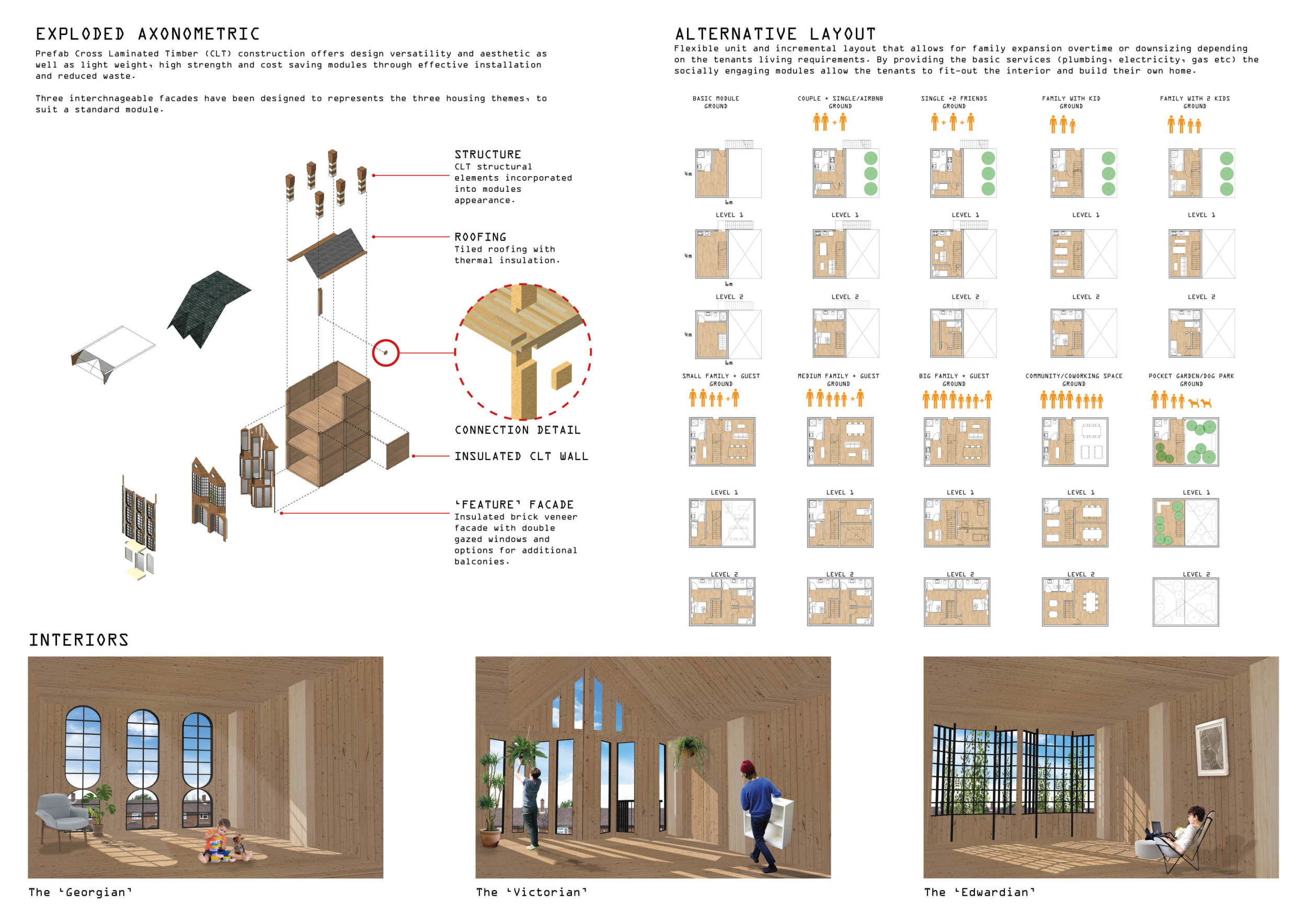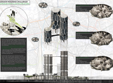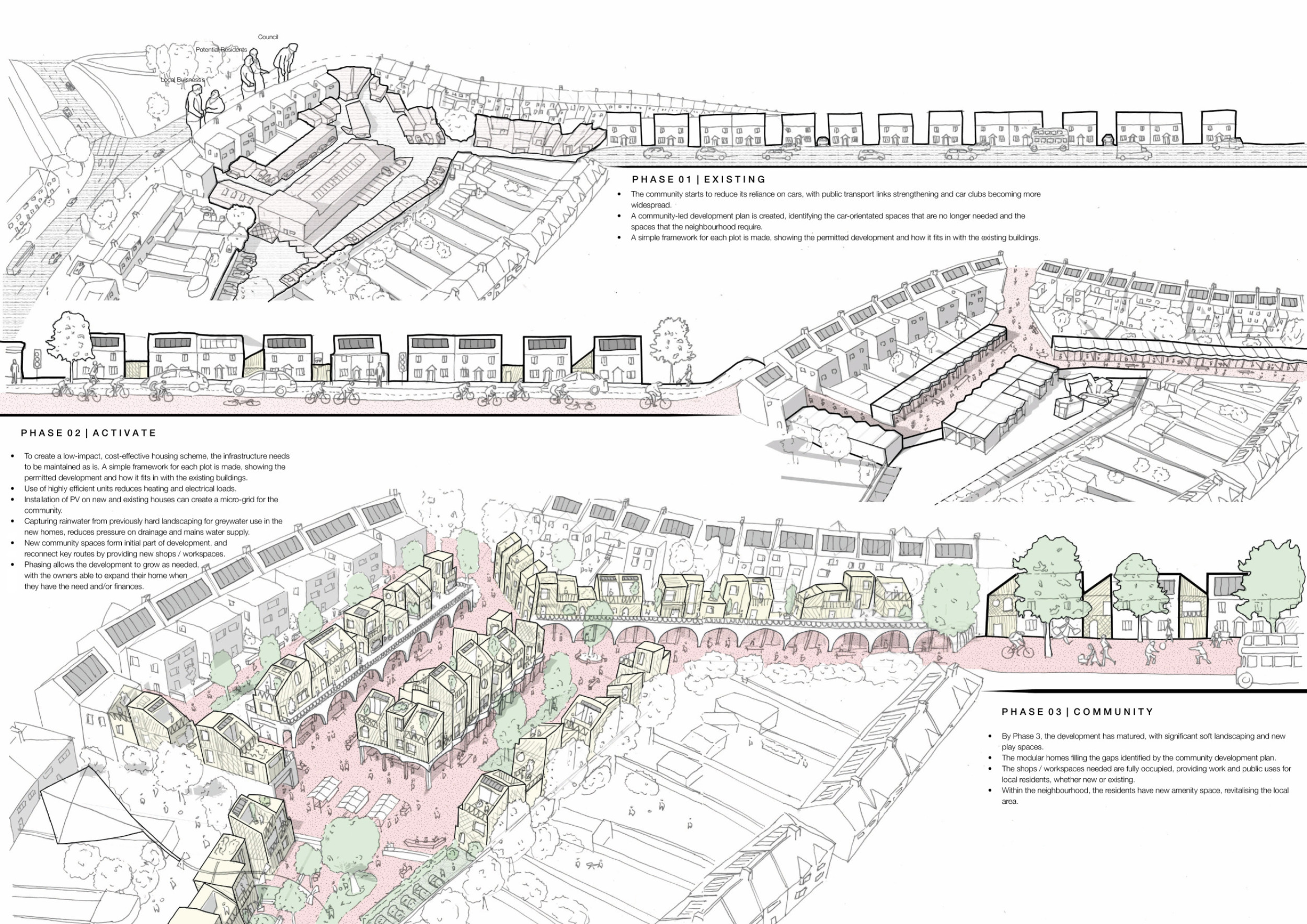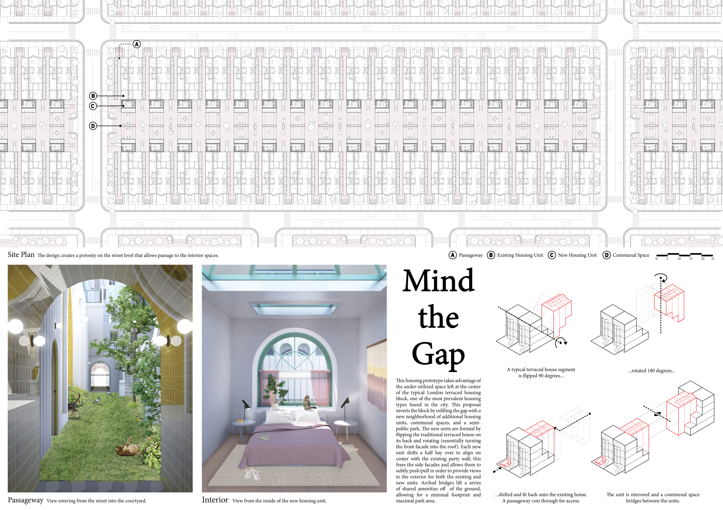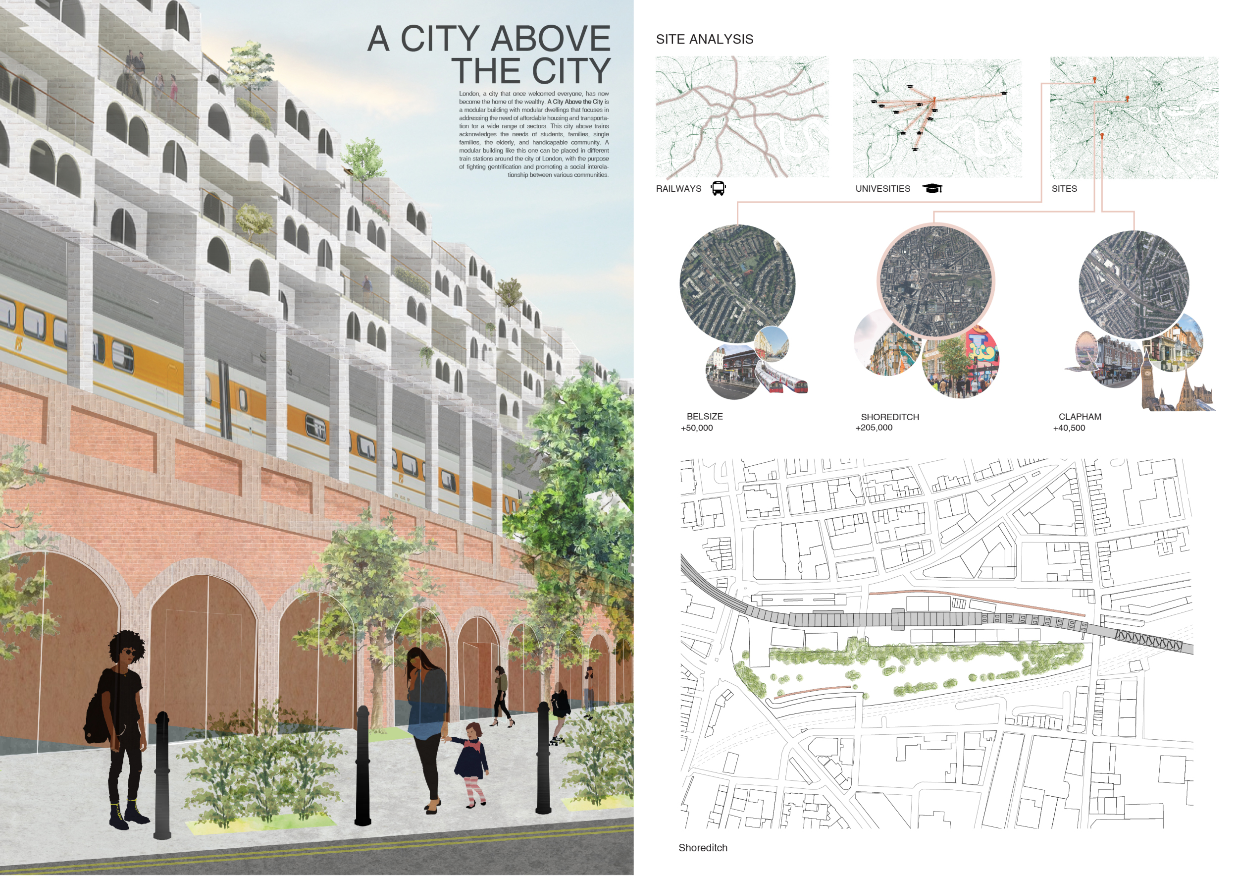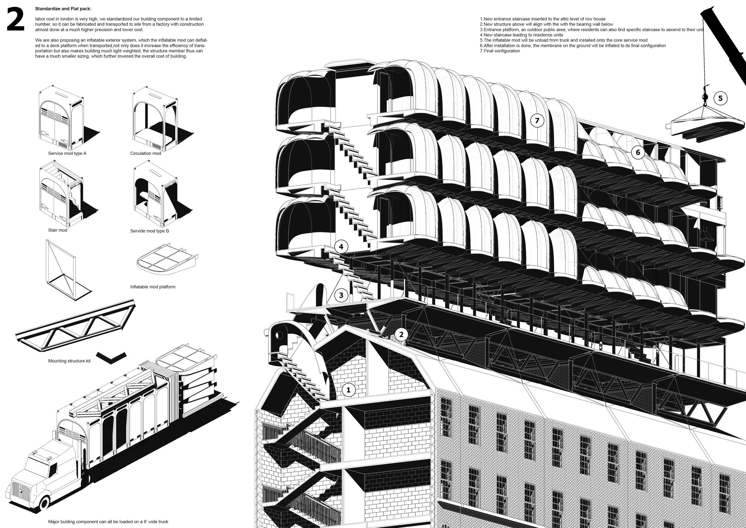 A range of ideas were submitted, some realistic and others conceptual. Common themes that were investigated include: methods of increasing density within the existing building stock; using shared or state-owned spaces like rivers, highways, bridges, train tracks, and even Buckingham Palace, to construct new housing above, below, or within; reworking low-density building types like warehouses and industrial spaces; and reintroducing alternative methods for land ownership, like community land trusts.