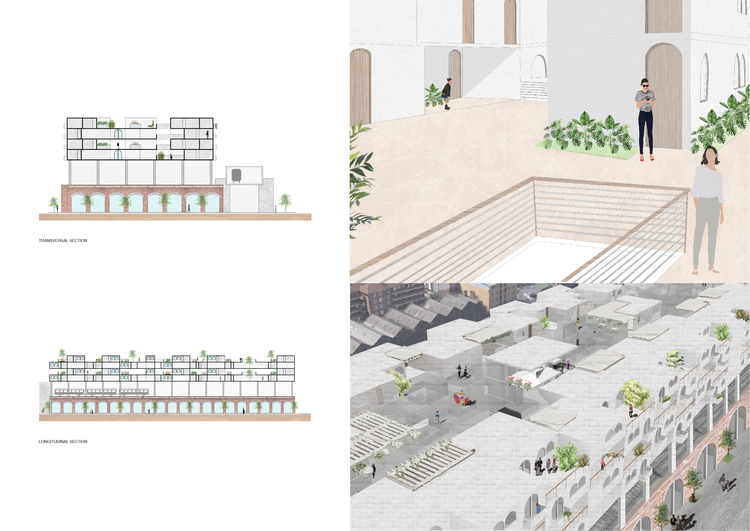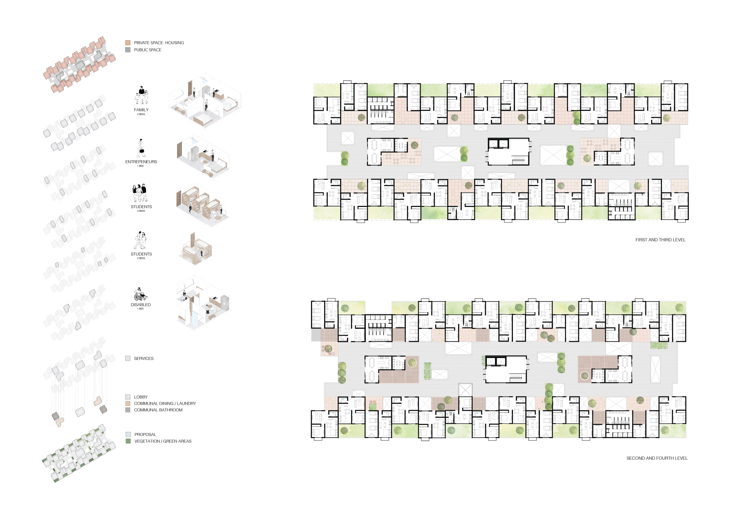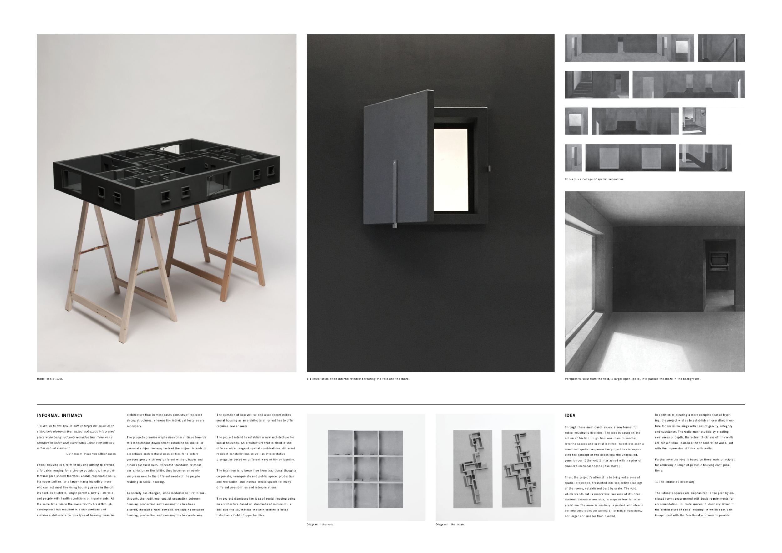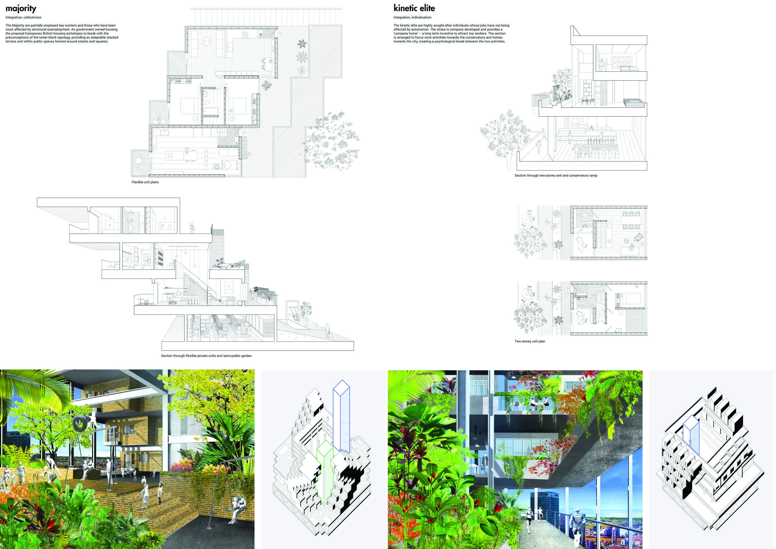 This project, titled Informal Intimacy, seeks to establish a new architecture for social housing using modernist principles. In its simplicity and austerity it offers flexibility, with a wide range of spatial combinations that relate to people’s wide-ranging identities. The submission states: “The project dismisses the idea of social housing being an architecture based on standardized minimums, a one size fits all, instead the architectus is established as a field of opportunities.