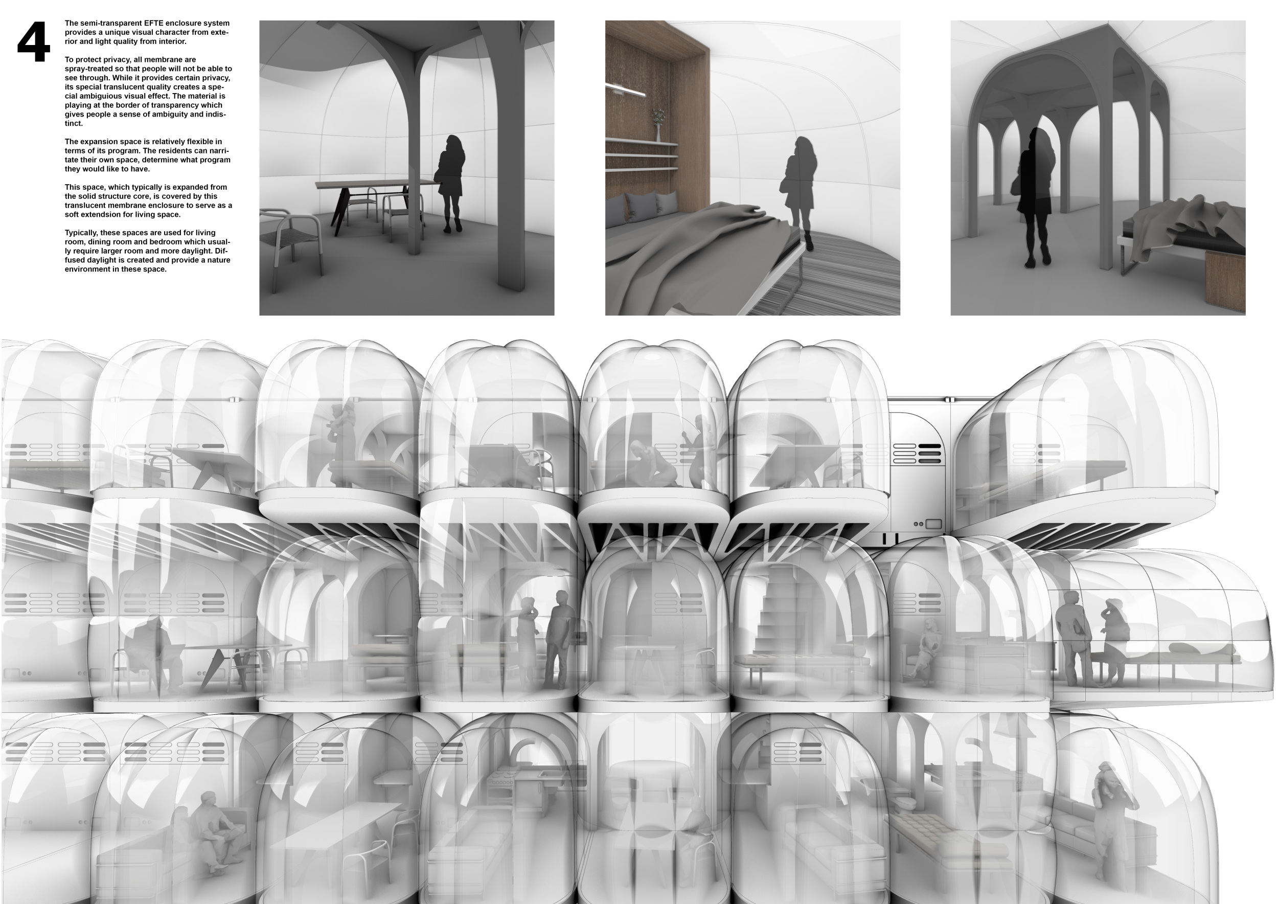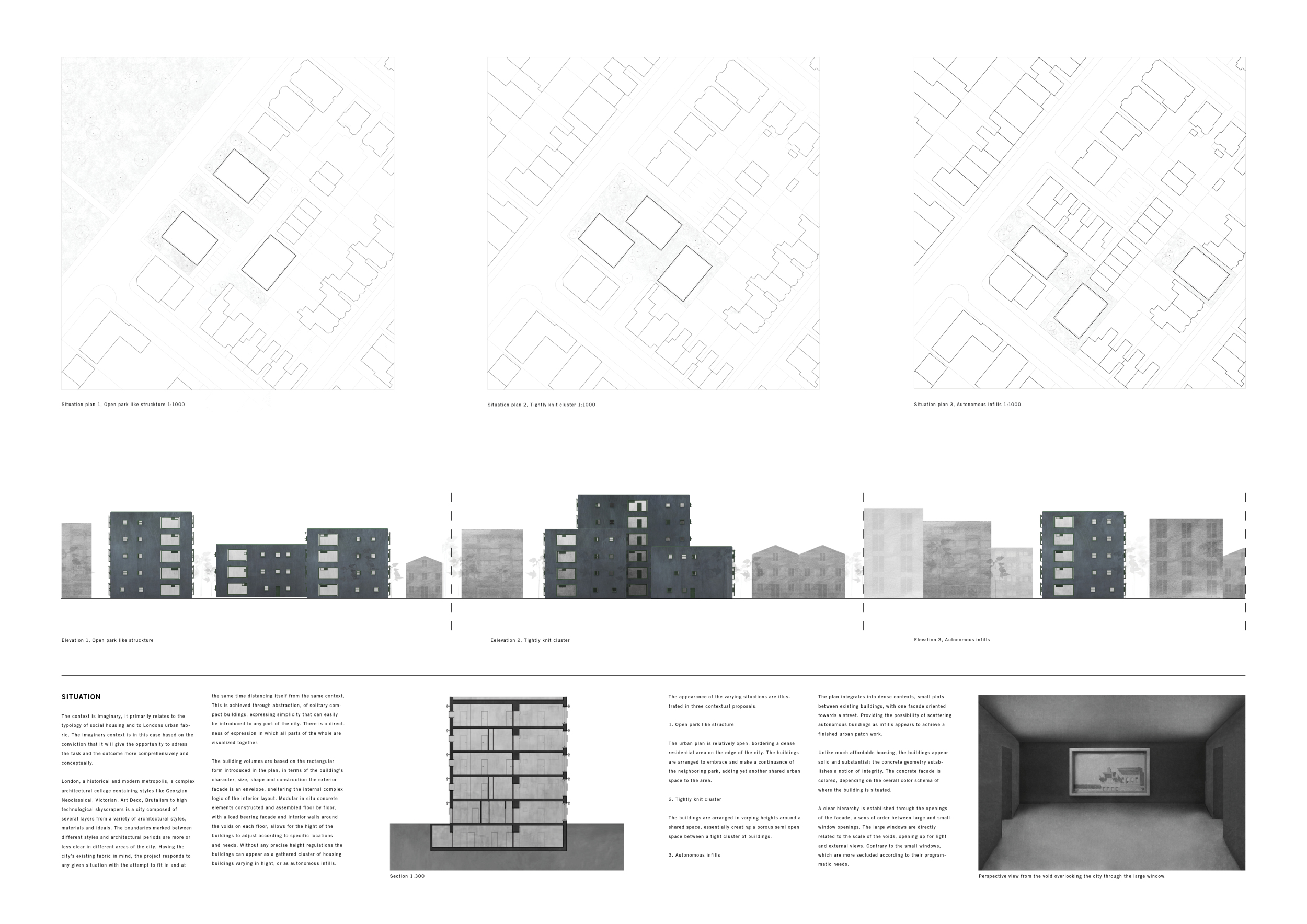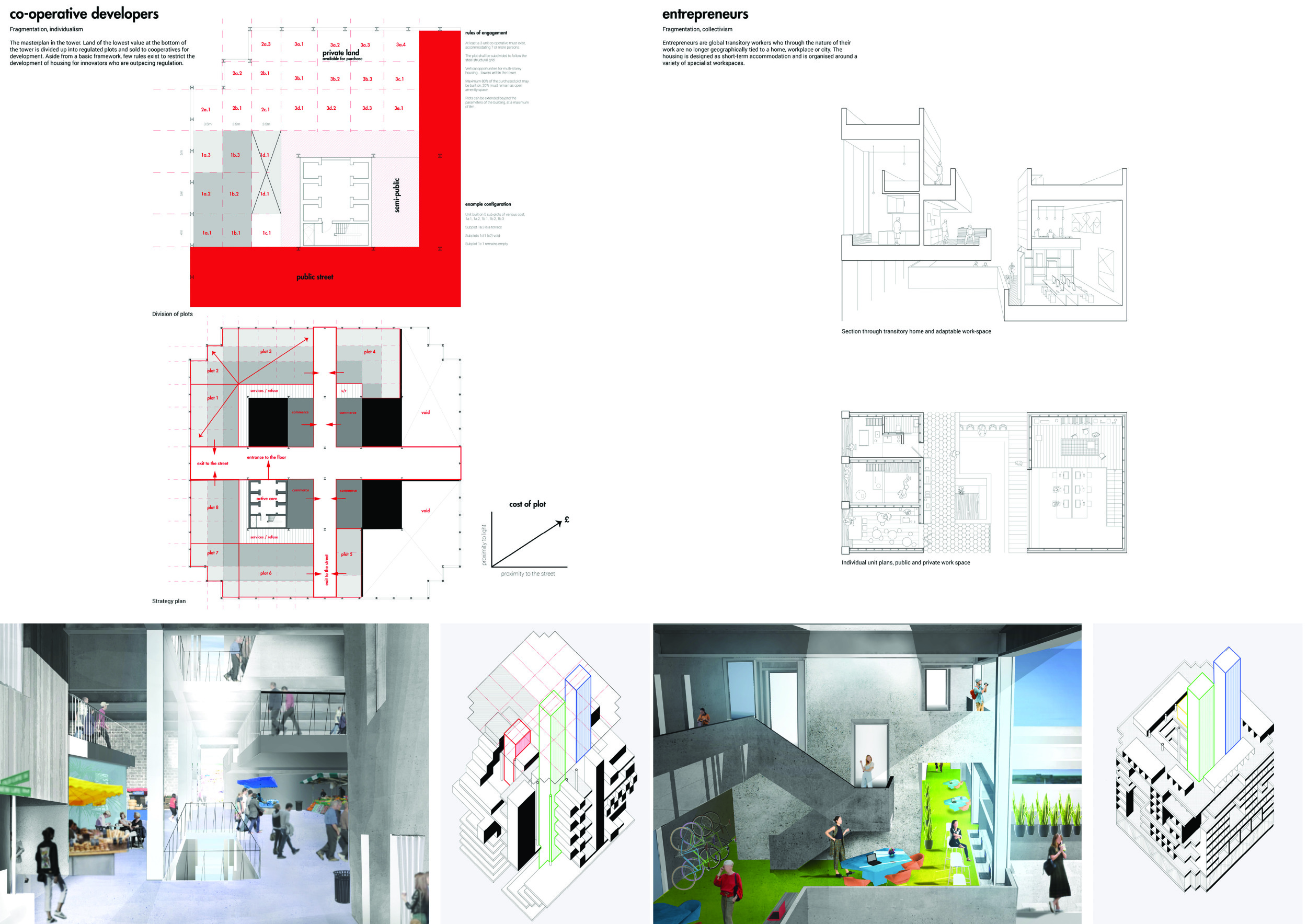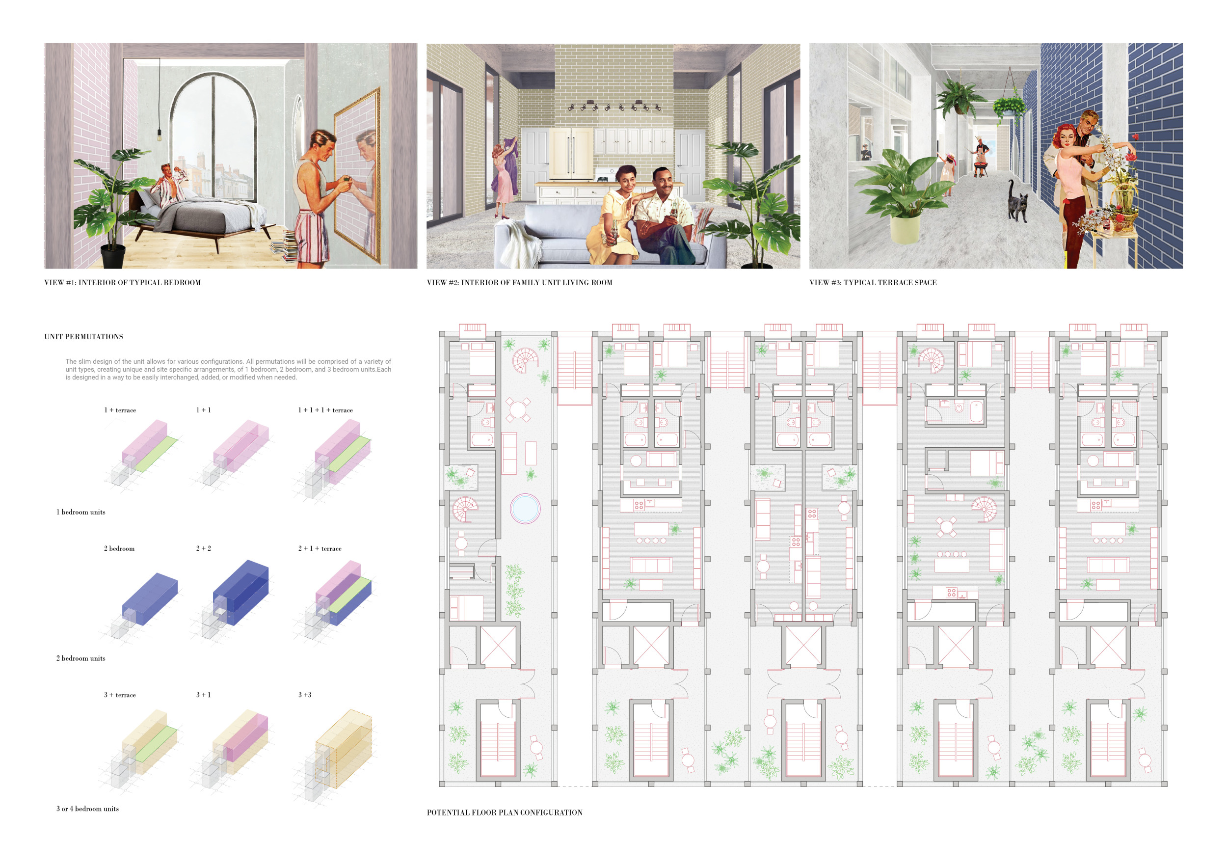 This project, titled Informal Intimacy, seeks to establish a new architecture for social housing using modernist principles. In its simplicity and austerity it offers flexibility, with a wide range of spatial combinations that relate to people’s wide-ranging identities. The submission states: “The project dismisses the idea of social housing being an architecture based on standardized minimums, a one size fits all, instead the architectus is established as a field of opportunities.